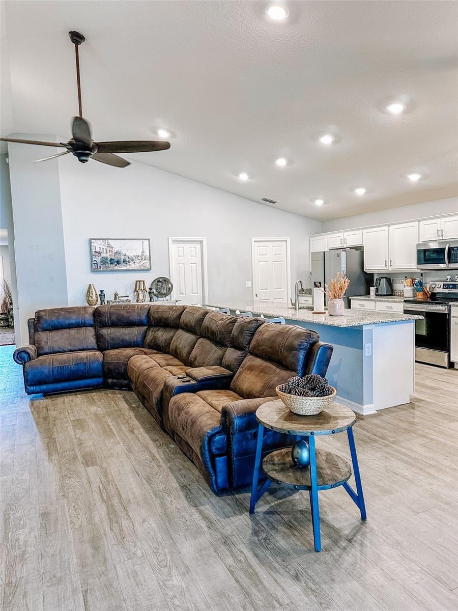 Welcome to a slice of Florida. This 3 bedroom 2 bath block home is ready for your presence! As you drive up you'll notice the white vinyl fenced backyard and great curb appeal drawing you in. As you step inside you can notice the vinyl plank floors sprawling through home taking you on a tour of excellence. The carpeted bedrooms will be to your right including a the Den being used as 4th bedroom currently. As you walking in to the Livingroom you'll notice the vaulted ceiling and high end fixtures including the large Granite counter top inviting you to stay awhile. In the primary bedroom you have a trayed ceiling and large primary bathroom ensuite with garden tub and walkin shower. Looking out the back sliding glass door you can see where you will spend those fall cool evenings on a screened pavered lanai with you fenced back yard with plenty of room for activities. After having read this, you need to see this to understand. Don't hesitate to schedule a showing today!