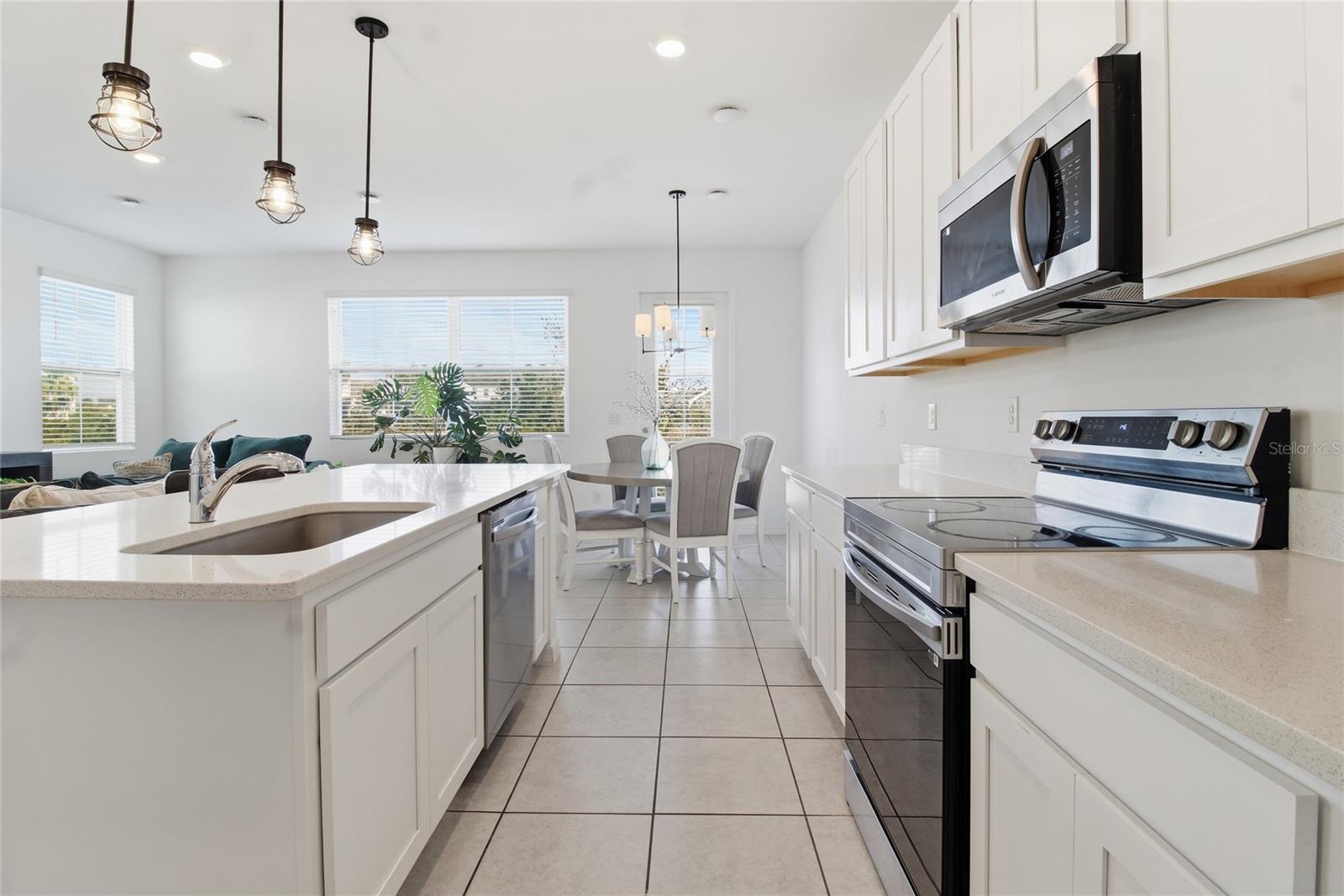 Amazing amenities! This gorgeous 1-year-old end-unit townhome in the highly desirable Champions Gate area offers modern upgrades and the perfect blend of comfort and convenience. The first floor features beautiful tile flooring, creating a sleek, easy-to-maintain space that flows effortlessly through the open-concept layout. The upgraded kitchen includes 42" cabinets, stainless steel appliances, and an enormous quartz island that serves as the ideal centerpiece for cooking, dining, and entertaining. This home also has no rear neighbor, providing added privacy and relaxing views from your back patio. The community clubhouse and pool are easily accessible, giving you quick enjoyment of all the incredible resort-style amenities. The community features a beach-entry pool, splash pad water park, fitness center, 18-hole miniature golf course, and a beach volleyball court — making everyday living feel like a vacation. The HOA even includes trash pickup right at your doorstep, adding extra convenience to your daily routine. Located near shopping, grocery stores, Posner Park, Champions Gate Village, and just minutes from Walt Disney World. Loughman Elementary School is also close by. Short-term rental is allowed, making this home an excellent opportunity for investors, vacation homeowners, and even better — a fantastic option for first-time homebuyers looking for value, comfort, and flexibility all in one.