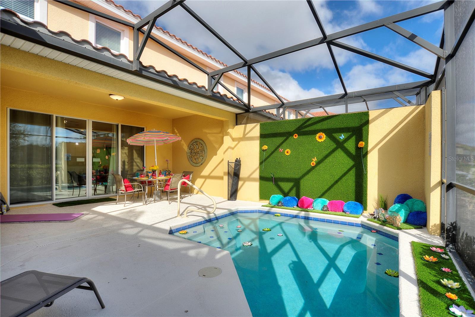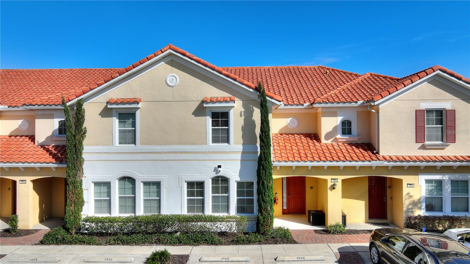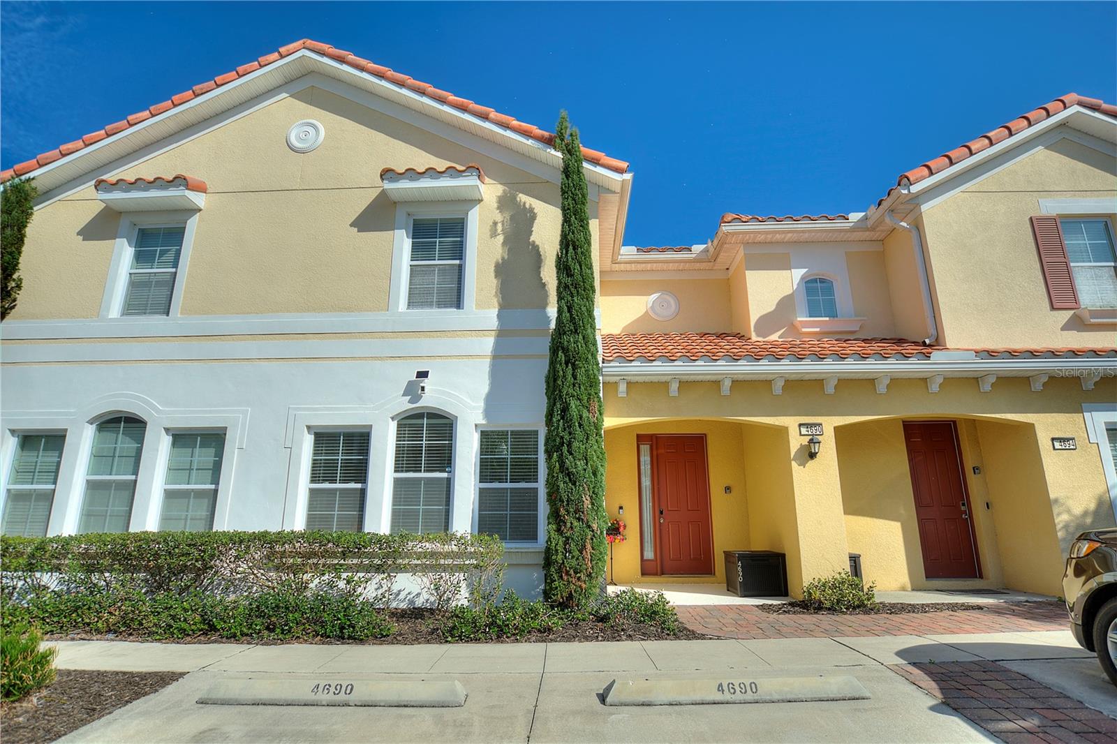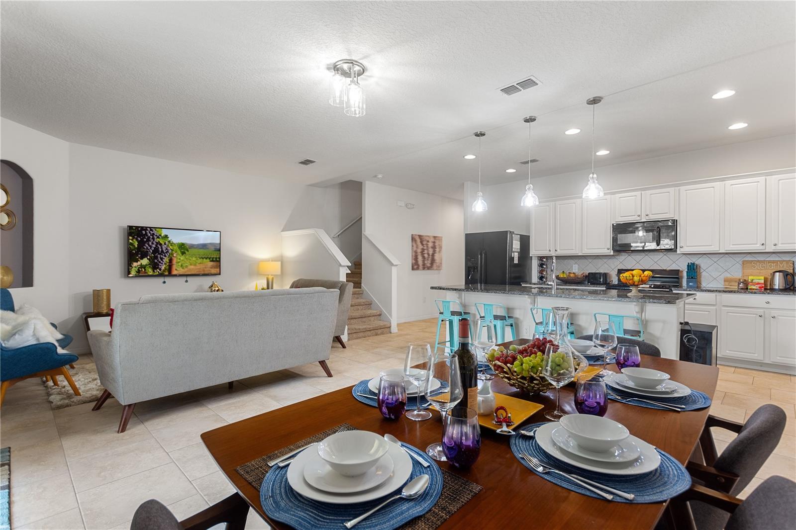 Like having a Genie in a bottle, your every wish can come true. Join Solterra’s Resort Lifestyle surrounded by nature, wildlife & green spaces alongside every path. The clubhouse provides activities & opportunities just steps away from your beautiful 4 bedroom, 3+1/2 bath fully furnished, turnkey townhome & private heated pool. With no rear neighbors, your privacy is assured. Every convenience is considered from the time you enter the large foyer with built in drop zone & storage bench. A large sunny bedroom downstairs offers convenience and its bathroom has a double vanity with step in shower. Just inside, the spacious kitchen with white cabinetry has granite countertops and a large kitchen island, easily seating 4 faces the outdoor dining and pool deck. With beautiful views, this open plan concept keeps everyone in on the action. Dining Room & Living Room, are all in the mix and is perfect for entertaining with the double opening sliders inviting the outdoors in. The East facing pool deck gives you a light & bright disposition, and shades from the late afternoon heat. Perfect all day! Whether starting your day with breakfast al fresco, a morning yoga routine, or lounging poolside, the day will start off right! Upstairs you’ll find the bright Primary Bedroom and ensuite bathroom with double vanities & granite countertops. Two secondary bedrooms have a shared bath with double vanity, granite countertops, & white cabinetry. The large laundry room on the second floor is roomy& large enough to fold & store extras. Head over to the clubhouse for crafts, a round of tennis, a ten foot pool slide, or take a spin around the lazy river, and enjoy a wonderful meal from Solterra’s private cafe. You can even order freshly made pizza for pickup on those lazy nights. Solterra frequently hosts events such as poolside movies, food trucks & homeowners potlucks, and the large fitness center is open from 5AM until 10PM nightly. 15 minutes to Disney, Shopping & Restaurants nearby, a private cafe on premises, and zoned to allow Short-Term Rental, ideal for investors, a second home with the benefit of renting out when you’re not enjoying, and many full time residents are choosing to make Solterra their full time home! Come join us! *some of the decor pictured are staged and do not convey.