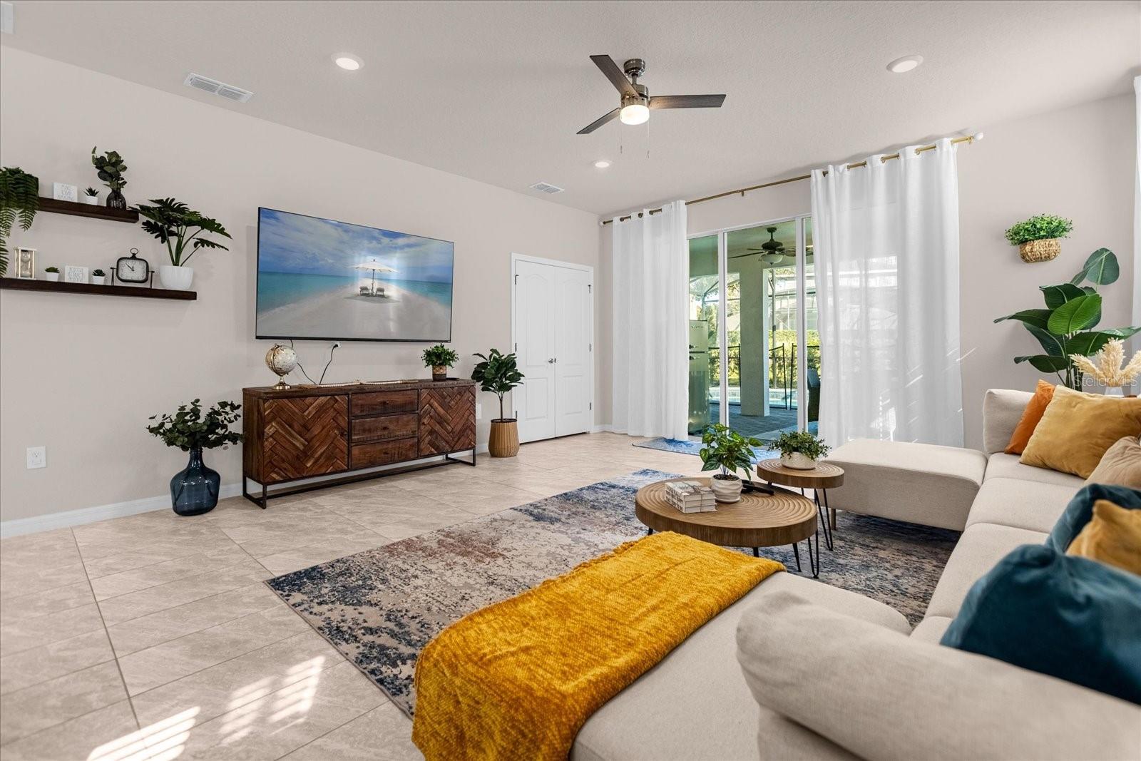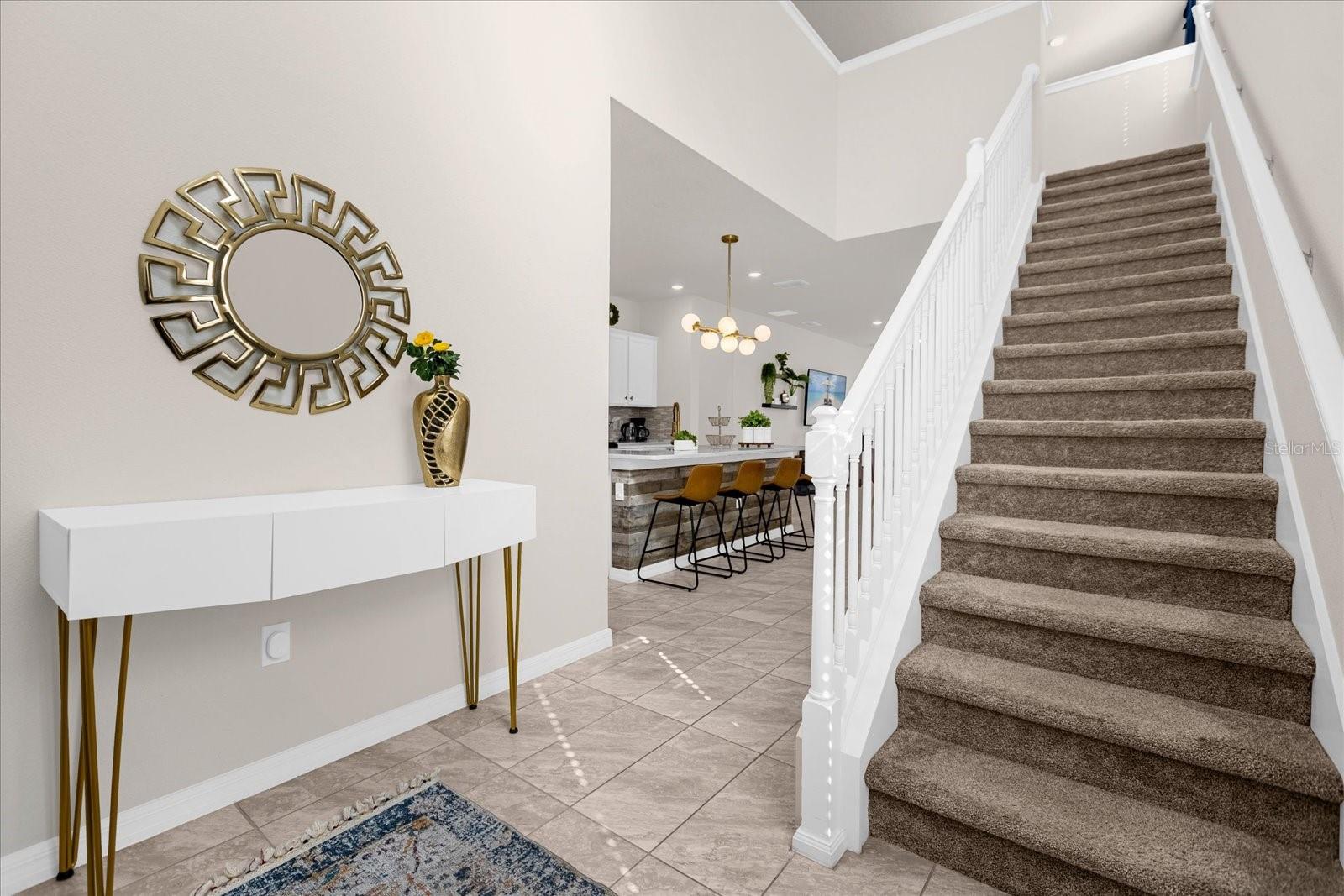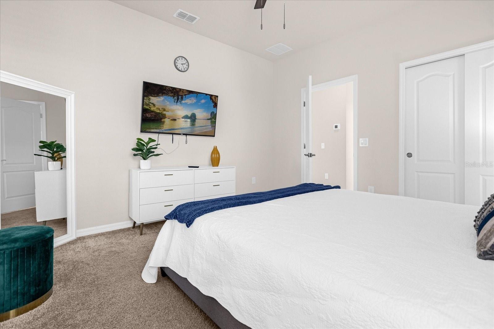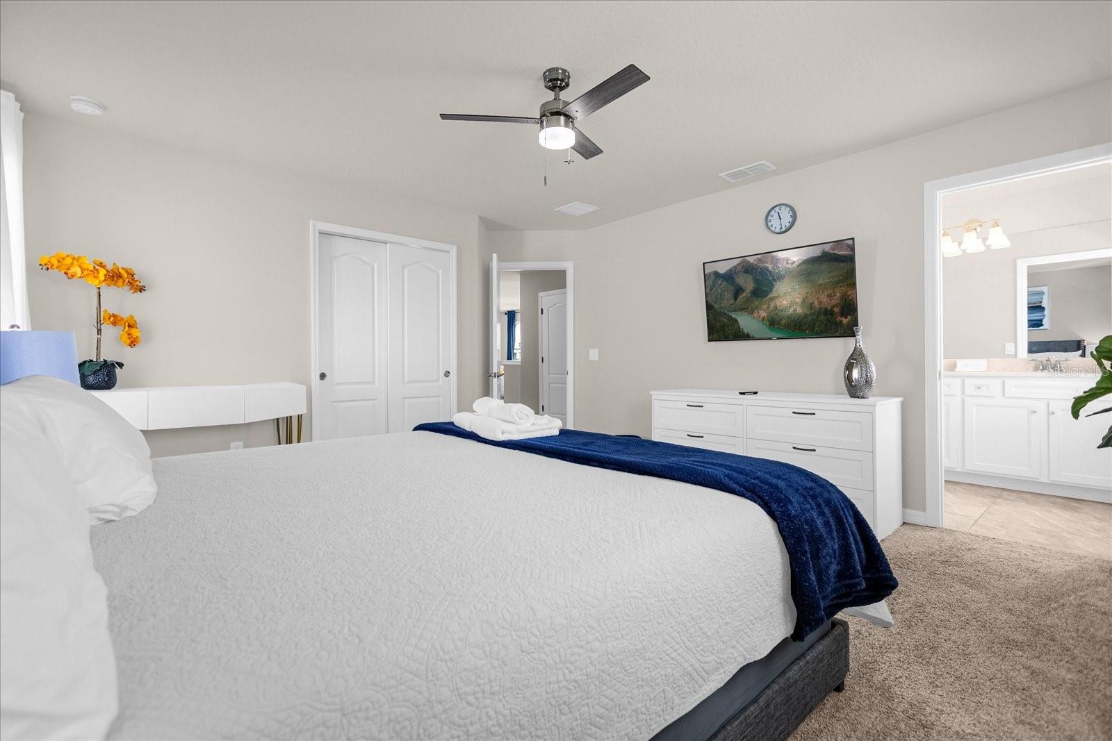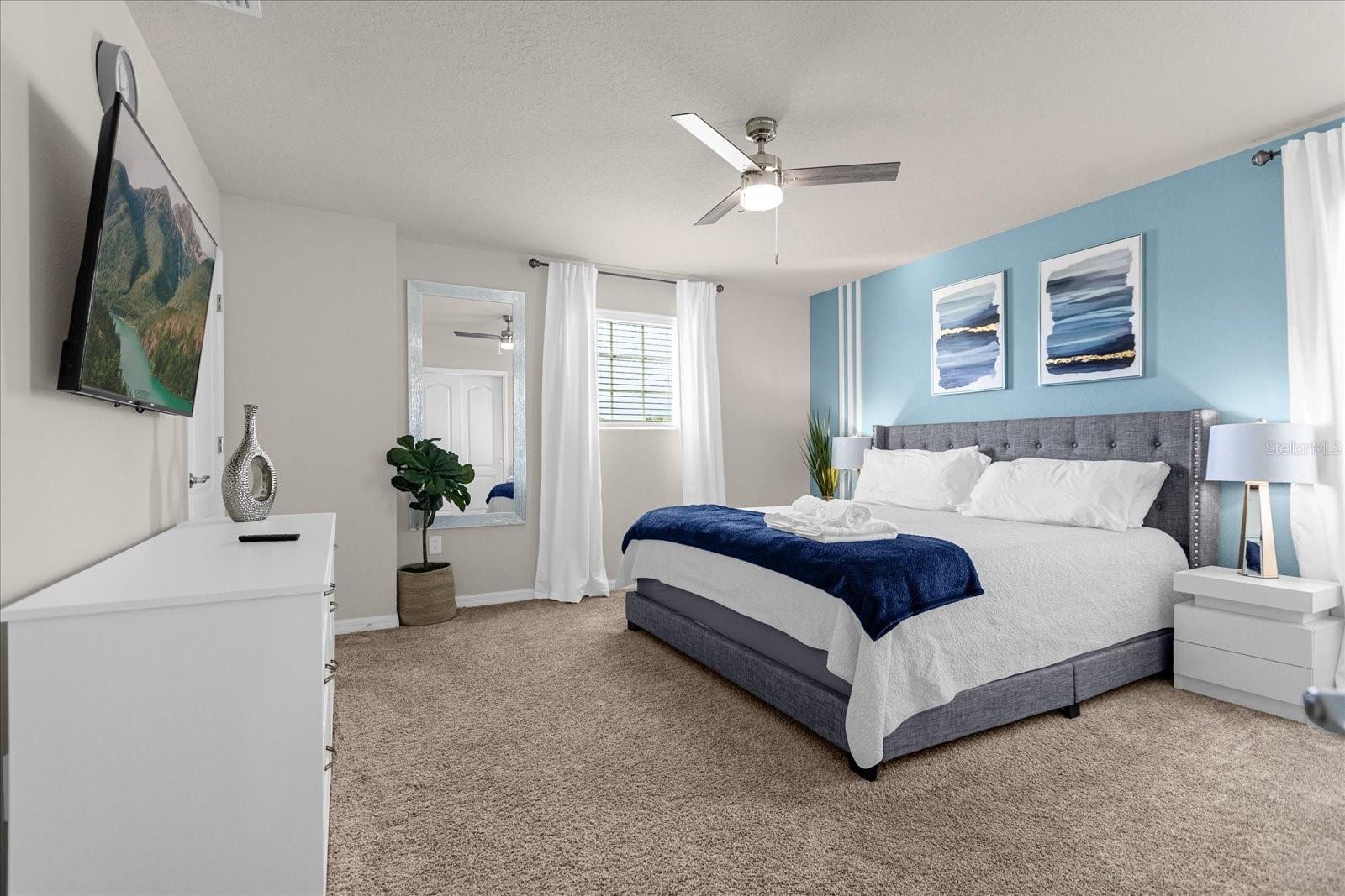 Stunning, fully-furnished, 6 bed 4.5 bath home in the gated Solterra Resort. This short term rental subdivision boasts a gated entrance with a guard. This beautiful home was built by Pulte Homes, known for their innovative floor plans, personalization, and quality, you can rest assured that every detail was well thought out. The home features 2 floors, a 2 car garage, and a private screened-in pool with a heated spa, perfect for unwinding after a long day. The inside of the home is breathtaking to say the least. The upgraded cabinets with neutral backsplash goes perfect with the design of the kitchen island, which features eating-space and a double sink all conveniently placed. The quartz countertops tie it all together for a truly elegant look. The pristine condition of the home can truly only be appreciated in-person. The lighting throughout the living room and dining room combo accentuate the living space that will be used the most by your family and friends. All the rooms are very spacious and any extra rooms make a perfect space for a home-office. Indulge in the luxurious bathrooms, outfitted with modern amenities including garden baths, separate shower stalls, and double-sink vanities, ensuring every moment spent here is one of comfort. The garage has been outfitted with vinyl flooring, AC and insulation and converted into a game room! Or whatever you decide to turn it into; including a garage, as it is very simple to convert back if you desire. Beyond the confines of this exquisite abode lies an enviable location, mere minutes from a myriad of entertainment, shopping, and dining options. Orlando's vibrant attractions are within easy reach, with Disney World a short 20-minute drive away and downtown Orlando just 45 minutes from your doorstep. Don't miss the opportunity to make this unparalleled retreat your own – schedule your appointment today and prepare to experience luxury living at its finest!