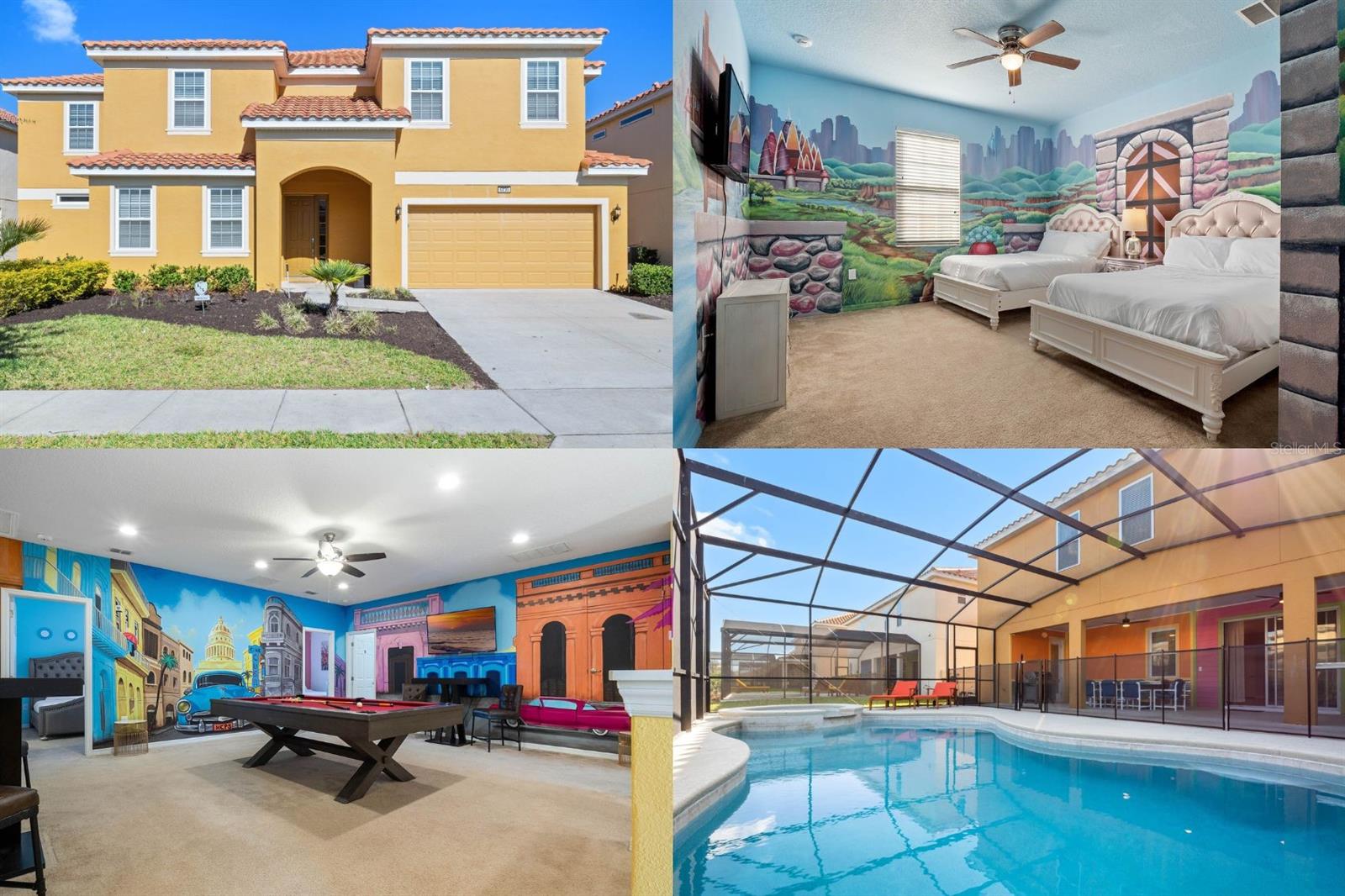 Welcome to “Florida Dreamin”, an amazing investment opportunity that is TURN KEY, FULLY FURNISHED, with 11-bedrooms, 9.5-bathrooms & sleeps 28! This home has $75k in UPGRADES from when the owner purchased it in 2021, including the outdoor Tiki themed pool area, an epic Cuban themed game loft with pool table, light bedroom theming & upgraded flooring. THIS HOME HAS $120k ALREADY ON THE BOOKS FOR 2024+! THE EXACT SAME FLOORPLAN IS ALSO FOR SALE NEXT DOOR (MLS# O6147262) AND CAN BE BOUGHT AS A PACKAGE TOGETHER! This property is designed for luxurious living and entertaining. As you step through the entrance, you're greeted by an open floor plan living area bathed in natural light, creating an inviting atmosphere perfect for hosting large gatherings or simply relaxing with loved ones. The kitchen, featuring a central island and high-end appliances, is a chef's dream, providing ample space for preparing meals and entertaining guests. With three bedrooms conveniently located on the first level, guests can enjoy easy access without stairs. Venture outside to discover a screened pool, a charming tiki bar, and an outdoor grill area. Whether you're lounging by the pool or hosting a barbecue, this outdoor space is sure to impress. For indoor entertainment, ascend to the loft where you'll find a pool table, perfect for friendly competitions and late-night fun. The rest of the bedrooms upstairs are lightly themed. You & your guests will enjoy the amenities offered at Solterra Resort, including a pool, spa, lazy river, snack bar, fitness center, tennis and volleyball courts. And with a short drive, your guests can explore Orlando's renowned attractions, including Sea World, Disney World, Universal Studios, as well as a wealth of shopping and dining options.