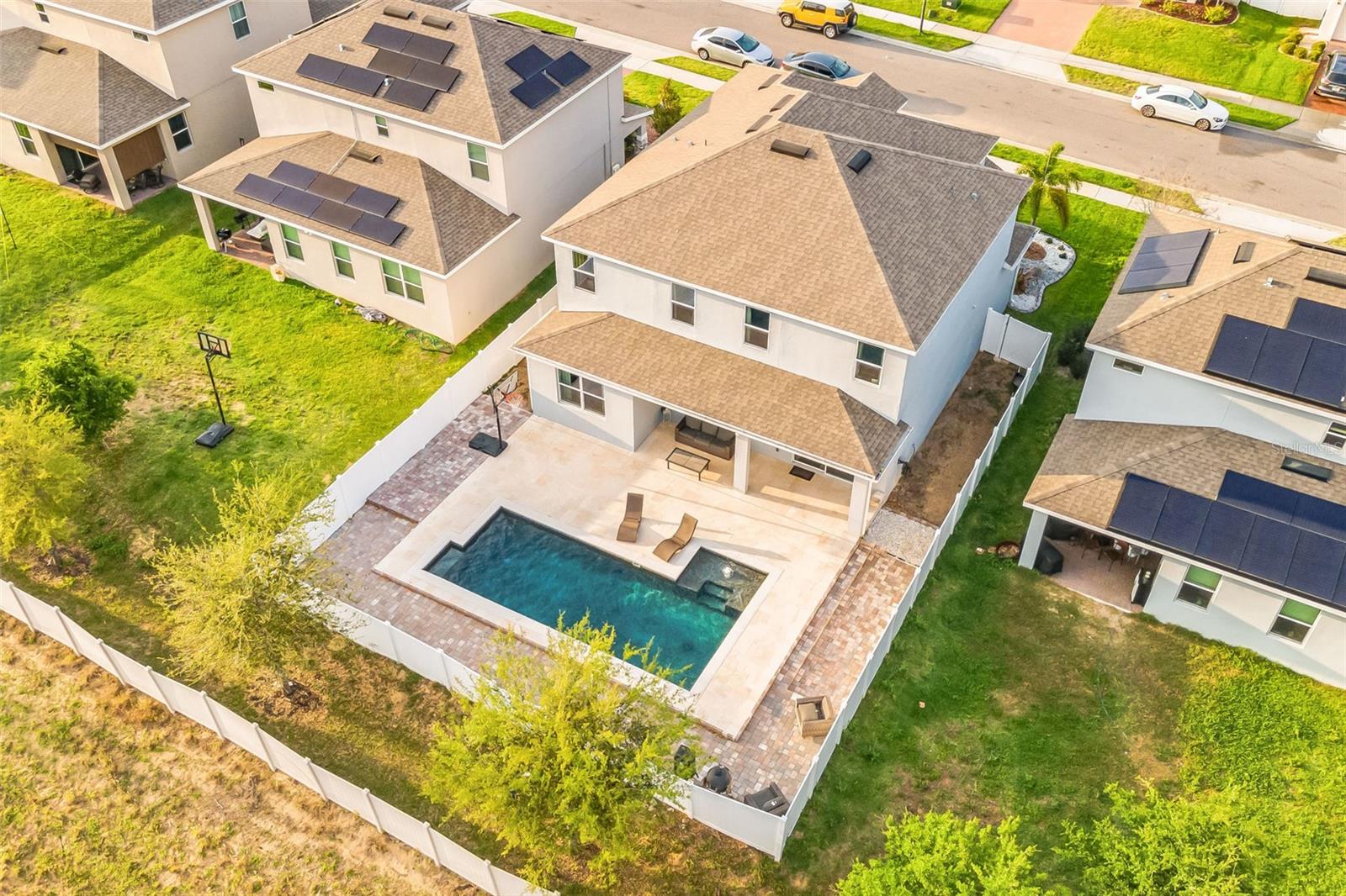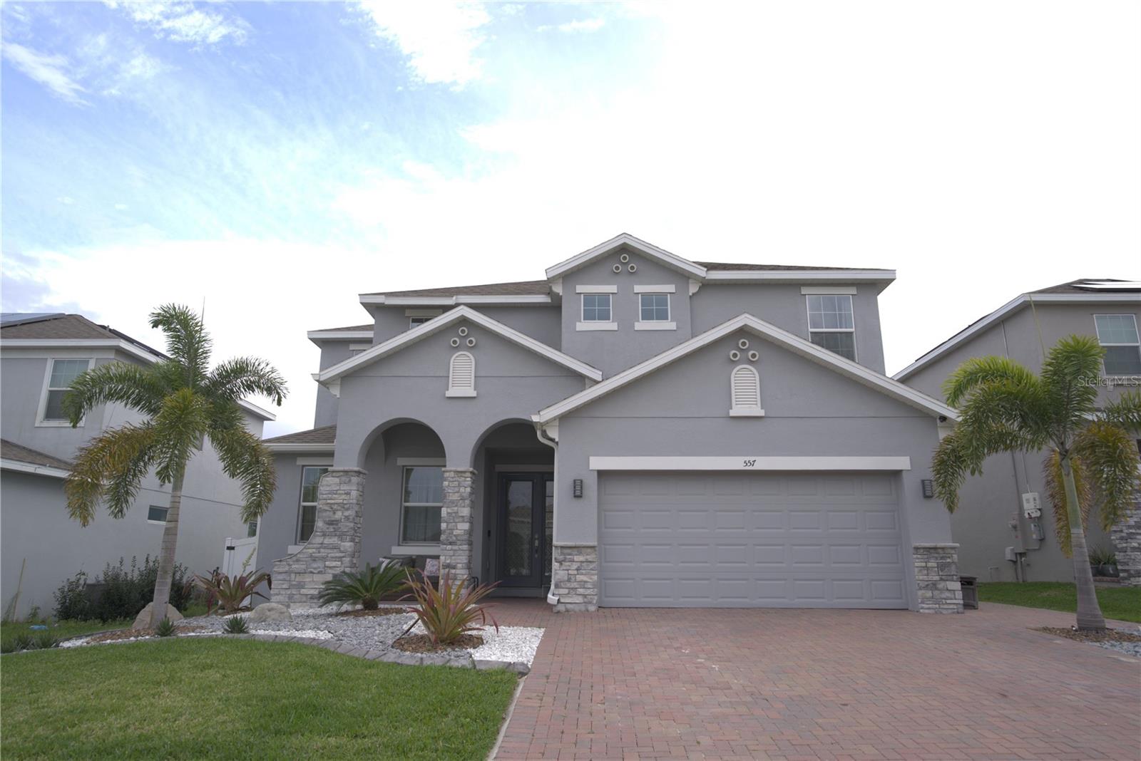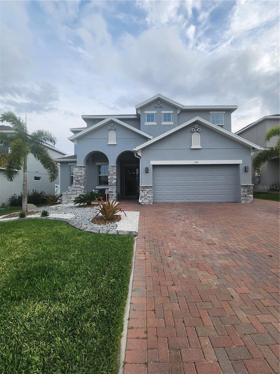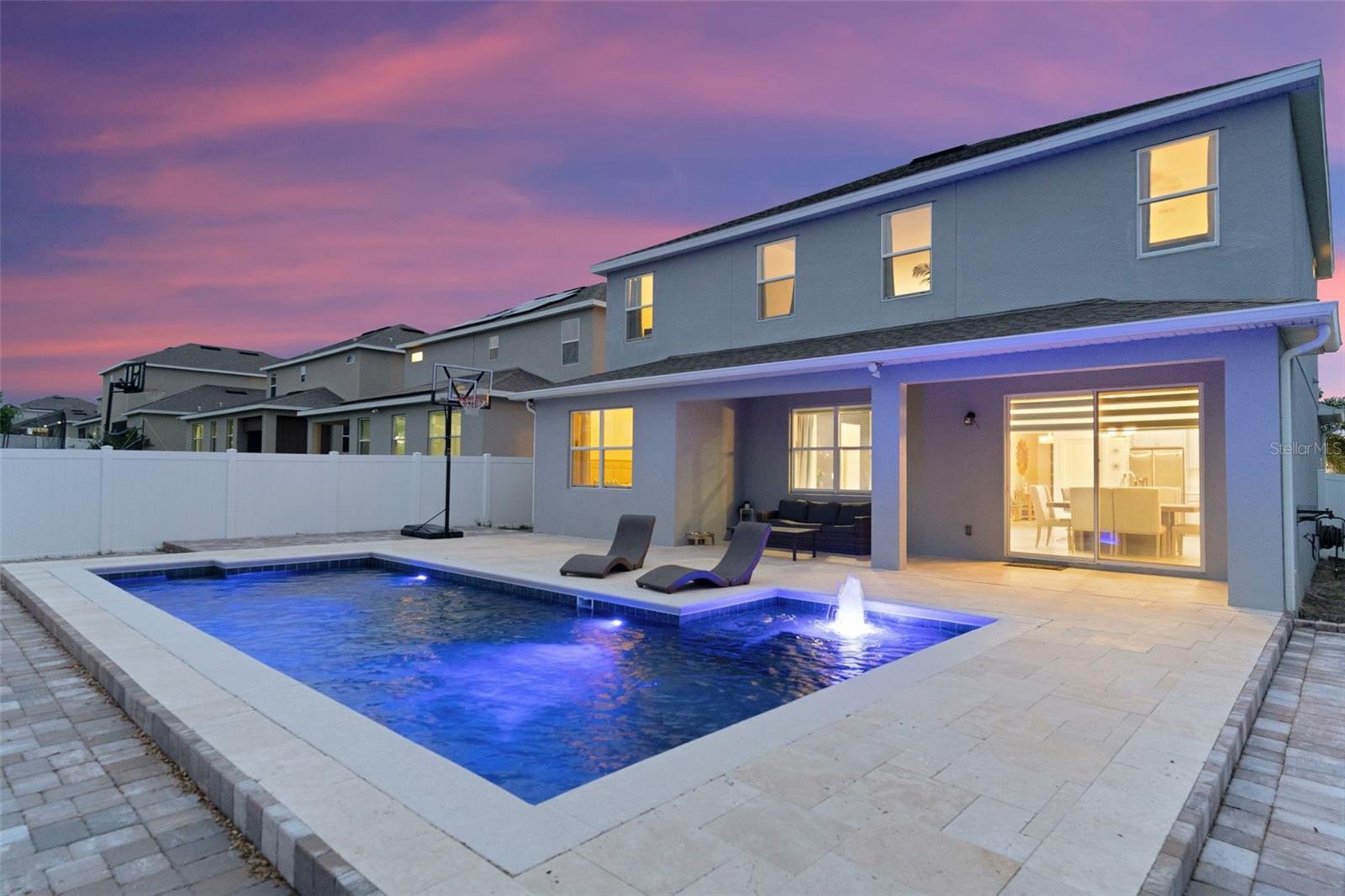 **Don't forget to immerse yourself in the 3D tour** Walk into one of the most beautiful pool homes in the area!. This spacious, bright and open Wellington model was built by Park Square homes just a few years ago. The home features: a tandem 3 car garage with luxury vinyl waterproof plank flooring, upgraded flooring throughout the entire first story including in the well appointed downstairs guest bedroom, there is a downstairs office, upgraded quartz countertops in the kitchen that features a large island and stainless steel appliances, there is also quartz in all bathrooms, upgraded fixtures throughout, a downstairs laundry room with a convenient laundry chute on the second story, a huge upstairs loft space/game room, plus four large bedrooms; the master bedroom is very spacious with a large walk-in closet and a smaller closet as well, and the master bathroom features double sinks with large shower. Other features include upgraded network panel for POE surveillance system in the master bedroom and a panel for fiber optic cable and modem in the laundry room, home theater surround system inputs and surround sound pre wiring in the ceiling of upstairs game room. In 2022 the 16x29 custom pool was added, for you to enjoy the FL sun in, it features the lagoon dark pebble tec finish, a sundeck with bubblers, multi color lights, a huge travertine deck plus pavers extension surrounds the pool, all completely fenced in and private with no rear neighbors. The landscaping has been professionally done with mature landscaping and an automatic irrigation system, the drive way pavers have been extended to go around the home. This home has everything you could ever need and wish for in Florida. It is located in the Golden Ridge community which is in desirable Davenport, just about 20 minutes away from Disney and about 30 minutes away from Legoland, but also conveniently located between Tampa and Orlando; there is shopping, dining, entertainment, hospitals, golf, etc. just a few minutes away. There is an easement between this property and the land behind which is privately owned is zoned as conservation/citrus grove as of right now. https://HomeJab.vr-360-tour.com/e/dFoBjlcRdQI/e Bedroom Closet Type: Walk-in Closet (Primary Bedroom).