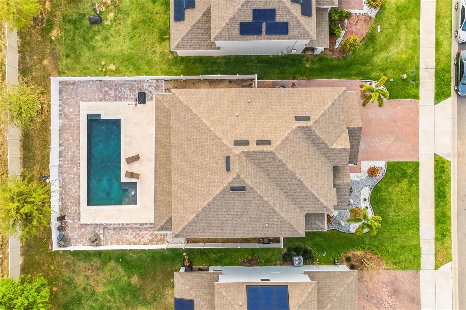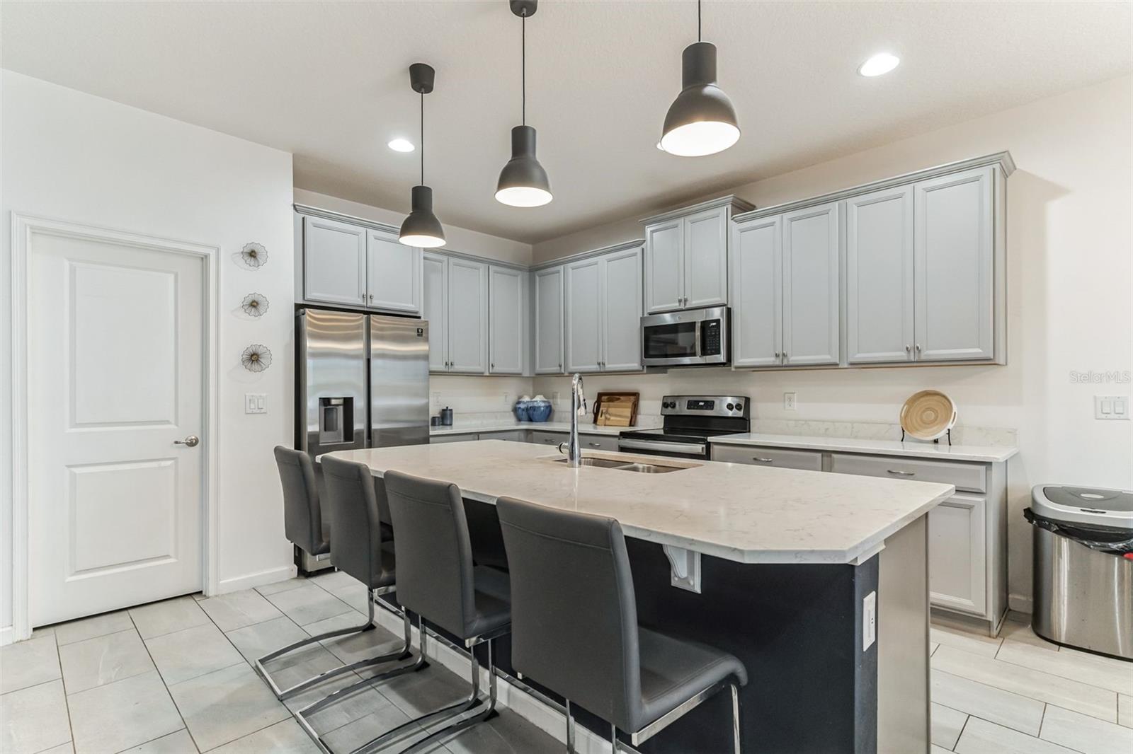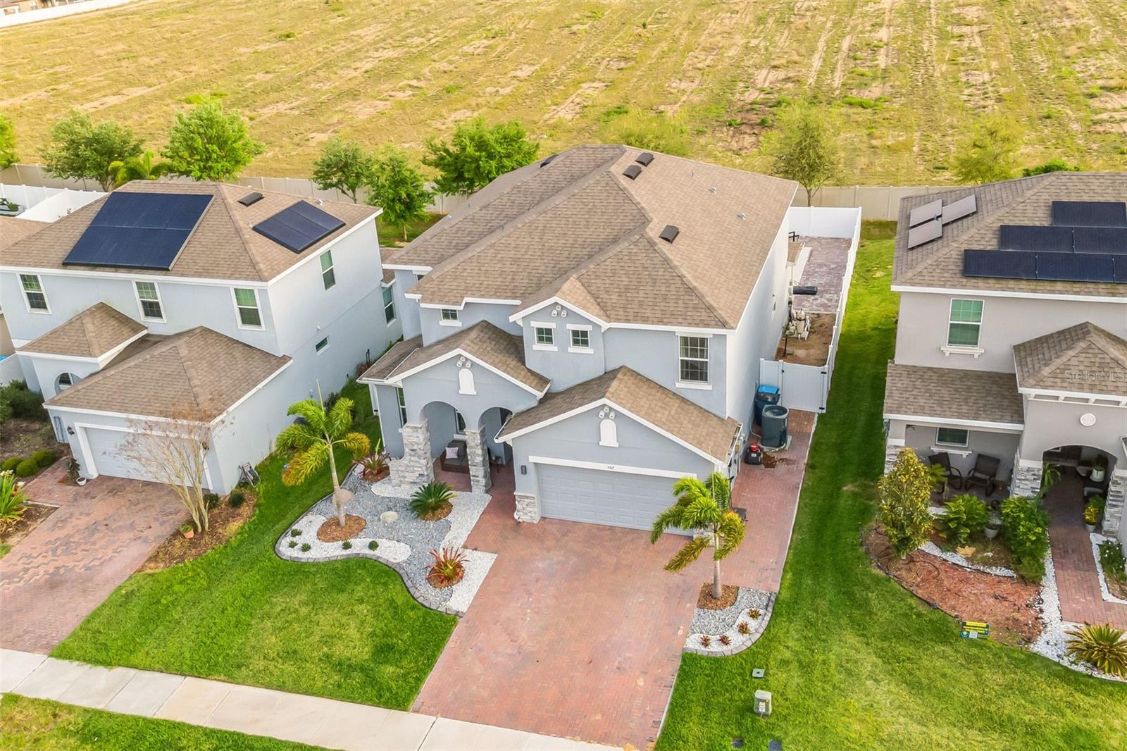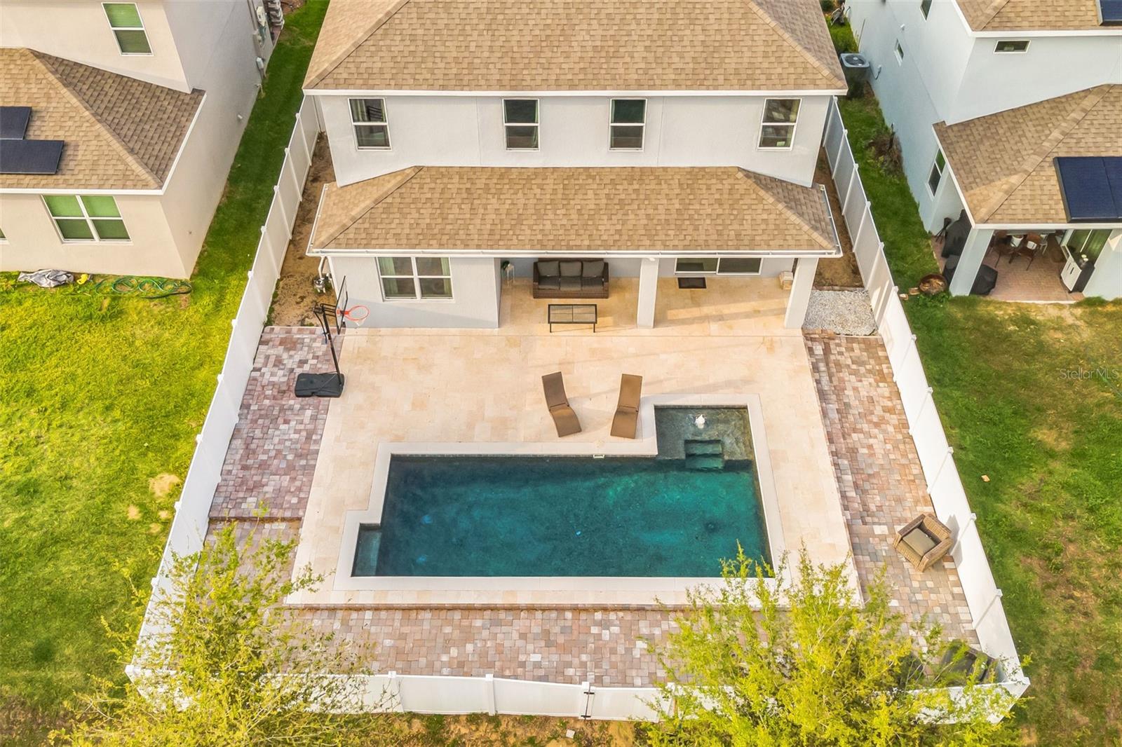 **Don't forget to immerse yourself in the 3D tour** Walk into one of the most beautiful pool homes in the area!. This spacious, bright and open Wellington model was built by Park Square homes just a few years ago. The home features: a tandem 3 car garage with luxury vinyl waterproof plank flooring, upgraded flooring throughout the entire first story including in the well appointed downstairs guest bedroom, there is a downstairs office, upgraded quartz countertops in the kitchen that features a large island and stainless steel appliances, there is also quartz in all bathrooms, upgraded fixtures throughout, a downstairs laundry room with a convenient laundry chute on the second story, a huge upstairs loft space/game room, plus four large bedrooms; the master bedroom is very spacious with a large walk-in closet and a smaller closet as well, and the master bathroom features double sinks with large shower. Other features include upgraded network panel for POE surveillance system in the master bedroom and a panel for fiber optic cable and modem in the laundry room, home theater surround system inputs and surround sound pre wiring in the ceiling of upstairs game room. In 2022 the 16x29 custom pool was added, for you to enjoy the FL sun in, it features the lagoon dark pebble tec finish, a sundeck with bubblers, multi color lights, a huge travertine deck plus pavers extension surrounds the pool, all completely fenced in and private with no rear neighbors. The landscaping has been professionally done with mature landscaping and an automatic irrigation system, the drive way pavers have been extended to go around the home. This home has everything you could ever need and wish for in Florida. It is located in the Golden Ridge community which is in desirable Davenport, just about 20 minutes away from Disney and about 30 minutes away from Legoland, but also conveniently located between Tampa and Orlando; there is shopping, dining, entertainment, hospitals, golf, etc. just a few minutes away. There is an easement between this property and the land behind which is privately owned is zoned as conservation/citrus grove as of right now. https://HomeJab.vr-360-tour.com/e/dFoBjlcRdQI/e Bedroom Closet Type: Walk-in Closet (Primary Bedroom).