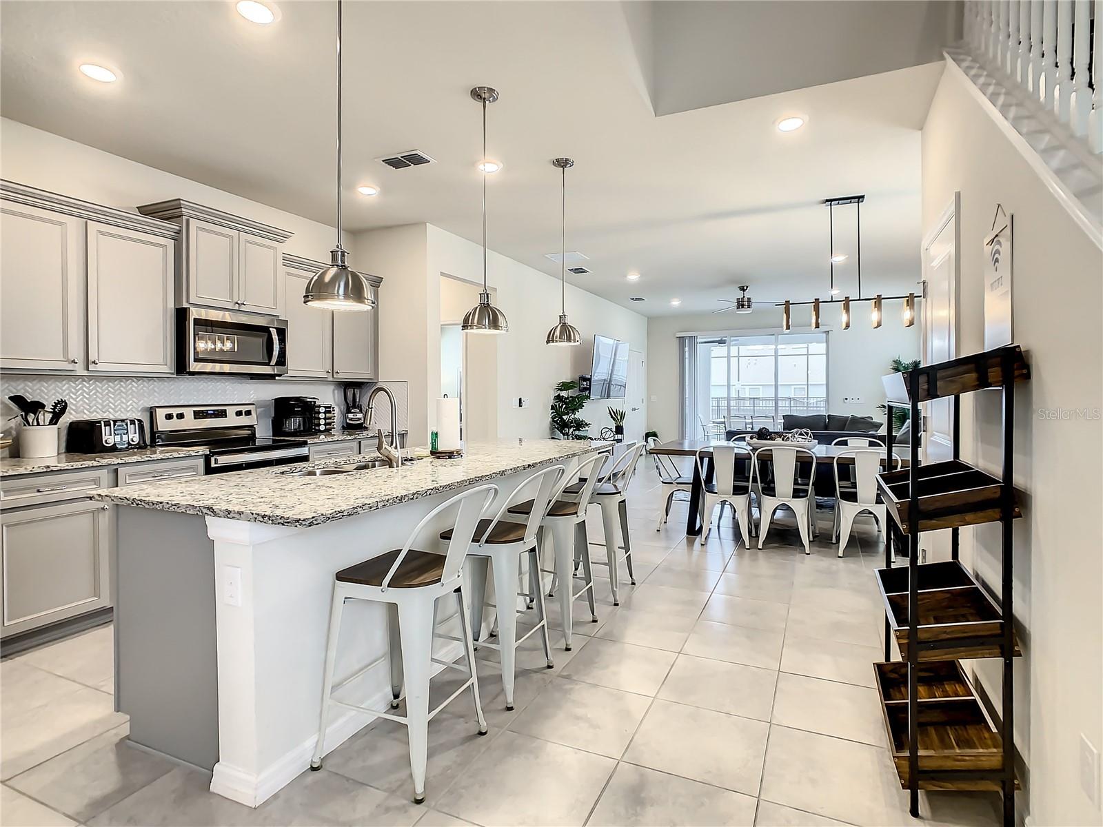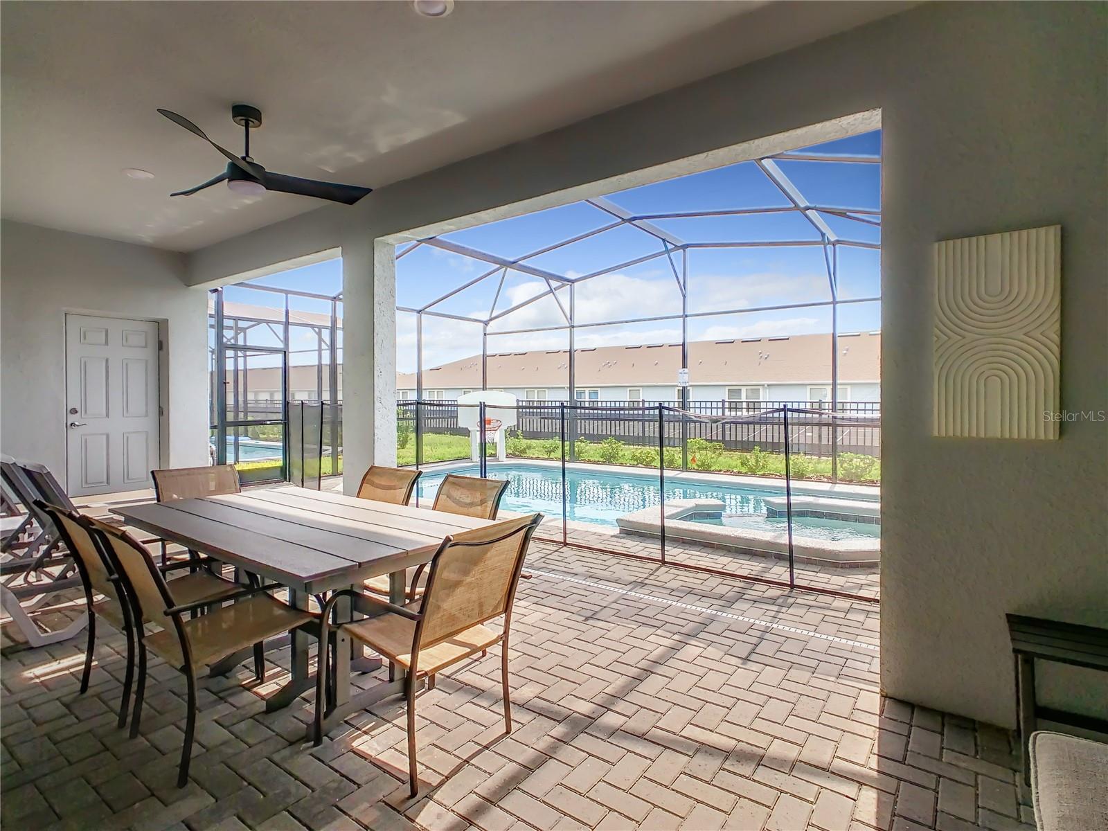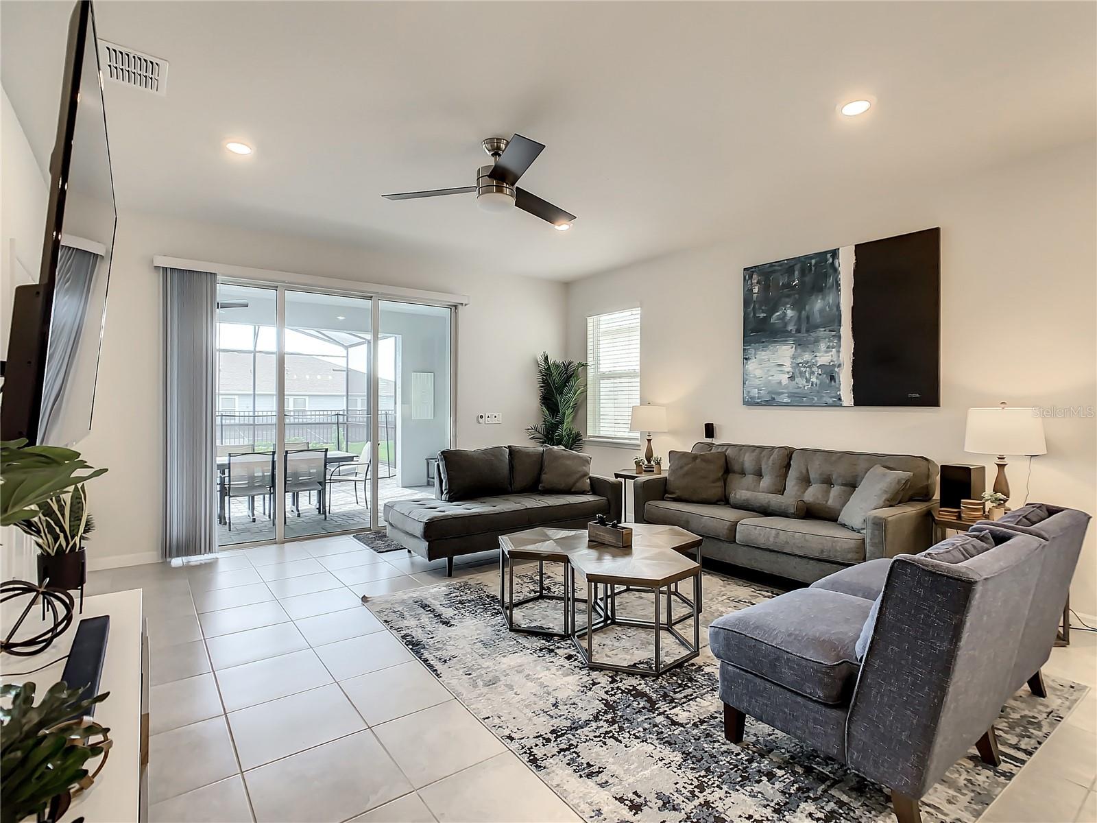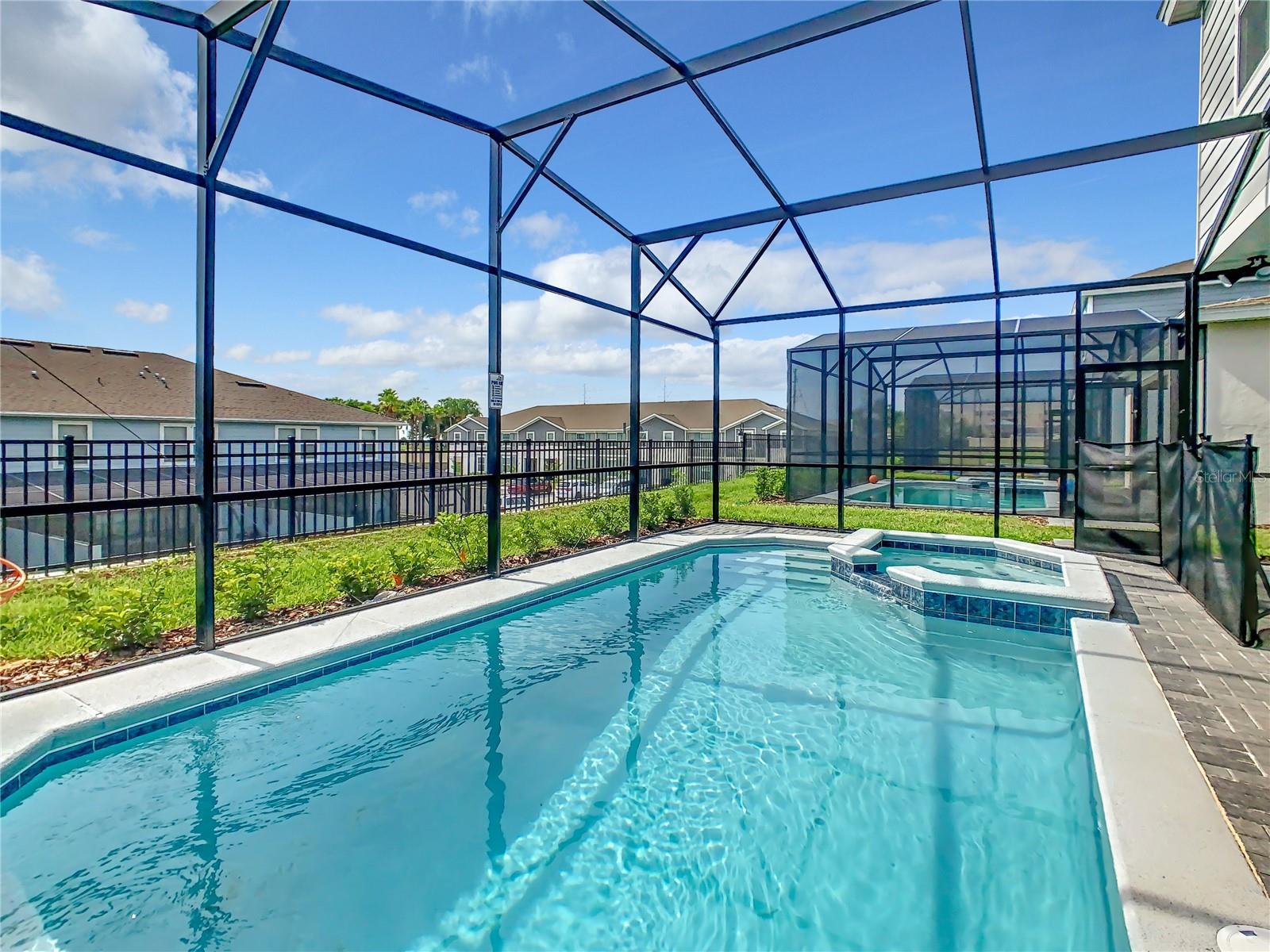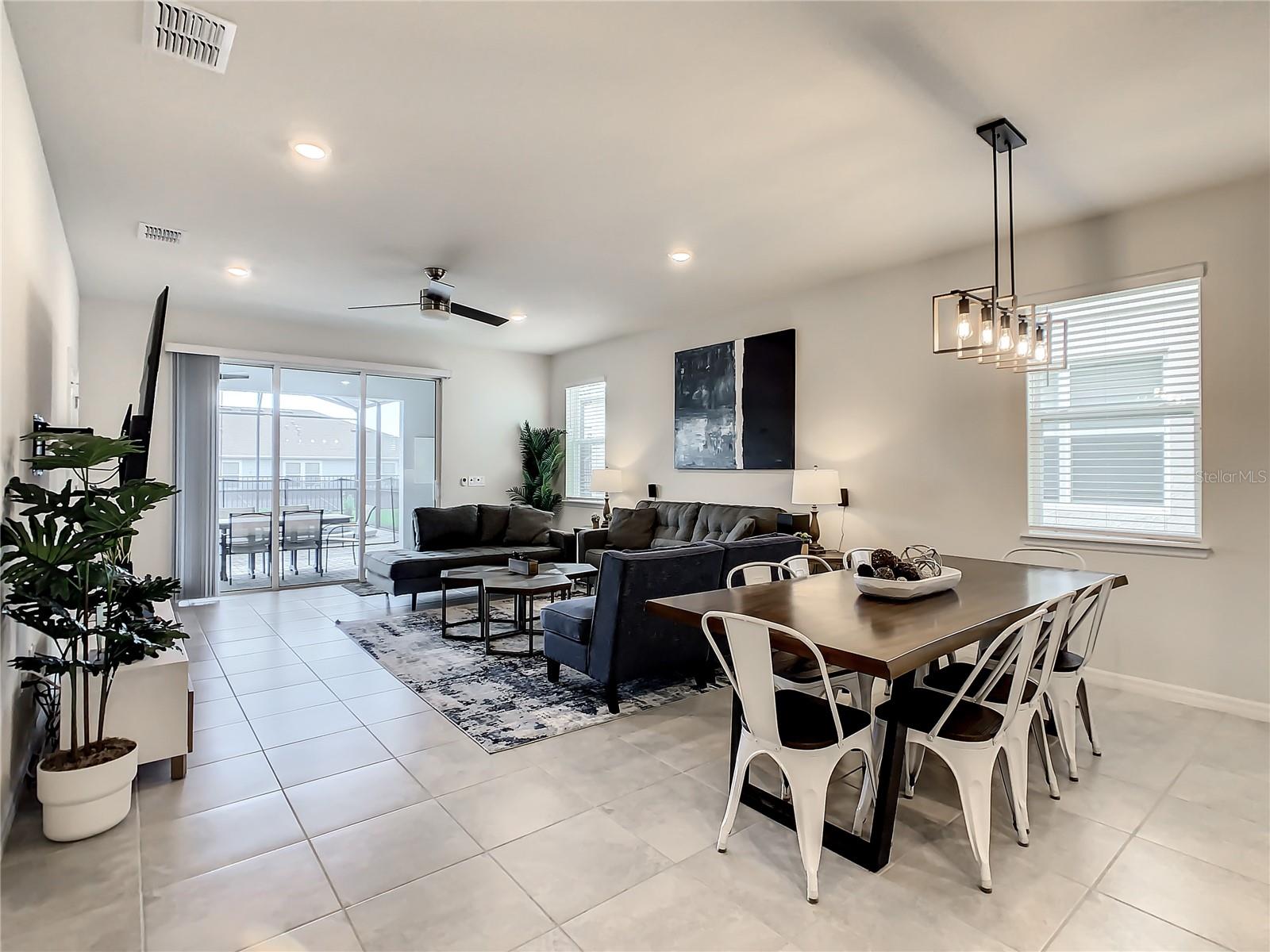 Indulge in the blend of luxury and energy efficiency at this stunning 7-bedroom, 5.5-bath vacation home situated in the esteemed gated community of Windsor Island. Benefit from reduced energy costs with the installation of solar panels while reveling in the allure of this nearly new residence. Spanning over 3,200 square feet, this capacious home is impeccably crafted and primed for rental opportunities. Upon entering, you are welcomed by an impressive foyer leading to a well-appointed kitchen featuring stainless steel appliances, a breakfast bar island, and an adjoining dining area. The commodious family room and sitting room offer ample space for relaxation and quality time with family and friends. Escape to the expansive master suite, a serene retreat boasting a luxurious en-suite bathroom. Outdoors, a large screened-in pool and spa beckon, providing a refreshing oasis for relaxation. The screened porch and spacious patio offer shaded spots for dining and enjoying the peaceful surroundings. The community itself provides a plethora of amenities including a lazy river, a resort-sized pool, tennis courts, sand volleyball, basketball courts, an on-site restaurant, a sundry shop, a fitness center, and an arcade. Additionally, the property is just minutes away from the renowned attractions of Walt Disney World and other Central Florida amusement parks.