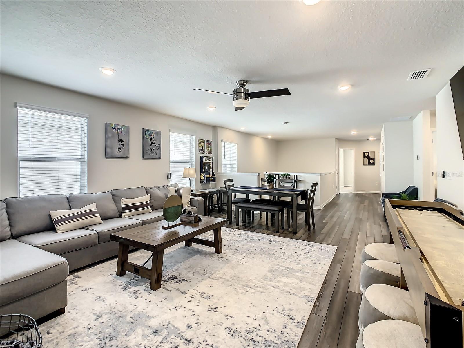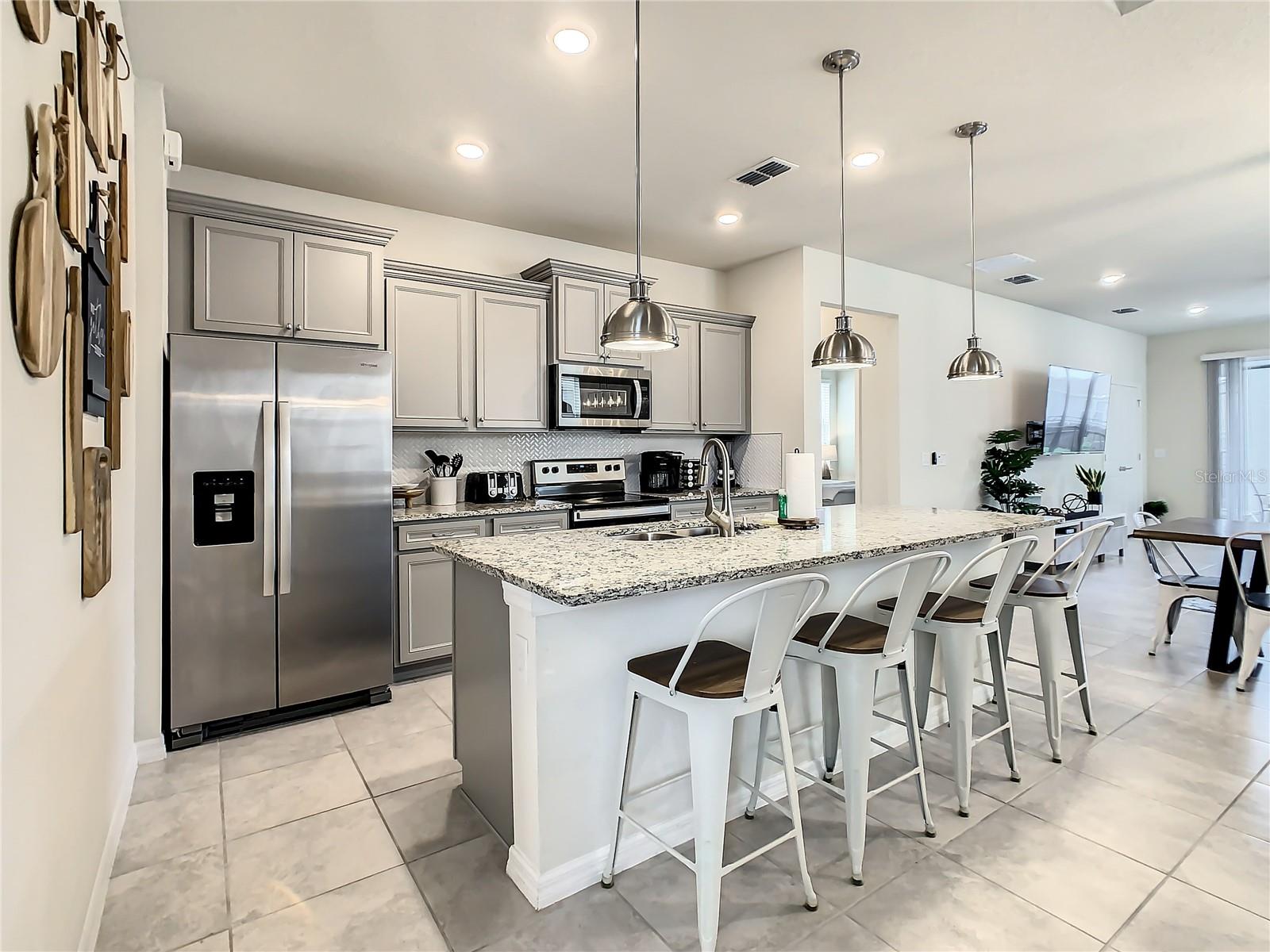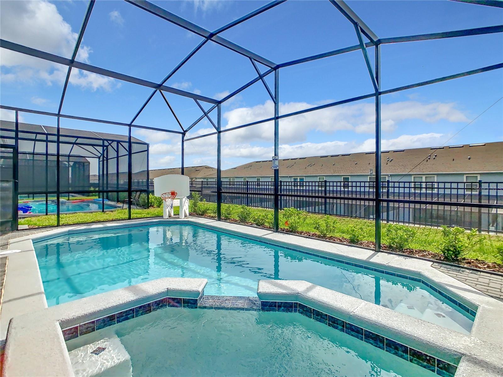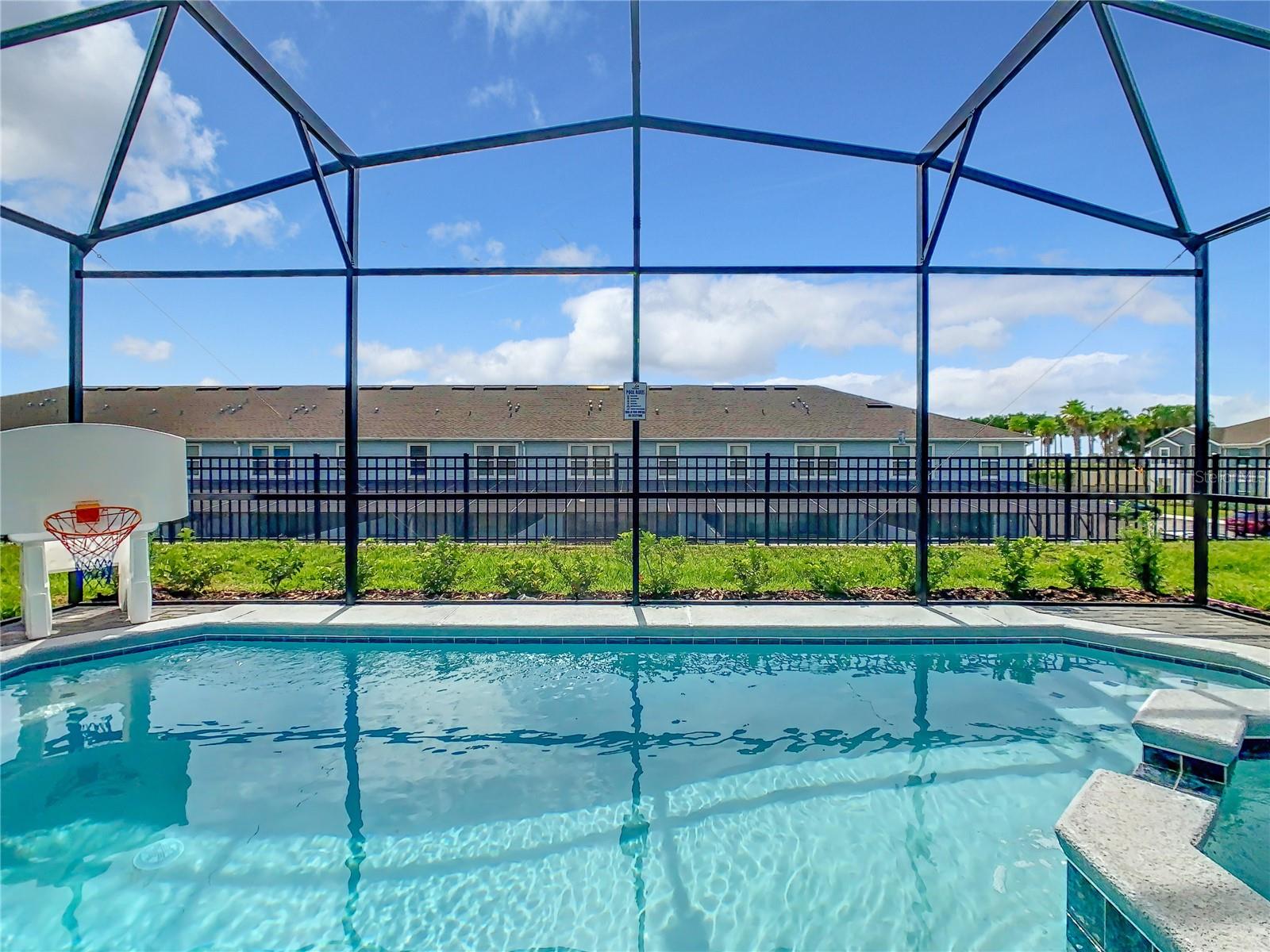 Indulge in the blend of luxury and energy efficiency at this stunning 7-bedroom, 5.5-bath vacation home situated in the esteemed gated community of Windsor Island. Benefit from reduced energy costs with the installation of solar panels while reveling in the allure of this nearly new residence. Spanning over 3,200 square feet, this capacious home is impeccably crafted and primed for rental opportunities. Upon entering, you are welcomed by an impressive foyer leading to a well-appointed kitchen featuring stainless steel appliances, a breakfast bar island, and an adjoining dining area. The commodious family room and sitting room offer ample space for relaxation and quality time with family and friends. Escape to the expansive master suite, a serene retreat boasting a luxurious en-suite bathroom. Outdoors, a large screened-in pool and spa beckon, providing a refreshing oasis for relaxation. The screened porch and spacious patio offer shaded spots for dining and enjoying the peaceful surroundings. The community itself provides a plethora of amenities including a lazy river, a resort-sized pool, tennis courts, sand volleyball, basketball courts, an on-site restaurant, a sundry shop, a fitness center, and an arcade. Additionally, the property is just minutes away from the renowned attractions of Walt Disney World and other Central Florida amusement parks.