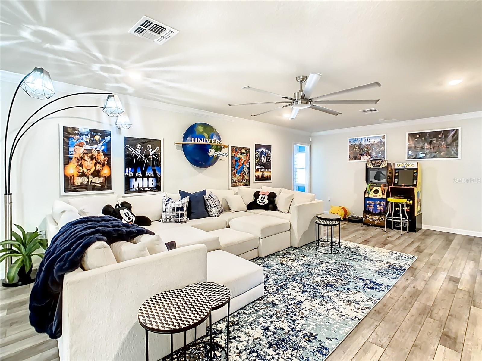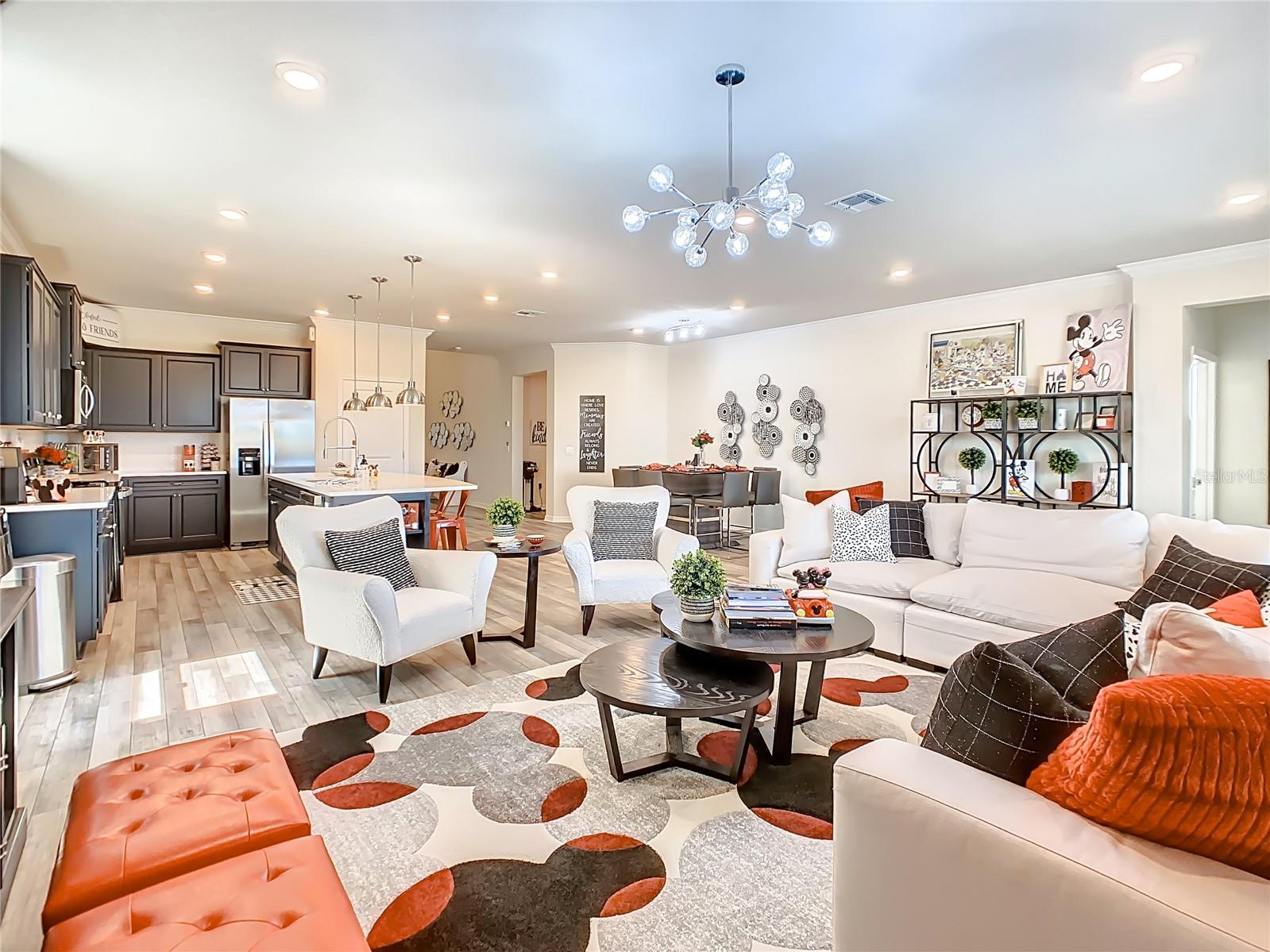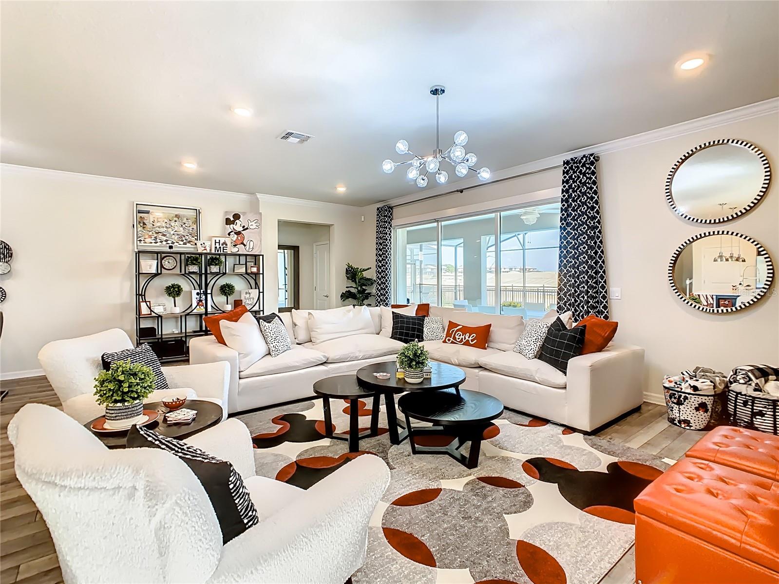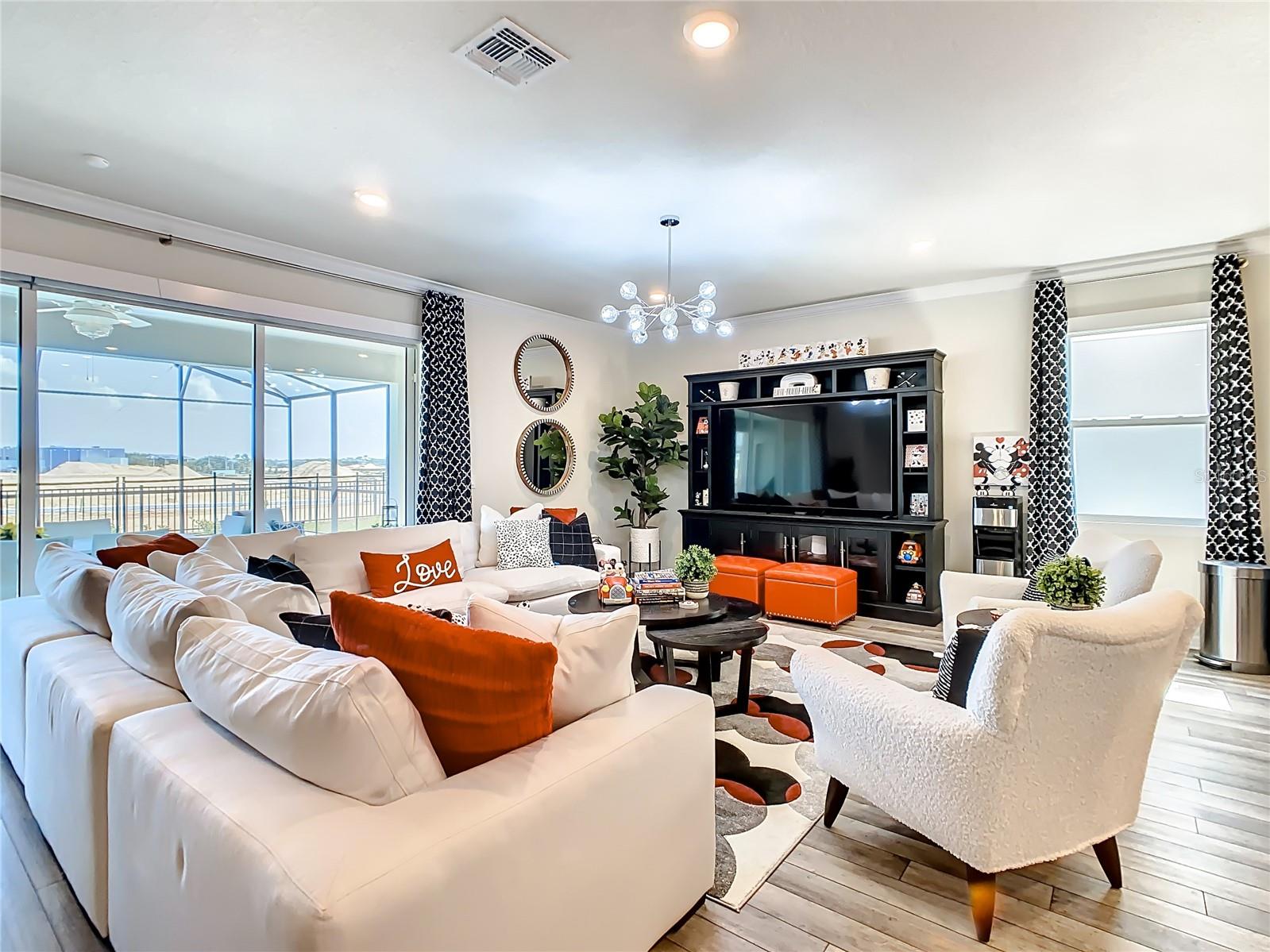 Indulge in the luxury of this pristine 8-bedroom, 6-bathroom vacation home inspired by Disney magic. This lavish retreat offers a welcoming ambiance with professionally designed decor that captures the essence of Disney. The Baymont floor plan by Pulte Homes boasts numerous upgrades such as enhanced lighting, automatic blinds, an epoxy garage floor, EV charging station, inside laundry room, and elegant furnishings, creating a serene environment from the moment you step inside. Relax by the saltwater pool and spa on the private lanai, perfect for unwinding after a day of excitement. With an advanced security system featuring cameras, your peace of mind is assured as you enjoy the spacious accommodations. An outdoor grill awaits for delightful al fresco dining under the Florida sky. Every detail in this exceptional home has been meticulously crafted to offer you and your family the ultimate Disney-inspired escape in both comfort and style. Don't miss the opportunity to tour this unique home - schedule your visit today.