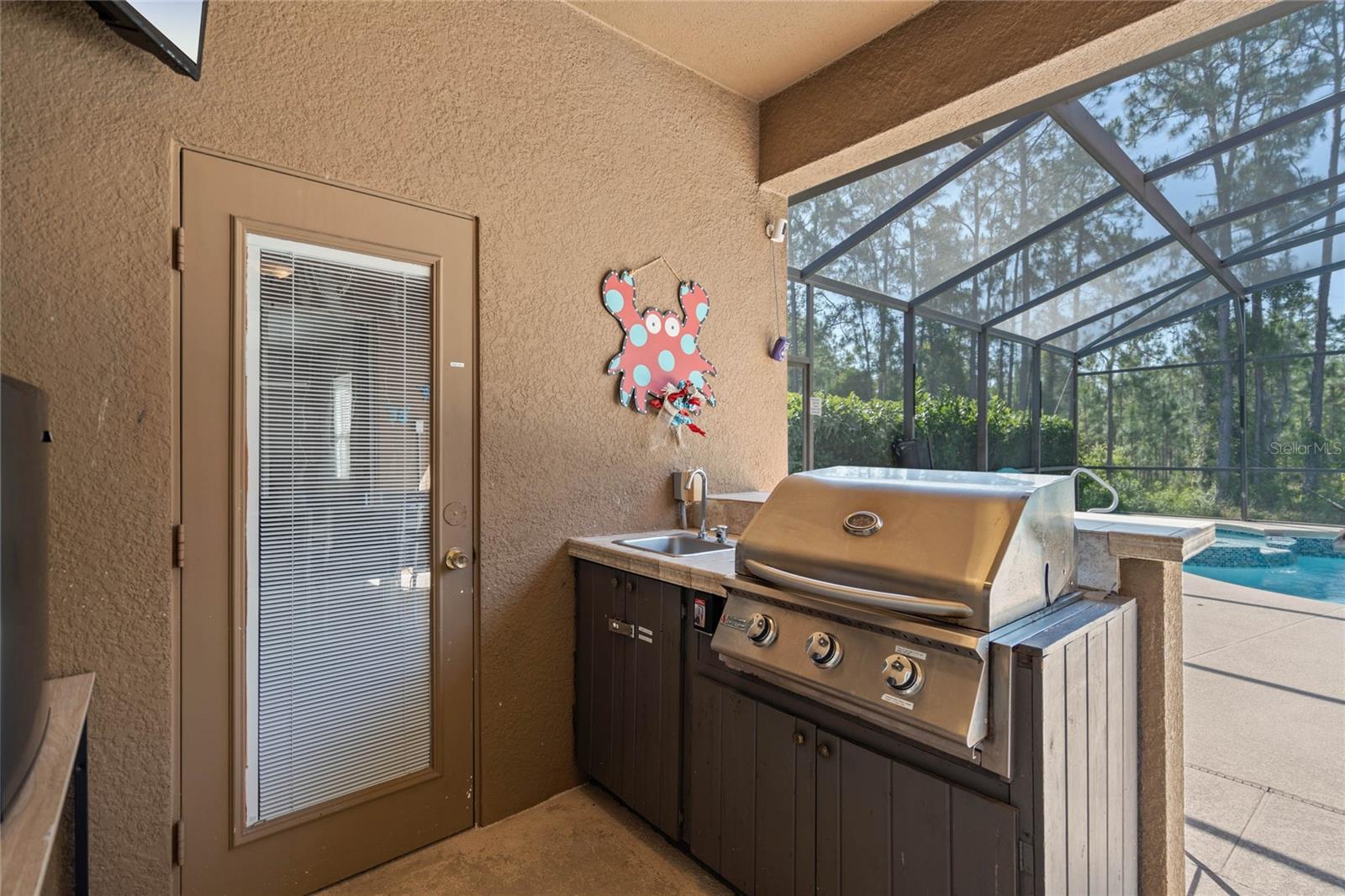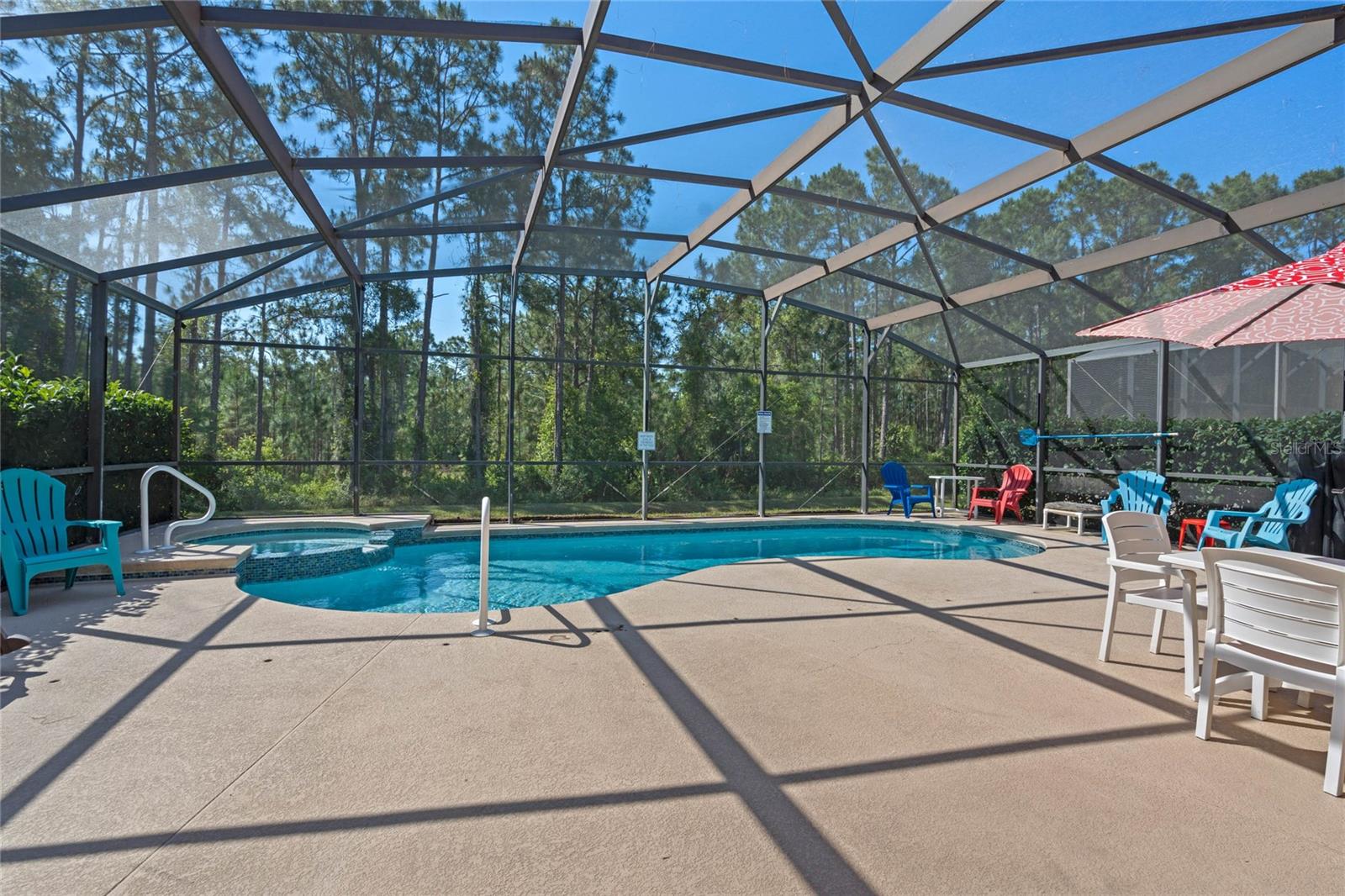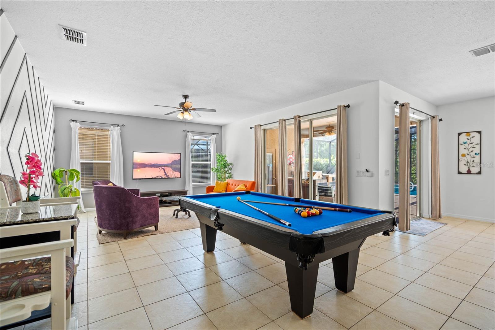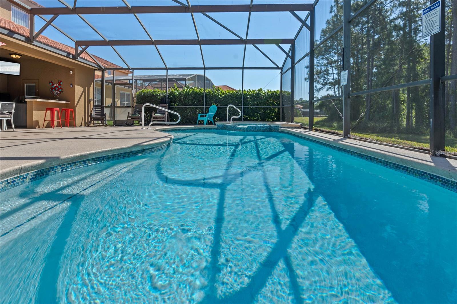**Seller offering a $10K Credit toward a 2/1 Rate Buy-Down and/or closing costs with Full Price Offer** What sets this home apart from others in the area? Whether you are looking for a home for a growing family, a vacation home, or short/long term rental, the ENERGY this large fully-furnished 6 bedroom home provides will keep you and your guests excited to return. Enjoy your day listening to sounds from the nature preserve, swimming in the SOUTHERN FACING POOL with privacy shrubs, grilling on the built in grilling station, soaking in the hot tub, and cleaning up in the pool ½ bath and outdoor shower. Control the pool and hot tub temperature and light colors from an app on your phone. The two sets of sliding glass doors and the large windows overlooking the pool area allow the indoor and outdoor living spaces to feel combined as one SPACIOUS area. Upon entering the home from the lanai covered pool area, you are welcomed by the OPEN kitchen, dining room, the living room with pool table and gorgeous accent wall. Continuing on, you will find a butlers pantry, the second half bath, second living room, and entrance to the garage. The garage has been converted to a game room with an extra full-size fridge/freezer, but could be converted into a garage for cars to park in if preferred. Ceramic tile lines the main floor and each room, has a mounted TV. Upstairs, you will find the laundry room, plenty of closets, an office/den area, a sitting space, and 6 bedrooms: 4 with ensuite bathrooms and 2 sharing a jack and jill. The flooring in all bedrooms is wood laminate. All bedrooms have a mounted TV. Control the home temperature from an app on your phone. UPDATES:Pool/Spa Resurfaced and Retiled, New Filter and Housing, New Pool Heater. All new paint and accent walls throughout the house. New Water Heater. Updated decor. Updated 42” kitchen cabinets and dishwasher. Updated garage game room. Pool Table Professionally Resurfaced and Leveled. SAFETY: Private gated community with 24/7 guard. Pool gate, lanai pool cover, door stoppers to pool. AMENITIES: The HOA includes trash valet service, mowing of Saint Augustine grass, and overlooking of irrigation system and timing, cable, internet, phone, stocked doggie stations throughout, and paved sidewalks. The community center offers a sand volleyball court, playground, pool, hot tub, grilling stations, bathrooms, game room, computer room, gym, and putt-putt golf.