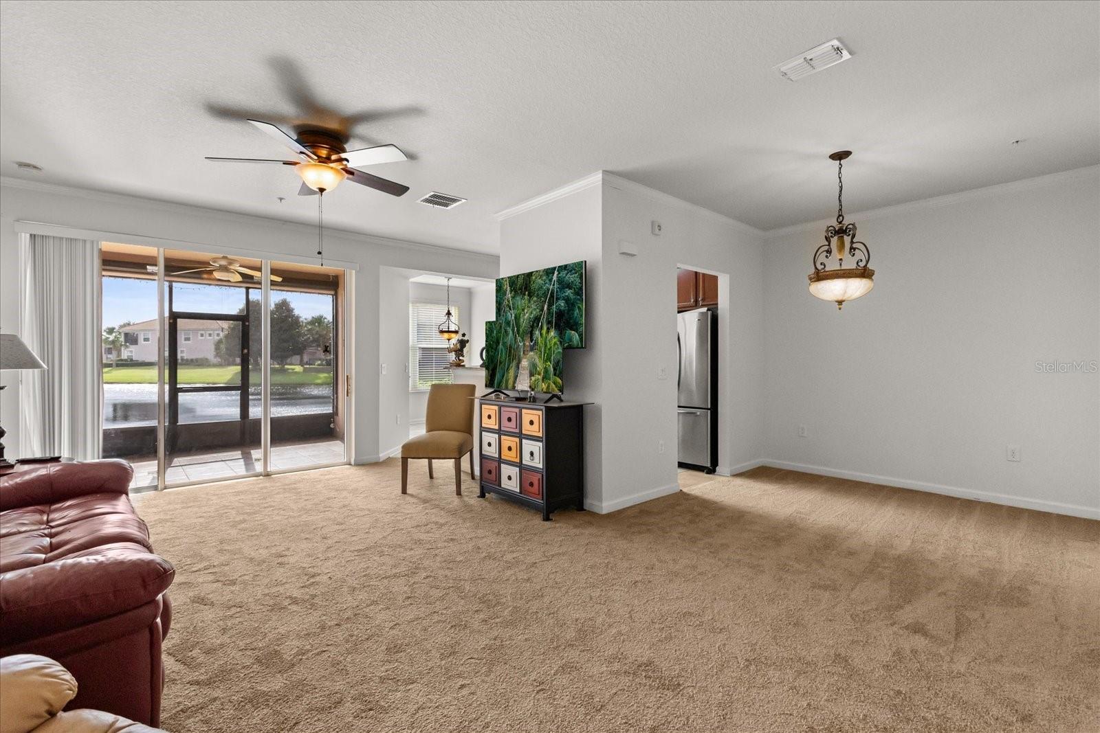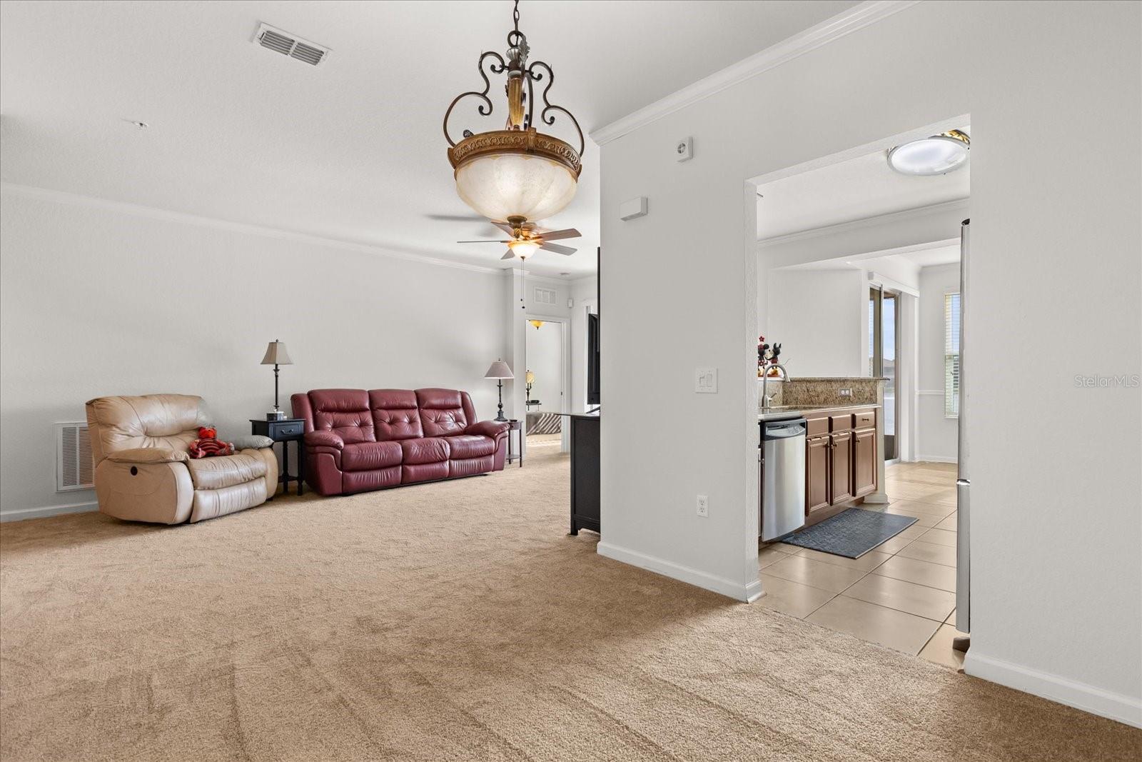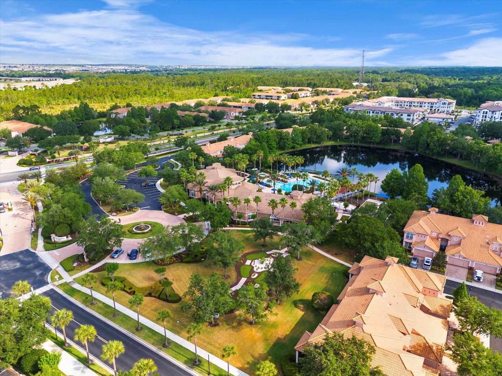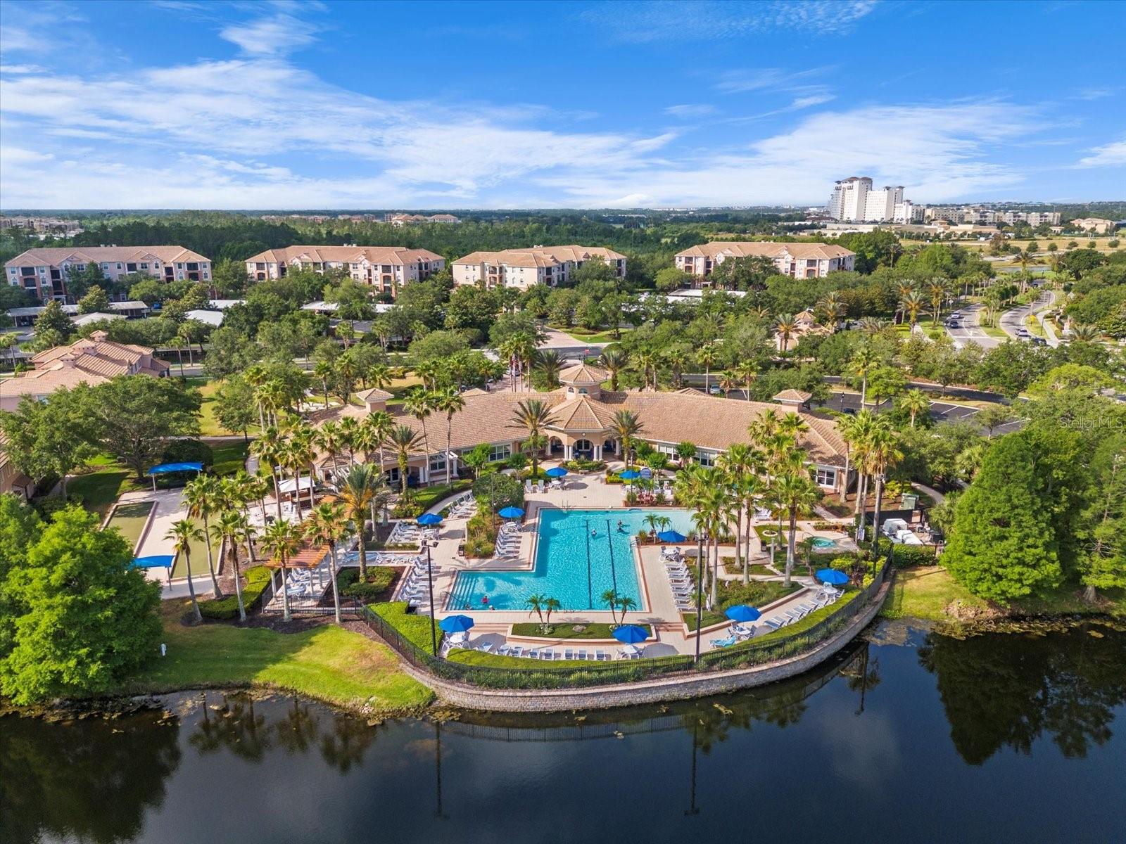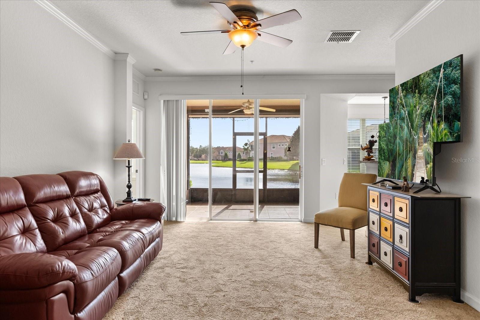 This home has been freshly re-painted with a neutral eggshell color and brand new carpet in all bedrooms, living room and dining room. The residence features 2 bedrooms and 2 full baths. A versatile office/den bonus room provides flexibility to accommodate various lifestyle needs, whether utilized as a home office, creative studio, or additional sleeping quarters. The open floor plan seamlessly connects the living space to the dining area and kitchen, perfect for entertaining guests or enjoying family time. Set against the backdrop of scenic beauty, this residence boasts a screened-in lanai with tile floors that provides breathtaking views overlooking the tranquil pond, creating a serene oasis for relaxation and enjoyment. With a washer and dryer conveniently located inside the unit, everyday tasks become effortless, adding to the overall convenience and comfort of living in this exceptional property. Furthermore, a private one-car garage offers secure parking and additional storage space, ensuring both convenience and security for residents. Residents also have the privilege of residing in a gated community, providing an extra layer of security and peace of mind. Indulge in resort-style amenities including a sparkling pool, rejuvenating jacuzzi, and state-of-the-art fitness center, perfect for maintaining an active and healthy lifestyle. Conveniently located in the heart of Championsgate, this property provides easy access to Disney parks, major highways, shopping, dining, and entertainment. Whether you're seeking a permanent residence, vacation getaway, or investment opportunity, this property represents the pinnacle of resort-style living in one of Florida's most sought-after destinations.