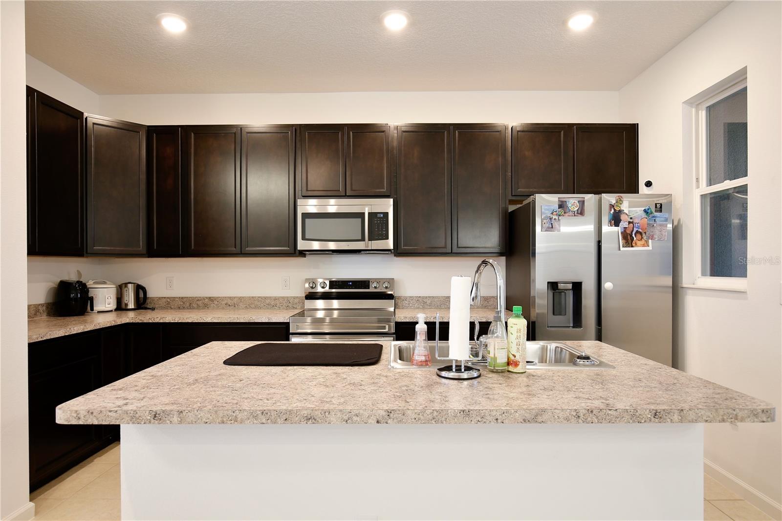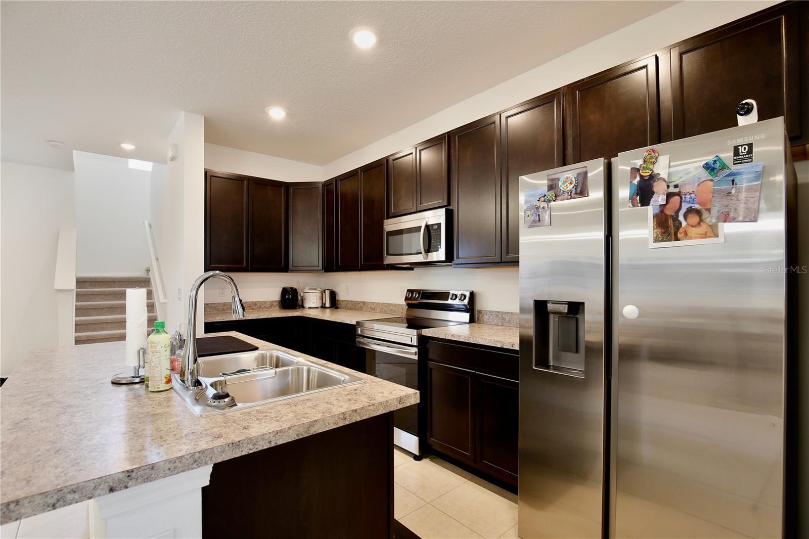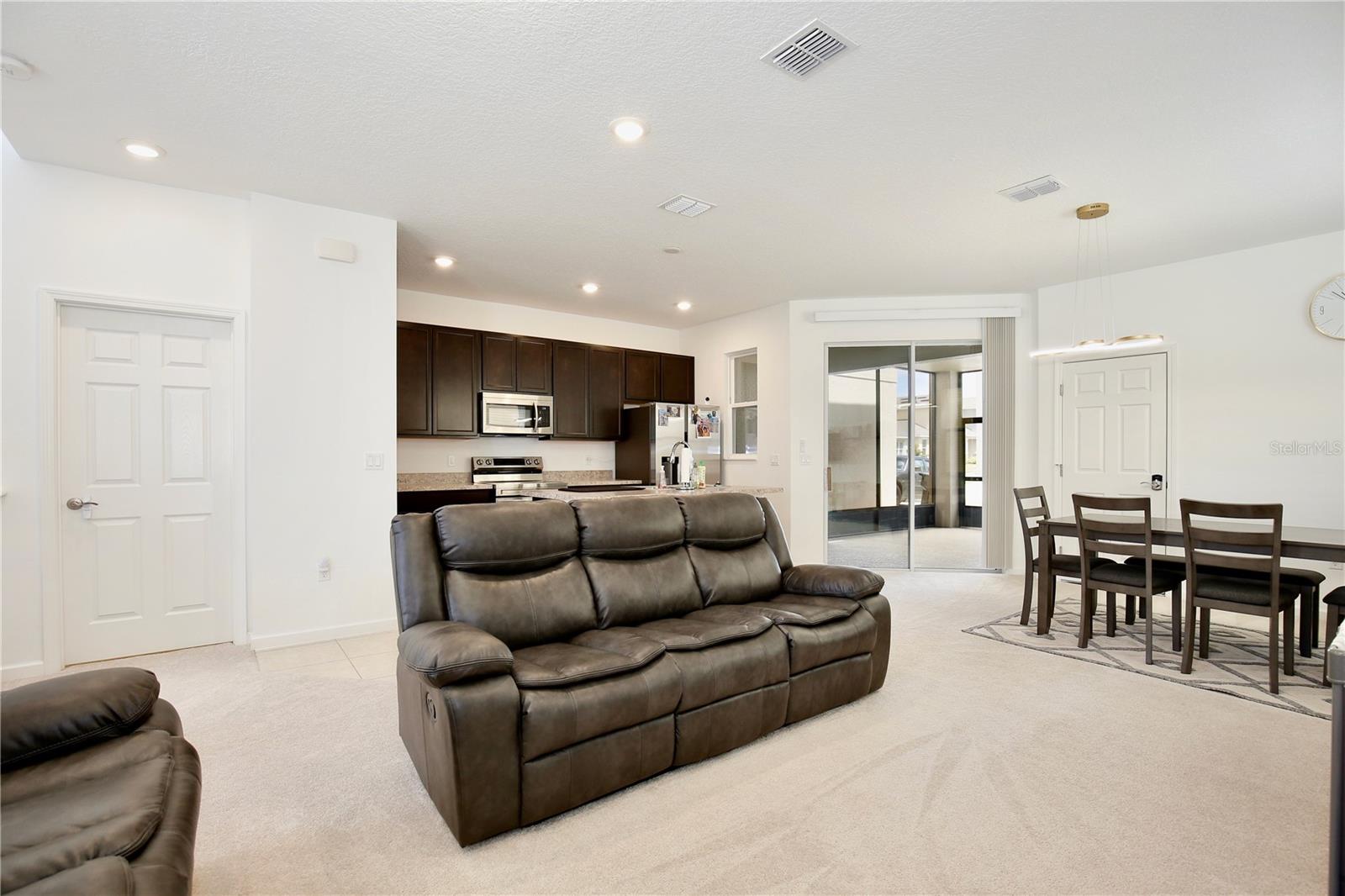 Lowest Listed Price in the Community- Step into the essence of modern comfort with this stunning three bedroom, two and a half bath house nestled in a gated community. With its curb appeal and landscaping, this home features stone facade and a welcoming covered front porch that sets the tone for the inviting ambiance within. Once inside, you'll be greeted by an open floor plan that is both airy and bright, painted in soothing neutral colors that provide the perfect canvas for your personal touch. Adorned with modern LED light fixtures, the living room seamlessly flows into the dining area, granting easy access to the rear entry one car garage. The kitchen is a chef's delight featuring mocha shaker cabinets, gleaming stainless steel appliances, and a center island with bar top seating. Sliding glass doors open to the covered patio, an idyllic spot for summer barbecues and family gatherings. A convenient half bath on the first floor caters to guests, while the staircase leads to a loft space that can transform into a home office, gym, theater, or playroom. The spacious primary suite boasts a walk in closet and ensuite bath with dual sinks, a glass door shower, and a separate bathtub. Two additional guest bedrooms, a full guest bath with a tub/shower combo, and a laundry room complete the second floor. A community swimming pool is walking distance away, awaiting summer fun with family and friends in the Florida sunshine. With quick access to highway 27 and I-4, shopping and dining, Target, Walmart, HomeGoods, and major attractions including Disney World and Disney Springs, everything you need is within close proximity. Don't miss your chance to own this captivating home—call today to schedule a showing and start making memories that will last a lifetime!