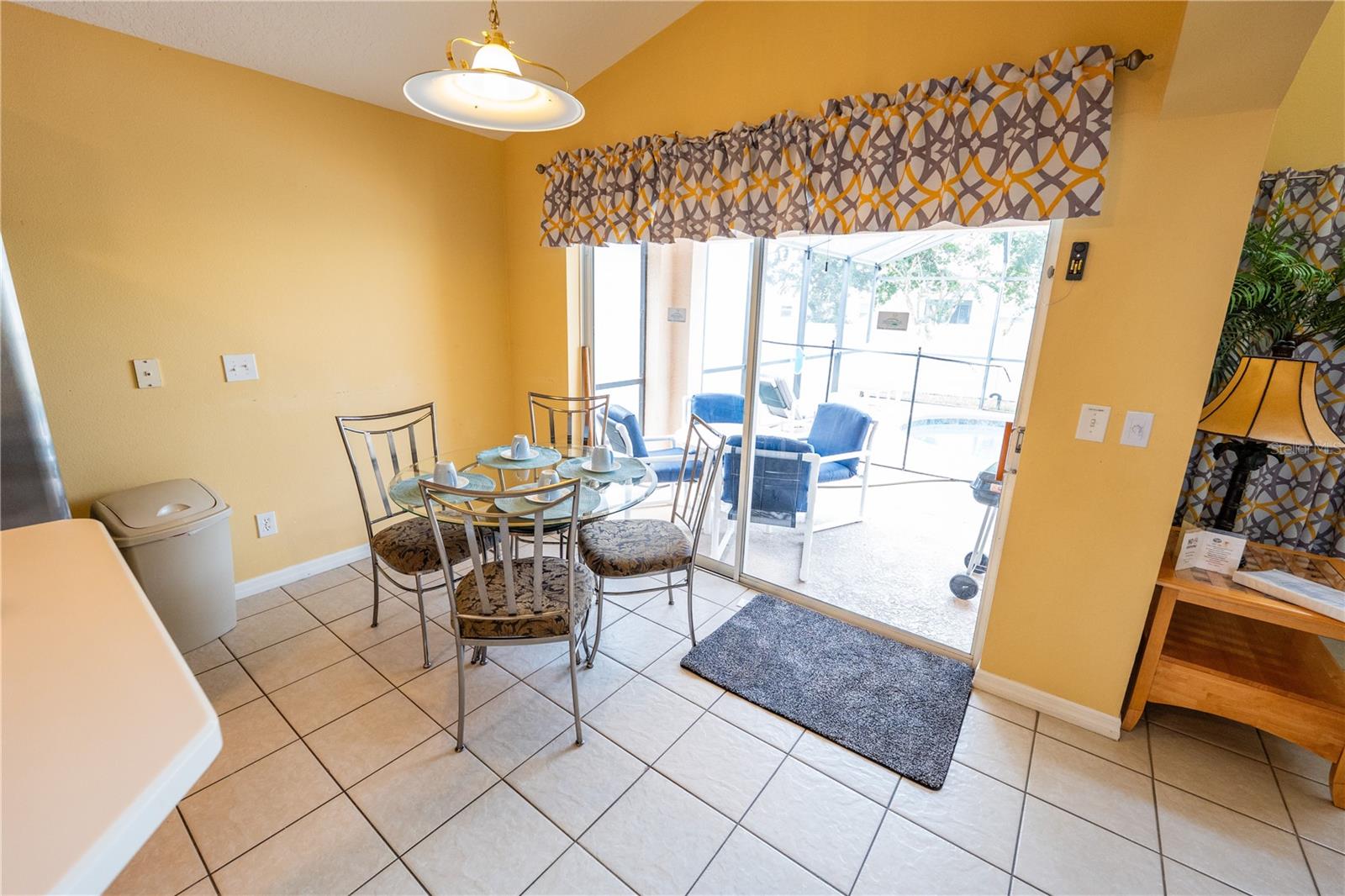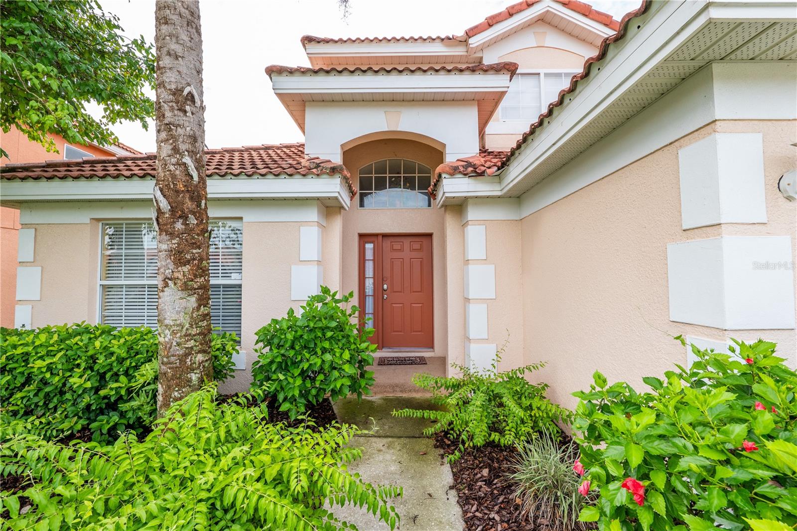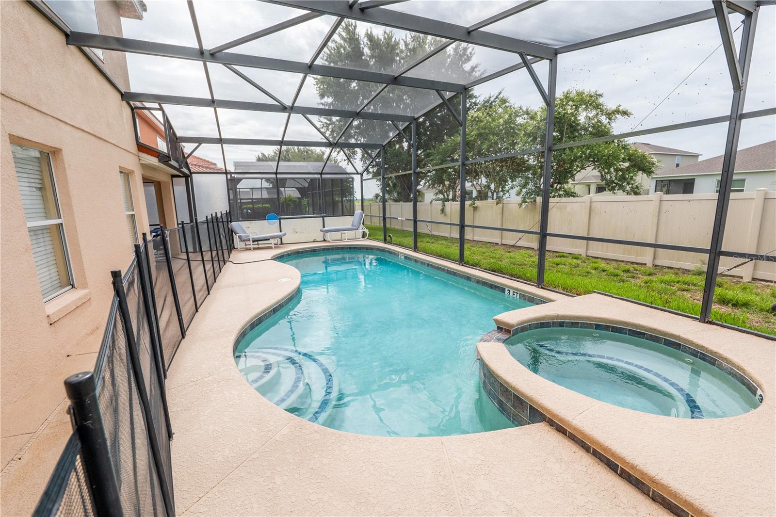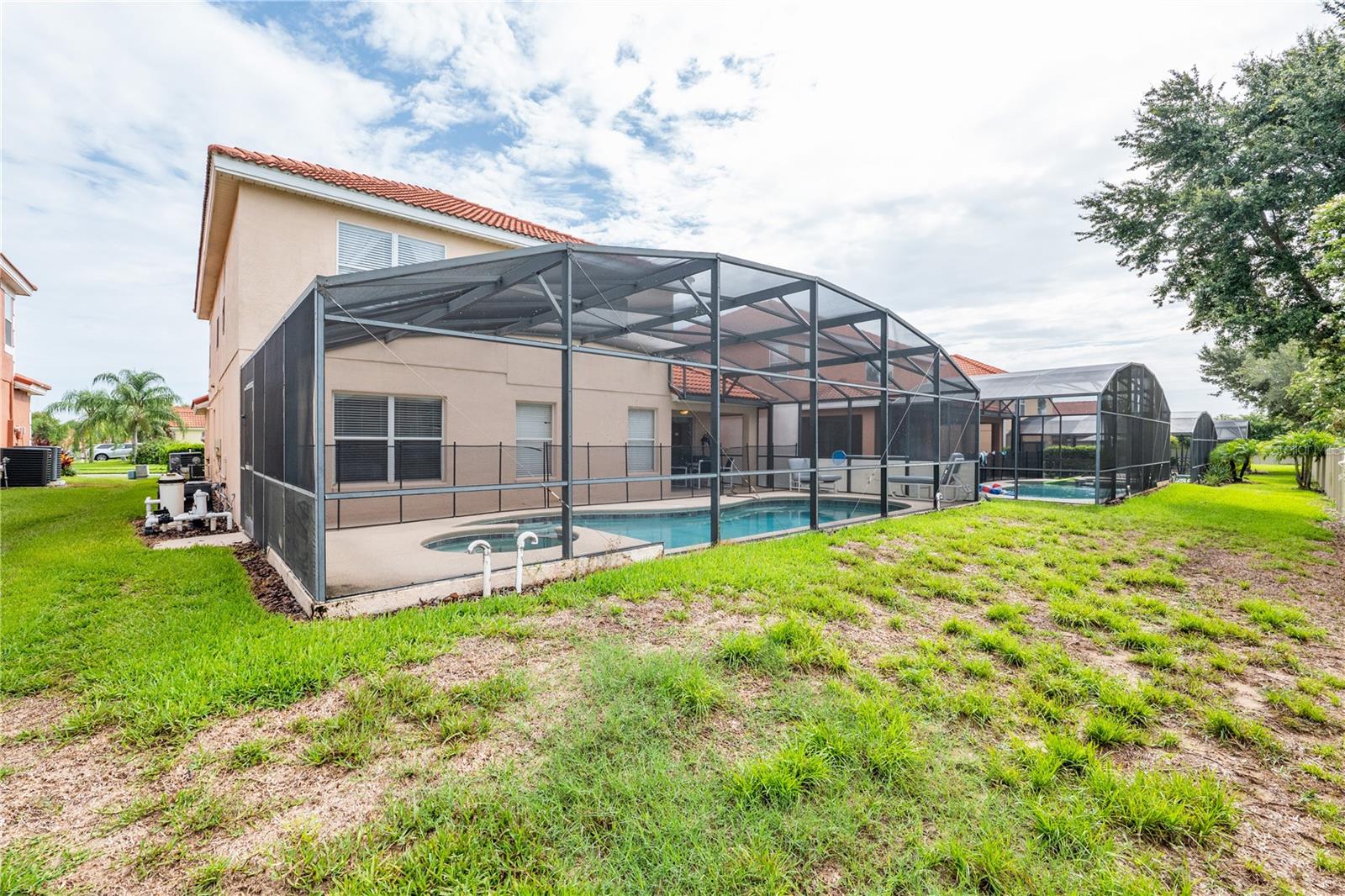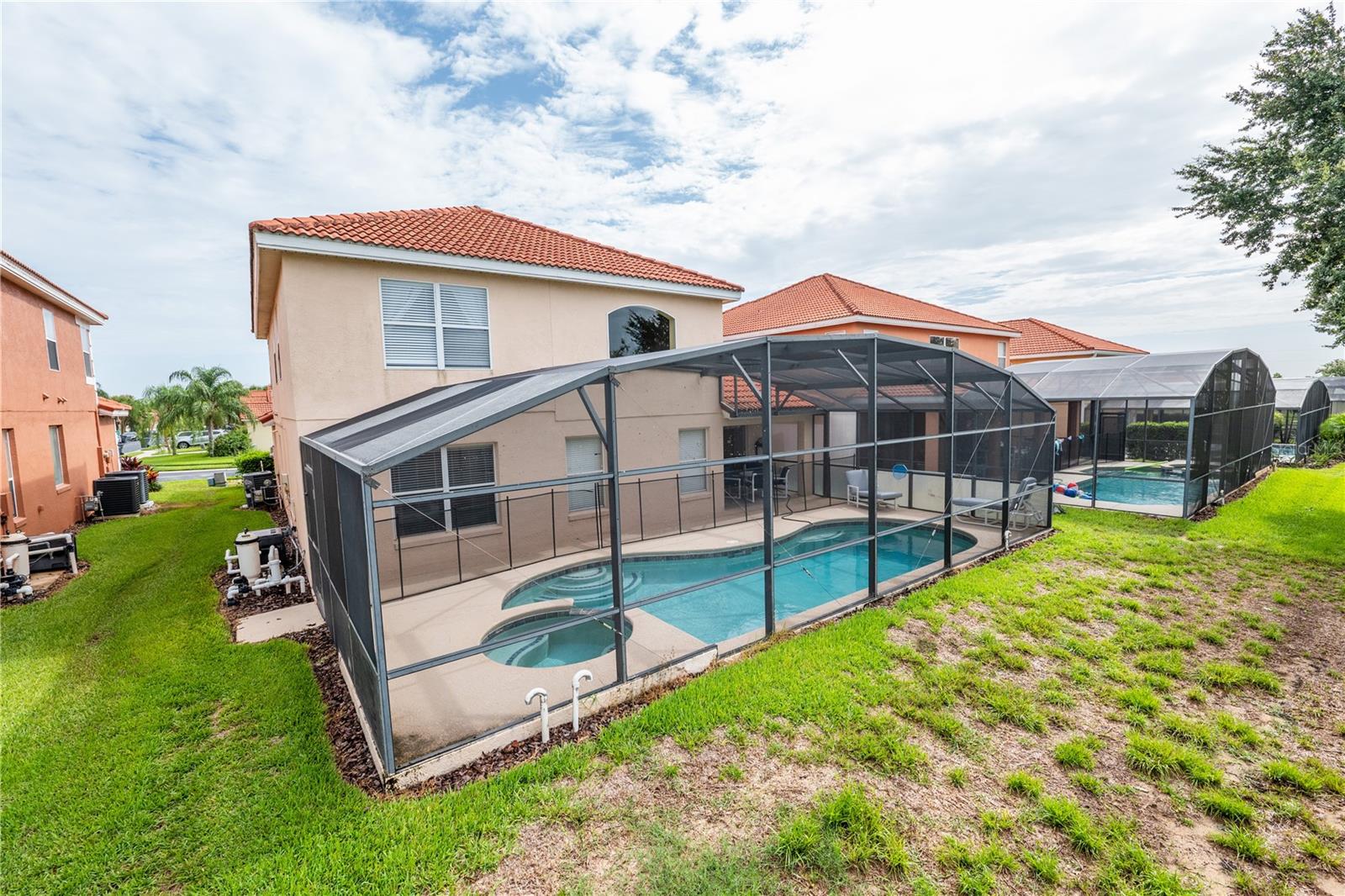 Live the Florida lifestyle in this charming, fully furnished five-bedroom, four-bath pool home in Solana's guard-gated resort community. Upon entering, embrace the soaring ceilings and natural light as you view the breathtaking floor plan of this Mediterranean-style home. Enjoy preparing your favorite meals in the fully equipped kitchen with stone countertops, and stainless steel appliances with a nook overlooking the pool area. The formal dining room off the kitchen is a true entertainer's dream. The impressive family room with warm natural light is a great place to relax and enjoy your favorite shows, game nights, or spend time with the family after a day at work or the parks. This 2-story home features a spacious first-floor primary room with a ceiling fan and a large walk-in closet with an ensuite bathroom. The primary bath features dual sinks, a garden tub, and a walk-in shower. An additional bedroom on the first floor adds convenience, and a bathroom with a walk-in shower with glass surround. This magnificent home offers further entertainment with a private game room with pool table and foosball. Three ample-sized bedrooms upstairs, one with two beds, and a third with bunk beds that share a full bath with extended vanity and shower. The fifth bedroom has a single queen bed with an en-suite bathroom with shower and tub. The covered lanai adjacent to the heated pool/spa with a screen enclosure and no rear neighbors, creates the perfect spot to relax & unwind while sipping your favorite drink or entertaining. Experience privacy and security in the Solana guard-gated Community while enjoying its featured amenities including a clubhouse, fitness center, playground, community pool and so much more. Located close to Disney World, and many other great tourist locations, this Home is prime for you to use year-round, a private vacation home, or short-term as an Airbnb. Don't miss out on this opportunity. Call for your private showing today.