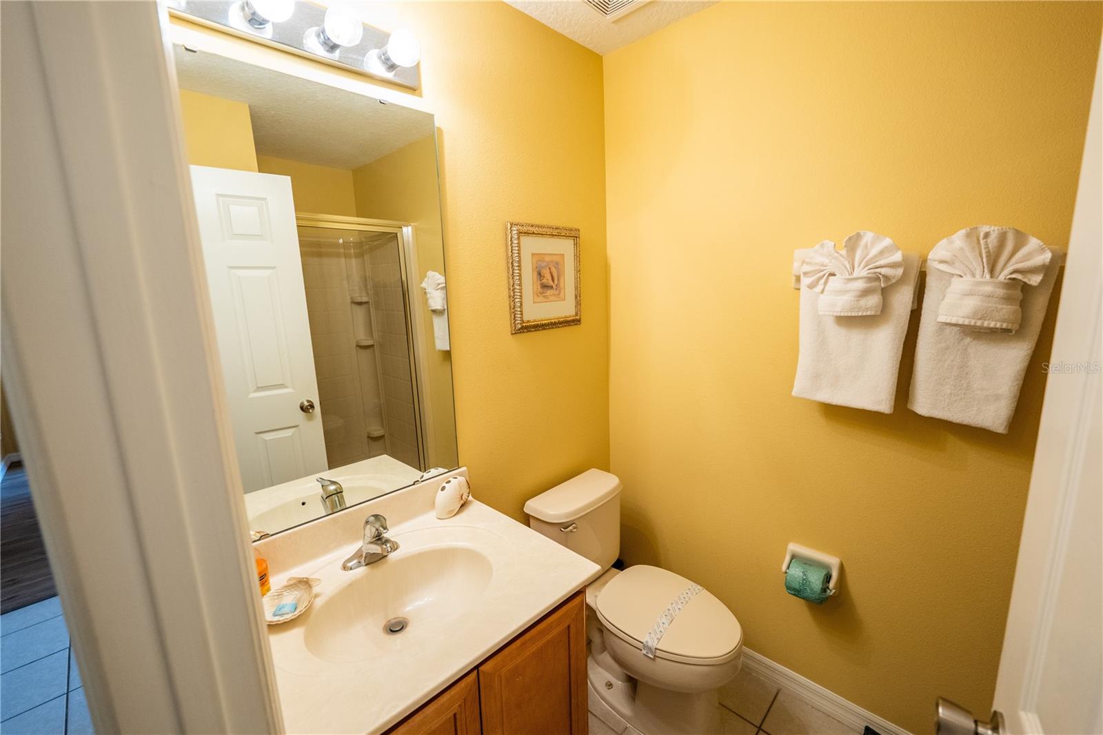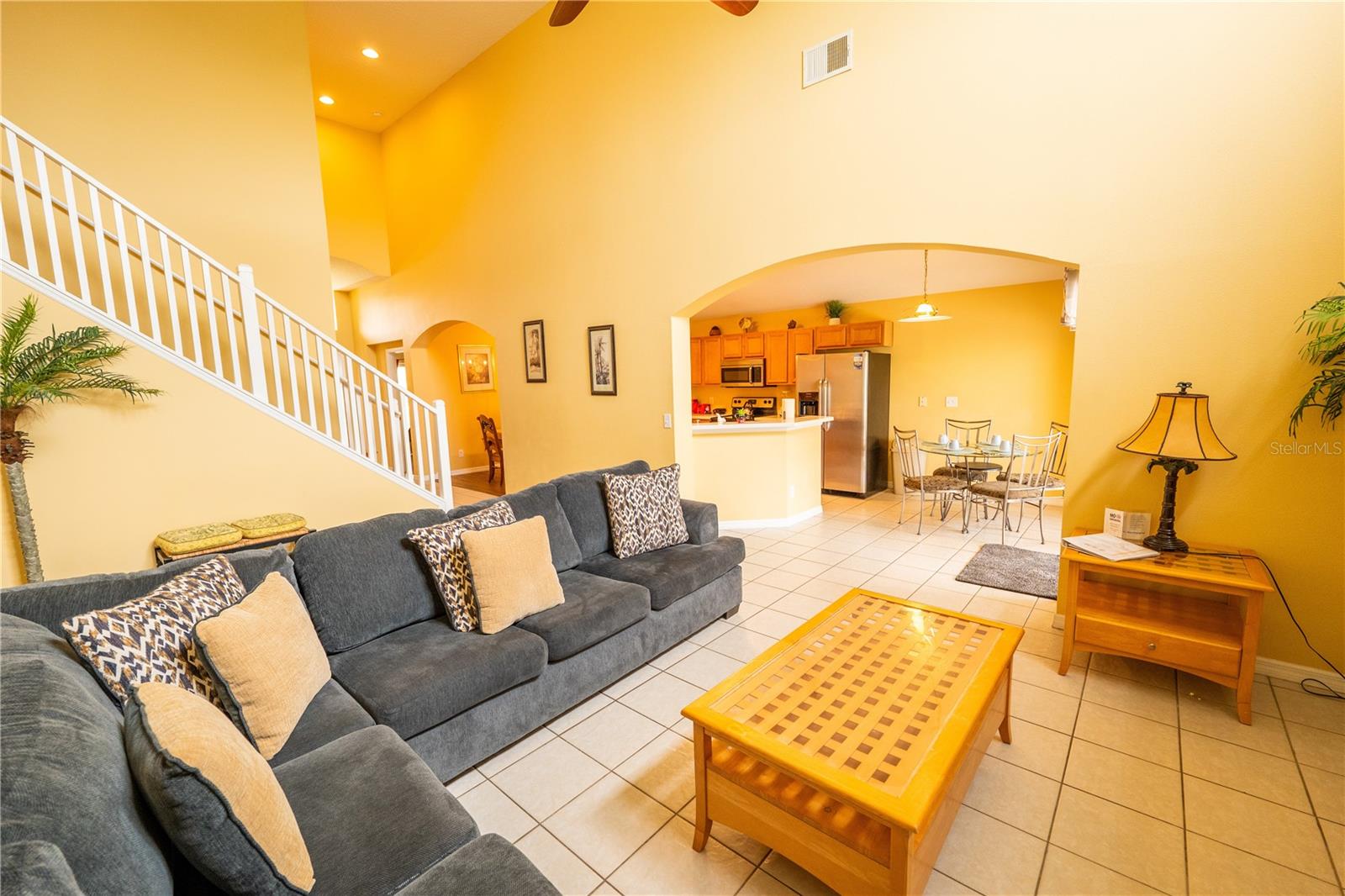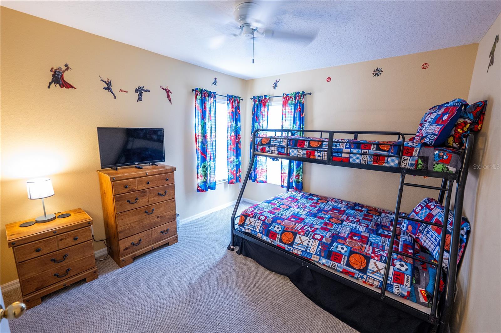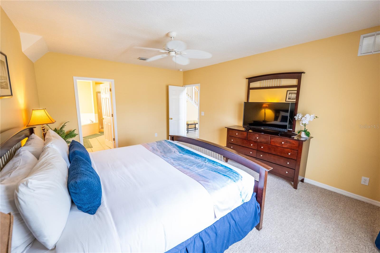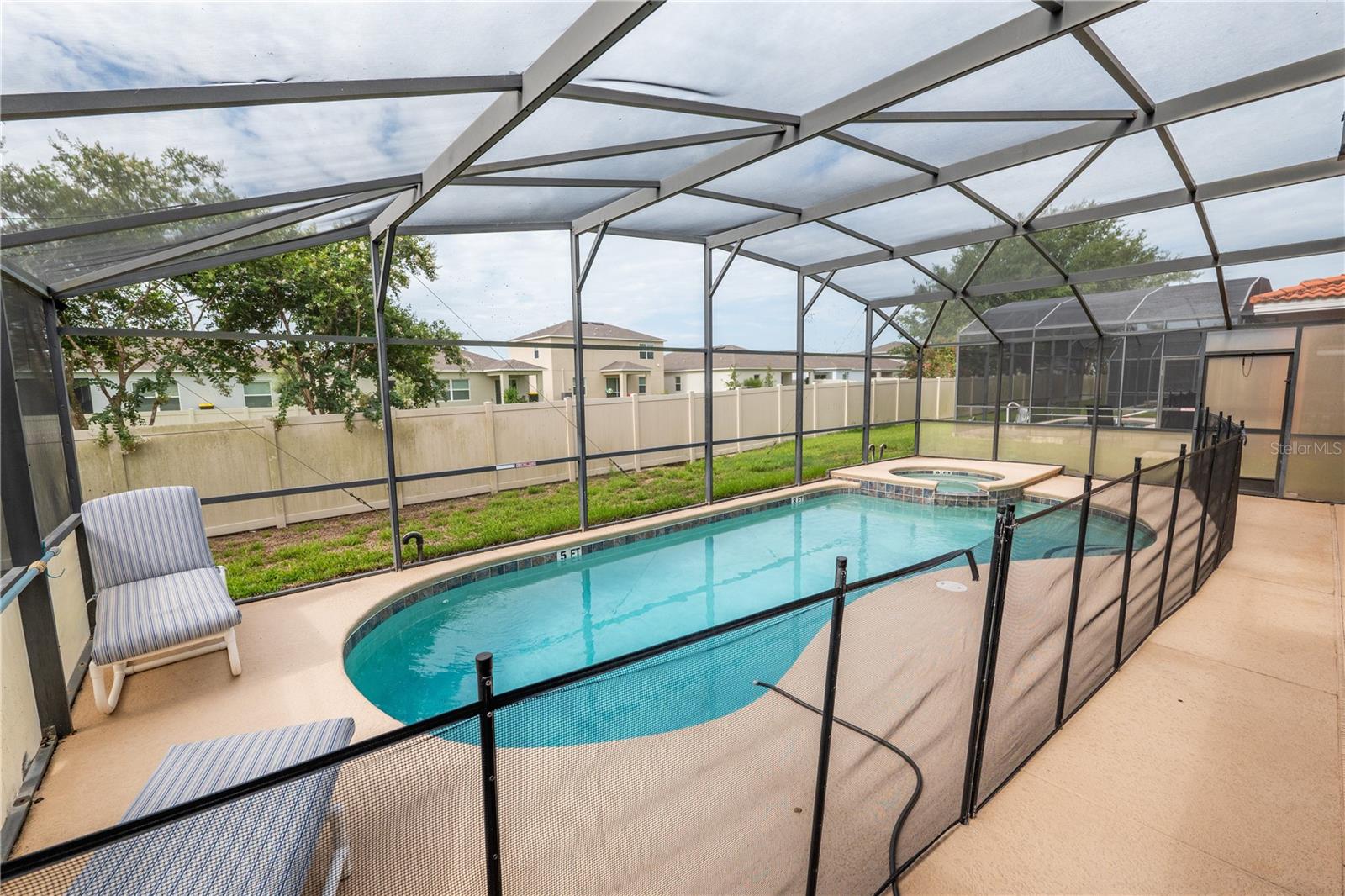 Live the Florida lifestyle in this charming, fully furnished five-bedroom, four-bath pool home in Solana's guard-gated resort community. Upon entering, embrace the soaring ceilings and natural light as you view the breathtaking floor plan of this Mediterranean-style home. Enjoy preparing your favorite meals in the fully equipped kitchen with stone countertops, and stainless steel appliances with a nook overlooking the pool area. The formal dining room off the kitchen is a true entertainer's dream. The impressive family room with warm natural light is a great place to relax and enjoy your favorite shows, game nights, or spend time with the family after a day at work or the parks. This 2-story home features a spacious first-floor primary room with a ceiling fan and a large walk-in closet with an ensuite bathroom. The primary bath features dual sinks, a garden tub, and a walk-in shower. An additional bedroom on the first floor adds convenience, and a bathroom with a walk-in shower with glass surround. This magnificent home offers further entertainment with a private game room with pool table and foosball. Three ample-sized bedrooms upstairs, one with two beds, and a third with bunk beds that share a full bath with extended vanity and shower. The fifth bedroom has a single queen bed with an en-suite bathroom with shower and tub. The covered lanai adjacent to the heated pool/spa with a screen enclosure and no rear neighbors, creates the perfect spot to relax & unwind while sipping your favorite drink or entertaining. Experience privacy and security in the Solana guard-gated Community while enjoying its featured amenities including a clubhouse, fitness center, playground, community pool and so much more. Located close to Disney World, and many other great tourist locations, this Home is prime for you to use year-round, a private vacation home, or short-term as an Airbnb. Don't miss out on this opportunity. Call for your private showing today.