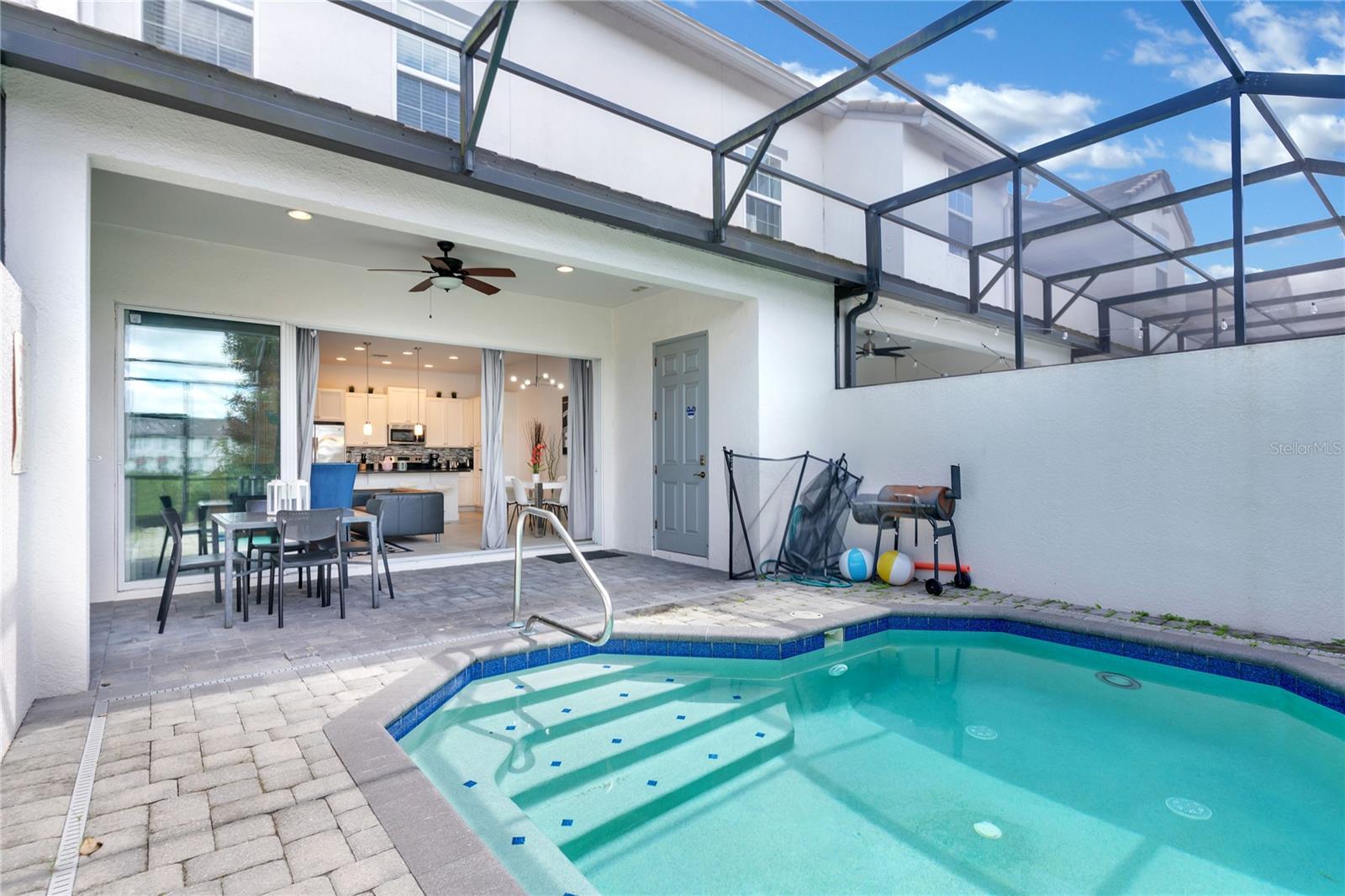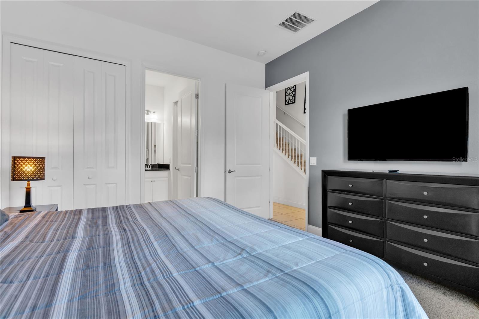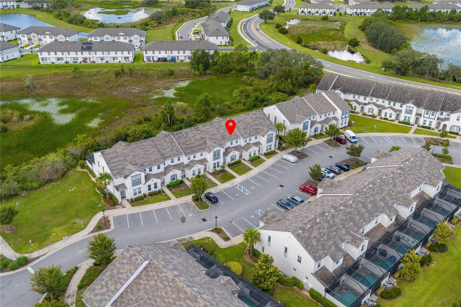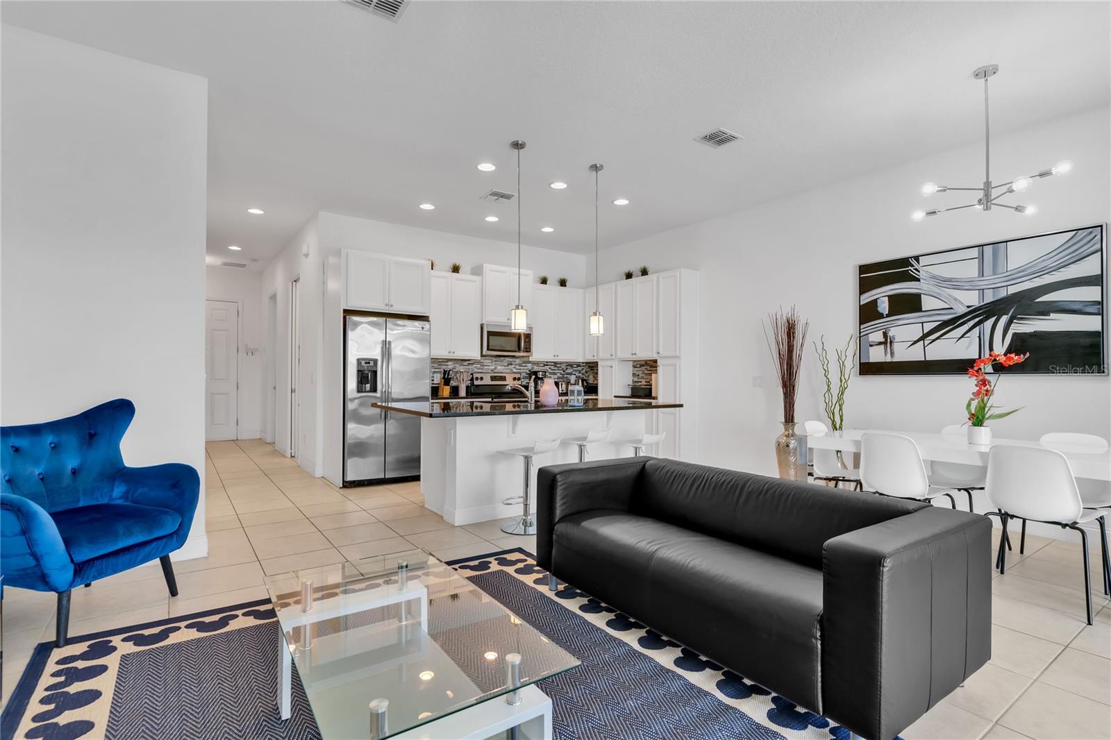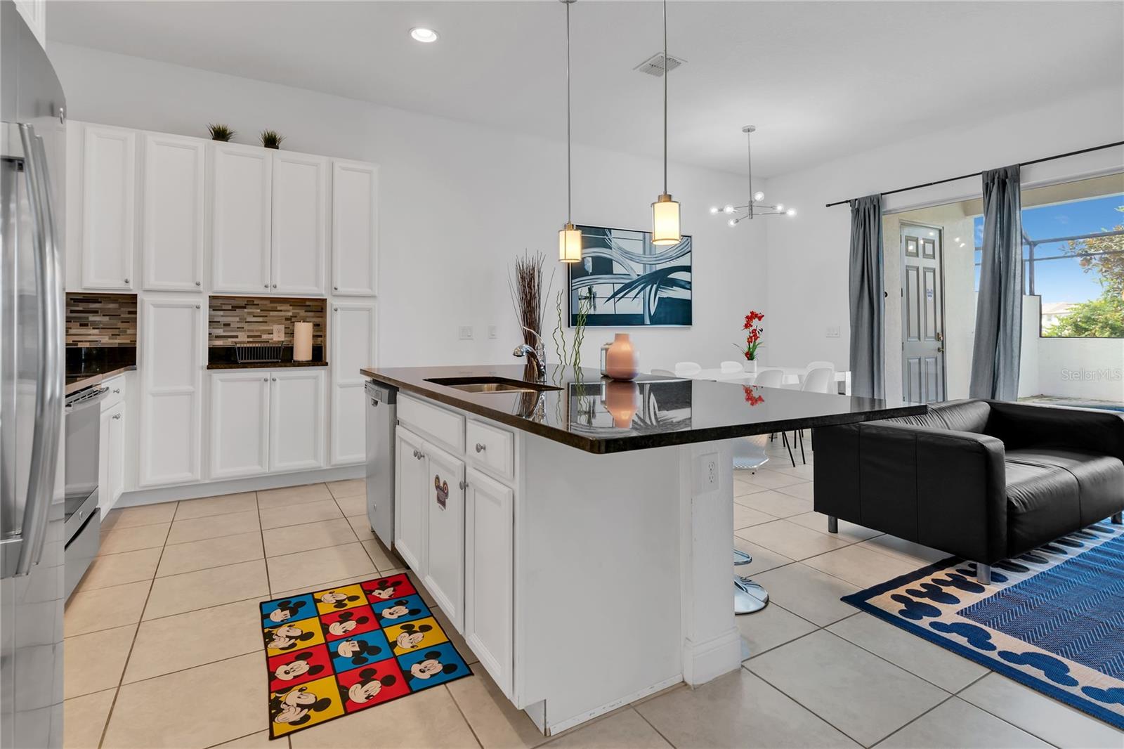 FULLY FURNISHED! Beautiful townhouse FOR SALE. 3 bedrooms, 2.5 bathrooms. The house's design and furniture reflect a modern and contemporary style. Located at Festival Bay Resort, 10 minutes from Disney World, 16 minutes from SeaWorld, 22 minutes from Universal Studios, close to top restaurants, convenience stores and pharmacy. Perfect location for visiting Orlando and Central Florida. Stunning gourmet kitchen, modern décor with stainless steel appliances, granite countertops, huge island, 42" cabinets with custom moldings and backsplash. Laundry room conveniently located on the ground floor. The common living area features an open living and dining space. The living room has a 55" TV for family entertainment and relaxation on comfortable furniture. Dining room furniture for up to 6. The space is bright and airy thanks to a wall of sliding doors that bathe the area in light and provide direct access to the covered patio, perfect for outdoor dining and enjoying Florida's tropical climate, heated pool (with jacuzzi), privacy walls on both sides of the patio, convenient storage closet, and a beautiful conservation view in the back. Upstairs, you have a flex room with a sofa bed amidst two other fully furnished rooms for your guests, with a beautiful bathroom featuring double sinks and granite countertops. The master suite is on the ground floor and includes a king-size bed and private bathroom with a shower. This private bathroom includes a sliding door that divides the washroom, providing convenient access to the bathroom for all those enjoying the amenities on the ground floor. HOA fees include internet, cable, garbage, pest control, water, exterior/ground maintenance. Amenities: fitness center, poolside restaurant, resort-style pool, water park for the younger ones, game room, and more! You will be thoroughly impressed with everything this property offers. This home is a great investment opportunity. It can be rented for both SHORT and LONG TERM ensuring profitability for the investor. Come and see everything this special home has!