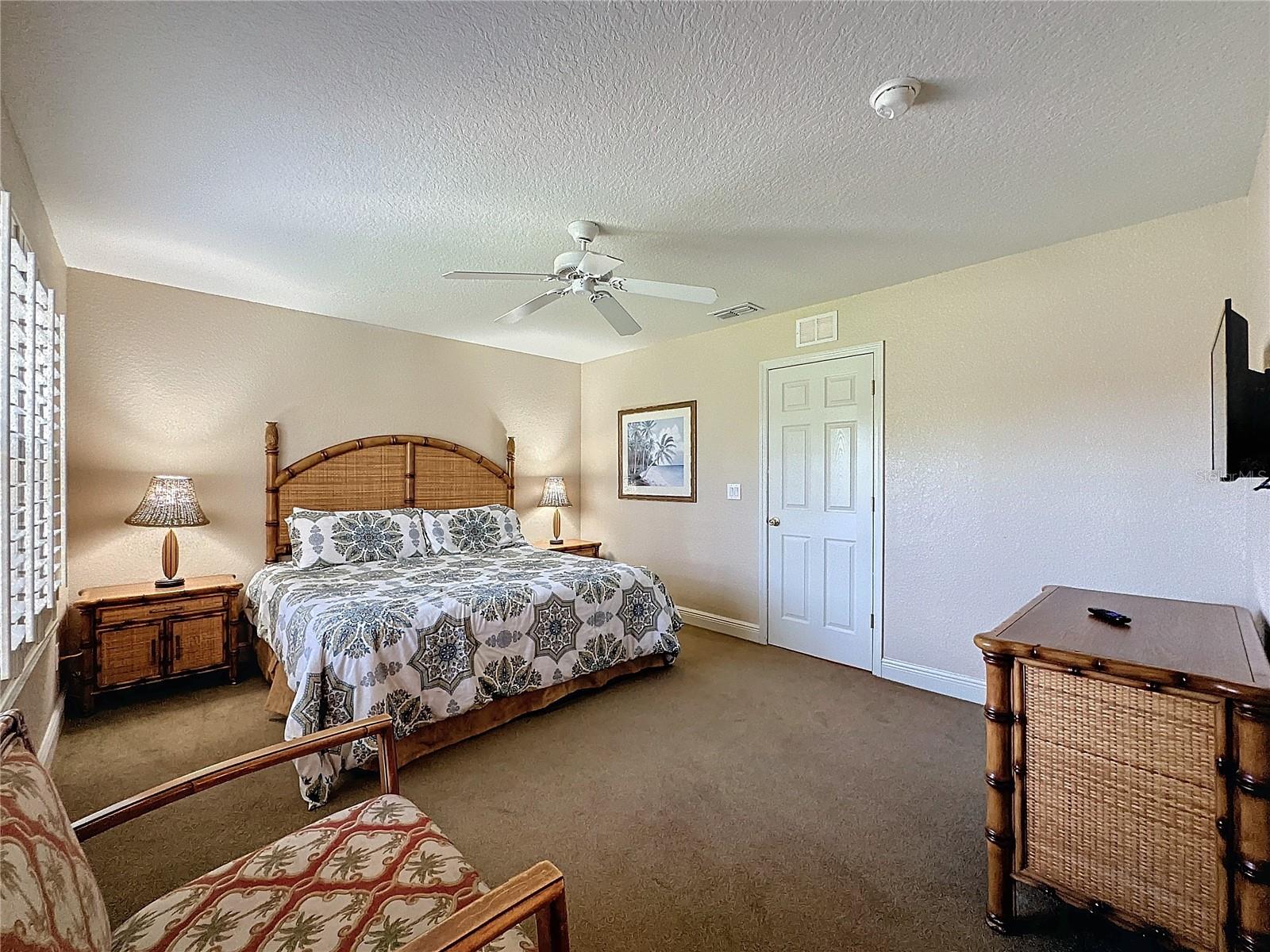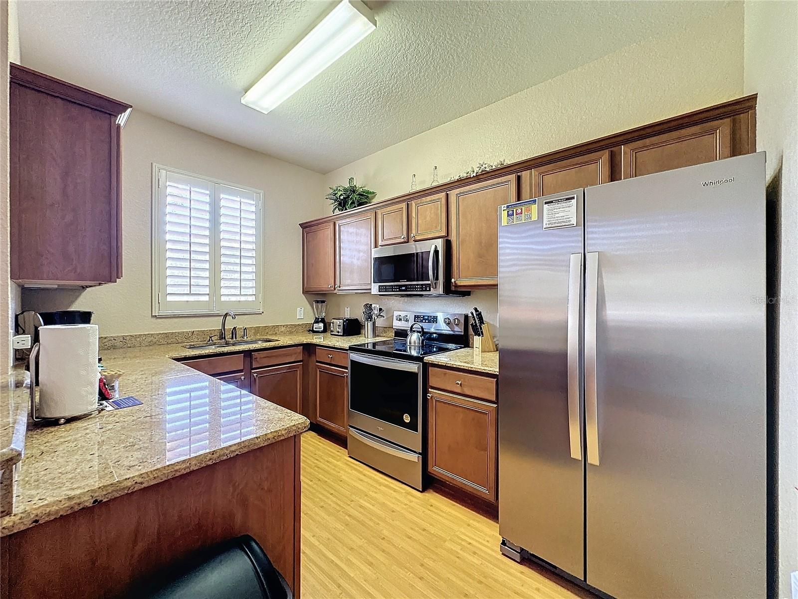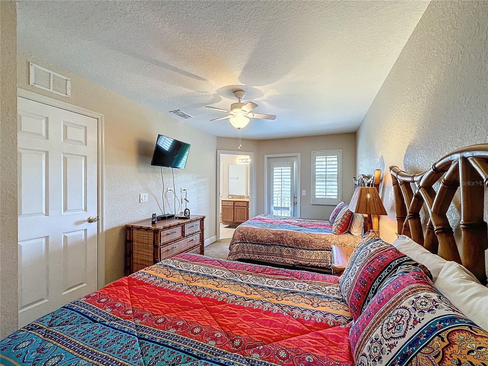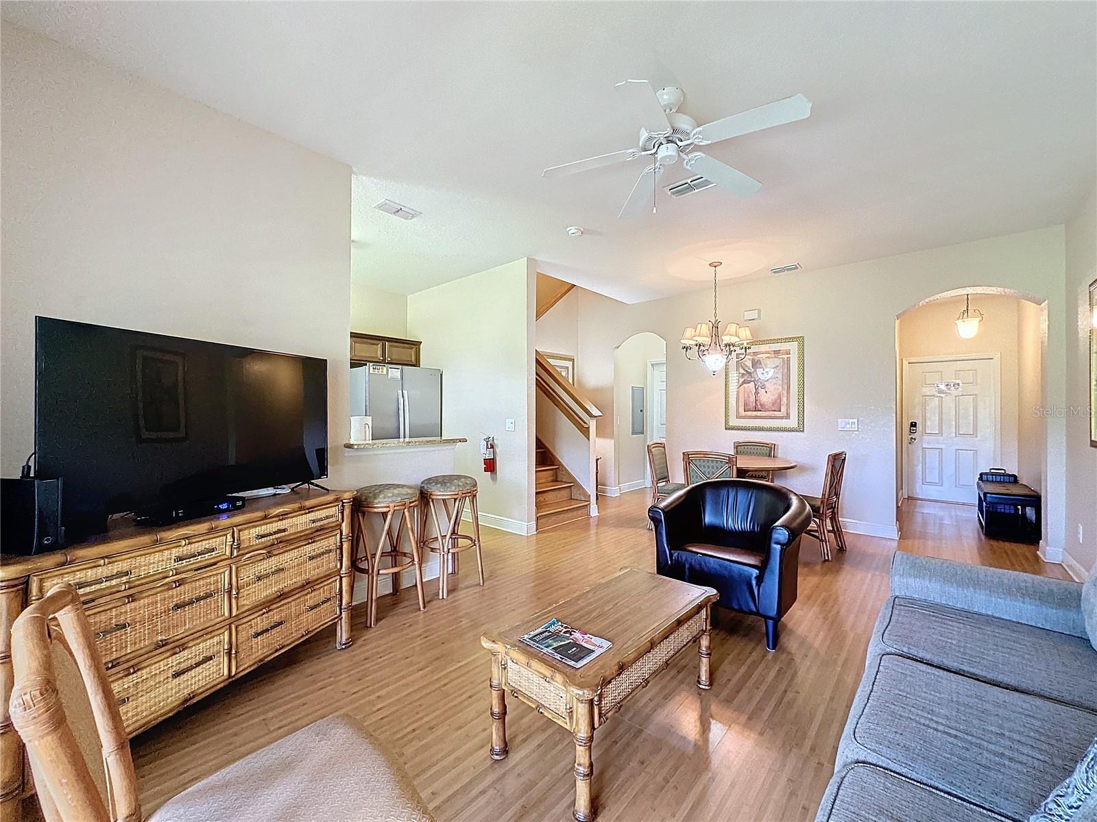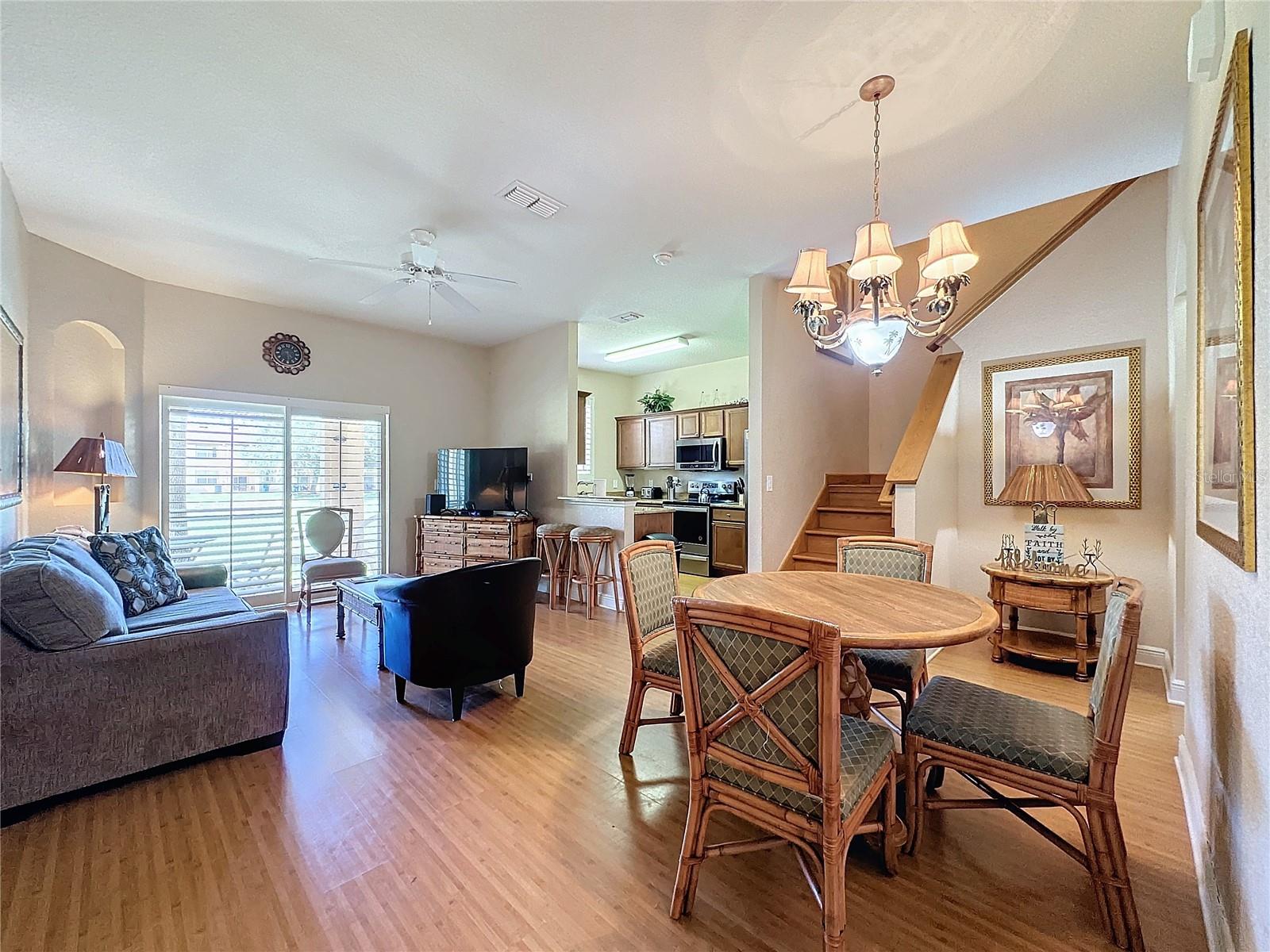 Beautiful 2 story townhome with 3 bedrooms, 2 that have ensuite bathrooms, there is an additional full bathroom upstairs. Sold FULLY FURNISHED The downstairs primary bedroom has a private entrance which can be used as a lockout / office. Kitchen has granite counters, stainless appliances, everything required to prepare meals. The HOA fee includes a 24/7 security guarded gate, internet, basic cable, exterior maintenance (including roof), trash service, pest control and exterior insurance. Regal Palms has amazing amenities that include resort-style pools, a lazy river, water slide, jacuzzi, poolside tiki bar, an arcade, restaurant and ice cream shop. The amenities also include a fully equipped fitness center, sauna, volleyball court and playground.