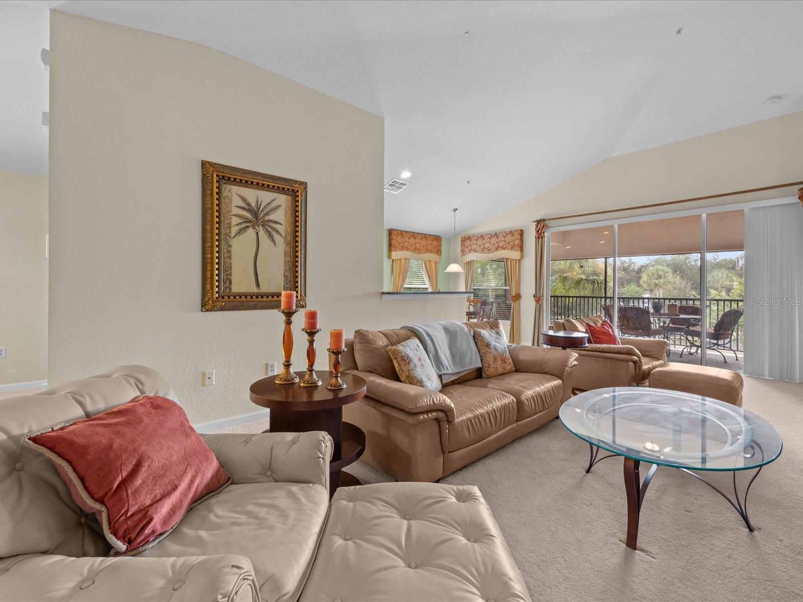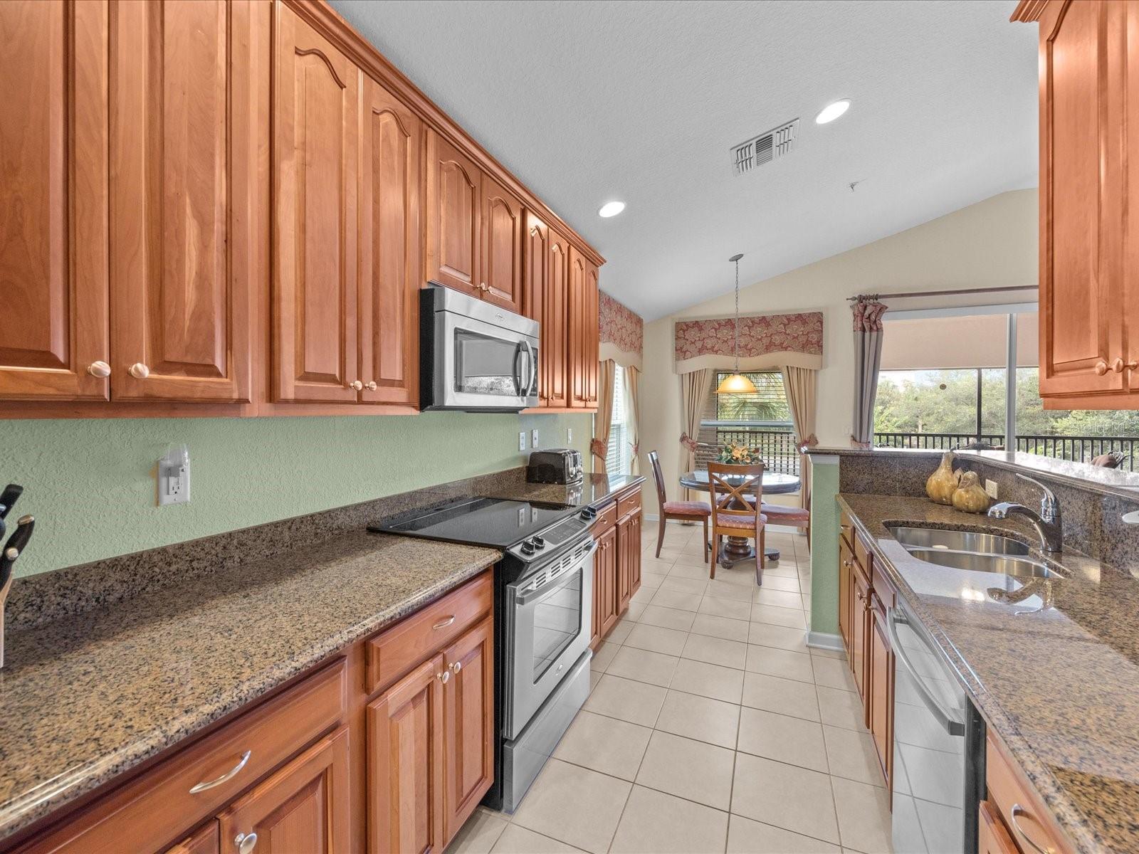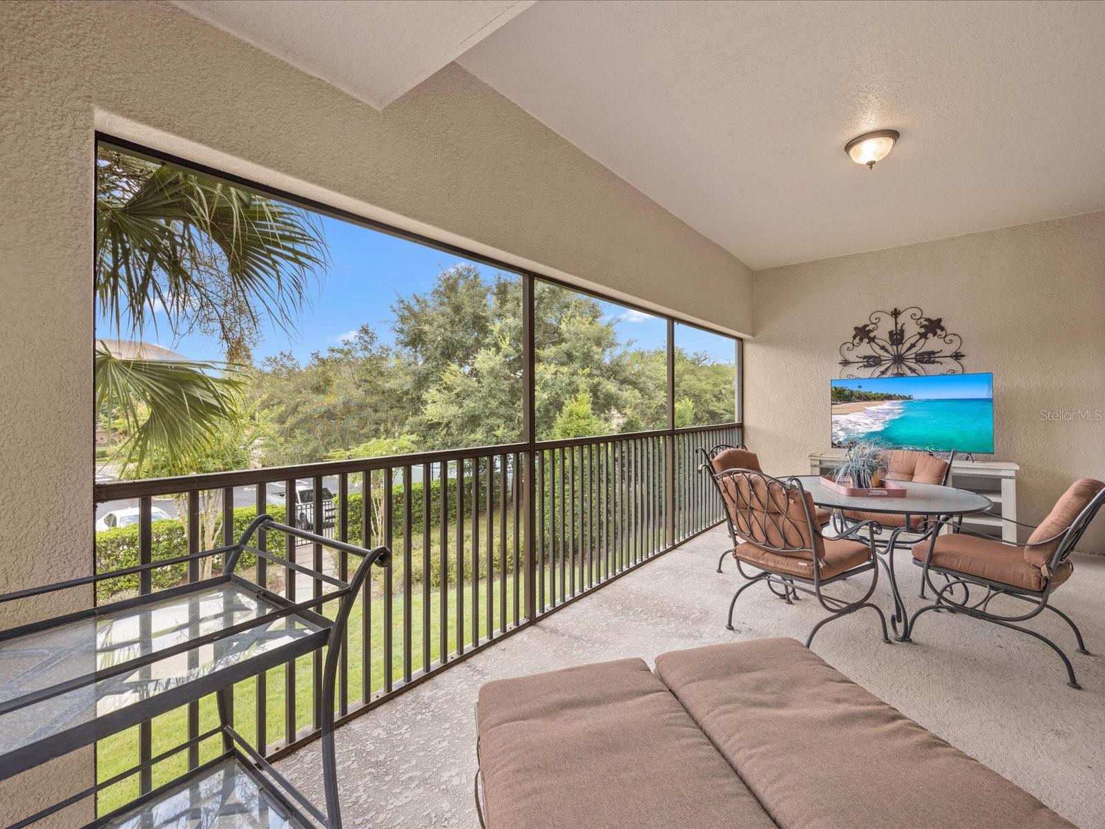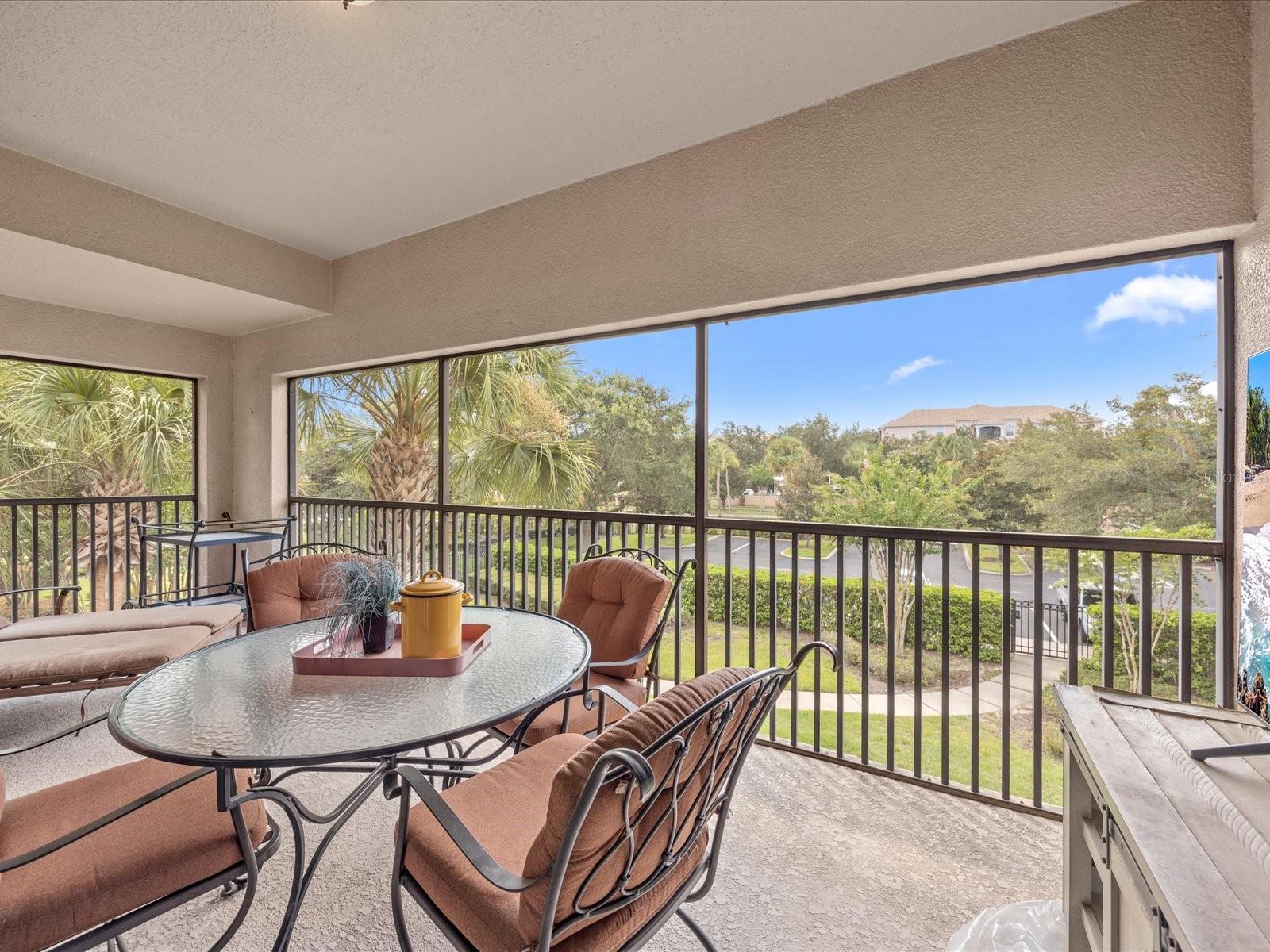 Welcome to Bella Trae, a gated community where this fully furnished 2-bedroom, 2-bathroom condo awaits. This upper-end unit impresses with its vaulted ceilings, adding a spacious and elegant feel. The galley kitchen is equipped with granite countertops, stainless steel appliances, and a charming dining nook. The primary suite offers a walk-in closet, dual sinks, and a walk-in shower, creating a private sanctuary. Ceiling fans are installed in all bedrooms and the versatile bonus room, which can be used as an office or even a third bedroom. The oversized screened-in lanai overlooks the tennis courts, providing a peaceful outdoor space. The unit also includes an attached one-car garage with a driveway. Residents of Bella Trae enjoy an array of amenities, including a clubhouse with a fitness center, pool, billiards room, spa, putting green, tennis courts, and more. HOA dues conveniently cover cable, internet, lawn care, and pest control. With its prime location near a variety of restaurants, shops, and major highways, this condo offers the ideal blend of luxury and convenience!