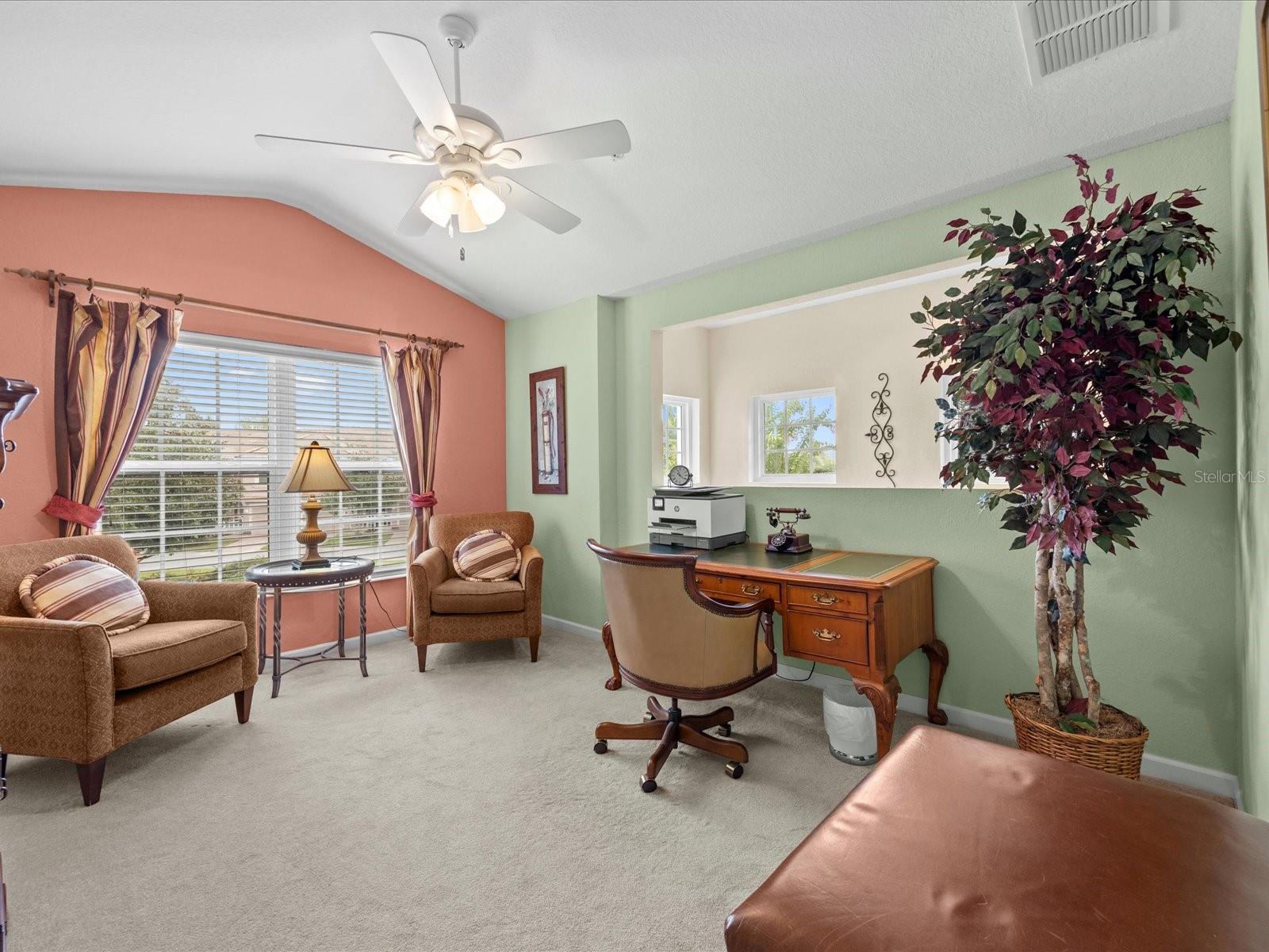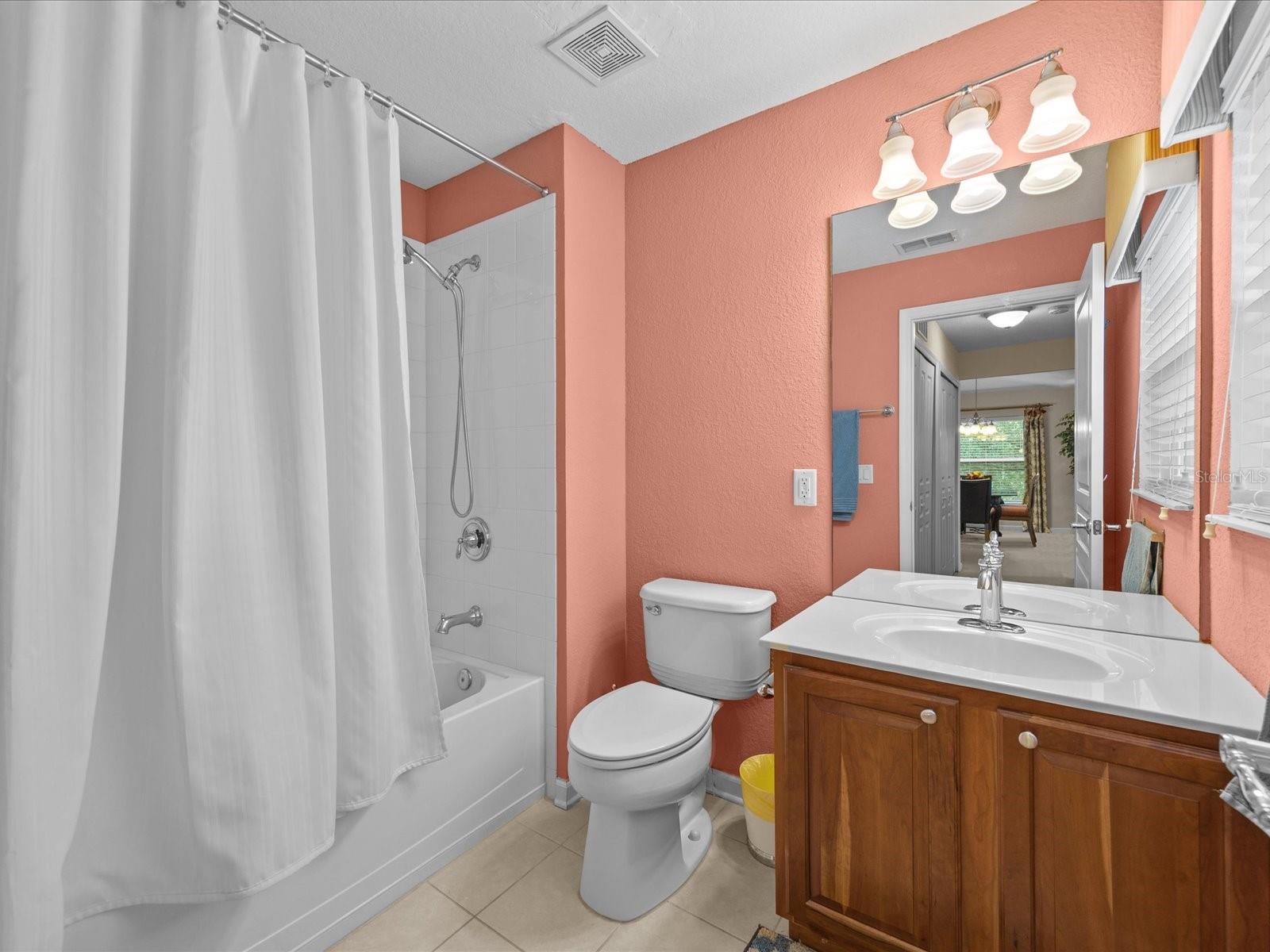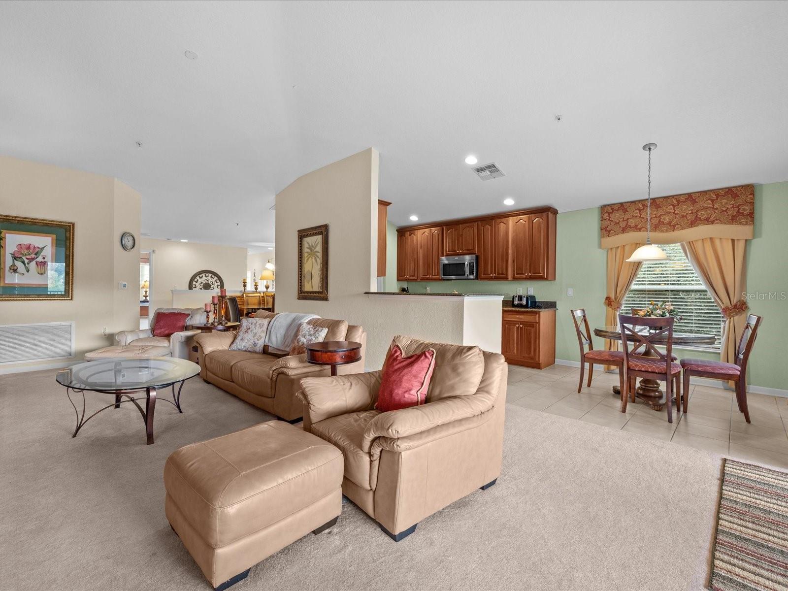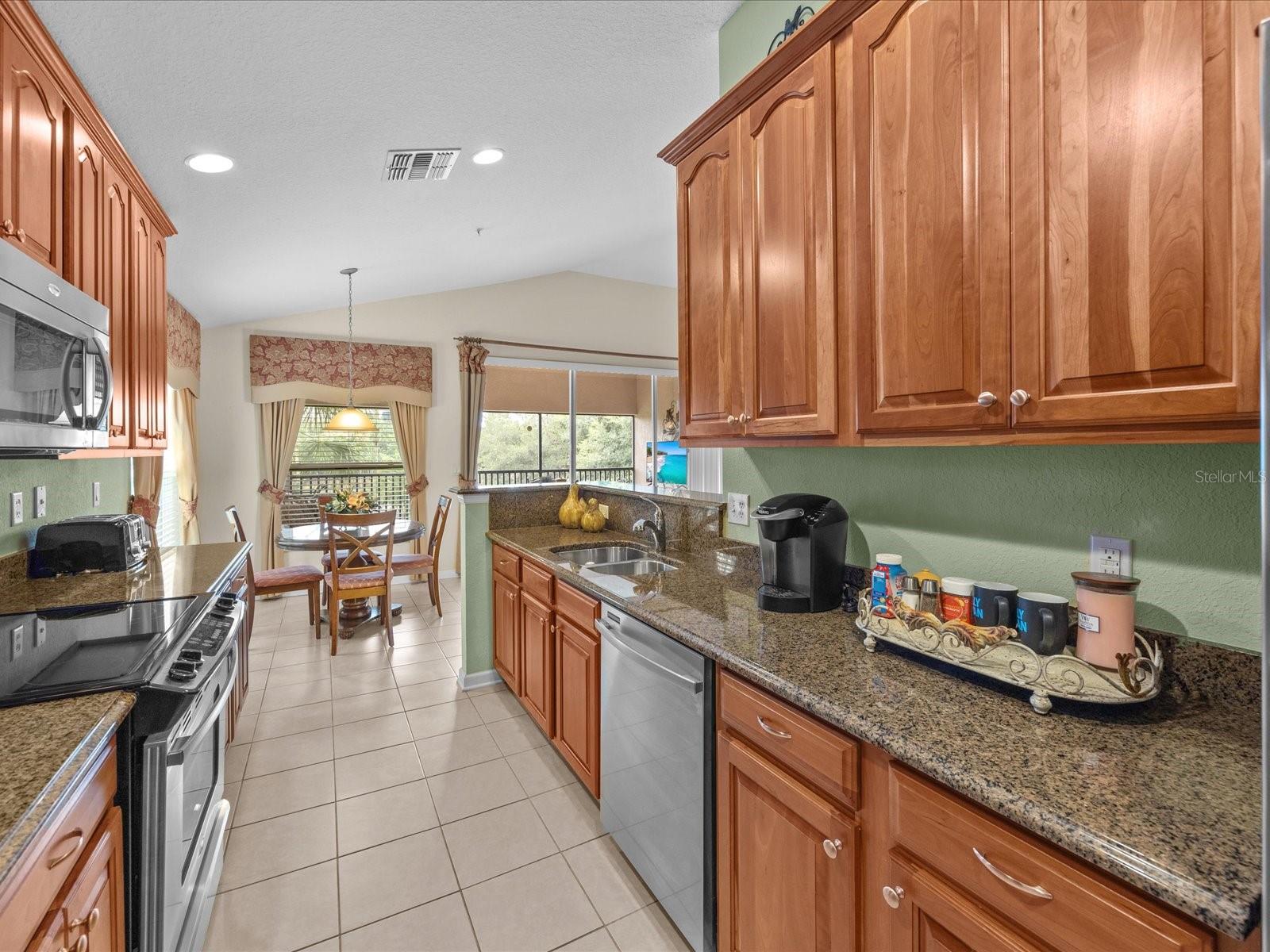 Welcome to Bella Trae, a gated community where this fully furnished 2-bedroom, 2-bathroom condo awaits. This upper-end unit impresses with its vaulted ceilings, adding a spacious and elegant feel. The galley kitchen is equipped with granite countertops, stainless steel appliances, and a charming dining nook. The primary suite offers a walk-in closet, dual sinks, and a walk-in shower, creating a private sanctuary. Ceiling fans are installed in all bedrooms and the versatile bonus room, which can be used as an office or even a third bedroom. The oversized screened-in lanai overlooks the tennis courts, providing a peaceful outdoor space. The unit also includes an attached one-car garage with a driveway. Residents of Bella Trae enjoy an array of amenities, including a clubhouse with a fitness center, pool, billiards room, spa, putting green, tennis courts, and more. HOA dues conveniently cover cable, internet, lawn care, and pest control. With its prime location near a variety of restaurants, shops, and major highways, this condo offers the ideal blend of luxury and convenience!