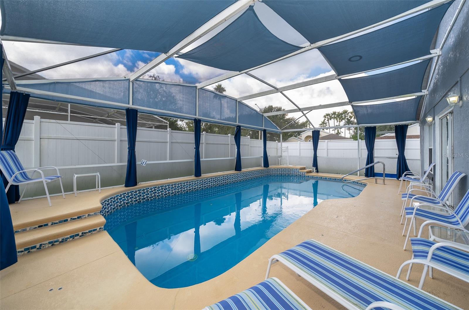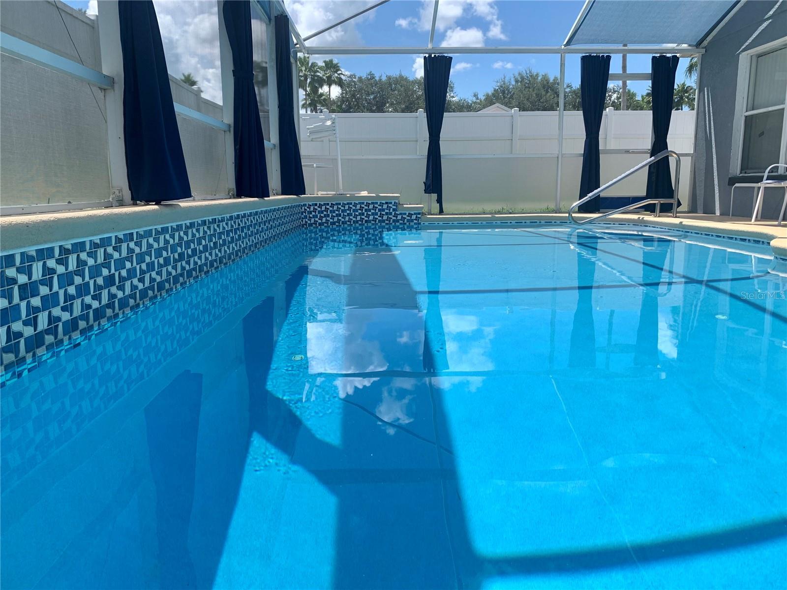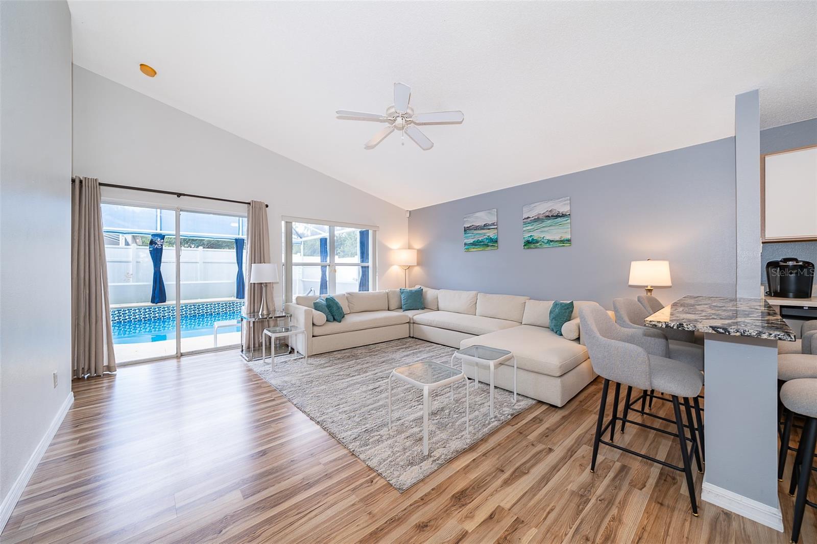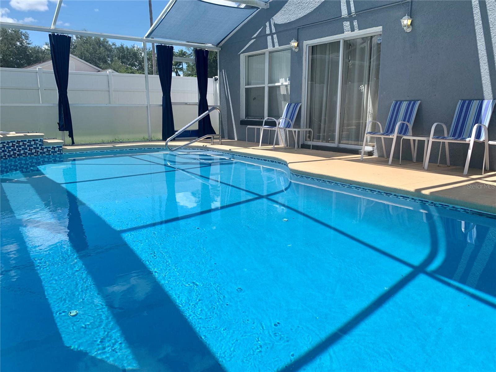Attention to detail and pride of ownership is evident in this Fully Furnished 4/2.5 Vacation Home with a private pool. Owner purchased in 2023 for $398,500 and thereafter upgraded the home extensively. Family emergency has necessitated the sale of the home and owner is taking a loss at list price. Owner Upgrades and improvements include: Alarm system, new HVAC system with sterilizing light, new shower heads and fixtures, Pool converted from chlorine into a salt system. They put in a new pool heater and pump. They added privacy curtains around the pool, exterior and interior paint, put fence gates on both sides. There are new adjustable pressure smart firm mattresses, and new deck furniture. A new pool table was added on the garage and huge 75" brand new tv's in primary bedroom as well as one in the living room. The dining room furniture, couches, granite counter in kitchen are all new as well as new lights in the entry, a fan & light in garage. A barn door in master bedroom gives 1 1/2 bath to master suite with all new fixtures in the pool bath off of master bedroom, new door locks and pool bath fitted with grab bars and wheelchair accessible. There are , screens for pool cage, pool hand rail for easy in and out. To literally top it all off, the roof was replaced in 2022. Beautiful and easy to maintain flooring throughout, no carpet! This floor plan is a favorite due to its double living areas, formal dining area, and triple split bedroom plan. Located on a spacious corner lot, this home really does have it all. Safety is also addressed with an alarm system that can be controlled remotely and monitored with exterior cameras as well. Located just minutes from restaurants, stores, and close to the theme parks, midway to both coasts and beaches, you are right in the center of all that this area has to offer. This home is perfect for a short term rental, or live in it full time. Community has very low HOA fees, and includes lawn care! Tennis courts, playground and basketball courts are available for guests and owners. Come and see all this absolutely beautiful home has to offer today!