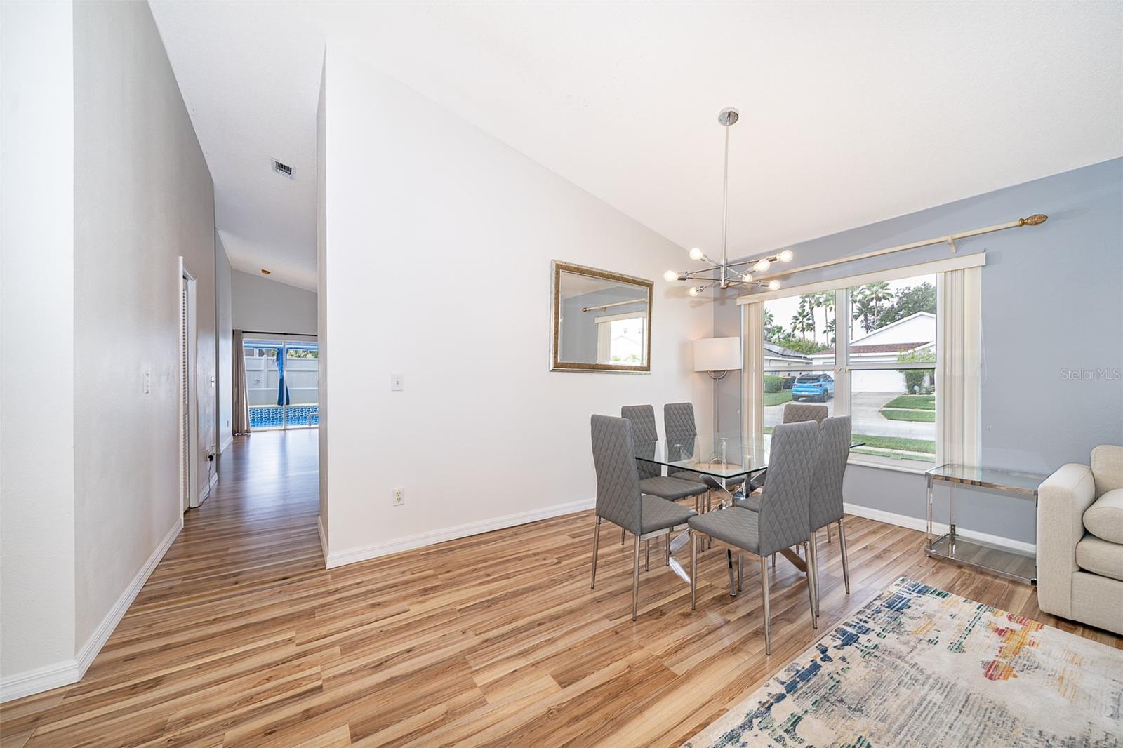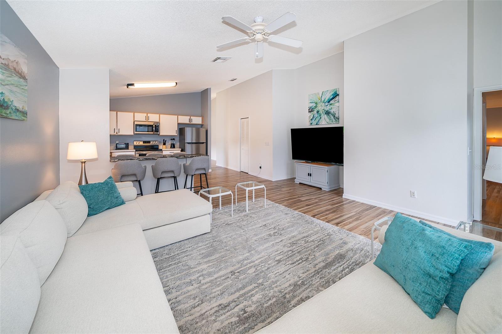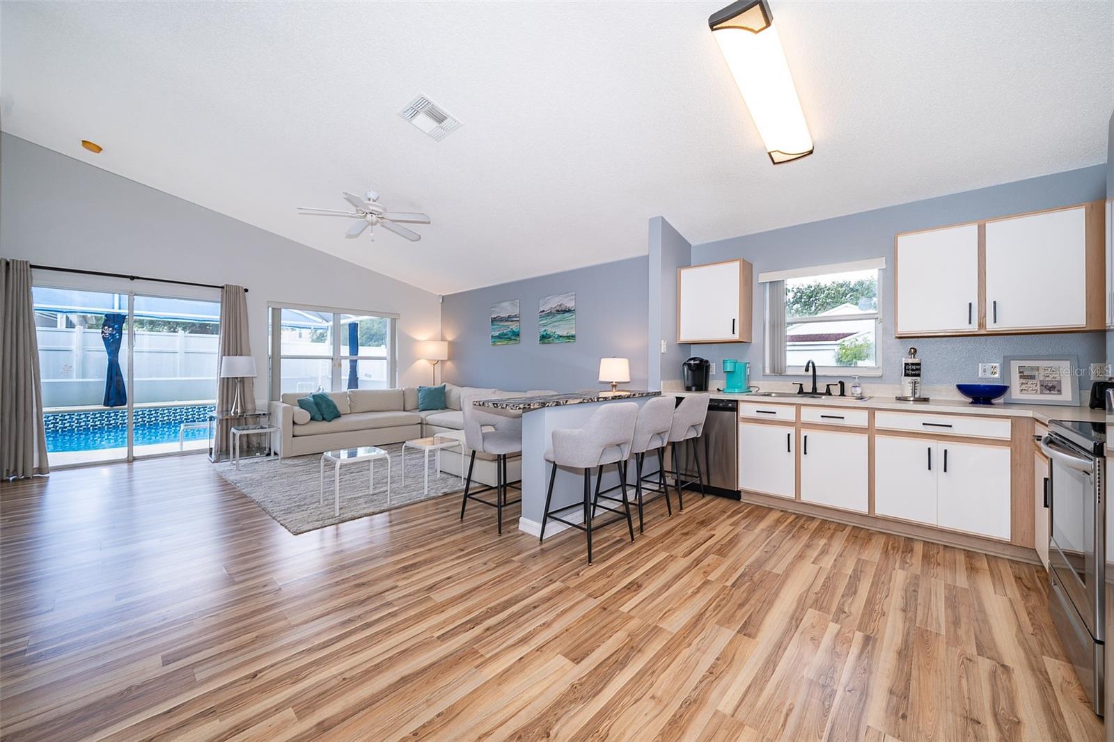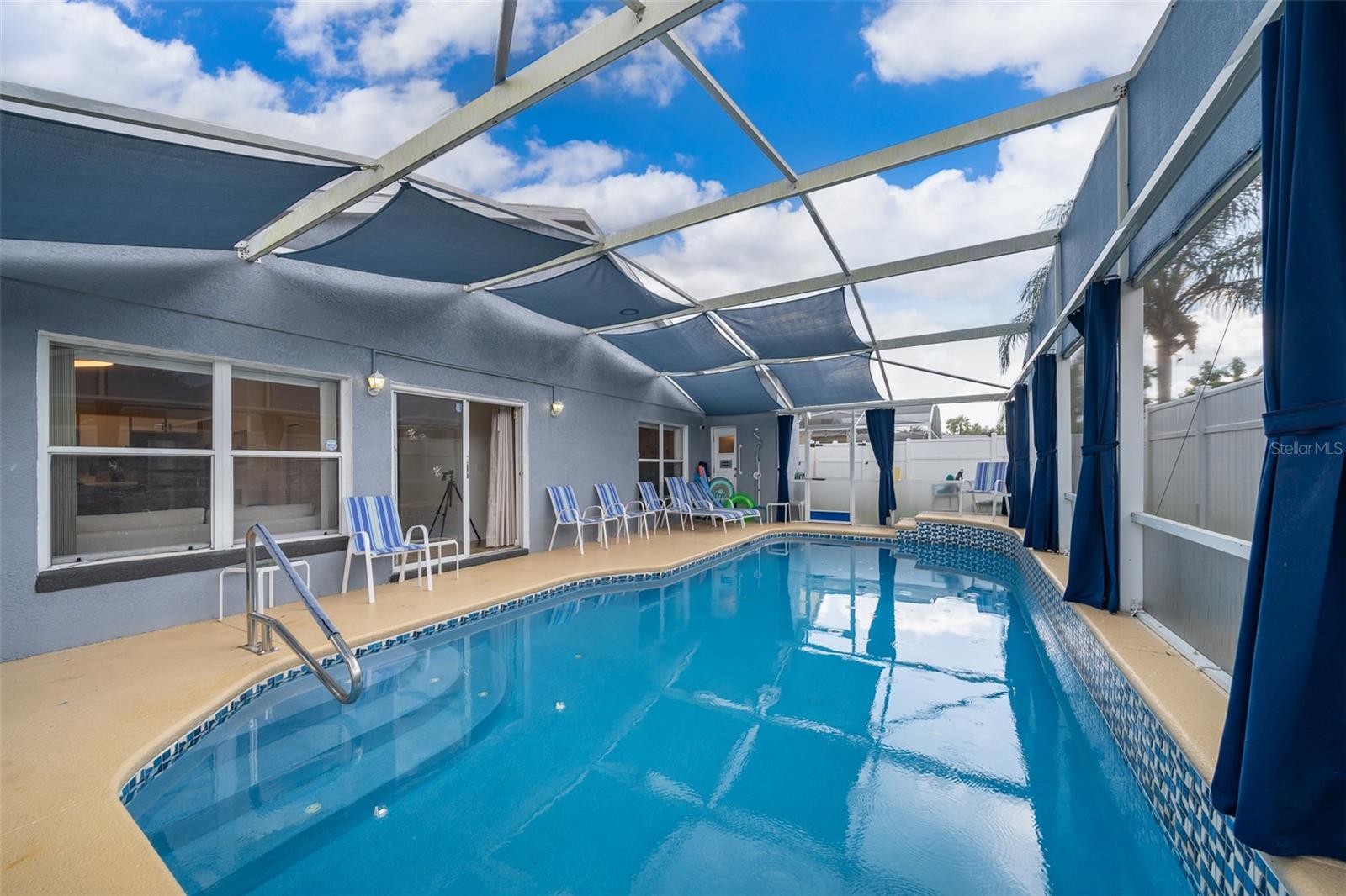 Attention to detail and pride of ownership is evident in this Fully Furnished 4/2.5 Vacation Home with a private pool. Owner purchased in 2023 for $398,500 and thereafter upgraded the home extensively. Family emergency has necessitated the sale of the home and owner is taking a loss at list price. Owner Upgrades and improvements include: Alarm system, new HVAC system with sterilizing light, new shower heads and fixtures, Pool converted from chlorine into a salt system. They put in a new pool heater and pump. They added privacy curtains around the pool, exterior and interior paint, put fence gates on both sides. There are new adjustable pressure smart firm mattresses, and new deck furniture. A new pool table was added on the garage and huge 75" brand new tv's in primary bedroom as well as one in the living room. The dining room furniture, couches, granite counter in kitchen are all new as well as new lights in the entry, a fan & light in garage. A barn door in master bedroom gives 1 1/2 bath to master suite with all new fixtures in the pool bath off of master bedroom, new door locks and pool bath fitted with grab bars and wheelchair accessible. There are , screens for pool cage, pool hand rail for easy in and out. To literally top it all off, the roof was replaced in 2022. Beautiful and easy to maintain flooring throughout, no carpet! This floor plan is a favorite due to its double living areas, formal dining area, and triple split bedroom plan. Located on a spacious corner lot, this home really does have it all. Safety is also addressed with an alarm system that can be controlled remotely and monitored with exterior cameras as well. Located just minutes from restaurants, stores, and close to the theme parks, midway to both coasts and beaches, you are right in the center of all that this area has to offer. This home is perfect for a short term rental, or live in it full time. Community has very low HOA fees, and includes lawn care! Tennis courts, playground and basketball courts are available for guests and owners. Come and see all this absolutely beautiful home has to offer today!