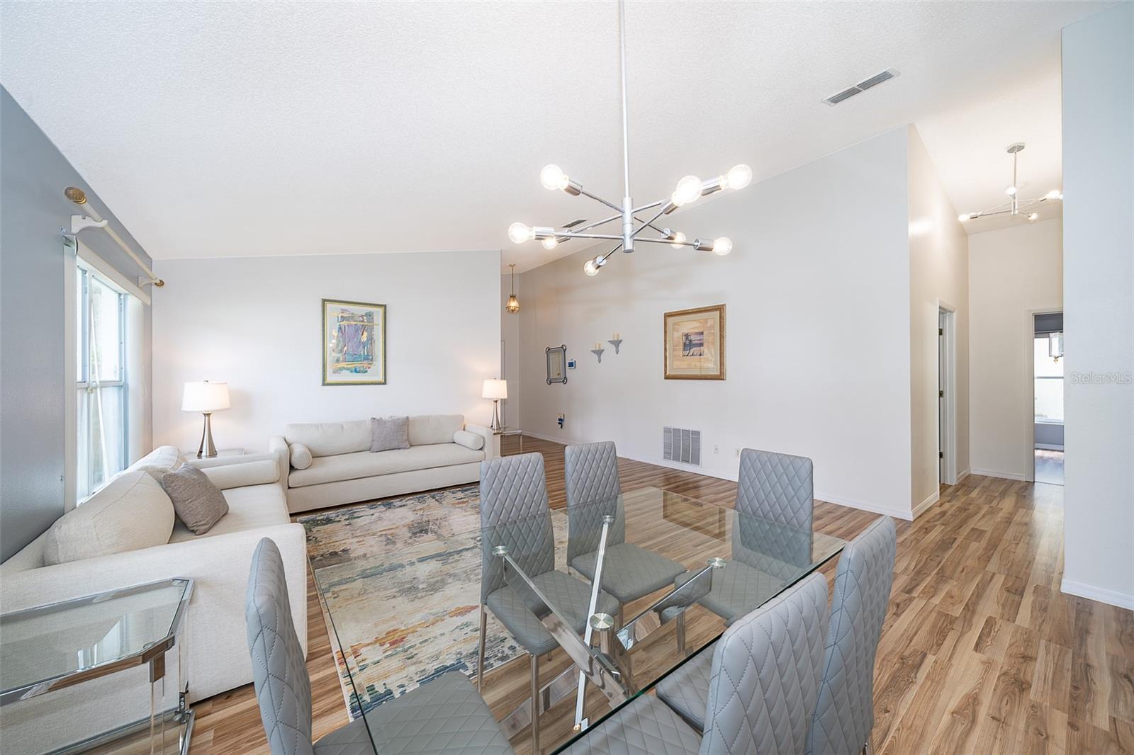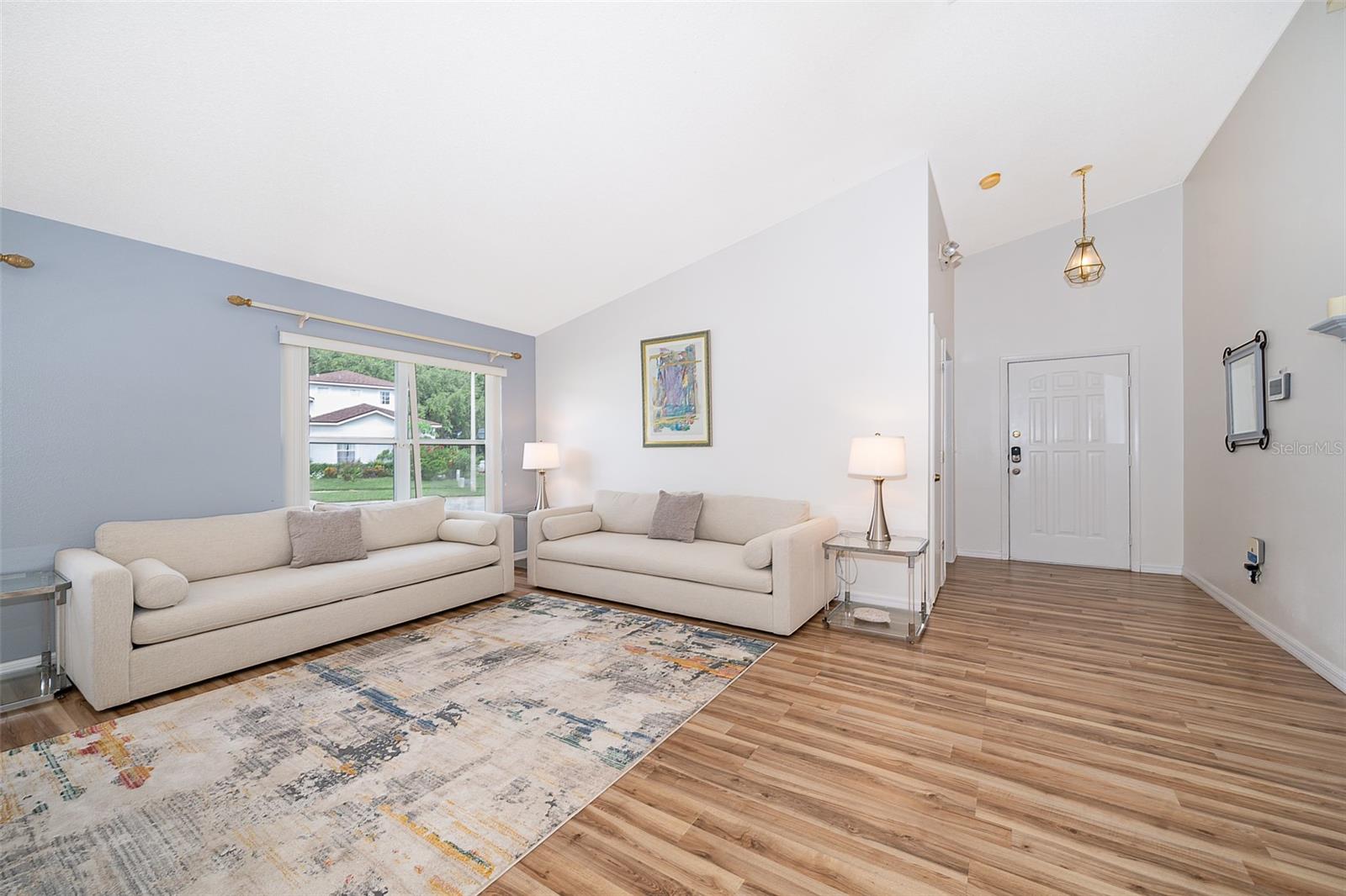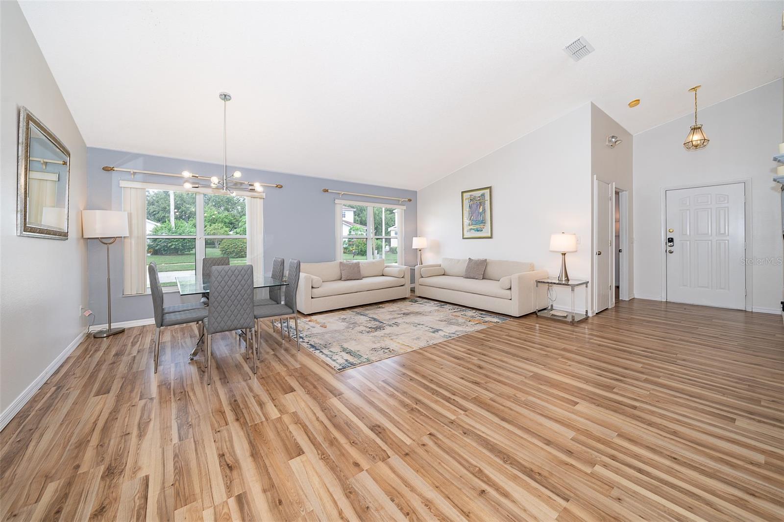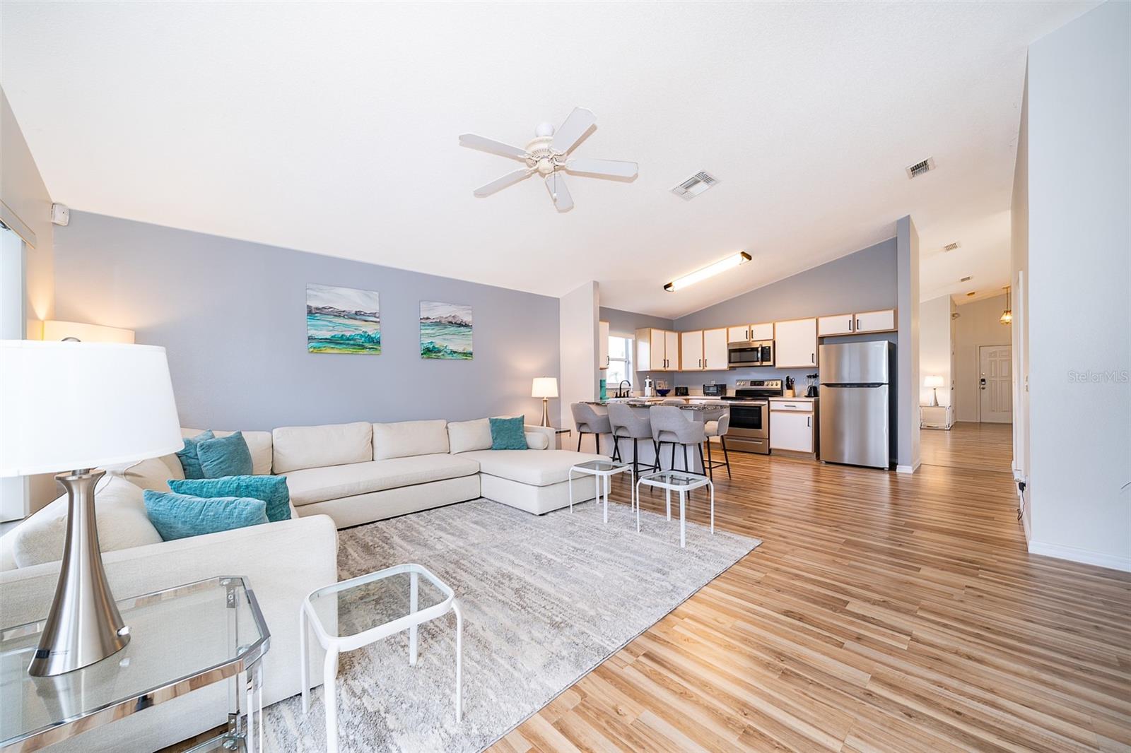 Attention to detail and pride of ownership is evident in this Fully Furnished 4/2.5 Vacation Home with a private pool. Owner purchased in 2023 for $398,500 and thereafter upgraded the home extensively. Family emergency has necessitated the sale of the home and owner is taking a loss at list price. Owner Upgrades and improvements include: Alarm system, new HVAC system with sterilizing light, new shower heads and fixtures, Pool converted from chlorine into a salt system. They put in a new pool heater and pump. They added privacy curtains around the pool, exterior and interior paint, put fence gates on both sides. There are new adjustable pressure smart firm mattresses, and new deck furniture. A new pool table was added on the garage and huge 75" brand new tv's in primary bedroom as well as one in the living room. The dining room furniture, couches, granite counter in kitchen are all new as well as new lights in the entry, a fan & light in garage. A barn door in master bedroom gives 1 1/2 bath to master suite with all new fixtures in the pool bath off of master bedroom, new door locks and pool bath fitted with grab bars and wheelchair accessible. There are , screens for pool cage, pool hand rail for easy in and out. To literally top it all off, the roof was replaced in 2022. Beautiful and easy to maintain flooring throughout, no carpet! This floor plan is a favorite due to its double living areas, formal dining area, and triple split bedroom plan. Located on a spacious corner lot, this home really does have it all. Safety is also addressed with an alarm system that can be controlled remotely and monitored with exterior cameras as well. Located just minutes from restaurants, stores, and close to the theme parks, midway to both coasts and beaches, you are right in the center of all that this area has to offer. This home is perfect for a short term rental, or live in it full time. Community has very low HOA fees, and includes lawn care! Tennis courts, playground and basketball courts are available for guests and owners. Come and see all this absolutely beautiful home has to offer today!