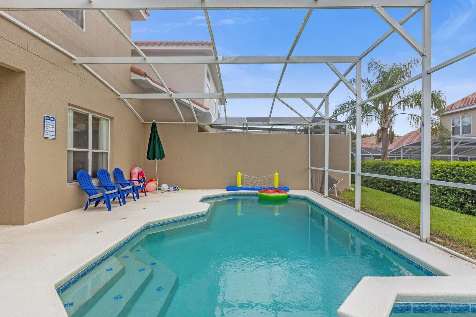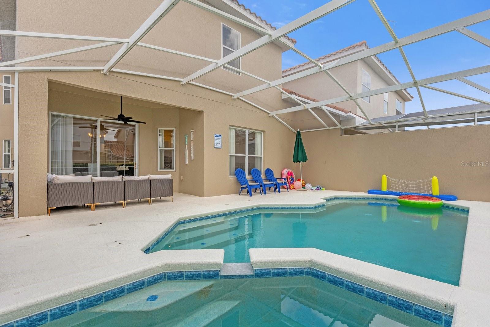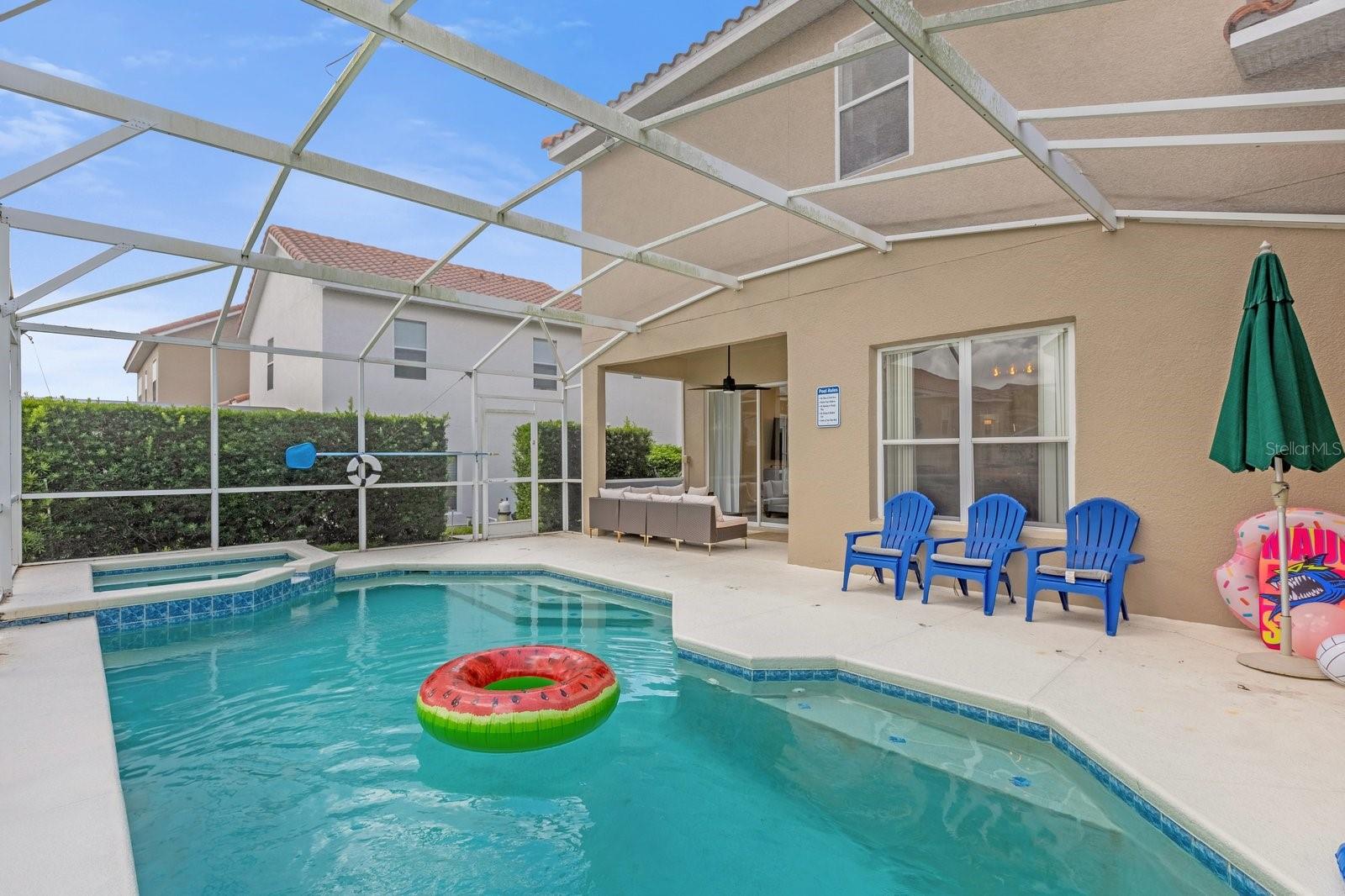 TURNKEY AIRBNB WITH PROVEN RESULTS!! Discover the perfect blend of luxury and comfort in this stunning 5-bedroom, 3.5-bathroom home, ideally located just minutes from the magic of Walt Disney World. Whether you're seeking a prime vacation rental or a spacious family retreat, this property has it all! As you step inside, you'll be welcomed by an expansive open-concept layout that seamlessly connects the living, dining, and kitchen areas, creating a warm and inviting atmosphere perfect for family gatherings or vacation relaxation. The kitchen boasts newly upgraded granite countertops, providing both style and functionality, and a gas water heater was installed in August 2022 for efficient energy use. The interior has been freshly painted, and the home features upgraded lighting and plumbing fixtures throughout, adding to its modern charm. One of the unique features of this home is the upgraded garage, which has been transformed into a fun-filled game room, perfect for family entertainment. The property includes not one but two primary suites—one on the main floor and another upstairs—offering flexibility and privacy for both homeowners and guests. The downstairs half-bath is perfect for visitors, while the en-suite in the main-level primary suite boasts a large shower, ideal for a spa-like experience. Each of the generously sized bedrooms offers ample space, making this home suitable for a family or as a prime rental property for guests. Step outside to your private pool and heated spa, a personal oasis where you can unwind after a day at the theme parks or work. To top it all off, the owner is offering a HOME WARRANTY! ensuring peace of mind for your investment. Schedule a tour today to experience the best of Florida living, just moments away from world-class attractions!