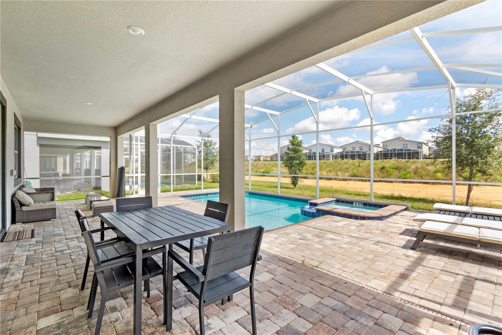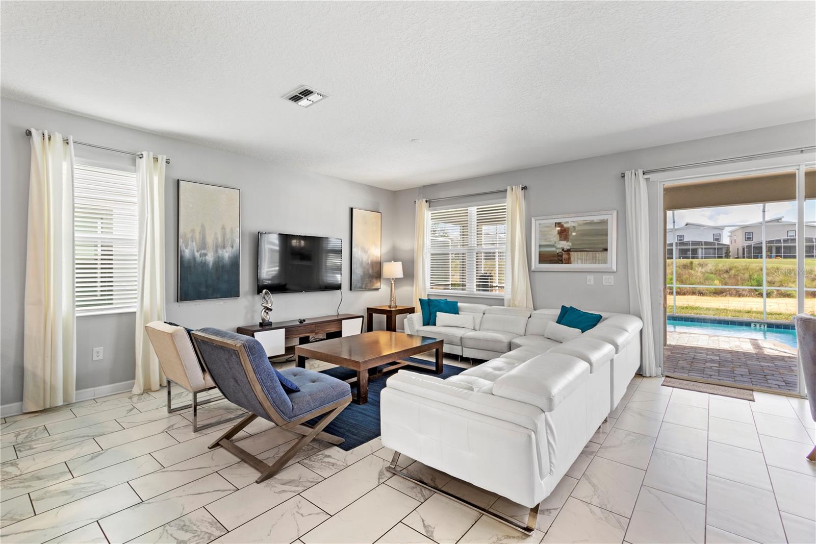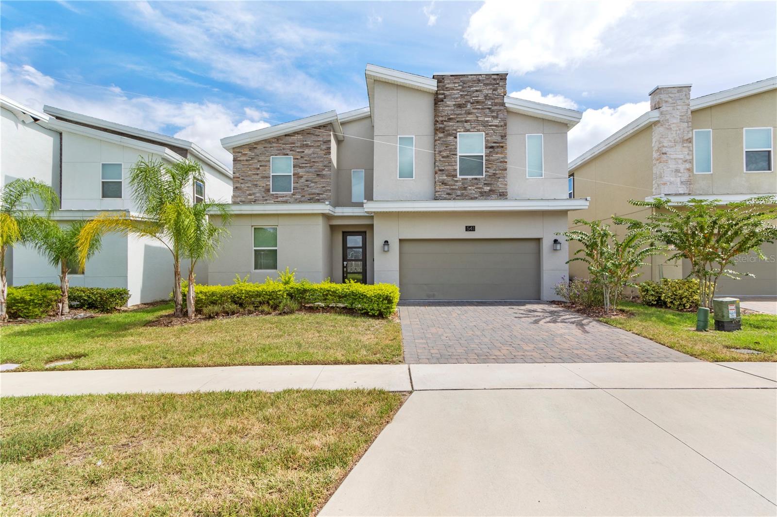 Discover this stunning two-story single-family home, offering an impressive 8 bedrooms and 5 bathrooms. The open-concept living and dining area is perfect for entertaining, seamlessly flowing into the outdoor space. Step outside to a large, covered patio that overlooks a private pool and spa, ideal for relaxing and enjoying the views of the lush golf community. This spacious home features two luxurious master suites, providing ample comfort and privacy. The well-maintained property is equipped with modern amenities, including stainless steel appliances, a state-of-the-art security system, and stylish faux-wood blinds. As part of the vibrant Champions Gate Resort, residents can indulge in resort-style pools, spas, tennis and basketball courts, a fitness center, and on-site concierge services. The Oasis Clubhouse offers a wealth of amenities, including a lazy river, water slides, swim-up bar, waterfalls, beach entry pool, splash pad, grill, bar, fitness center, theater, game room, tiki bar, and private cabanas. This exceptional home comes fully furnished with professionally curated furniture, housewares, decor, bedding, and more, making it a turnkey solution for luxury living. An incredible opportunity awaits!