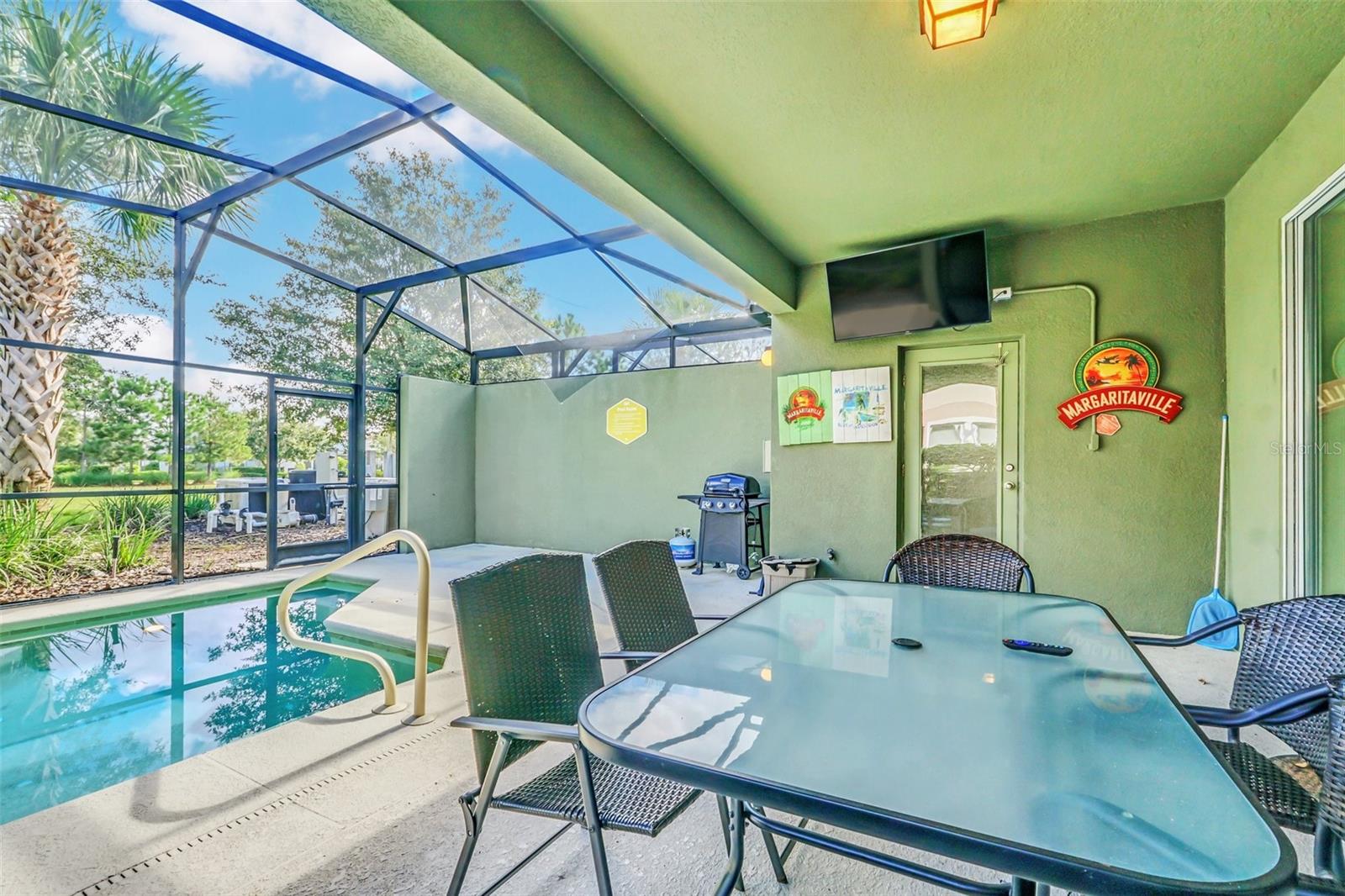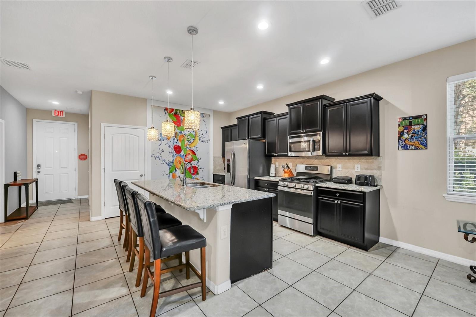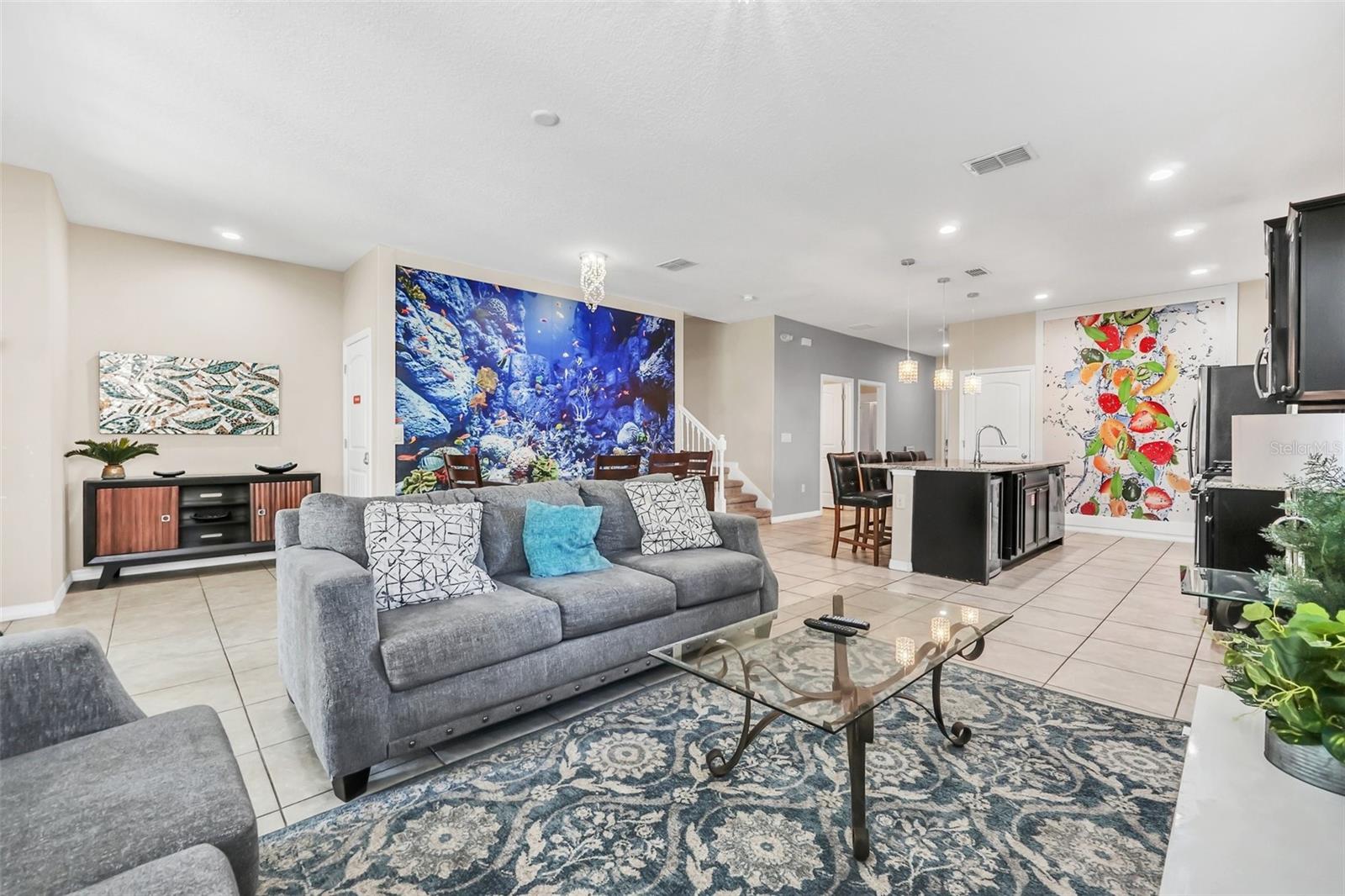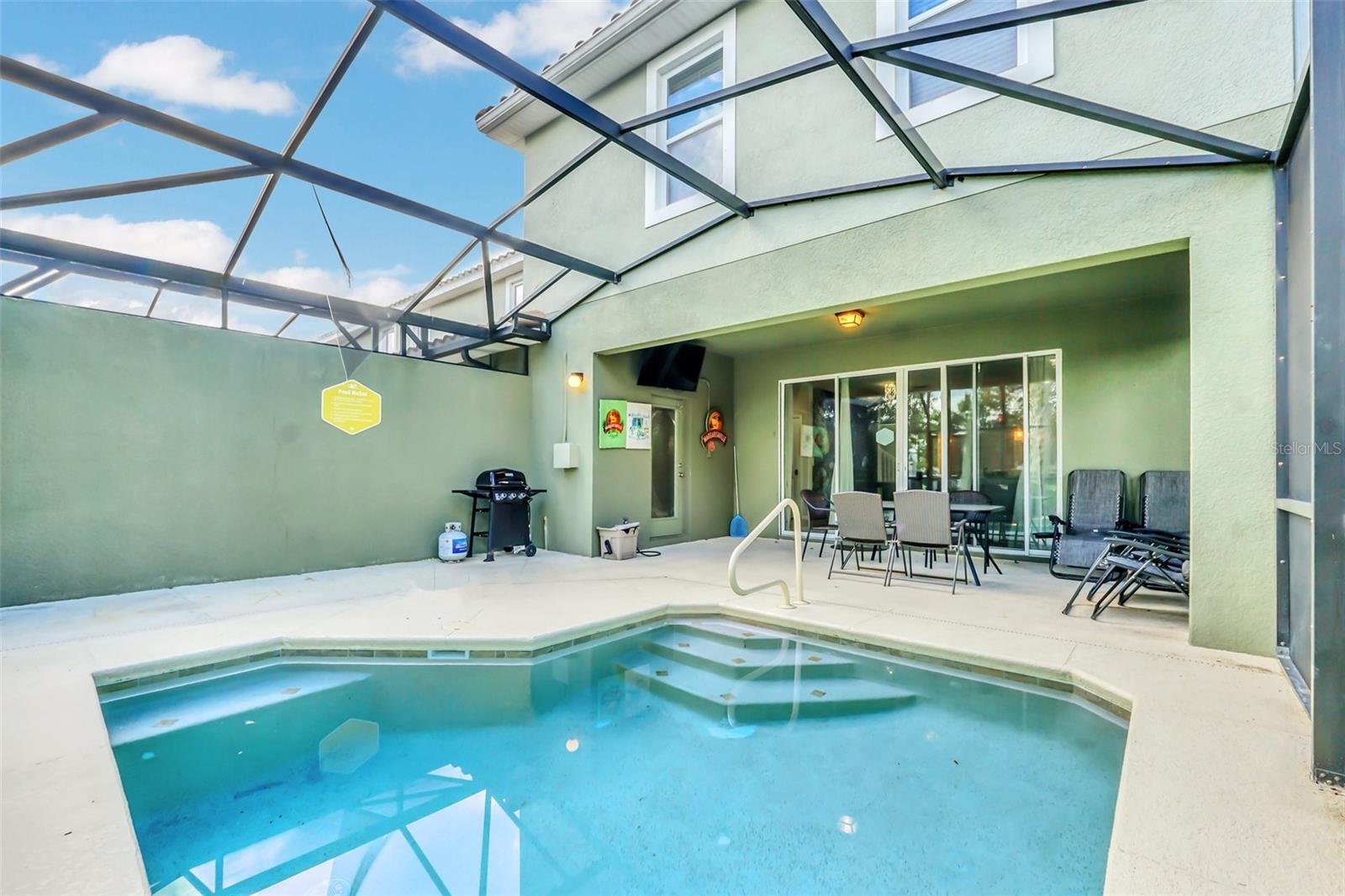 Welcome to your ultimate getaway, where luxury and relaxation await at every corner! This stunning end-unit 5-bedroom townhome in the exclusive Solterra Resort offers a dream retreat within minutes of Disney World, perfect for vacationers and investors alike. Step inside and let the professionally designed interiors transport you to a world of elegance and comfort. Each room is thoughtfully themed, adding a touch of fun and uniqueness that will delight both family and guests. The open-concept living areas feature beautiful 18x18 ceramic tile, making the space feel sleek and modern while remaining easy to maintain. The gourmet kitchen is a chef's paradise, complete with granite countertops, GE stainless steel appliances, and ample space to create delicious meals, whether it's a quick breakfast or an elaborate dinner party. Venture outside to your private screened courtyard, where a heated splash pool invites you to unwind. Imagine spending your mornings soaking up the Florida sun or enjoying a tranquil evening swim under the stars in your secluded oasis. Solterra Resort offers an unmatched lifestyle with world-class amenities designed for entertainment and relaxation. Enjoy the 14,000 sq ft clubhouse, featuring a tiki bar, fitness center, and resort-style pool with a waterslide and lazy river. For the more active residents, tennis courts, a playground, and a variety of social spaces ensure there’s always something to do. Perfectly situated just minutes from the magic of Disney World, this townhome also boasts easy access to premier shopping, dining, and golf courses. Whether you're seeking a personal retreat or a lucrative investment, this property allows short-term rentals, making it the perfect blend of vacation paradise and income potential. Don't miss out on owning your very own piece of resort-style living. This home isn't just a place to stay; it's where lifelong memories are made!