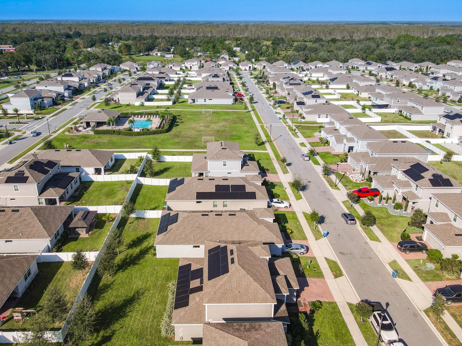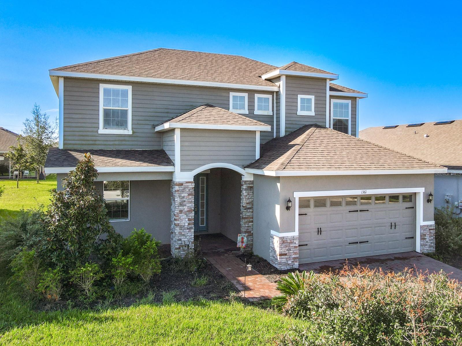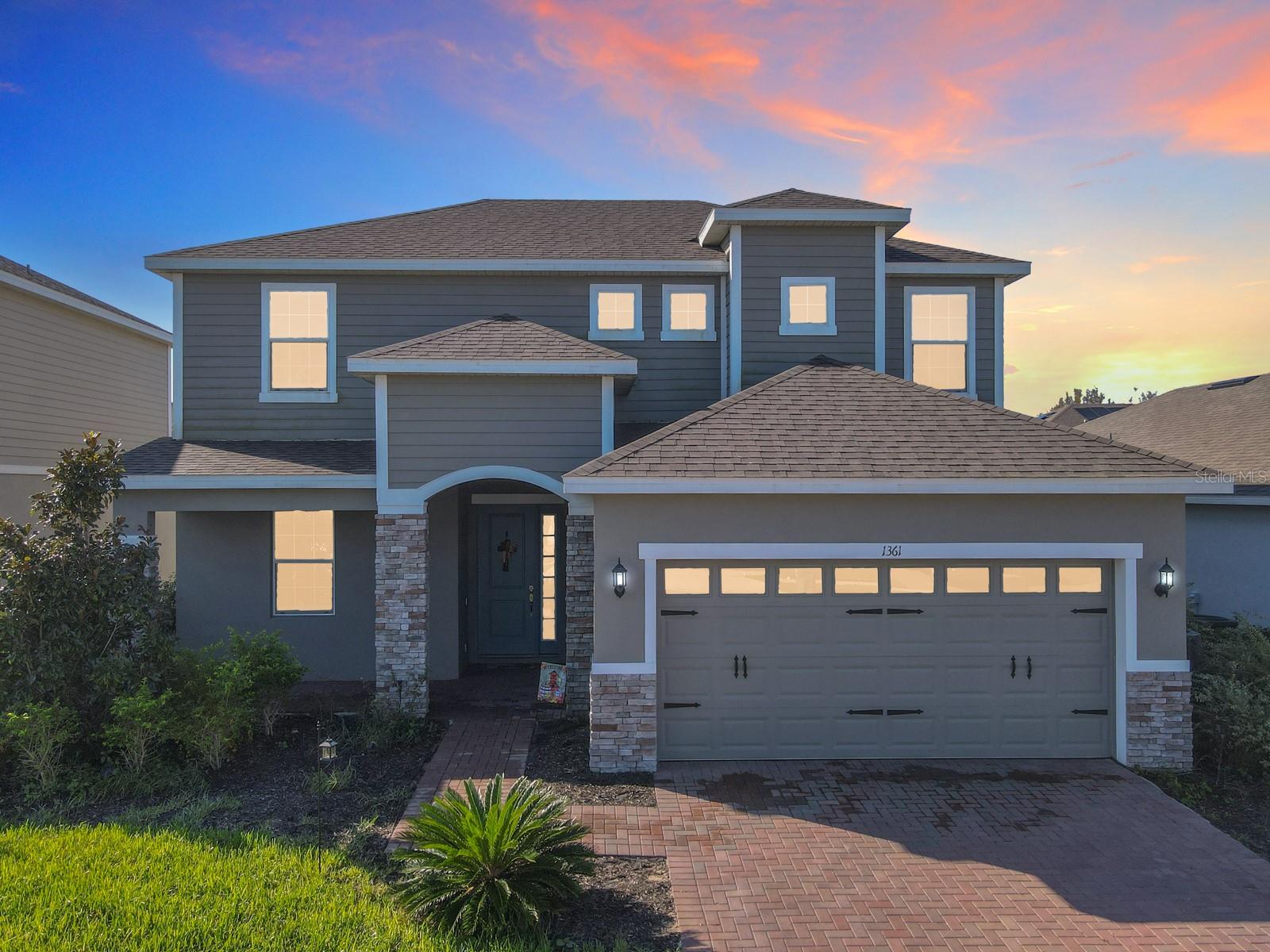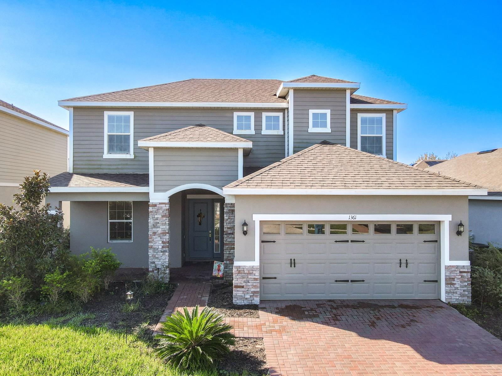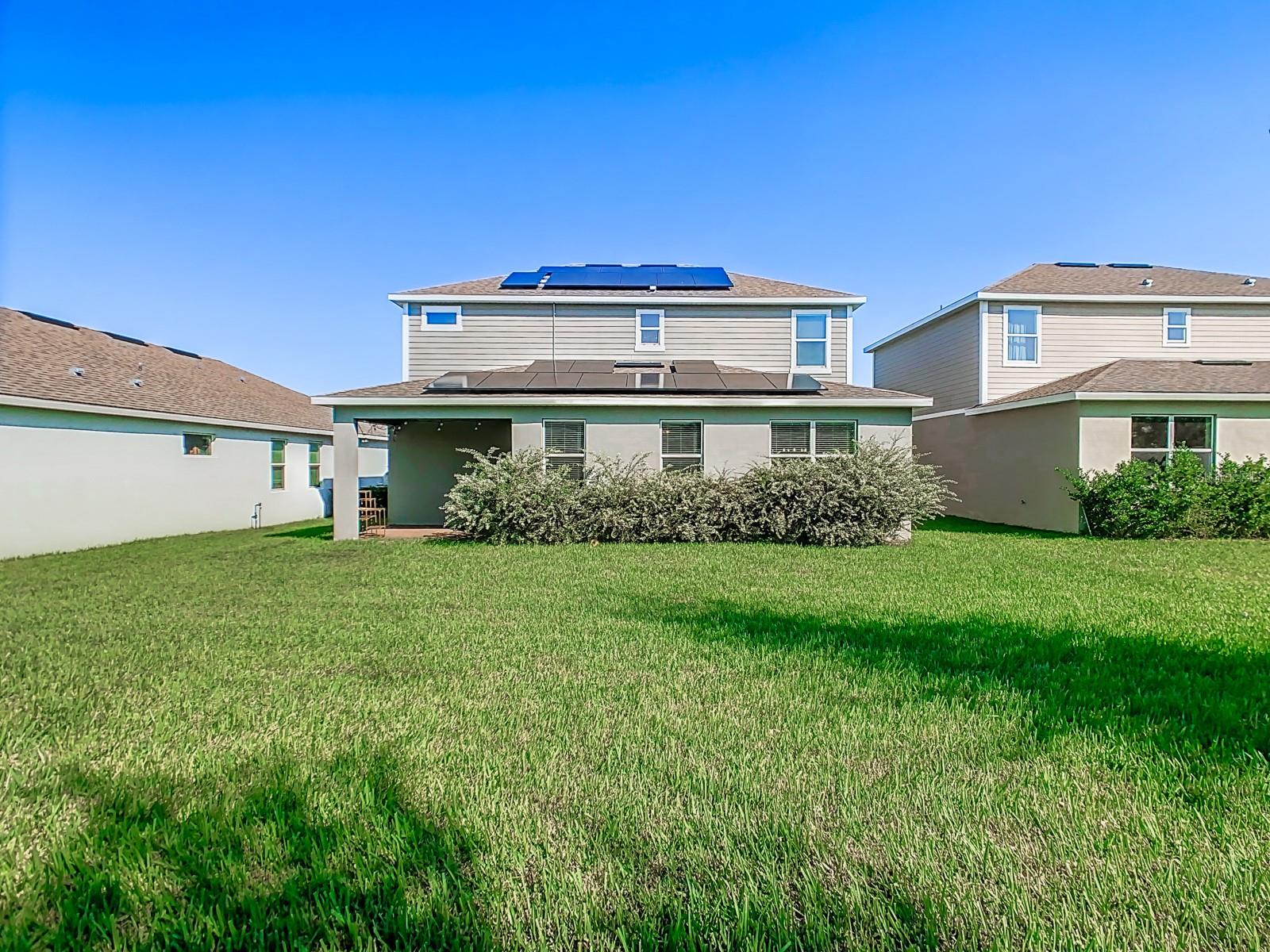 Discover this beautifully designed 4-bed, 3-bath home, built in 2021 by Park Square Homes. COMES WITH SOLAR PANEL PACKAGE providing very low energy costs averaging $25-$80 per month! Located in the vibrant community of Davenport, FL, this property combines luxury with functionality, ideal for family life. This home features 4 spacious bedrooms, 3 full bathrooms and over 2,300 sq ft of modern living space. A cozy front porch greets you before you enter the home. Some of the highlights of this like-new home are the open kitchen, complete with sleek modern appliances including a Samsung Bespoke designer refrigerator, quartz countertops, farmhouse sink, cooktop, built-in microwave & oven for easy access and ample storage. The flooring was upgraded with stylish ceramic tile throughout downstairs. Enjoy the bonus room downstairs which can be used as an office, den, workspace or craft nook. Upstairs has a versatile loft area perfect for a playroom or additional living space. The primary bedroom features a modern bathroom with a walk-in shower and built-in bench, dual sinks and a massive walk-in closet. There is a convenient laundry chute from the second floor down to the laundry room equipped with Samsung washer and dryer set. Off the living room there is a covered lanai and a spacious backyard, perfect for entertaining. The two-car garage with additional storage options offers plenty of parking. The community amenities include: a playground, soccer field, swimming pool. Enjoy these with a LOW HOA of just $207 per quarter! No CDD fee. Situated in a growing area of Davenport, this home is just 30 minutes away from Disney World, making it a perfect spot for both relaxation and fun. Close to schools, and shopping centers, you’ll have everything you need within reach. Schedule your showing today! 3D Tour: https://nodalview.com/s/2inz4Ti9z6remwJ_bbXgJ9