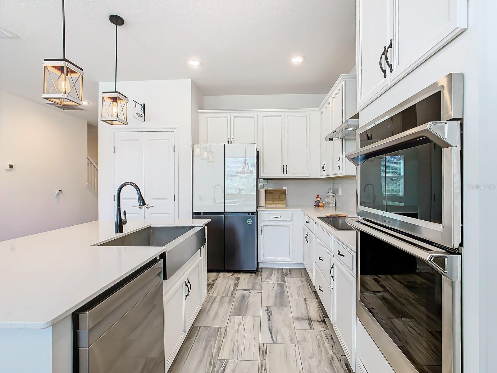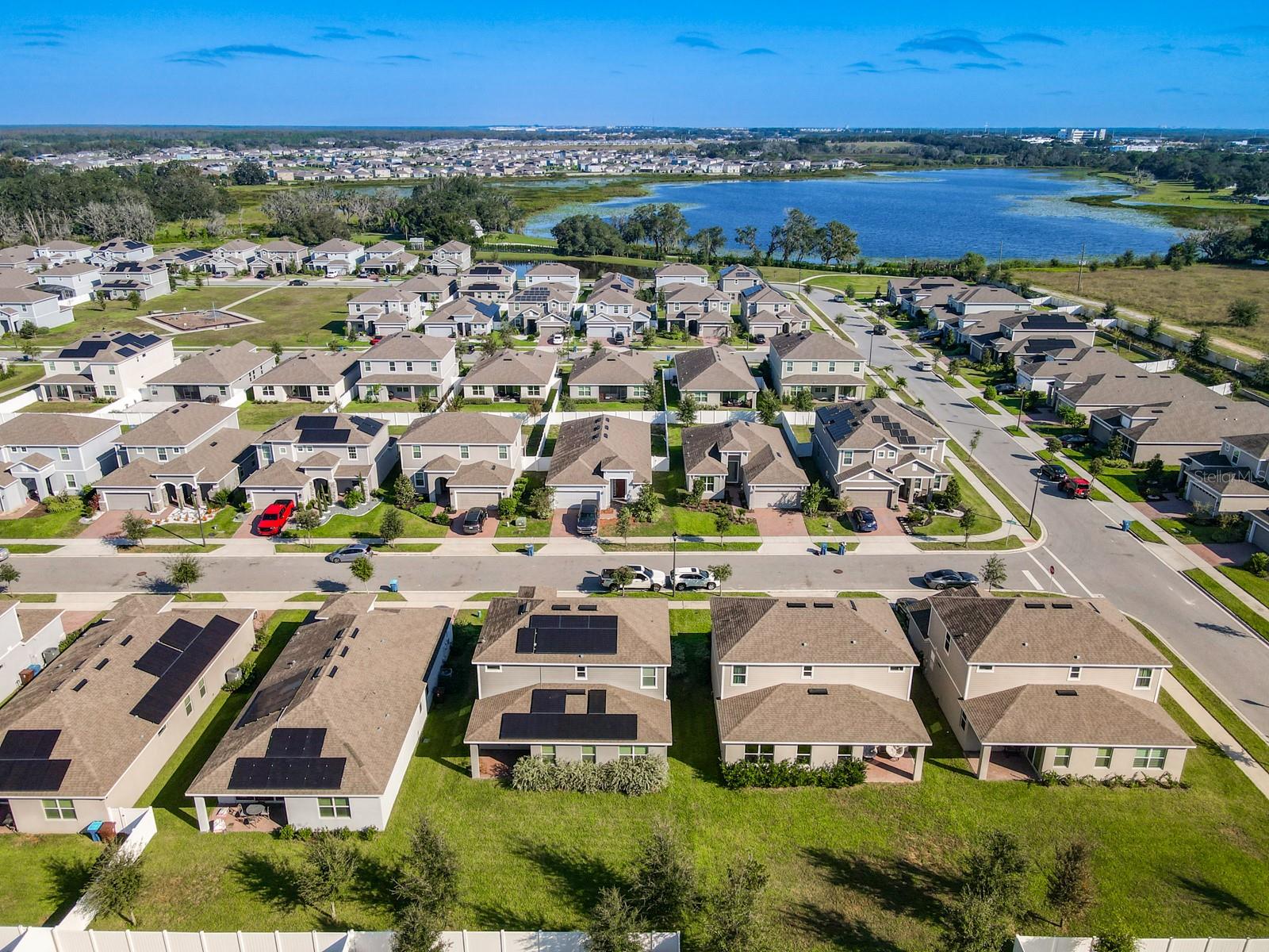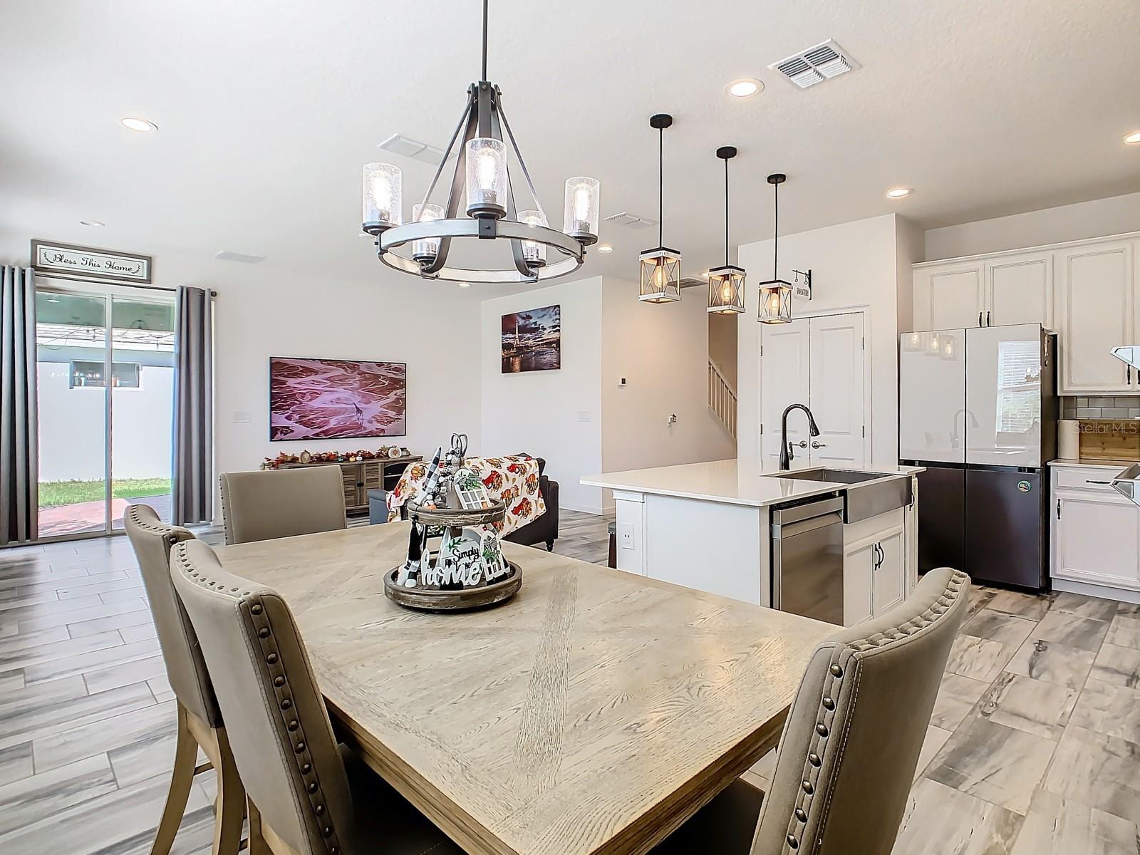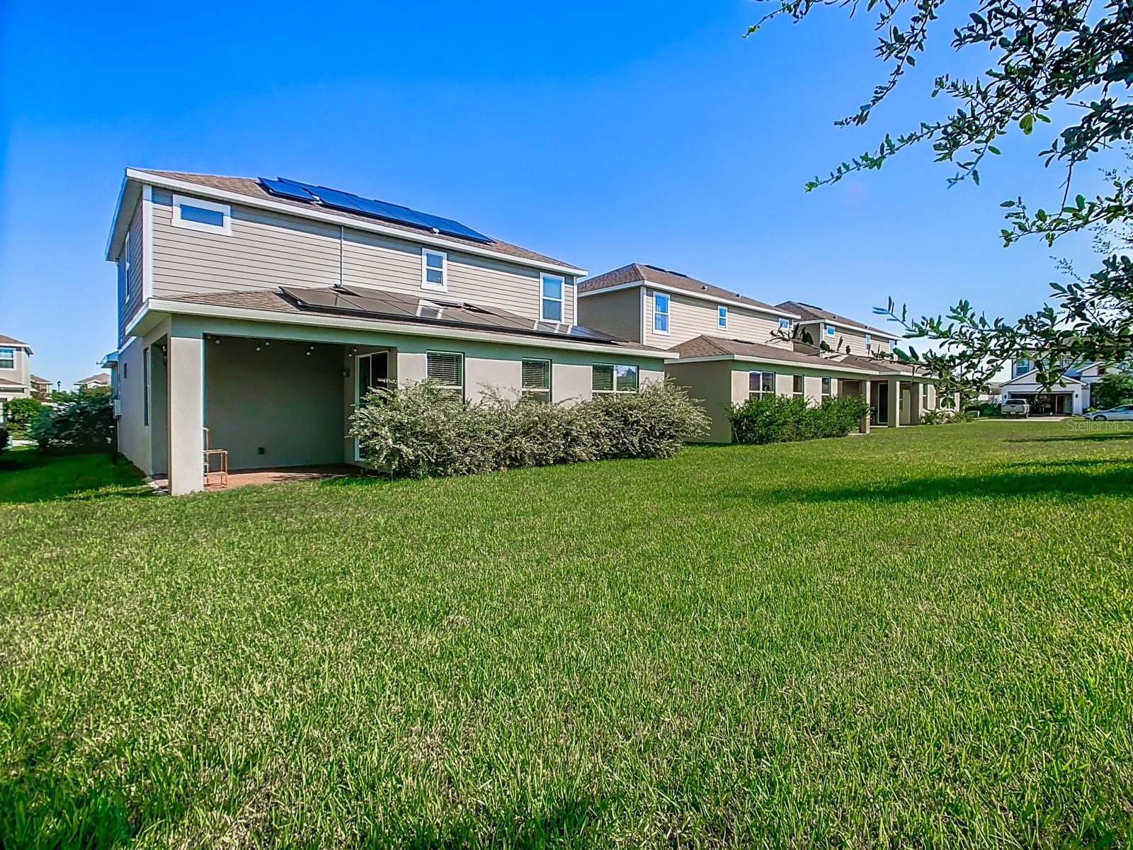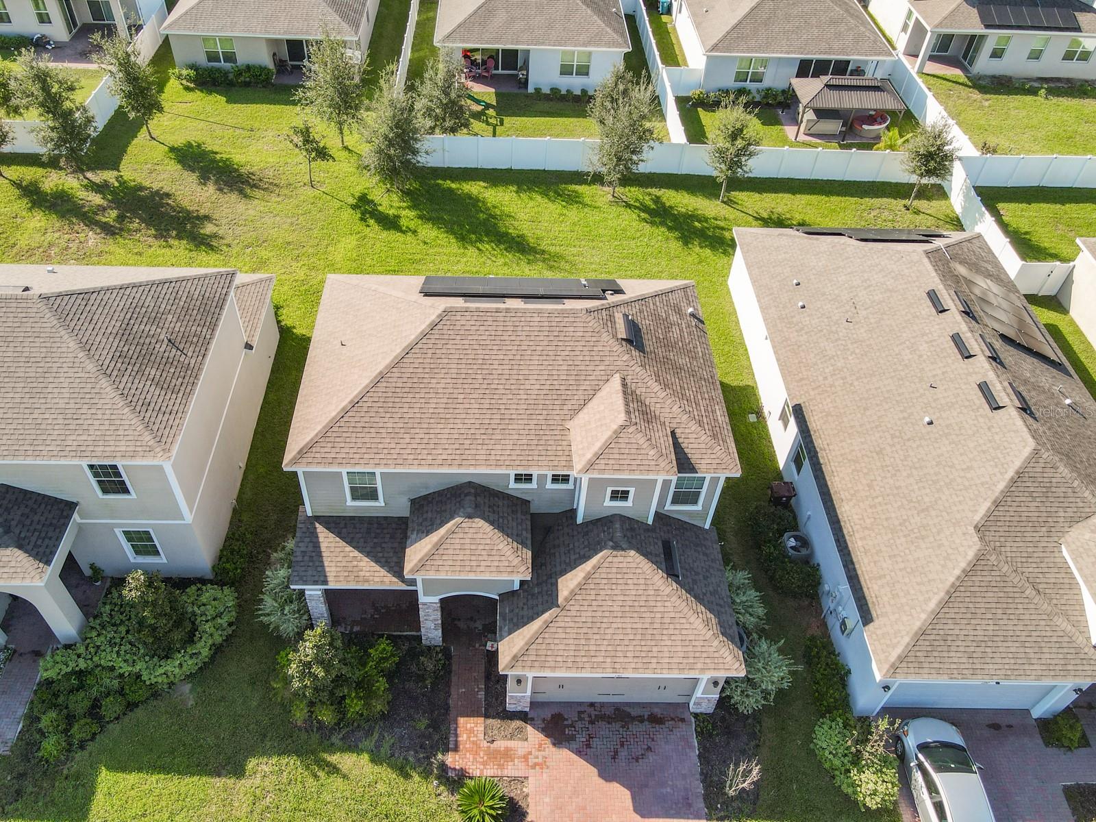 Discover this beautifully designed 4-bed, 3-bath home, built in 2021 by Park Square Homes. COMES WITH SOLAR PANEL PACKAGE providing very low energy costs averaging $25-$80 per month! Located in the vibrant community of Davenport, FL, this property combines luxury with functionality, ideal for family life. This home features 4 spacious bedrooms, 3 full bathrooms and over 2,300 sq ft of modern living space. A cozy front porch greets you before you enter the home. Some of the highlights of this like-new home are the open kitchen, complete with sleek modern appliances including a Samsung Bespoke designer refrigerator, quartz countertops, farmhouse sink, cooktop, built-in microwave & oven for easy access and ample storage. The flooring was upgraded with stylish ceramic tile throughout downstairs. Enjoy the bonus room downstairs which can be used as an office, den, workspace or craft nook. Upstairs has a versatile loft area perfect for a playroom or additional living space. The primary bedroom features a modern bathroom with a walk-in shower and built-in bench, dual sinks and a massive walk-in closet. There is a convenient laundry chute from the second floor down to the laundry room equipped with Samsung washer and dryer set. Off the living room there is a covered lanai and a spacious backyard, perfect for entertaining. The two-car garage with additional storage options offers plenty of parking. The community amenities include: a playground, soccer field, swimming pool. Enjoy these with a LOW HOA of just $207 per quarter! No CDD fee. Situated in a growing area of Davenport, this home is just 30 minutes away from Disney World, making it a perfect spot for both relaxation and fun. Close to schools, and shopping centers, you’ll have everything you need within reach. Schedule your showing today! 3D Tour: https://nodalview.com/s/2inz4Ti9z6remwJ_bbXgJ9