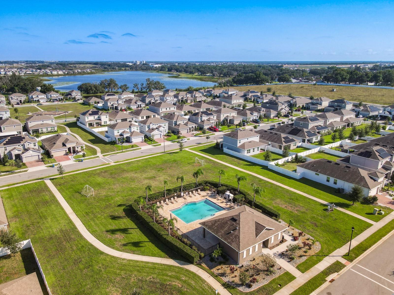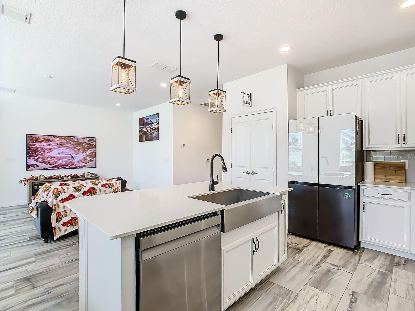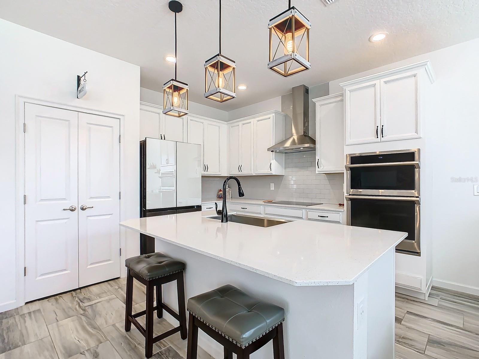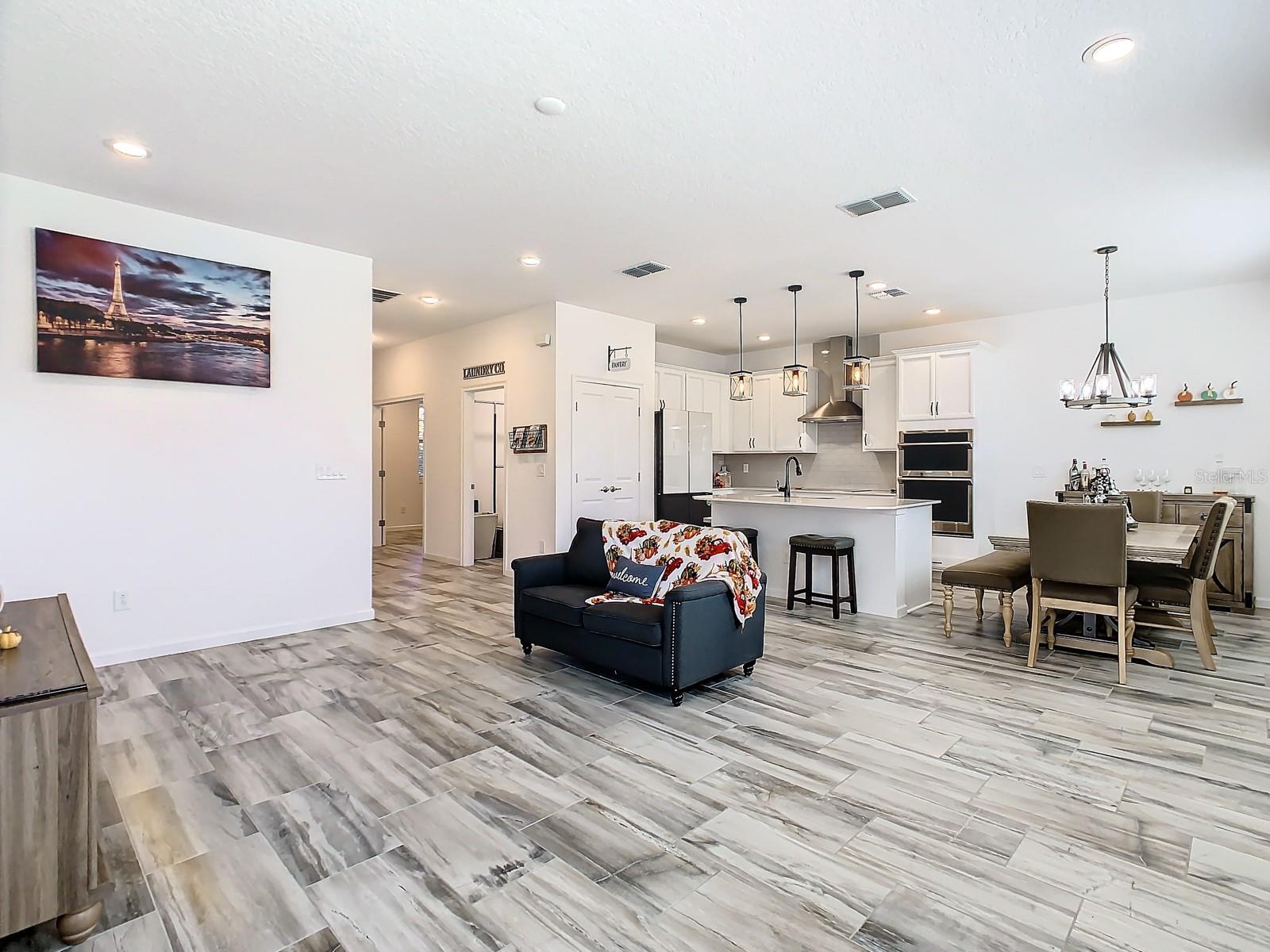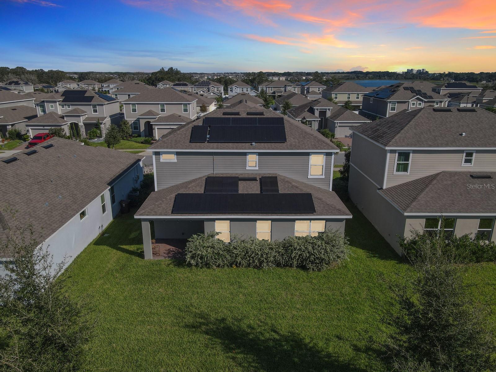 Discover this beautifully designed 4-bed, 3-bath home, built in 2021 by Park Square Homes. COMES WITH SOLAR PANEL PACKAGE providing very low energy costs averaging $25-$80 per month! Located in the vibrant community of Davenport, FL, this property combines luxury with functionality, ideal for family life. This home features 4 spacious bedrooms, 3 full bathrooms and over 2,300 sq ft of modern living space. A cozy front porch greets you before you enter the home. Some of the highlights of this like-new home are the open kitchen, complete with sleek modern appliances including a Samsung Bespoke designer refrigerator, quartz countertops, farmhouse sink, cooktop, built-in microwave & oven for easy access and ample storage. The flooring was upgraded with stylish ceramic tile throughout downstairs. Enjoy the bonus room downstairs which can be used as an office, den, workspace or craft nook. Upstairs has a versatile loft area perfect for a playroom or additional living space. The primary bedroom features a modern bathroom with a walk-in shower and built-in bench, dual sinks and a massive walk-in closet. There is a convenient laundry chute from the second floor down to the laundry room equipped with Samsung washer and dryer set. Off the living room there is a covered lanai and a spacious backyard, perfect for entertaining. The two-car garage with additional storage options offers plenty of parking. The community amenities include: a playground, soccer field, swimming pool. Enjoy these with a LOW HOA of just $207 per quarter! No CDD fee. Situated in a growing area of Davenport, this home is just 30 minutes away from Disney World, making it a perfect spot for both relaxation and fun. Close to schools, and shopping centers, you’ll have everything you need within reach. Schedule your showing today! 3D Tour: https://nodalview.com/s/2inz4Ti9z6remwJ_bbXgJ9