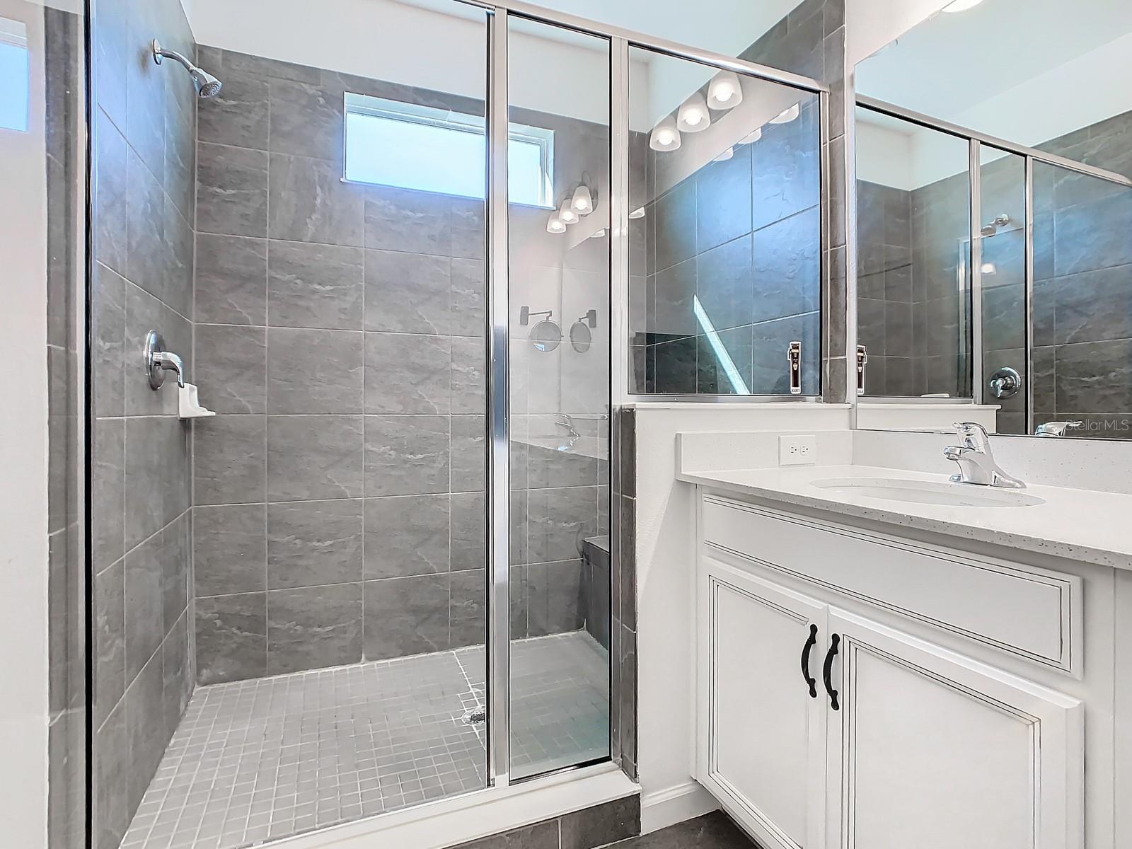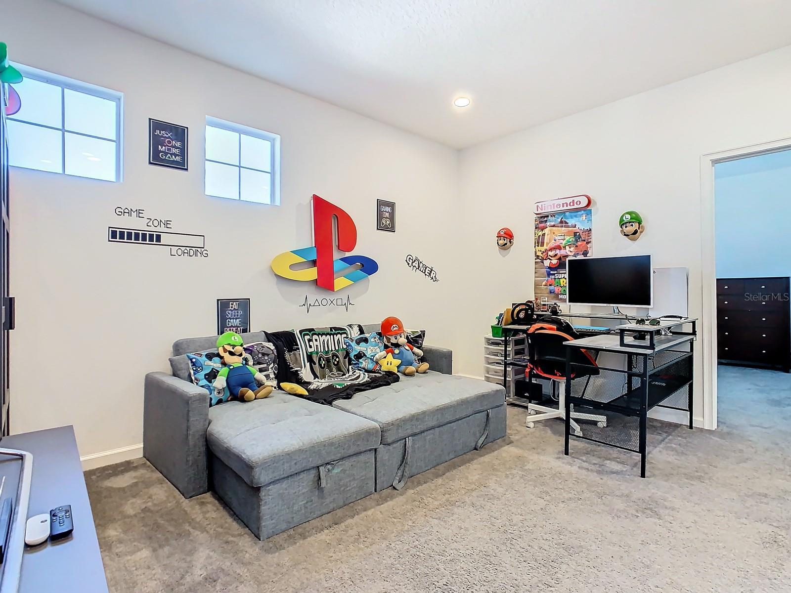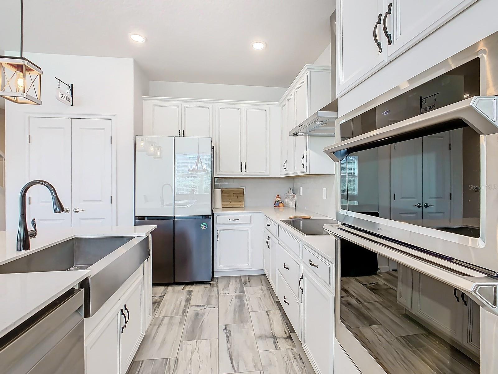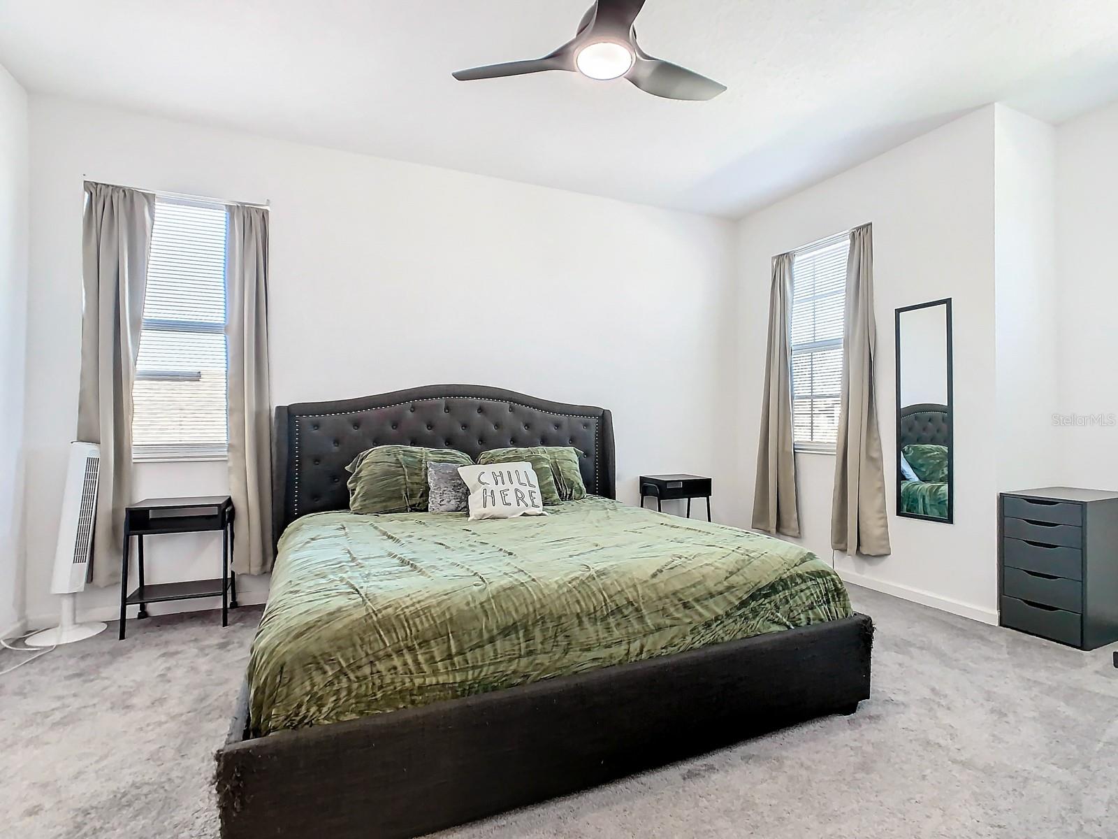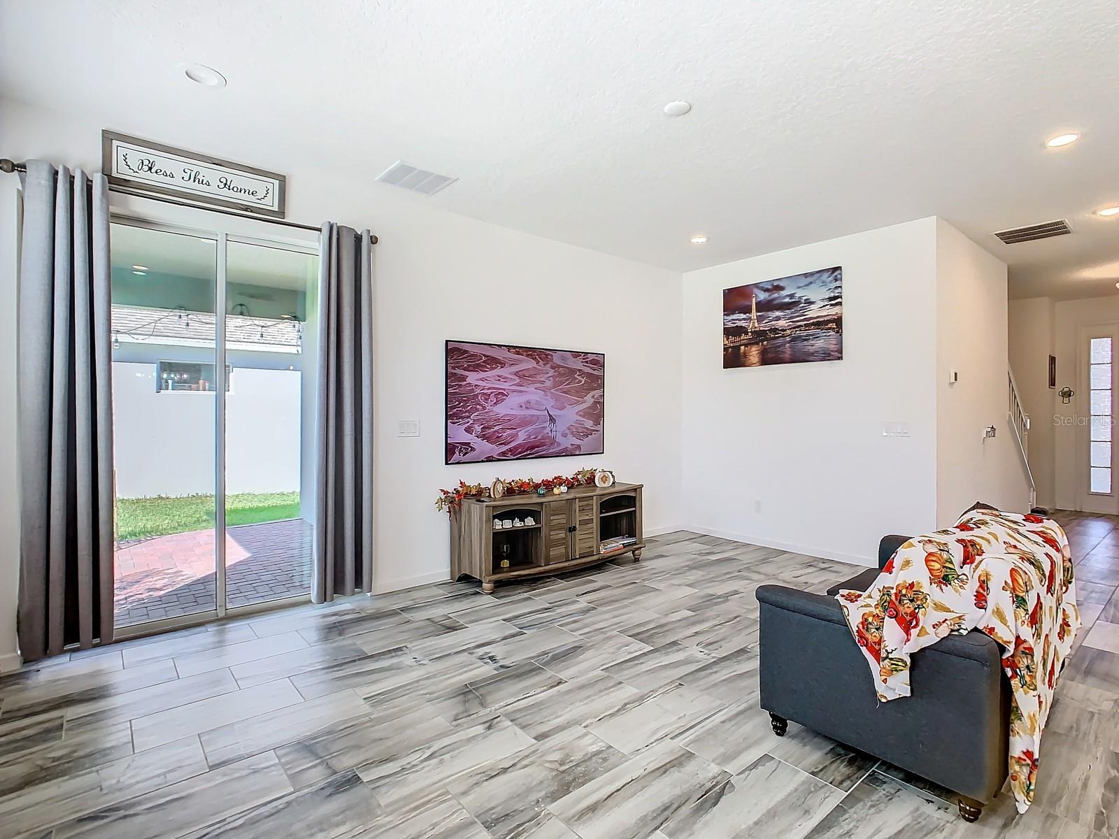 Discover this beautifully designed 4-bed, 3-bath home, built in 2021 by Park Square Homes. COMES WITH SOLAR PANEL PACKAGE providing very low energy costs averaging $25-$80 per month! Located in the vibrant community of Davenport, FL, this property combines luxury with functionality, ideal for family life. This home features 4 spacious bedrooms, 3 full bathrooms and over 2,300 sq ft of modern living space. A cozy front porch greets you before you enter the home. Some of the highlights of this like-new home are the open kitchen, complete with sleek modern appliances including a Samsung Bespoke designer refrigerator, quartz countertops, farmhouse sink, cooktop, built-in microwave & oven for easy access and ample storage. The flooring was upgraded with stylish ceramic tile throughout downstairs. Enjoy the bonus room downstairs which can be used as an office, den, workspace or craft nook. Upstairs has a versatile loft area perfect for a playroom or additional living space. The primary bedroom features a modern bathroom with a walk-in shower and built-in bench, dual sinks and a massive walk-in closet. There is a convenient laundry chute from the second floor down to the laundry room equipped with Samsung washer and dryer set. Off the living room there is a covered lanai and a spacious backyard, perfect for entertaining. The two-car garage with additional storage options offers plenty of parking. The community amenities include: a playground, soccer field, swimming pool. Enjoy these with a LOW HOA of just $207 per quarter! No CDD fee. Situated in a growing area of Davenport, this home is just 30 minutes away from Disney World, making it a perfect spot for both relaxation and fun. Close to schools, and shopping centers, you’ll have everything you need within reach. Schedule your showing today! 3D Tour: https://nodalview.com/s/2inz4Ti9z6remwJ_bbXgJ9