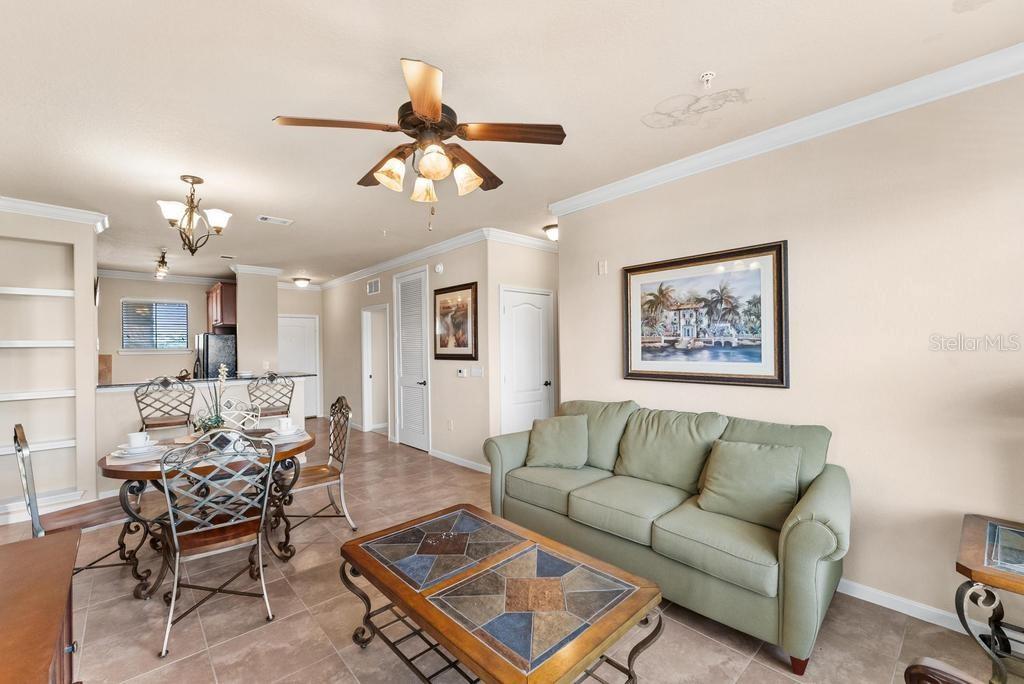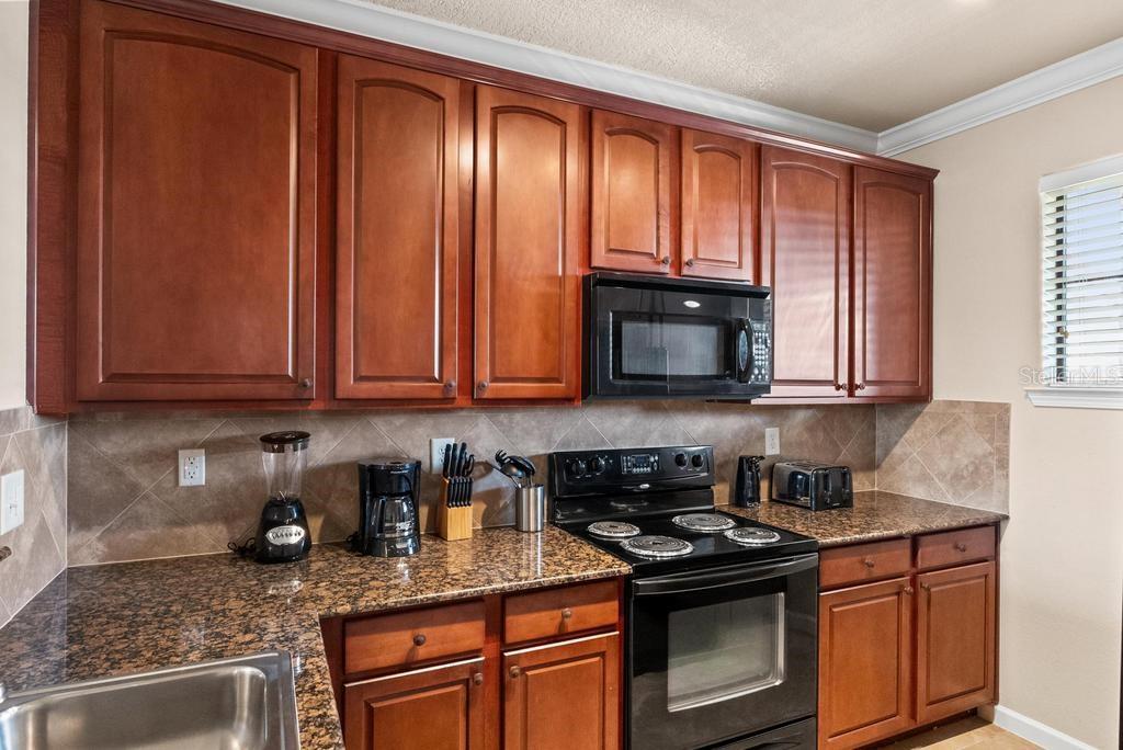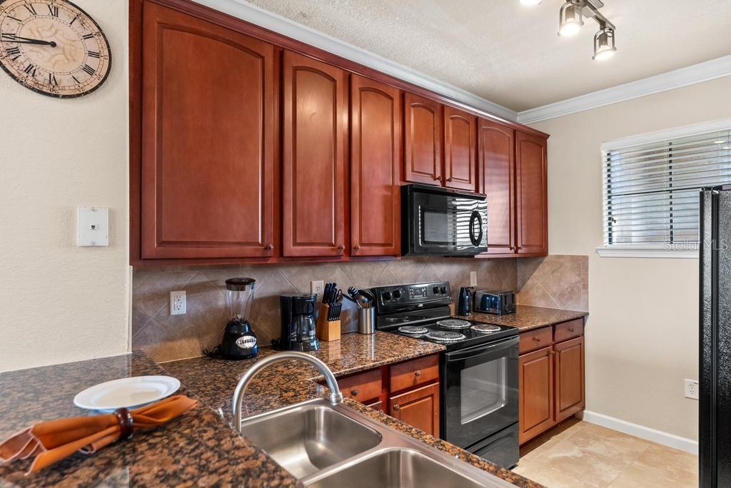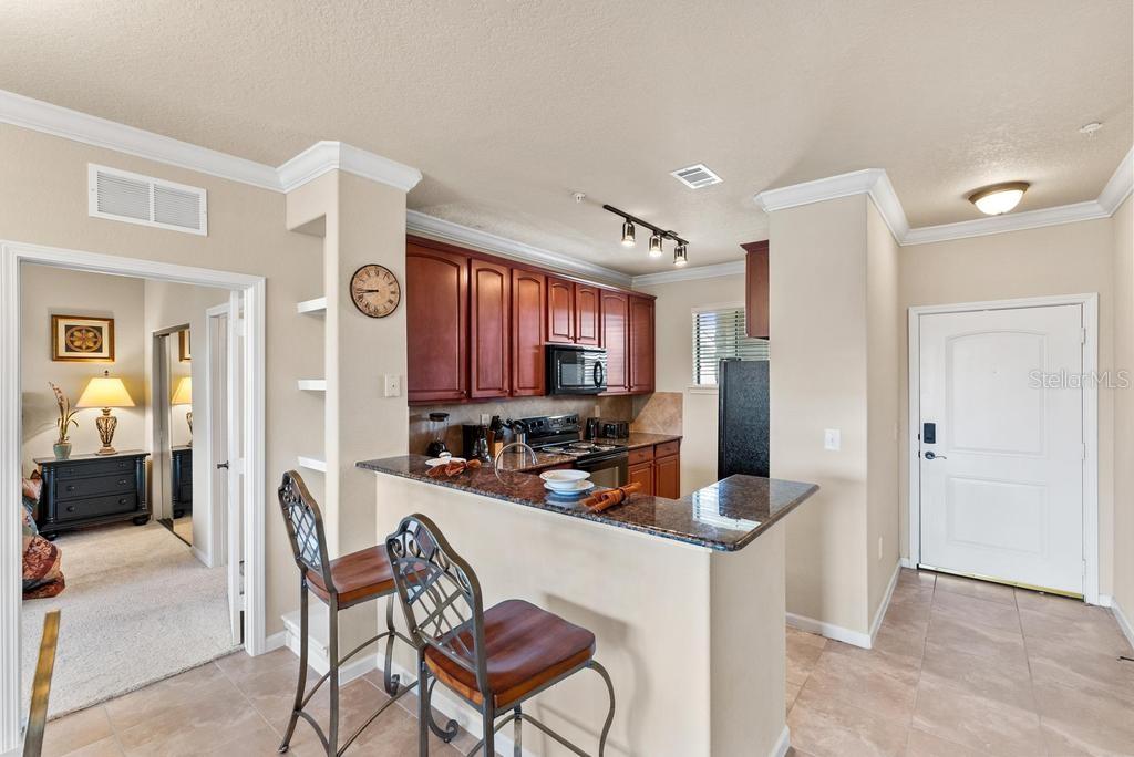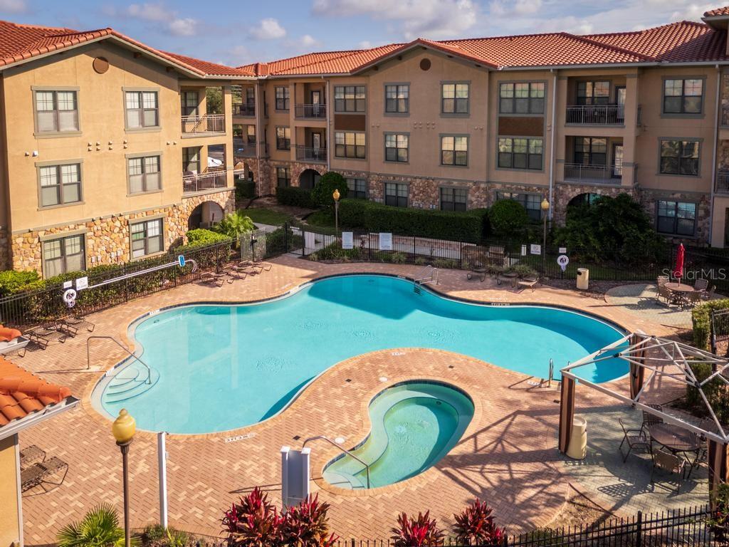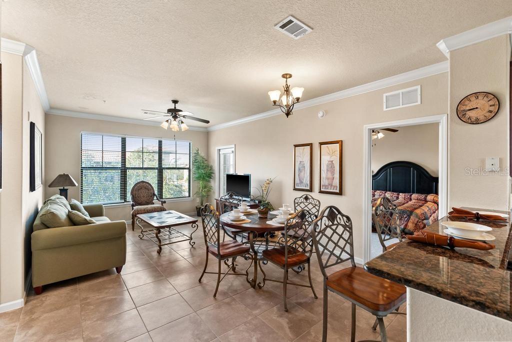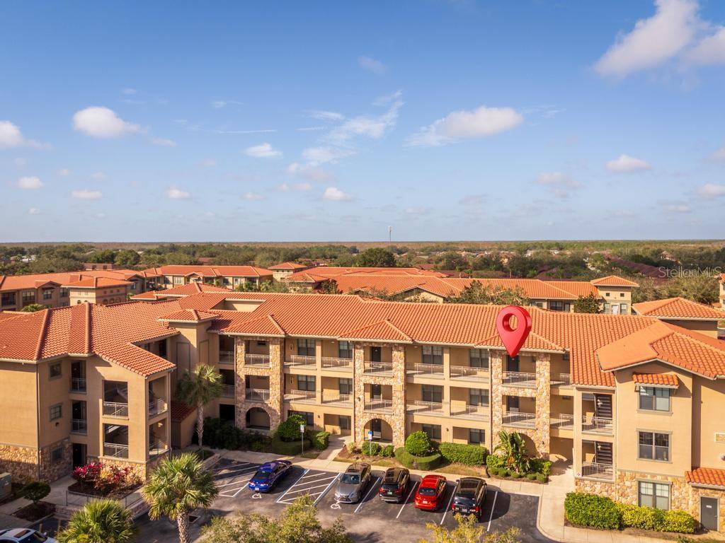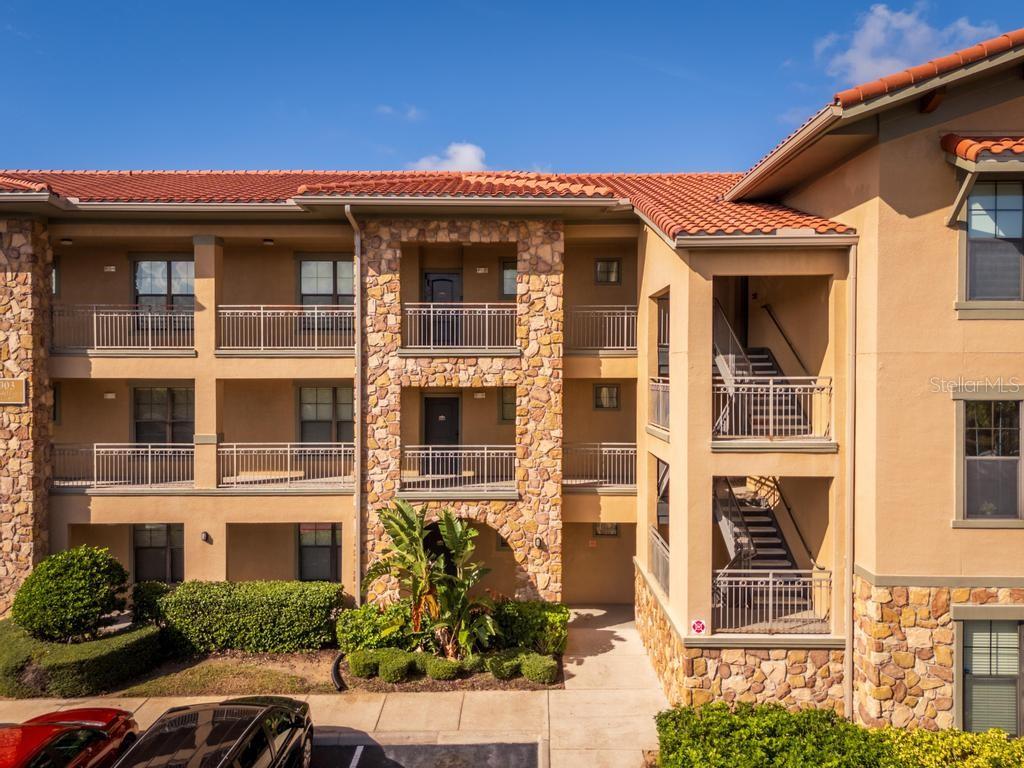 (The lowest priced 3B 3B in the complex) CASH ONLY . This listing showcases a beautifully maintained, fully furnished 3-bedroom, 3-bathroom Tuscan-style unit just 15 minutes from Disney Parks. Building has elevator. Perfect for residents or as a short-term rental, this rare, private property offers peaceful fountain views and numerous upgrades like granite countertops, wood cabinetry, crown molding, and tile flooring throughout, with cozy carpets in the bedrooms. The home is within walking distance of grocery stores and restaurants, enhancing convenience. Community amenities include two pools, a kids' pool, a large jacuzzi, a gym, a business center, and BBQ grill areas spread across landscaped gardens. The HOA covers water, cable, and internet, making it a hassle-free choice for full-time living or as an investment property with solid bookings. The unit is move-in or rental-ready, with all appliances and furniture included, and even features an in-unit washer and dryer. Don't miss this well-kept, inviting home—an ideal opportunity in a prime location!