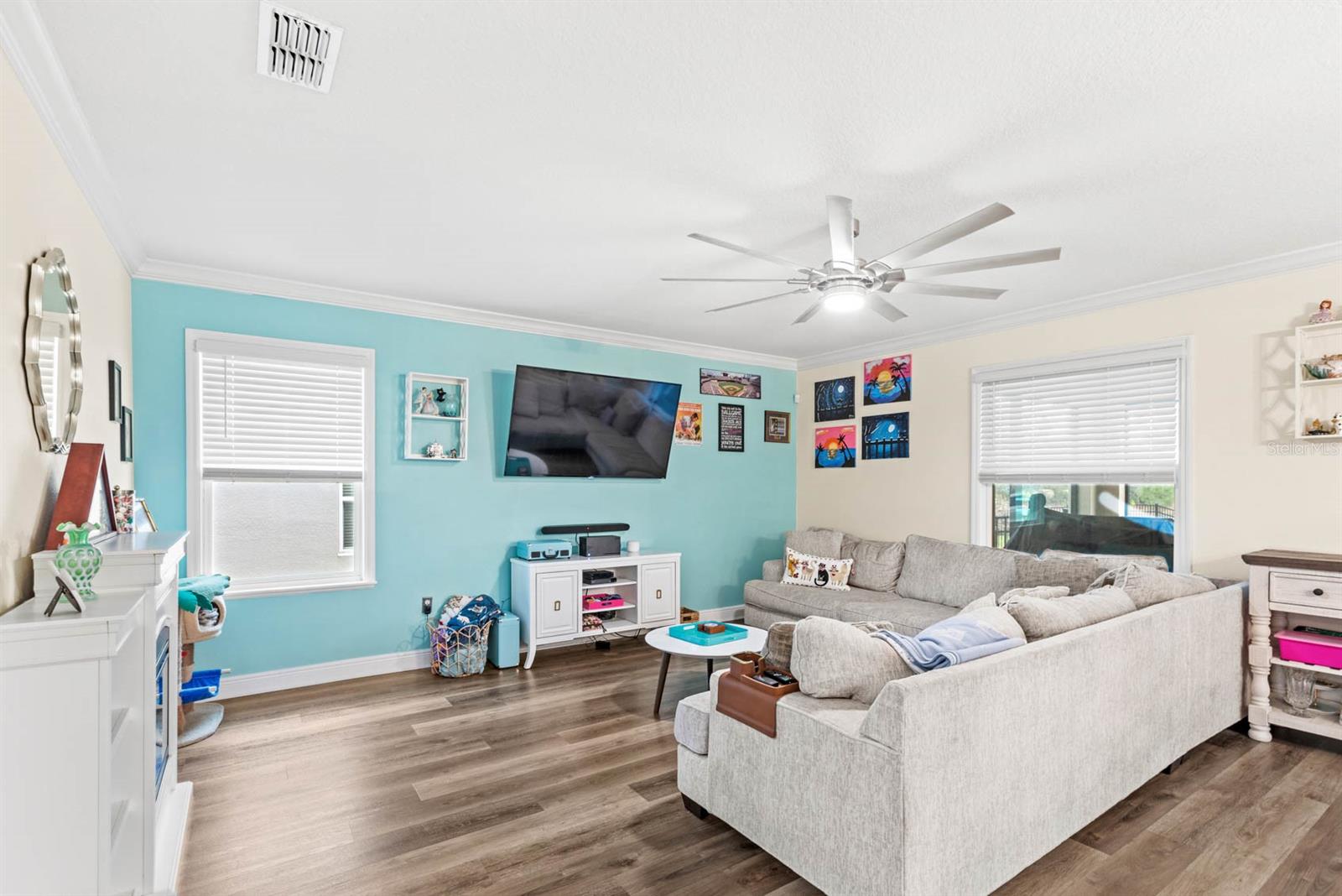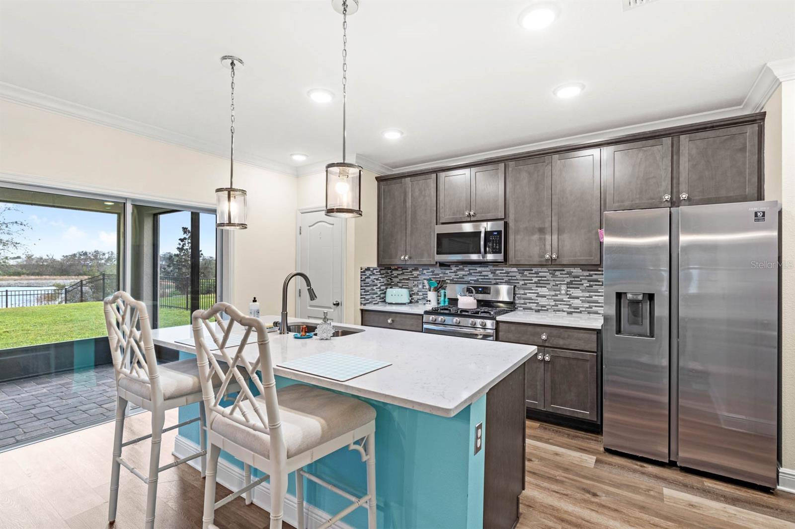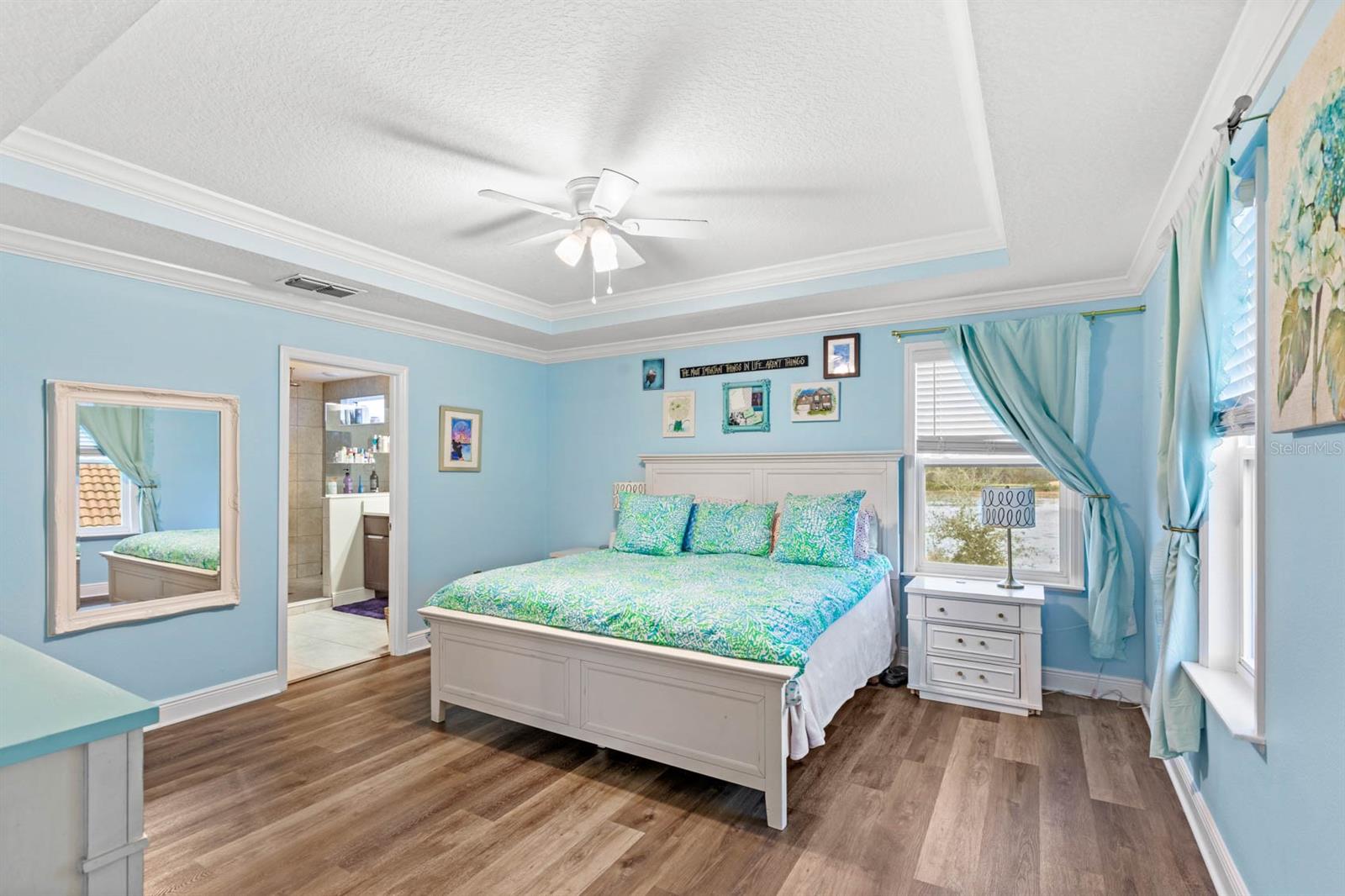Welcome to Your Dream Home in Solterra Springs! The Exclusive Residential area, no short term rentals here! Discover resort-style living with residential peace of mind in the highly sought-after gated community of Solterra Springs. This stunning, newer 5-bedroom, 3-full-bath home offers an abundance of modern upgrades and luxurious features, making it the perfect haven for relaxation and entertainment. Key Features Include: Luxury Vinyl Plank Flooring throughout for durability and style, Crown Molding that adds a touch of elegance, Stainless Steel Appliances and Quartz Countertops in the kitchen, Custom Primary Closet, Extended Screened-In Patio for year-round outdoor enjoyment, Strada Home Security System for added peace of mind. The layout boasts large bedrooms, including a first-floor ensuite for convenience and a primary suite upstairs for ultimate privacy. The backyard is an oasis with water views, breathtaking sunsets, and a large fenced-in yard, perfect for relaxation or entertaining. Room for your DREAM POOL in this yard! Community Amenities You'll Love: Resort-style pool and lazy river, fully equipped gym, Sand volleyball court, Two playgrounds, a brand-new meeting center. This home truly has it all, blending luxurious living with the comforts of a welcoming community. Don’t miss your chance to make this exceptional property your own. Schedule your private showing today!