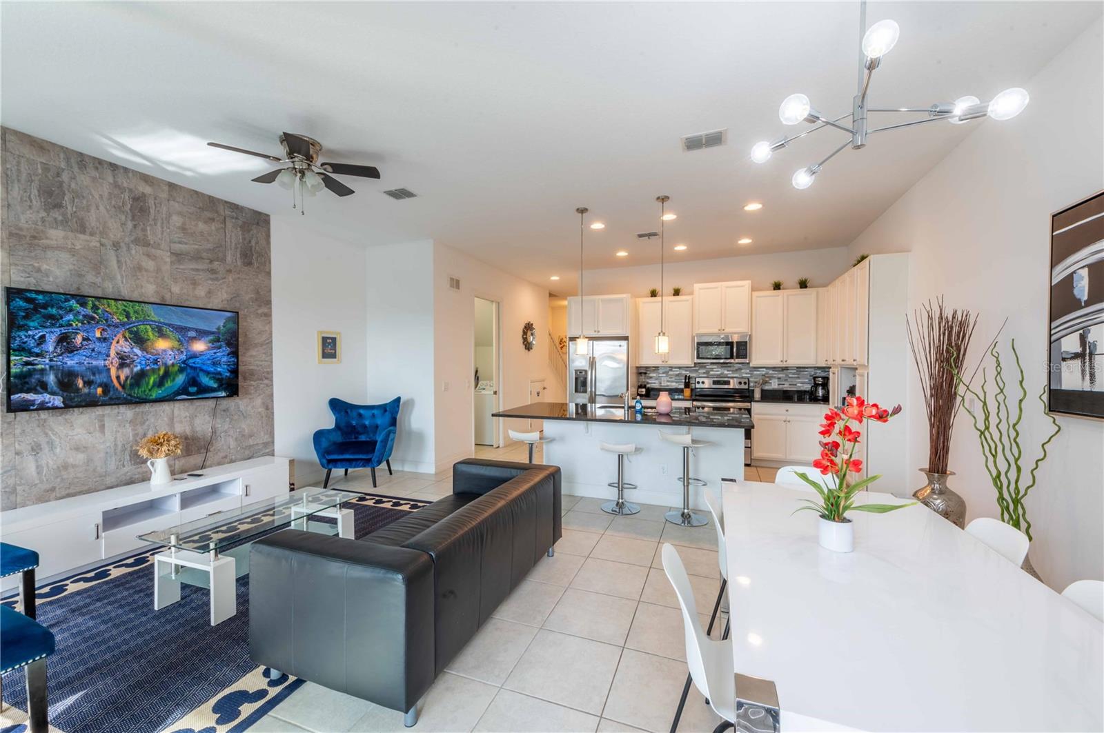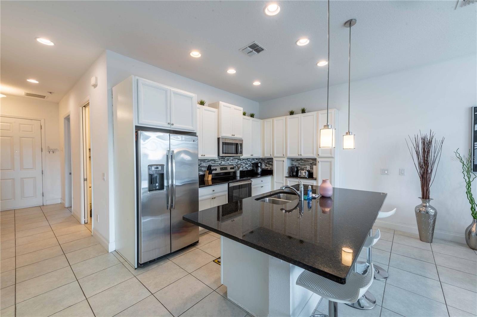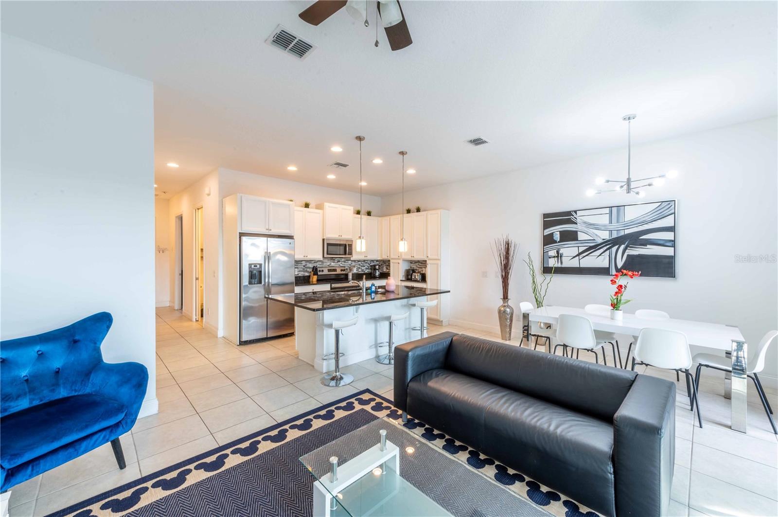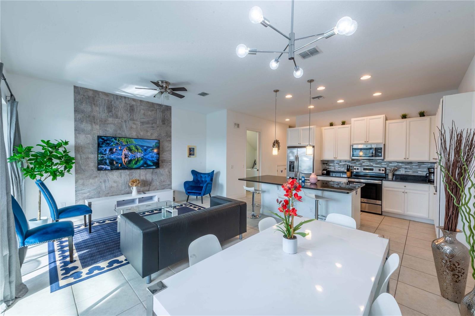 SELLER WILL PAY FOR 1 YEAR OF BUYERS HOA FEES AT CLOSING WITH A FULL PRICE OFFER. Step into this beautifully fully furnished 3-bedroom, 2.5-bathroom townhouse, designed with a contemporary flair and located in the heart of Festival Bay Resort—just minutes away from Orlando’s most iconic attractions! Only 10 minutes to Disney World, 15 minutes to SeaWorld, and 20 minutes to Universal Studios, this home is perfectly situated for both fun and convenience. Nearby, you’ll find top-rated restaurants, convenience stores, and pharmacies, making it an ideal location for exploring Orlando and Central Florida. The gourmet kitchen is a chef’s dream, featuring stainless steel appliances, granite countertops, a spacious island, 42" cabinets with custom moldings, and a stylish backsplash. The bright and airy open-concept living and dining areas create the perfect space for family gatherings or entertaining, complete with a 55" TV and seating for six at the dining table. Sliding glass doors flood the space with natural light and lead to a covered patio, where you can dine al fresco or relax in Florida’s tropical climate. Enjoy the heated pool with a jacuzzi, privacy walls, and serene conservation views—a peaceful retreat right in your backyard. The primary suite on the ground floor is your private oasis, featuring a luxurious king-size bed and an ensuite bathroom with a unique sliding door for added convenience. Upstairs, you’ll find a versatile flex room with a sofa bed, two additional bedrooms, and a beautifully appointed bathroom with double sinks and granite countertops—perfect for hosting family and friends. This townhouse is packed with extras: HOA includes internet, cable, garbage, pest control, water, and exterior/ground maintenance. Resort-style amenities: fitness center, poolside restaurant, resort pool, water park, game room, and more! Whether you're looking for a stunning vacation home or a profitable investment property, this home offers short- and long-term rental options to suit your needs. Don’t miss the chance to own this slice of paradise. Schedule your showing today and discover everything this incredible home has to PROVIDE!