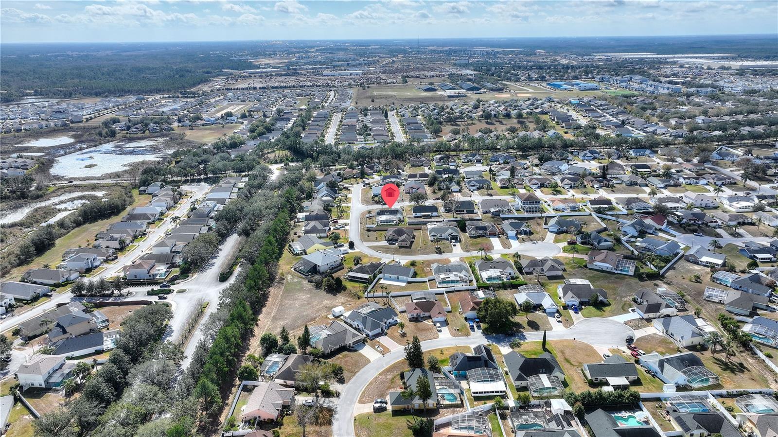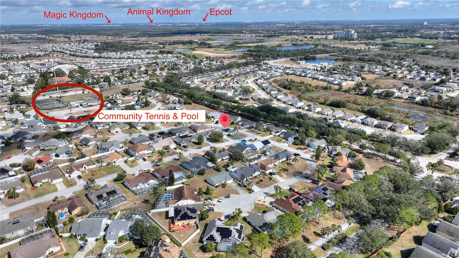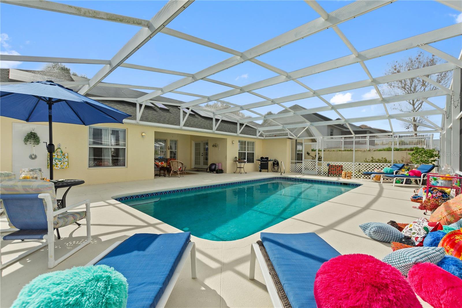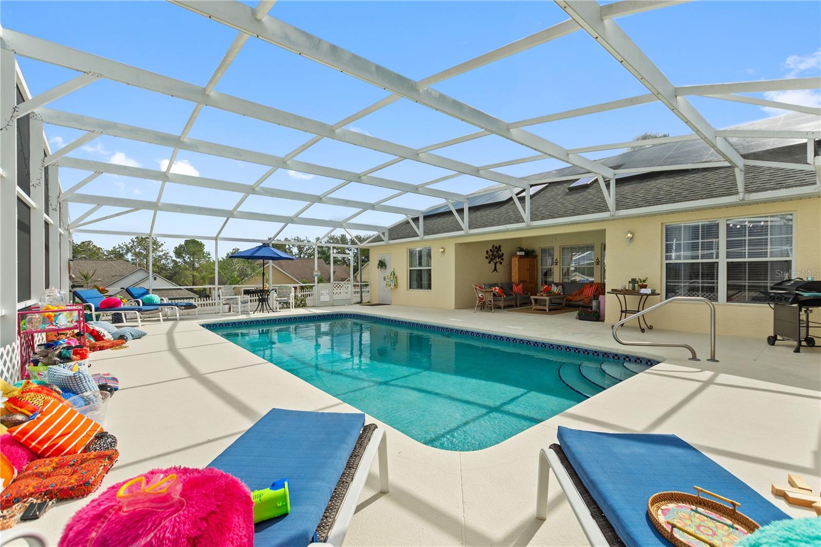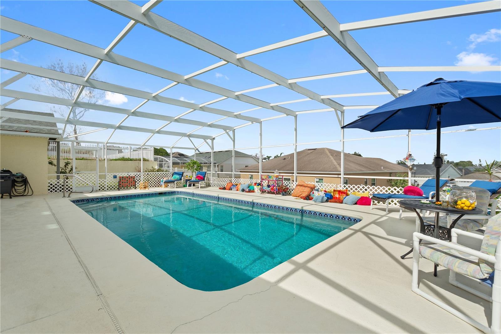 Back on market... Buyer financing fell through last minute...This extremely well maintained single level 4 bedroom, 3 full bath home shines as brightly as Florida's most brilliant sunny days! Located on a 1/4 acre corner lot located a few minutes to abundant shopping, restaurants and Omni's Championsgate Golf Club, not to mention only 15 minutes to Disney! The home rests on high ground with skyward views from almost every vantage point. Delightful from top to bottom, the open/split floor plan enjoys vaulted/cathedral ceilings, skylights, and abundant oversized windows flooding the home with light, providing it with its perfectly sunny disposition. The oversized Porcelain Tiles are a study in Carrera marble and grace nearly the entire home. The bedrooms provide for soft & warm landing with well cared for, high quality carpets. The Kitchen is the heart of the home, overlooking every aspect of the house, and it’s new granite countertops rest exquisitely on white painted solid wood cabinets. The new Samsung suite of stainless steel appliances are a seamless aesthetic blend, and the large single basin under mount kitchen sink is a perfect joy. The Dining Room opens to the large covered lanai with French Doors and an expansive pool & deck for you and your guests to revel in. This is truly an entertaining home with several areas to grill, lounge, dine al fresco, or simply lap up the ubiquitous sunshine. The outdoor shower is both refreshing & convenient. Fully fenced, there are two side gardens which can accommodate your own putting green, fruit trees or herb garden, fire pit, dog run… let your imagination run wild! Once back inside, you’ll find two ensuite bedrooms with Eastern exposures: The Primary (King Sized) Bedroom has pool views, oversized garden tub, corner shower, double walk in closet and privy. The second en suite enjoys a southern exposure. On the West side of the home, are the two guest rooms, sharing the updated bath with new tile surround tub & inserts, cabinet & marble top. All rooms accommodate at least queen sized beds. This fully solar powered home allows for both primary residential or second/vacation home status. With a new roof, solar panels, spray insulation (2022), freshly painted drive, and so much more, this home will be nearly carefree for years to come. The extremely low HOA fees include tennis court & community pool! Come take a look & make your plans. You’ll want to stay.