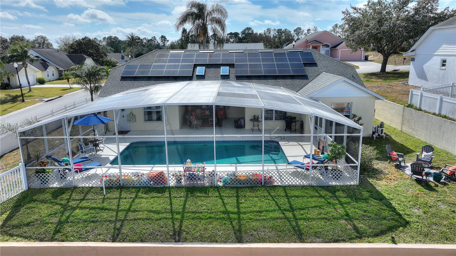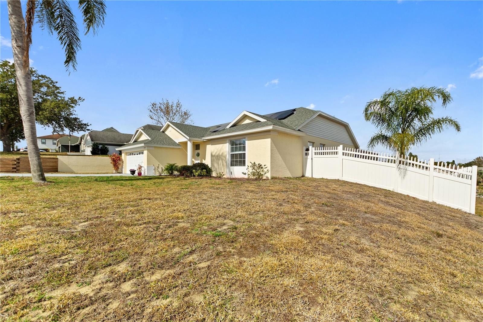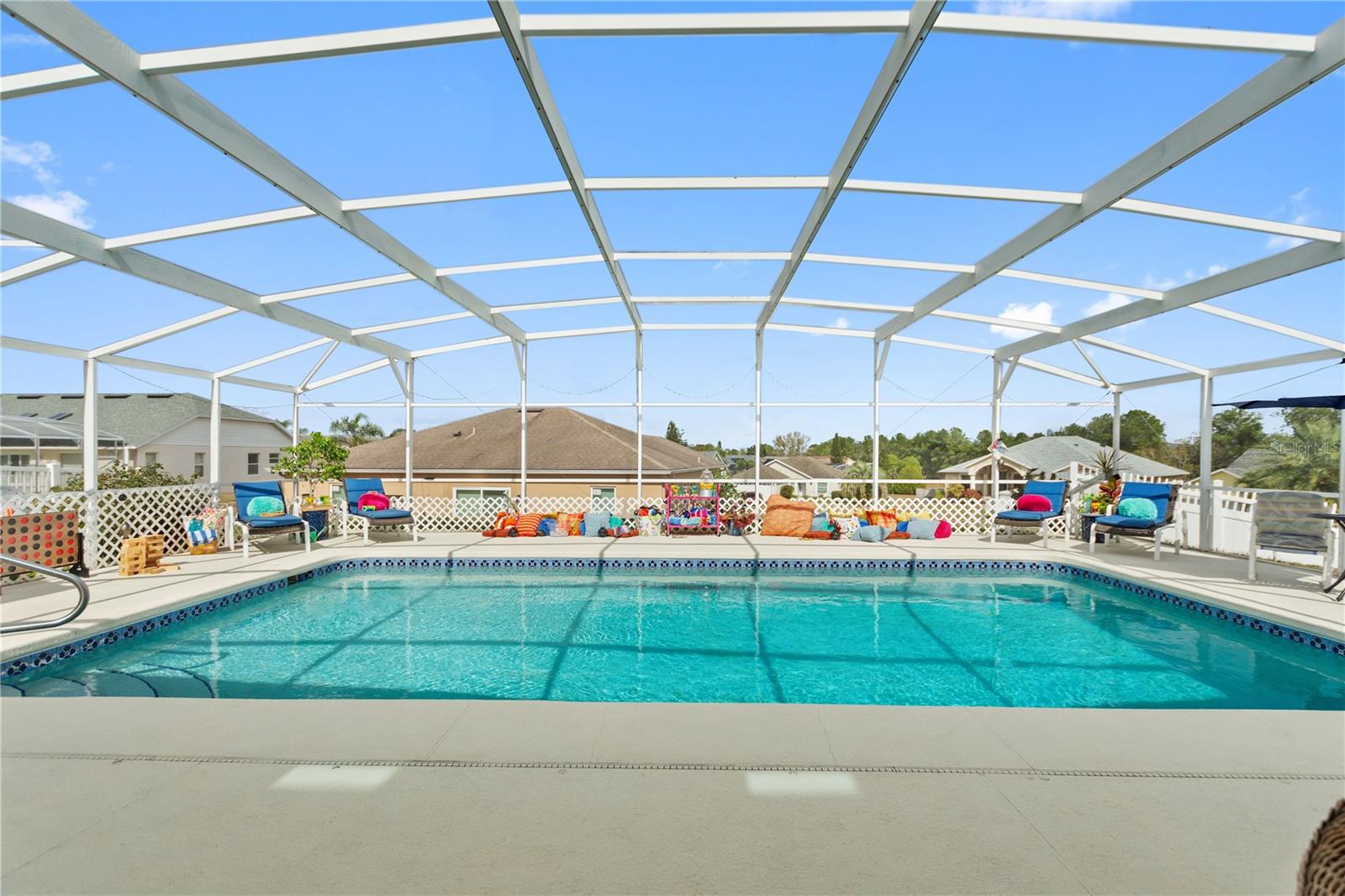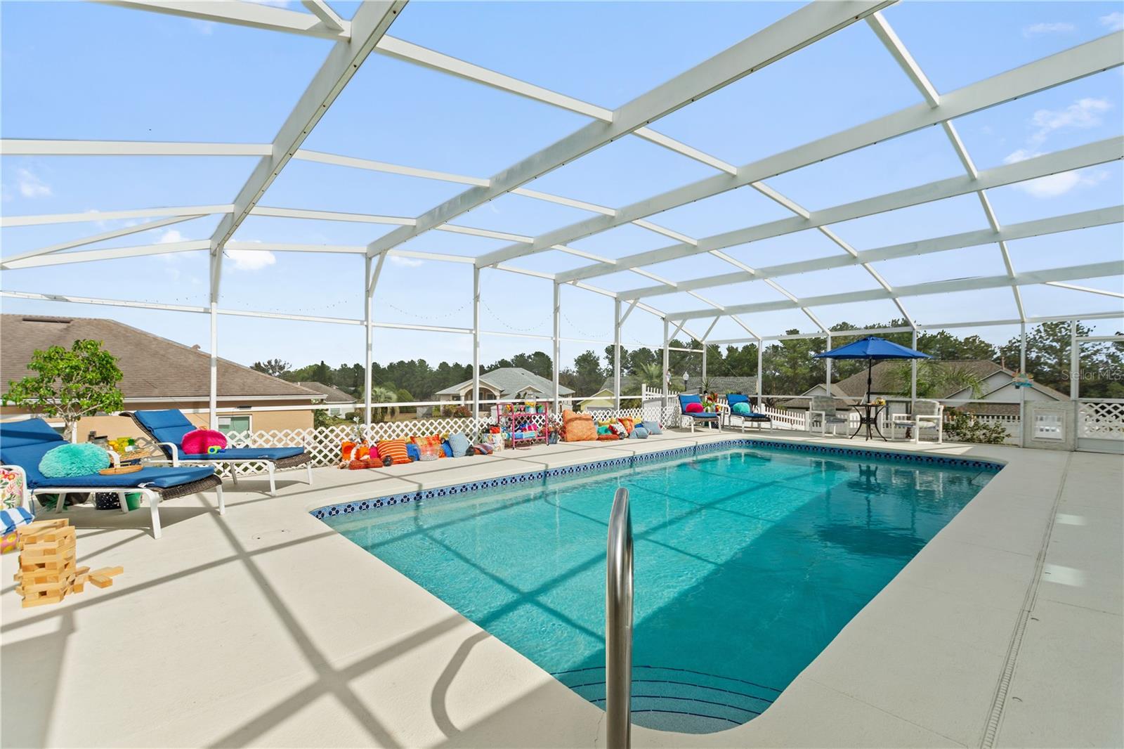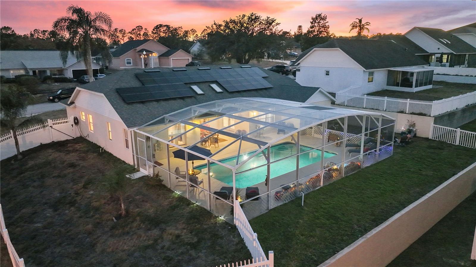 Back on market... Buyer financing fell through last minute...This extremely well maintained single level 4 bedroom, 3 full bath home shines as brightly as Florida's most brilliant sunny days! Located on a 1/4 acre corner lot located a few minutes to abundant shopping, restaurants and Omni's Championsgate Golf Club, not to mention only 15 minutes to Disney! The home rests on high ground with skyward views from almost every vantage point. Delightful from top to bottom, the open/split floor plan enjoys vaulted/cathedral ceilings, skylights, and abundant oversized windows flooding the home with light, providing it with its perfectly sunny disposition. The oversized Porcelain Tiles are a study in Carrera marble and grace nearly the entire home. The bedrooms provide for soft & warm landing with well cared for, high quality carpets. The Kitchen is the heart of the home, overlooking every aspect of the house, and it’s new granite countertops rest exquisitely on white painted solid wood cabinets. The new Samsung suite of stainless steel appliances are a seamless aesthetic blend, and the large single basin under mount kitchen sink is a perfect joy. The Dining Room opens to the large covered lanai with French Doors and an expansive pool & deck for you and your guests to revel in. This is truly an entertaining home with several areas to grill, lounge, dine al fresco, or simply lap up the ubiquitous sunshine. The outdoor shower is both refreshing & convenient. Fully fenced, there are two side gardens which can accommodate your own putting green, fruit trees or herb garden, fire pit, dog run… let your imagination run wild! Once back inside, you’ll find two ensuite bedrooms with Eastern exposures: The Primary (King Sized) Bedroom has pool views, oversized garden tub, corner shower, double walk in closet and privy. The second en suite enjoys a southern exposure. On the West side of the home, are the two guest rooms, sharing the updated bath with new tile surround tub & inserts, cabinet & marble top. All rooms accommodate at least queen sized beds. This fully solar powered home allows for both primary residential or second/vacation home status. With a new roof, solar panels, spray insulation (2022), freshly painted drive, and so much more, this home will be nearly carefree for years to come. The extremely low HOA fees include tennis court & community pool! Come take a look & make your plans. You’ll want to stay.