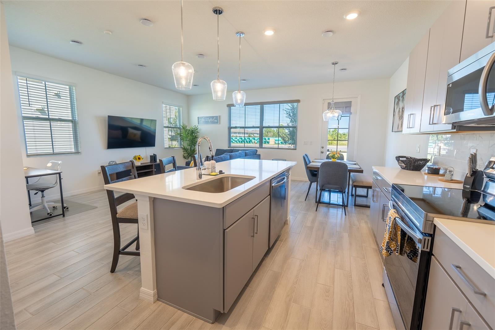 Discover this charming Ashton Woods townhome at 929 Conch Rd in the charming Davenport, FL! As you enter, you'll be welcomed by an expansive foyer that seamlessly leads into the open kitchen and family room, creating the ideal space for entertaining. When it's time to relax after a busy day, retreat upstairs to find three bedrooms and two bathrooms, perfectly situated away from the hustle and bustle of the main floor. With 1,653 square feet of living space, this home boasts stunning water views from every angle, making it a peaceful sanctuary for you and your guests. You'll be impressed by the thoughtfully designed features throughout, including wood plank tile flooring on the first floor, stainless steel kitchen appliances, quartz countertops in both the kitchen and bathrooms, energy-efficient Low-E vinyl windows, R-30 ceiling insulation, and LED lighting throughout. This property is part of The Enclaves at Festival, granting access to a wealth of resort-style amenities such as a community pool, mini-golf, water park, fitness center, and a beach volleyball court! Ideally located for those wanting to be near Champions Gate and Disney, you’ll also enjoy a variety of shopping options, diverse dining experiences, golfing, and convenient highway access. Plus, all appliances are included, along with smart home features, making your move-in process a breeze. With an enticing opportunity to embrace the best of townhome living in a fantastic location, the Southport floor plan is sure to impress! Reach out today for more information and to arrange your personal tour!