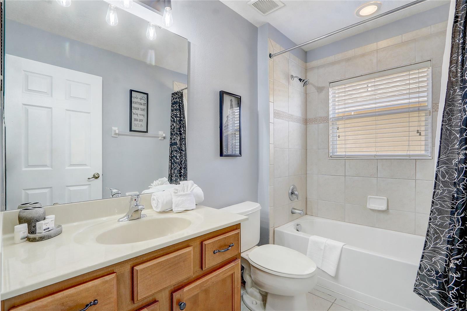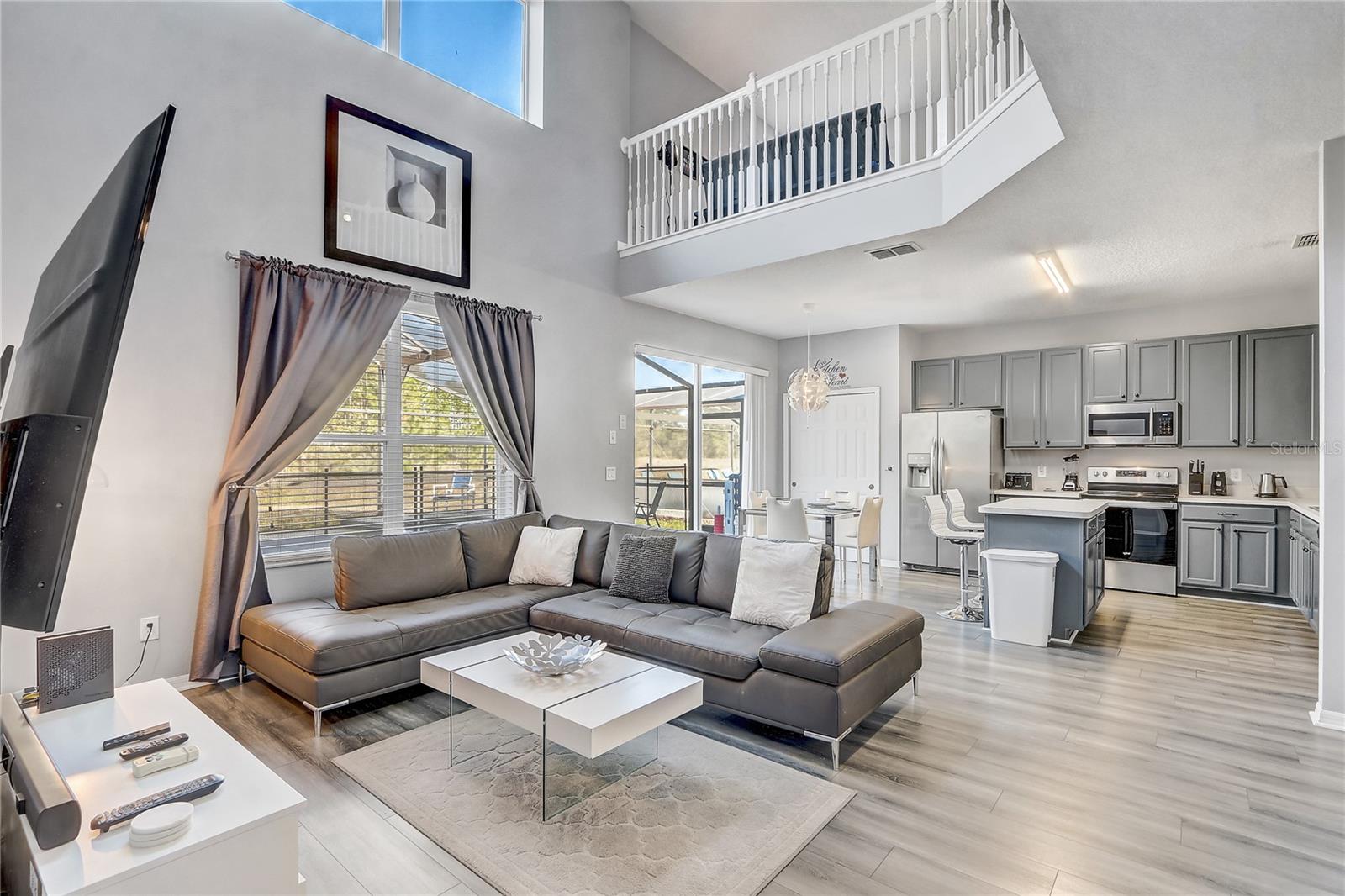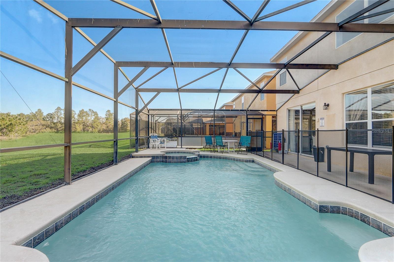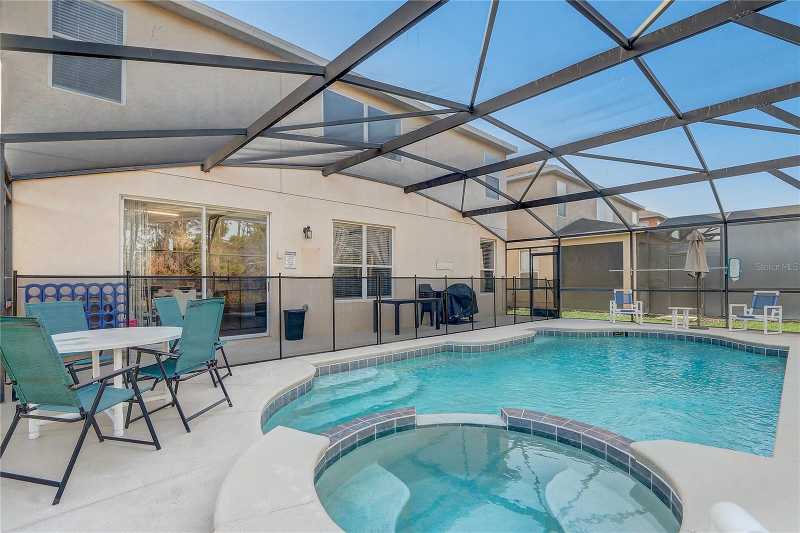 Welcome to this stunning 6-bedroom, 4.5-bathroom home located in the highly desirable gated Watersong community in Davenport, Florida. With 2,820 sq. ft. of living space, this fully furnished home (excluding select items) offers a perfect blend of style, comfort, and convenience. As you enter, you are greeted by a spacious family room and dining room combo, providing an open and inviting atmosphere. Just off the dining area, the kitchen features modern stainless steel appliances, a central island, ample cabinet space, and an eat-in area, making it the perfect place for family meals. The living room boasts soaring high ceilings, adding to the home's sense of grandeur. The primary bedroom is conveniently located on the main floor and includes a luxurious en-suite bathroom with dual sinks, a separate shower, and a soaking tub. Upstairs, a balcony overlooks the main living area, and a versatile loft space awaits – ideal for a game room, office, or additional living area. Five additional generously-sized bedrooms complete the upstairs, ensuring plenty of room for family and guests. Step outside to the heart of the home – a screened-in lanai with a sparkling inground pool and hot tub, all set against the backdrop of a spacious backyard. Recent upgrades to the home include vinyl flooring, new carpet, updated stainless steel appliances, new pool security gate, updated pool screens, and a new pool safety fence – all completed in 2024. Additional improvements include a new hot water heater, new washer, and new dryer in 2025, as well as a brand-new front door Wi-Fi system. Both AC units were replaced in 2023 and 2024, ensuring optimal comfort year-round. Residents of the Watersong community enjoy access to exceptional amenities, including a clubhouse, fitness center, pool and hot tub, playground, tennis courts, volleyball courts, and more. In addition to the fantastic amenities, the HOA fee covers lawn care, 24-hour guarded gate access, cable TV, internet, and valet trash service. Located just minutes from Disney World and other top attractions, this home offers the perfect location for those seeking both comfort and convenience in a vibrant community.