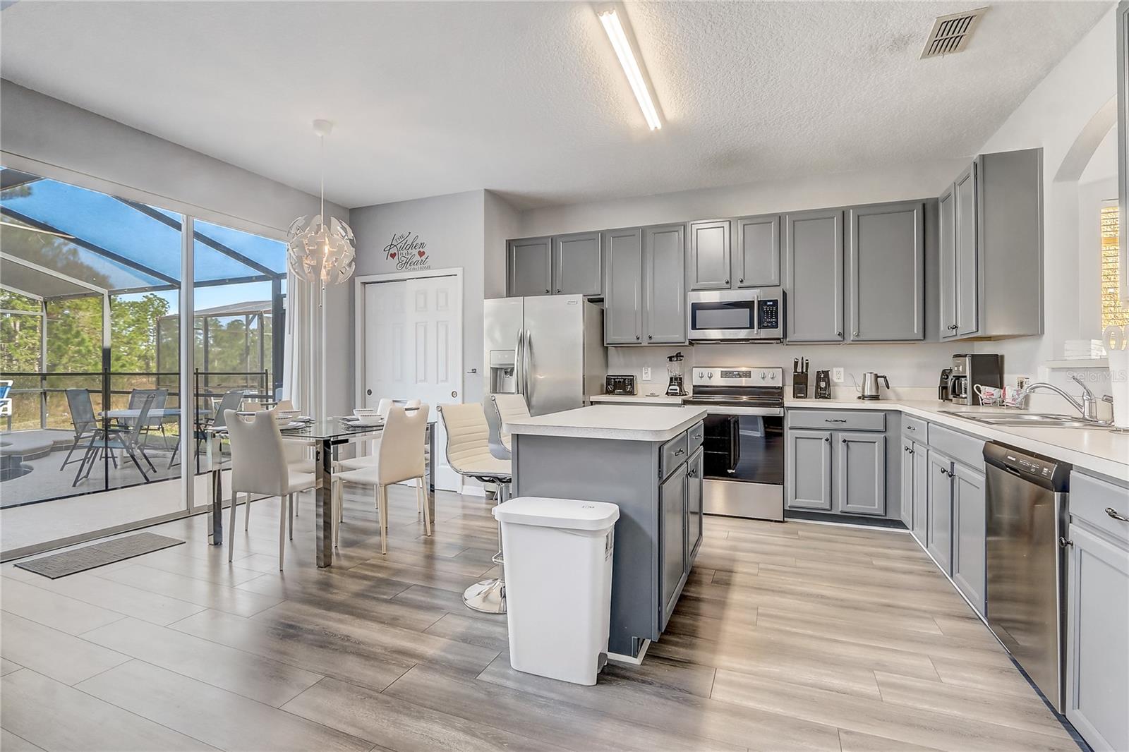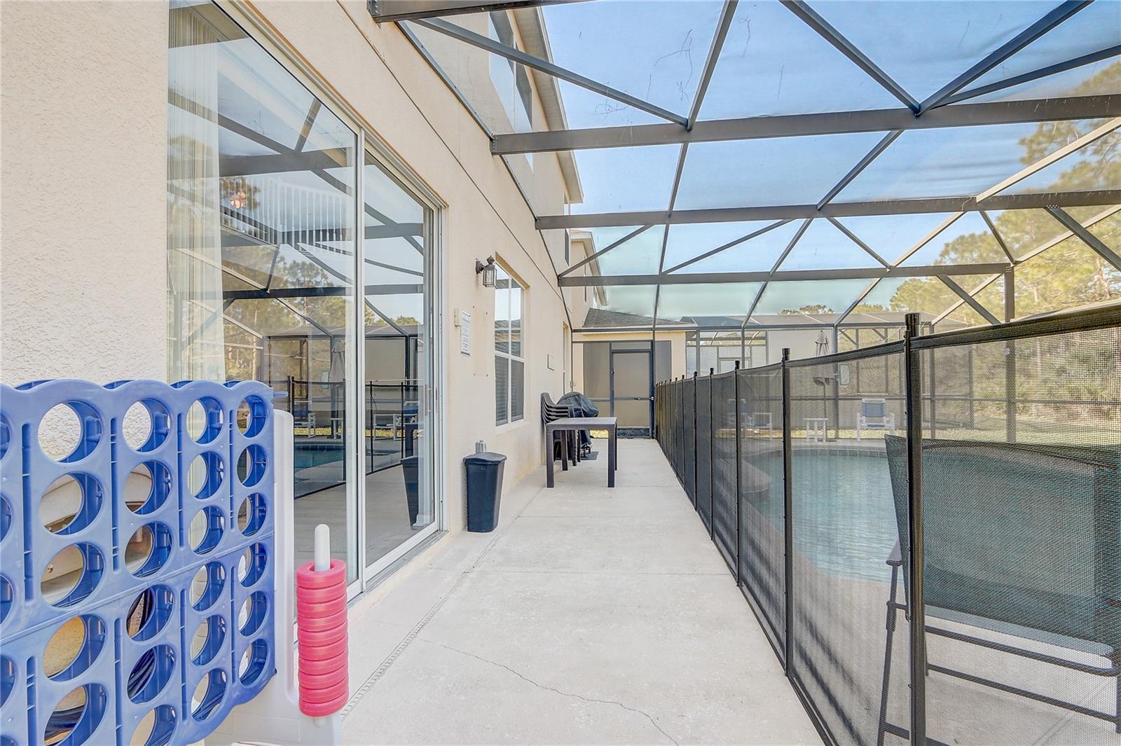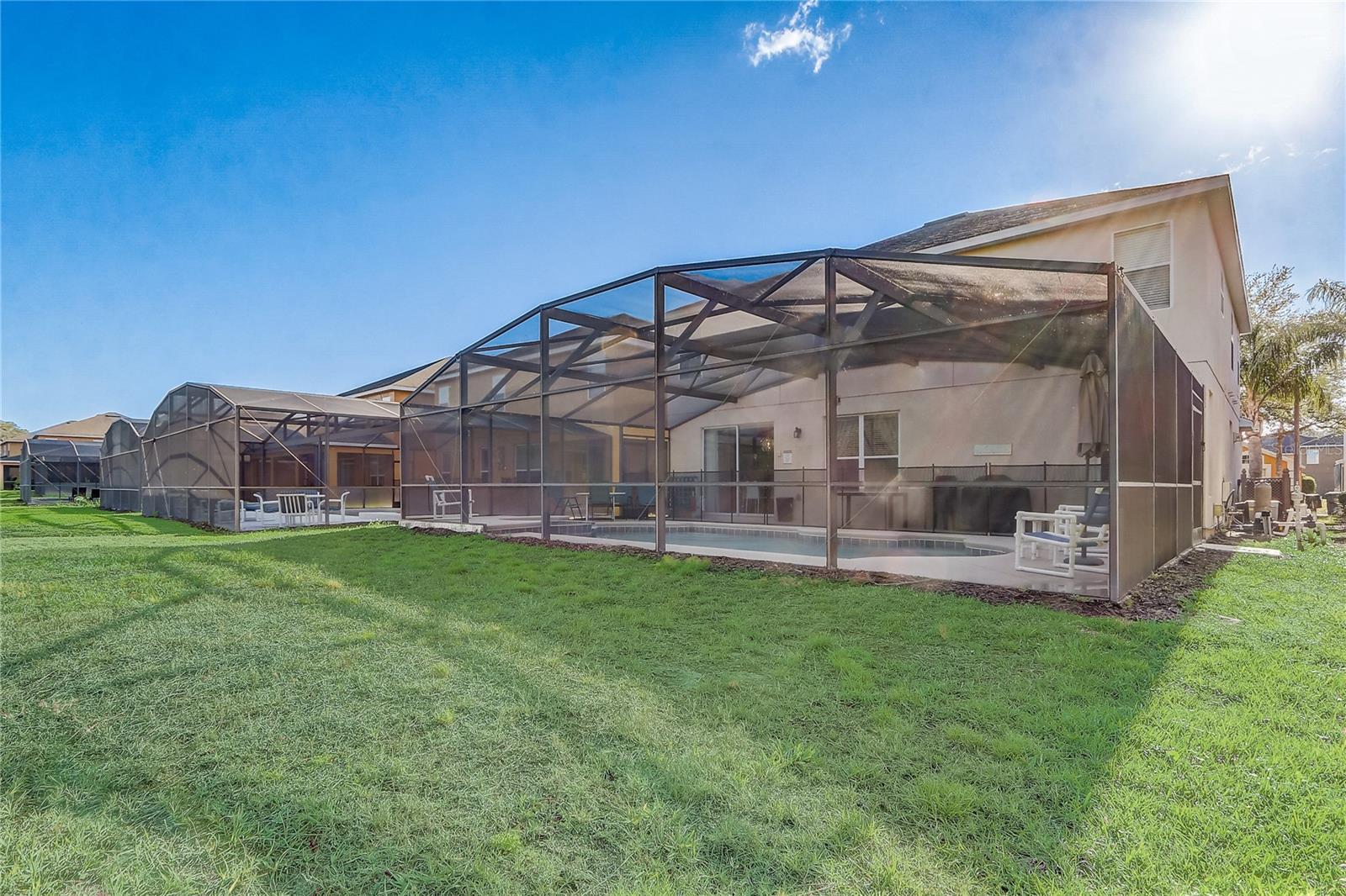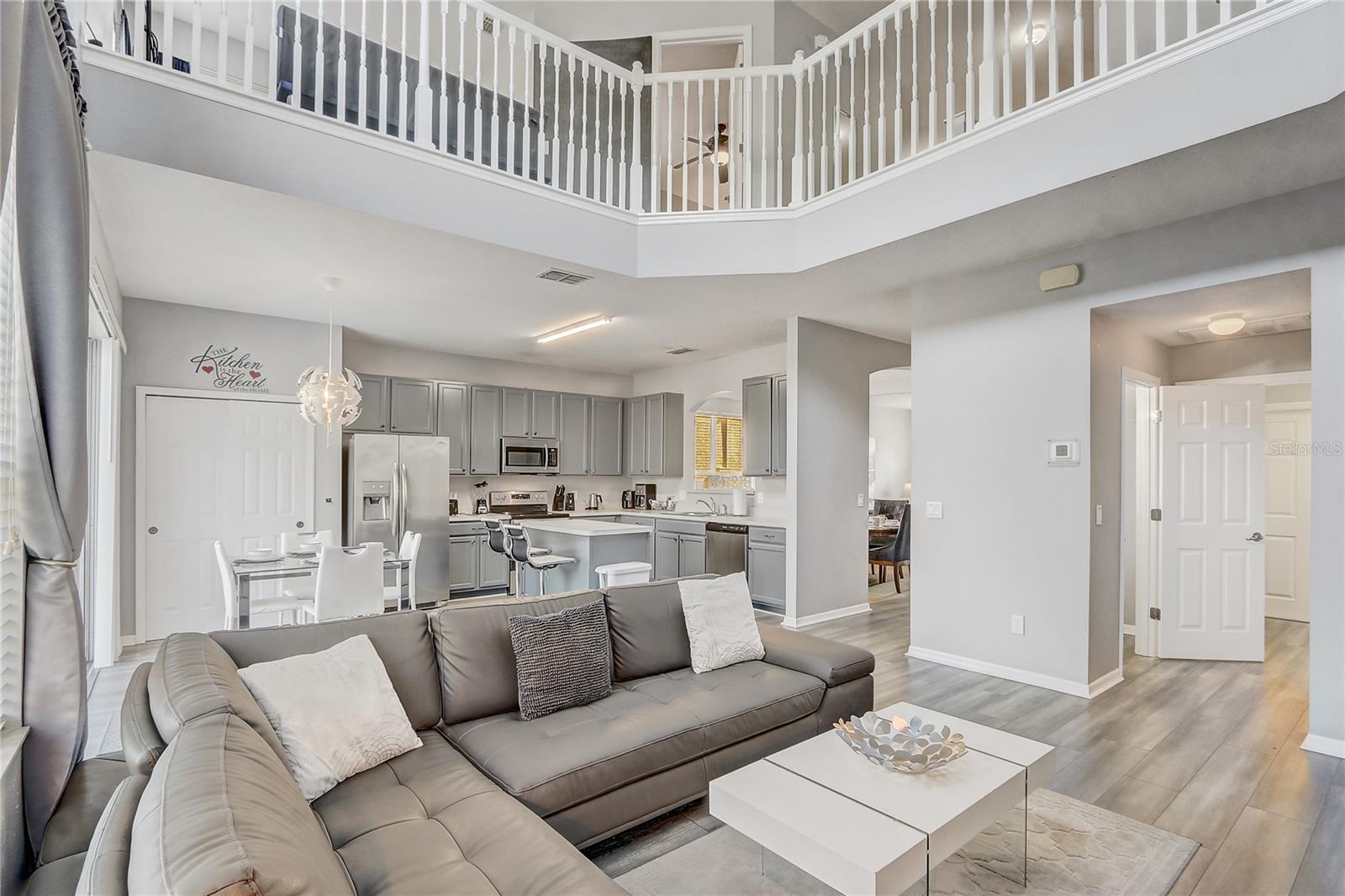 Welcome to this stunning 6-bedroom, 4.5-bathroom home located in the highly desirable gated Watersong community in Davenport, Florida. With 2,820 sq. ft. of living space, this fully furnished home (excluding select items) offers a perfect blend of style, comfort, and convenience. As you enter, you are greeted by a spacious family room and dining room combo, providing an open and inviting atmosphere. Just off the dining area, the kitchen features modern stainless steel appliances, a central island, ample cabinet space, and an eat-in area, making it the perfect place for family meals. The living room boasts soaring high ceilings, adding to the home's sense of grandeur. The primary bedroom is conveniently located on the main floor and includes a luxurious en-suite bathroom with dual sinks, a separate shower, and a soaking tub. Upstairs, a balcony overlooks the main living area, and a versatile loft space awaits – ideal for a game room, office, or additional living area. Five additional generously-sized bedrooms complete the upstairs, ensuring plenty of room for family and guests. Step outside to the heart of the home – a screened-in lanai with a sparkling inground pool and hot tub, all set against the backdrop of a spacious backyard. Recent upgrades to the home include vinyl flooring, new carpet, updated stainless steel appliances, new pool security gate, updated pool screens, and a new pool safety fence – all completed in 2024. Additional improvements include a new hot water heater, new washer, and new dryer in 2025, as well as a brand-new front door Wi-Fi system. Both AC units were replaced in 2023 and 2024, ensuring optimal comfort year-round. Residents of the Watersong community enjoy access to exceptional amenities, including a clubhouse, fitness center, pool and hot tub, playground, tennis courts, volleyball courts, and more. In addition to the fantastic amenities, the HOA fee covers lawn care, 24-hour guarded gate access, cable TV, internet, and valet trash service. Located just minutes from Disney World and other top attractions, this home offers the perfect location for those seeking both comfort and convenience in a vibrant community.
