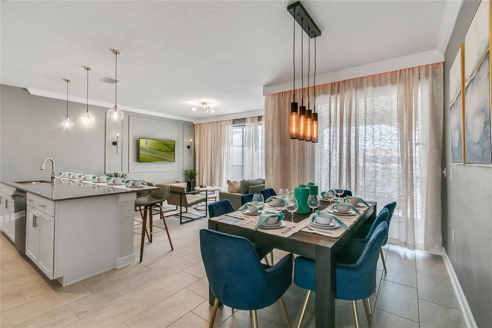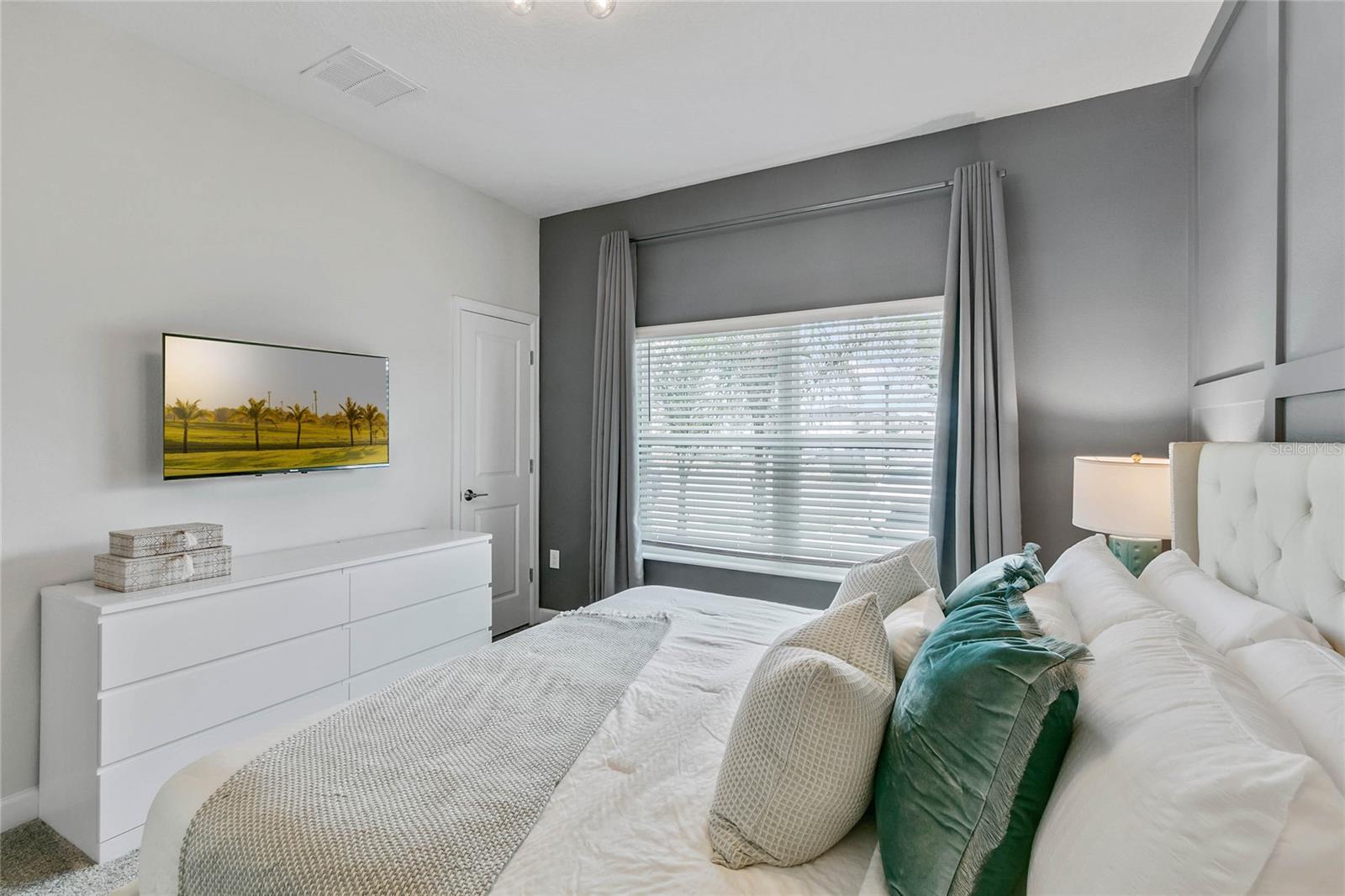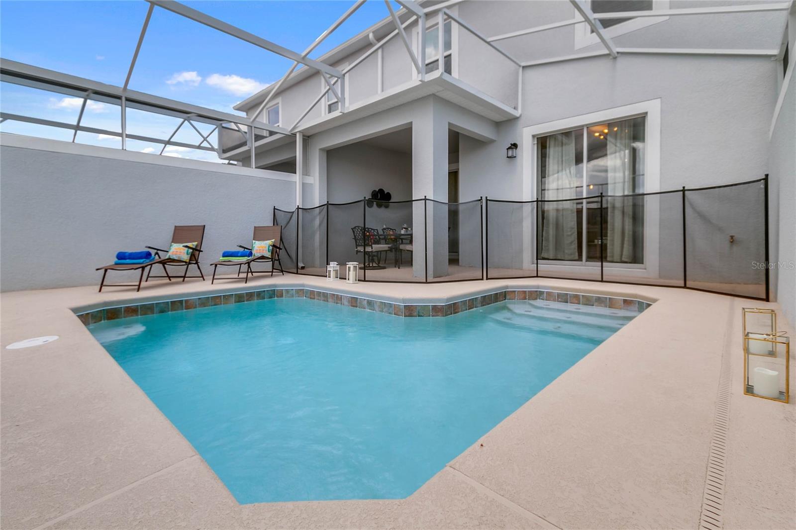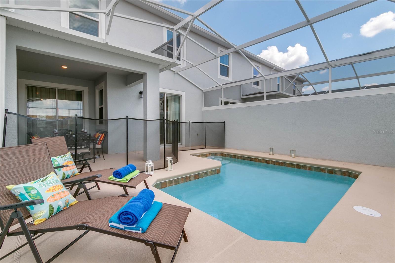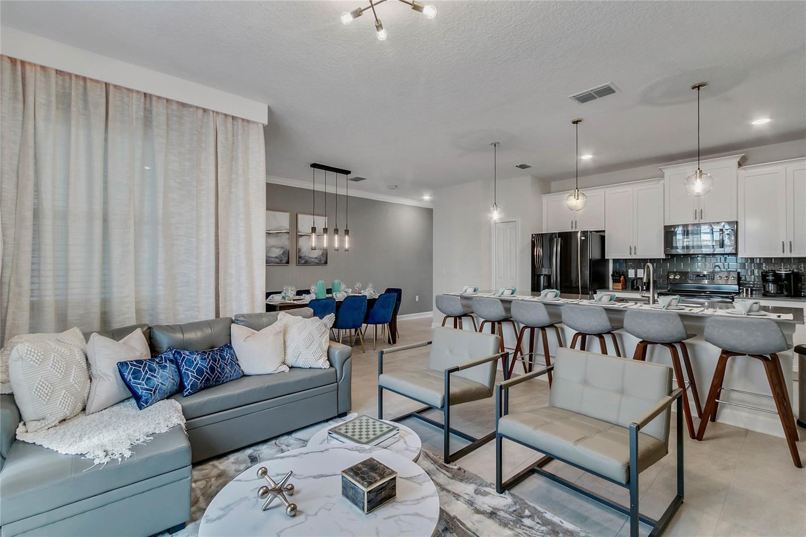 This professionally designed upscale vacation home offers an exceptional investment opportunity in Champions Gate Resort. This stunning furnished four-bedroom, three-bathroom townhome features a private pool, combining luxury, comfort, and convenience. The first floor boasts a spacious living area, perfect for entertaining or unwinding, along with an upgraded kitchen featuring GE Profile appliances and premium cabinetry. Sliding glass doors open to a screened-in patio and private pool, providing a serene outdoor retreat to bask in the Florida sunshine. The well-designed floor plan includes a convenient downstairs bedroom and full bathroom, while the master suite and two additional bedrooms are located upstairs. Residents enjoy access to The Retreat Club, just a short walk away, offering a public pool, water slides, beach volleyball, and a bar. Additionally, the renowned Oasis Clubhouse, one of the best in the greater Orlando area, features a restaurant, bar, fitness center, cinema, game room, and an incredible resort-style pool area complete with a water playground, massive swimming pool, and a relaxing lazy river. Ideally located with easy access to Disney World and Orlando’s top attractions, this home is the perfect choice for vacationers and investors seeking a premier resort-style living experience. Some furniture may have been updated. Room measurements are approximate.