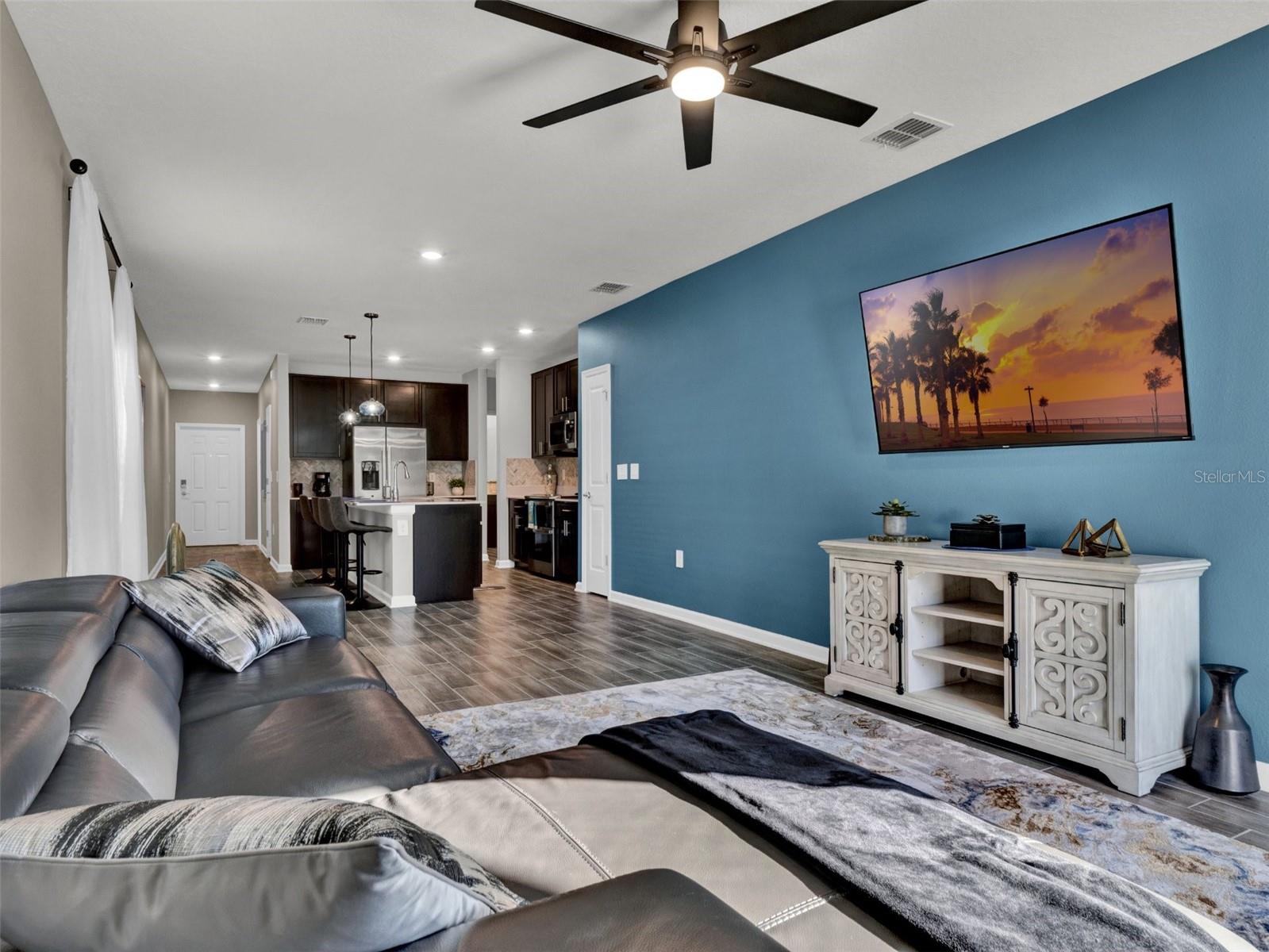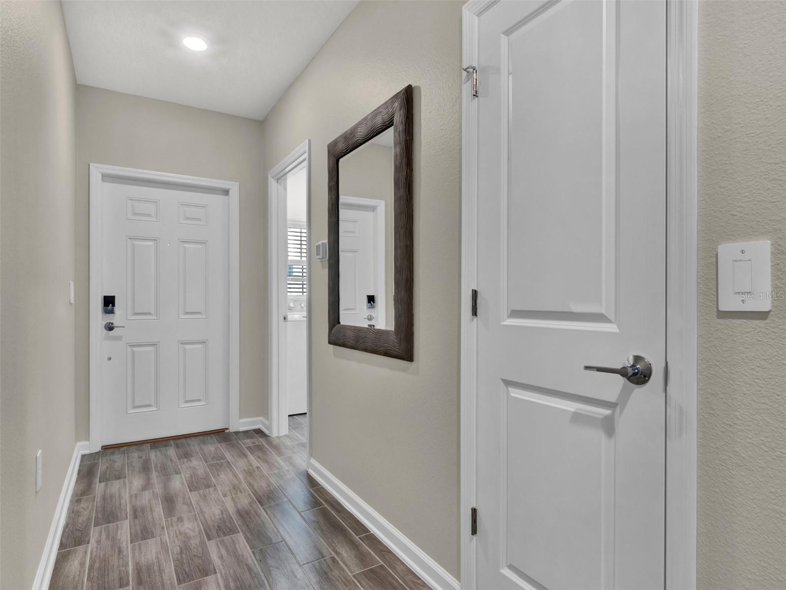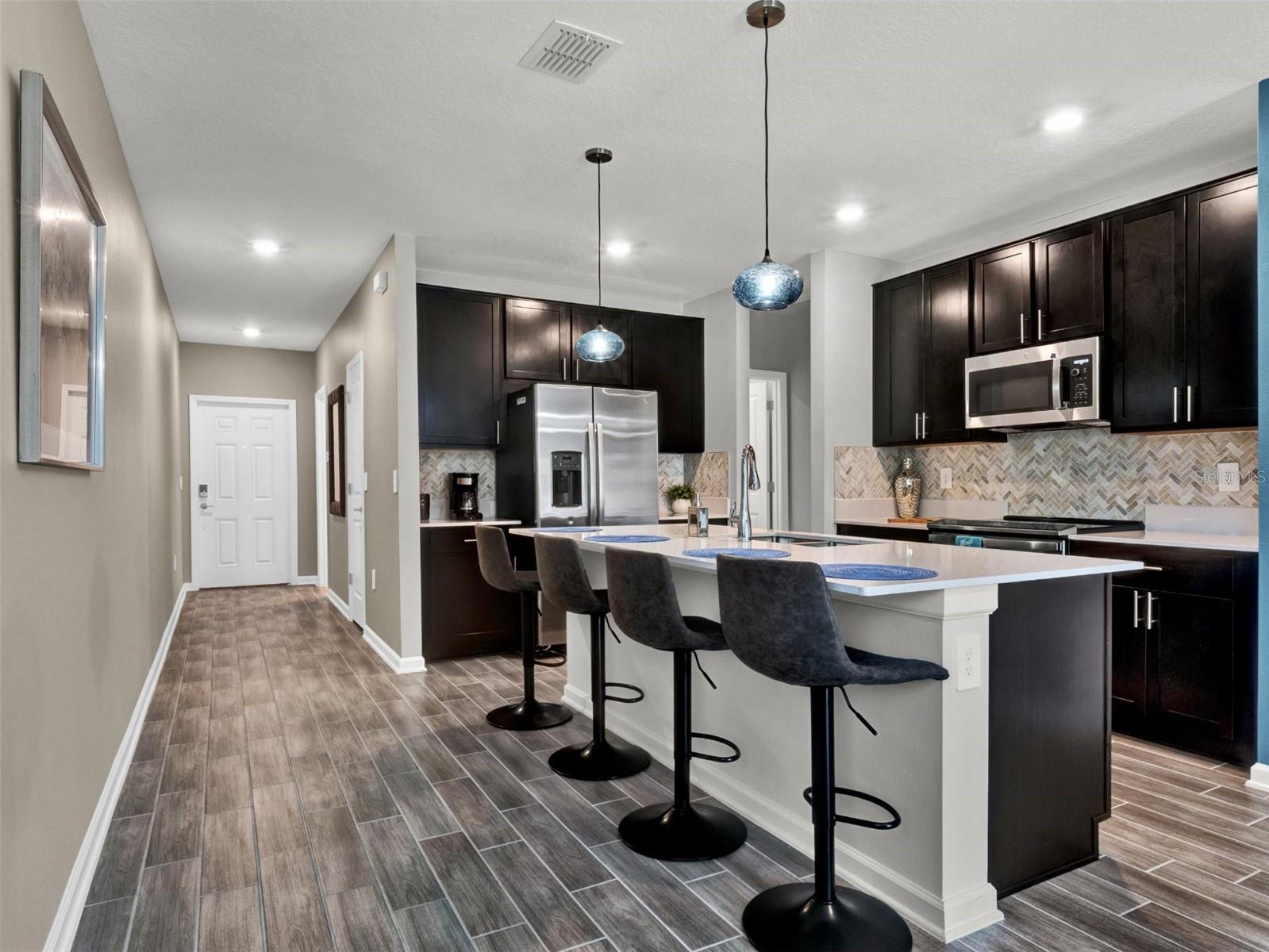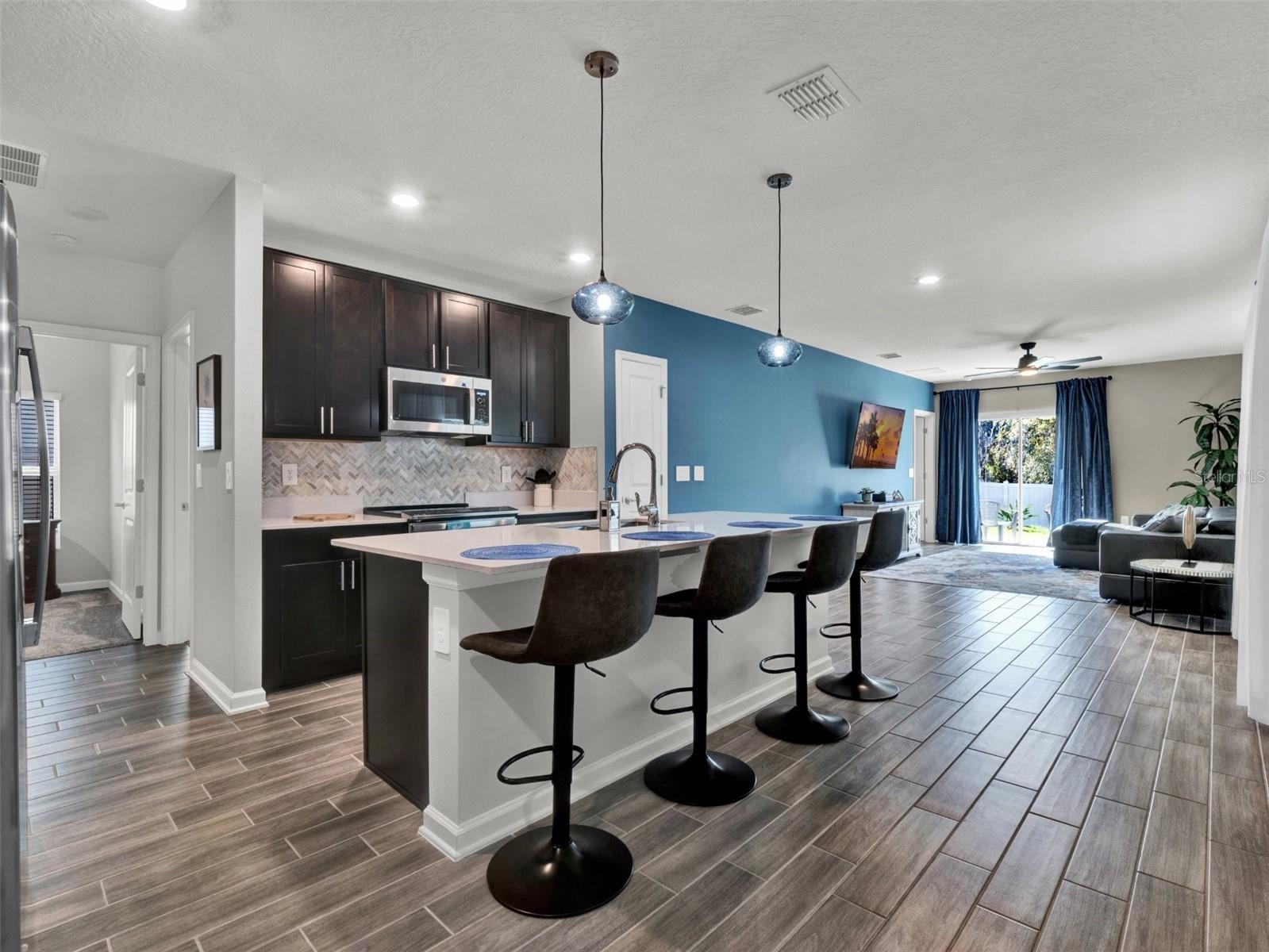 Welcome home to this beautifully designed 3-bedroom, 2-bathroom bungalow, featuring solid block construction and a host of modern upgrades. This property is a rare find with no rear neighbors, ensuring your privacy and tranquility in your own backyard oasis. This eco-friendly home comes equipped with fully paid-off solar panels, significantly reducing your electric bills and making it a smart investment for energy-conscious homeowners. Inside, you’ll appreciate the upgraded tiles and appliances that enhance the home’s appeal. The open-concept layout optimizes living space, seamlessly connecting the kitchen, versatile great room, and dining area. The well-appointed kitchen is a chef’s dream, featuring an island with bar seating, a pantry, and sleek stainless steel appliances—perfect for entertaining or family gatherings. Retreat to the primary bedroom located at the rear of the home for added privacy. This spacious suite boasts an ensuite bathroom with a double vanity and a generous walk-in closet, providing ample storage for all your needs. Additional highlights include quartz countertops, a Ring doorbell camera, upgraded ceiling fans, epoxy garage floors, and a stylish stone backsplash. Enjoy the benefits of an Eco Smart Home, complete with an outdoor in-wall pest control system, eliminating the need for inside treatments. The community offers fantastic amenities, including a pool, cabana, playground, and scenic conservation views, all for low HOA fees! Conveniently located near shopping, dining, and recreational options, you’re just a short drive from Posner Park, Walt Disney World, and I-4. Embrace the vibrant Florida lifestyle in your new home at Horse Creek, where everything you need is at your fingertips. Don’t miss out on this incredible opportunity—schedule your showing today!