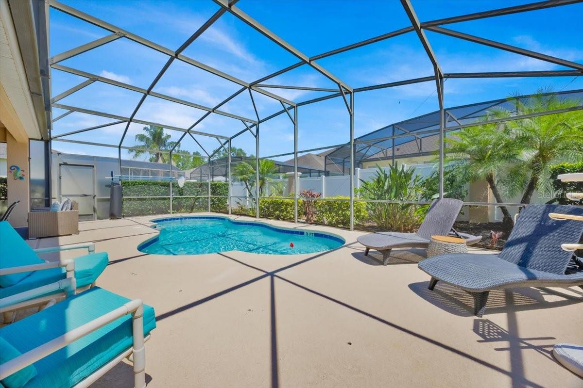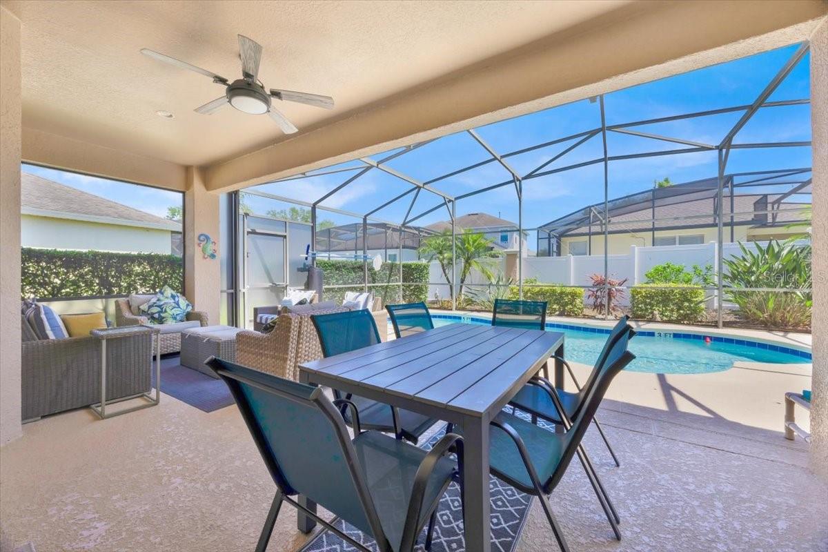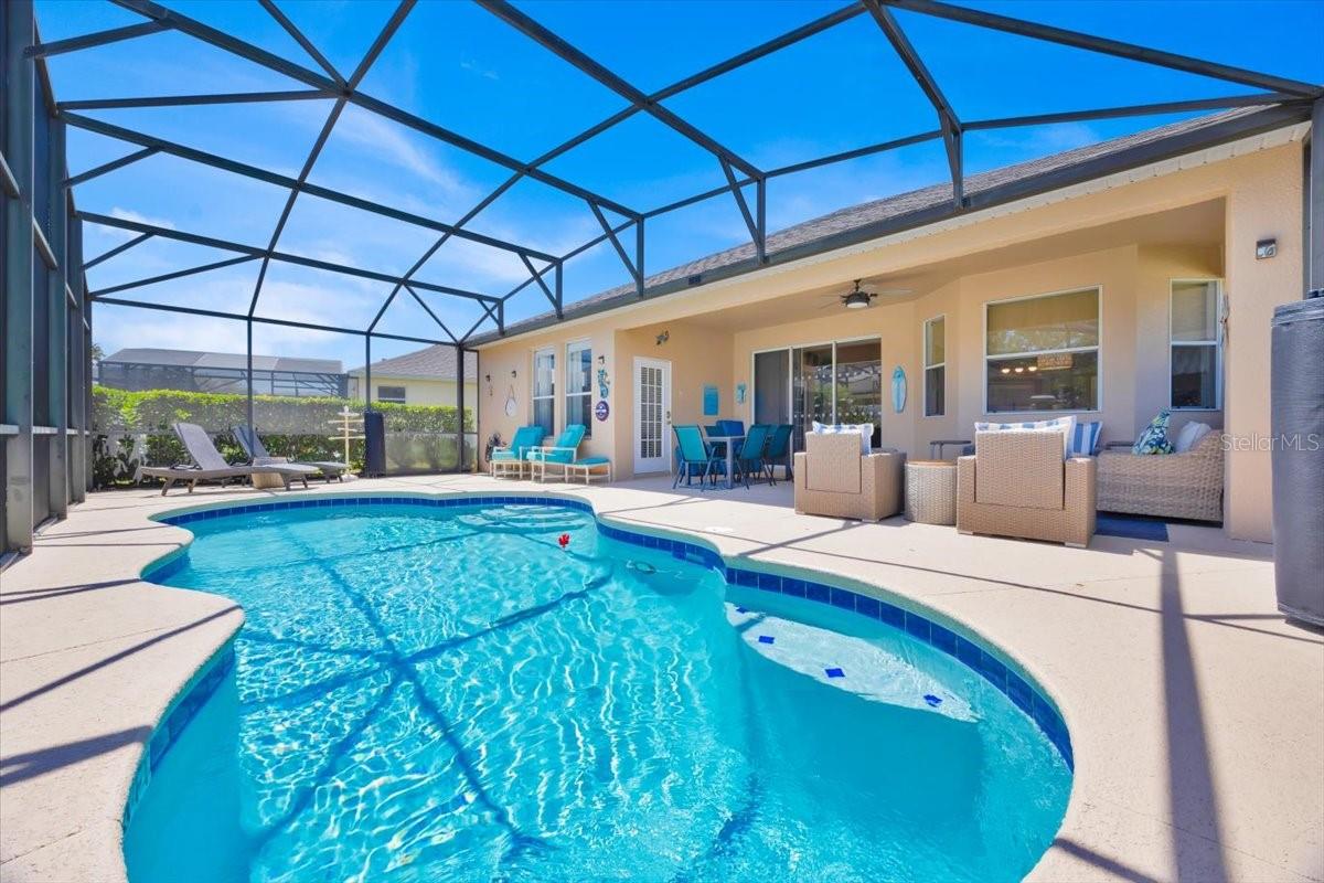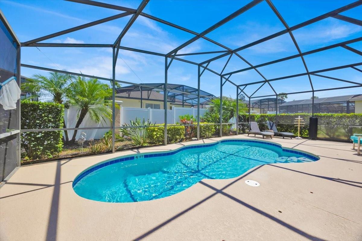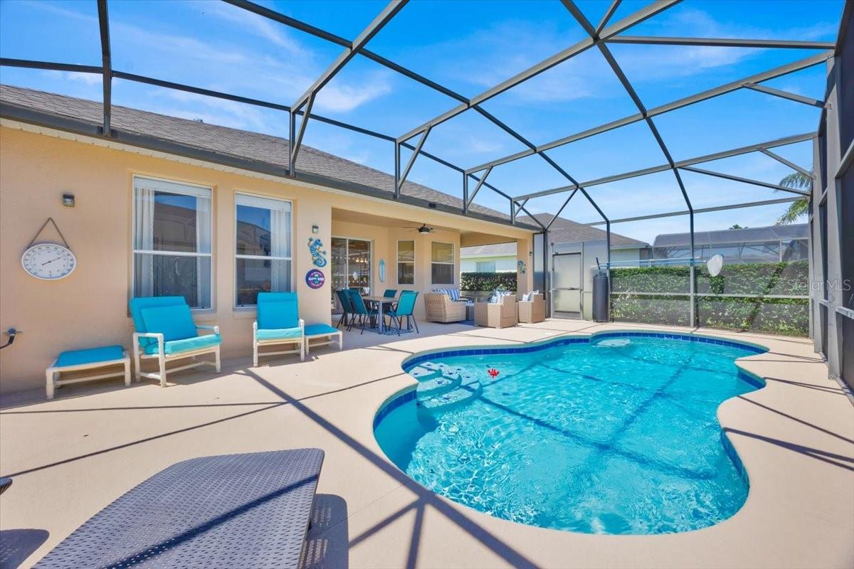 This impressive spacious and airy villa is being utilized as a short-term vacation/investment rental property. It has been upgraded to an Exceptionally High Standard by its owners. This beautiful property boasts three good-sized bedrooms and two upgraded baths. It provides a comfortable living space and well-equipped kitchen/breakfast area with upgraded granite worktops and window blinds. There is also a formal dining area which leads off to a fully equipped laundry room housing new washer and dryer. This leads off into the two-car garage being utilized as a games room. This 1,700-square-foot pool home could be equally utilized as a nice family residence also! The property's spacious bedrooms have been fitted with laminate hard surface flooring. Two of the well-presented bedrooms are fitted with plantation shutter blinds, fitted closets and share a fully updated bath with attractively tiled walk-in shower with modern glass frameless sliding doors. Each of the bedrooms all have flat screen TVs including a 70-inch in the lounge and a 60-inch in the beautifully furnished main bedroom which houses an attractive king-size bed and has upgraded window blinds with complementing window treatments. There is a door off the main bedroom which leads directly out onto the sparkling blue pool and decking area, set up for outdoor living under a covered lanai, which overlooks the pretty landscaped garden area just beyond the fully screened pool cage. The main bedroom has two walk-in closets, separate toilet, walk-in shower and corner tub. The property is conveniently situated and provides an easy commute to local theme park attractions, shopping and either east or west coastlines, accessible by the surrounding newly developed road networks!