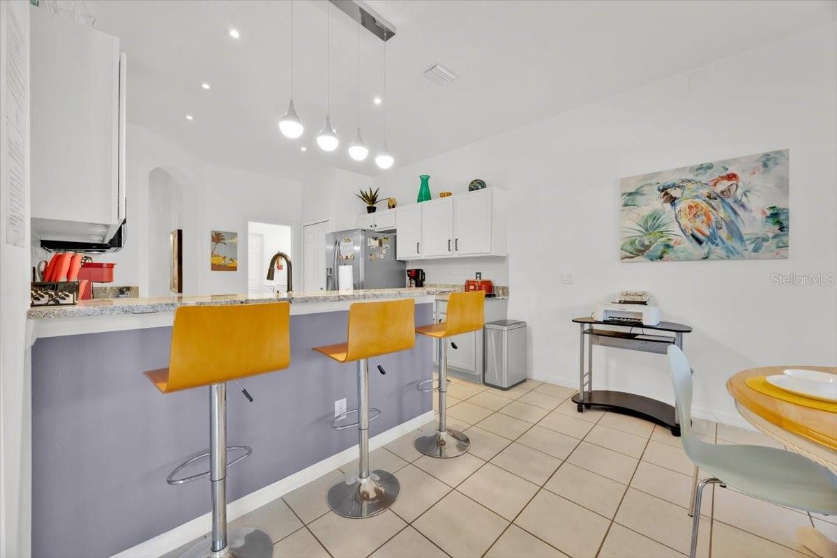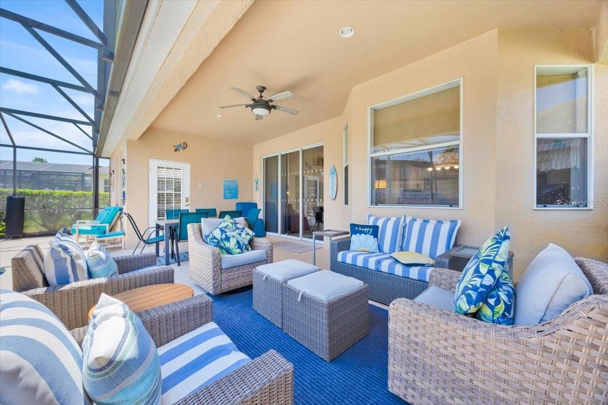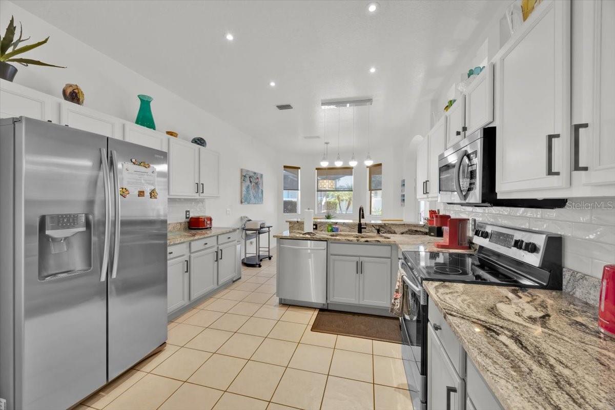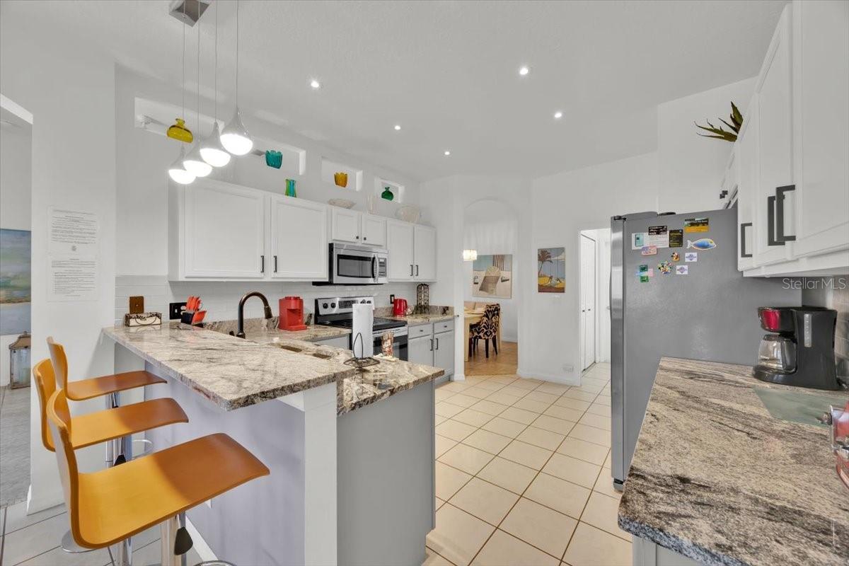 This impressive spacious and airy villa is being utilized as a short-term vacation/investment rental property. It has been upgraded to an Exceptionally High Standard by its owners. This beautiful property boasts three good-sized bedrooms and two upgraded baths. It provides a comfortable living space and well-equipped kitchen/breakfast area with upgraded granite worktops and window blinds. There is also a formal dining area which leads off to a fully equipped laundry room housing new washer and dryer. This leads off into the two-car garage being utilized as a games room. This 1,700-square-foot pool home could be equally utilized as a nice family residence also! The property's spacious bedrooms have been fitted with laminate hard surface flooring. Two of the well-presented bedrooms are fitted with plantation shutter blinds, fitted closets and share a fully updated bath with attractively tiled walk-in shower with modern glass frameless sliding doors. Each of the bedrooms all have flat screen TVs including a 70-inch in the lounge and a 60-inch in the beautifully furnished main bedroom which houses an attractive king-size bed and has upgraded window blinds with complementing window treatments. There is a door off the main bedroom which leads directly out onto the sparkling blue pool and decking area, set up for outdoor living under a covered lanai, which overlooks the pretty landscaped garden area just beyond the fully screened pool cage. The main bedroom has two walk-in closets, separate toilet, walk-in shower and corner tub. The property is conveniently situated and provides an easy commute to local theme park attractions, shopping and either east or west coastlines, accessible by the surrounding newly developed road networks!