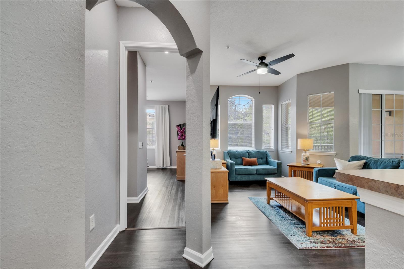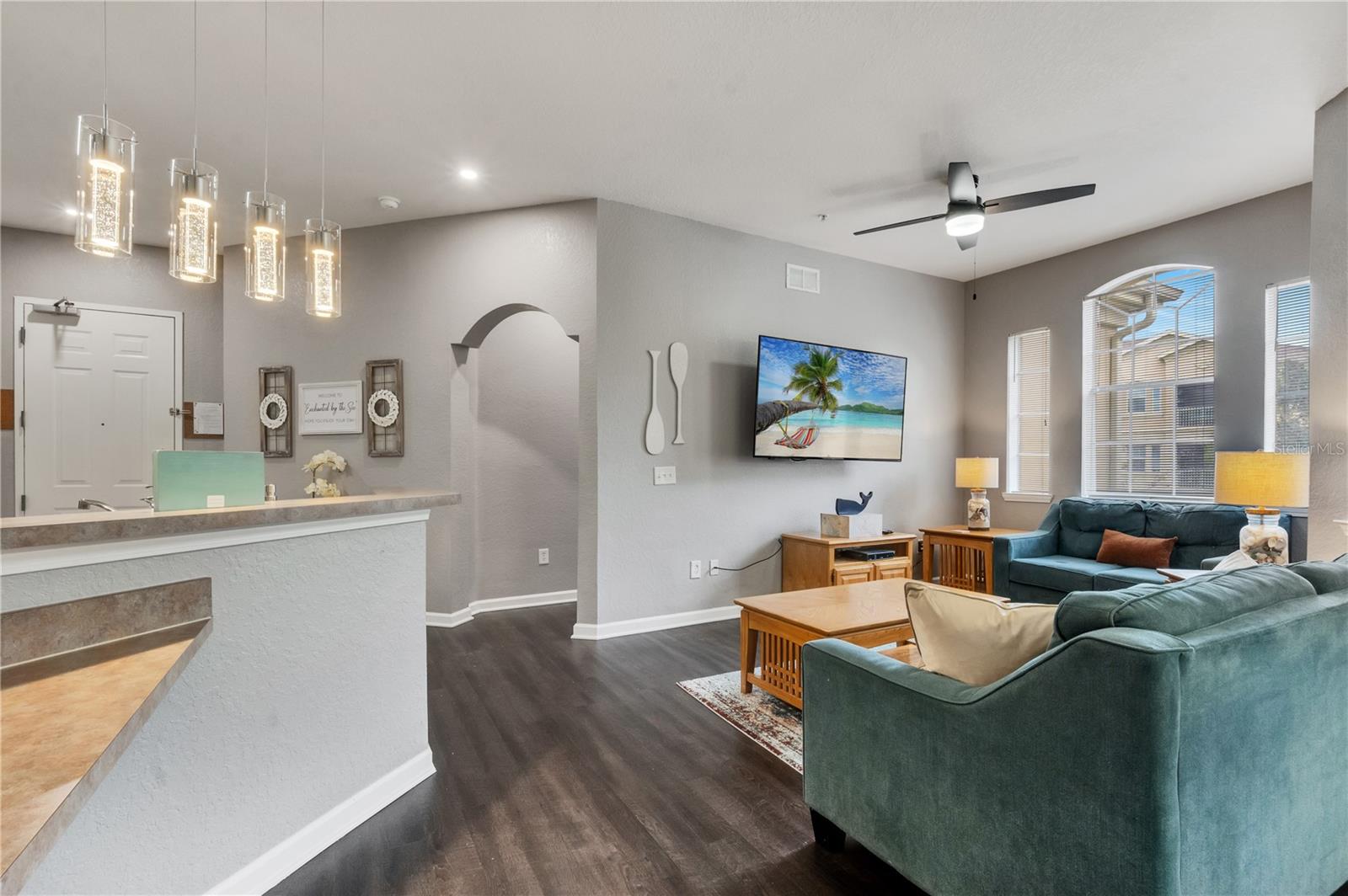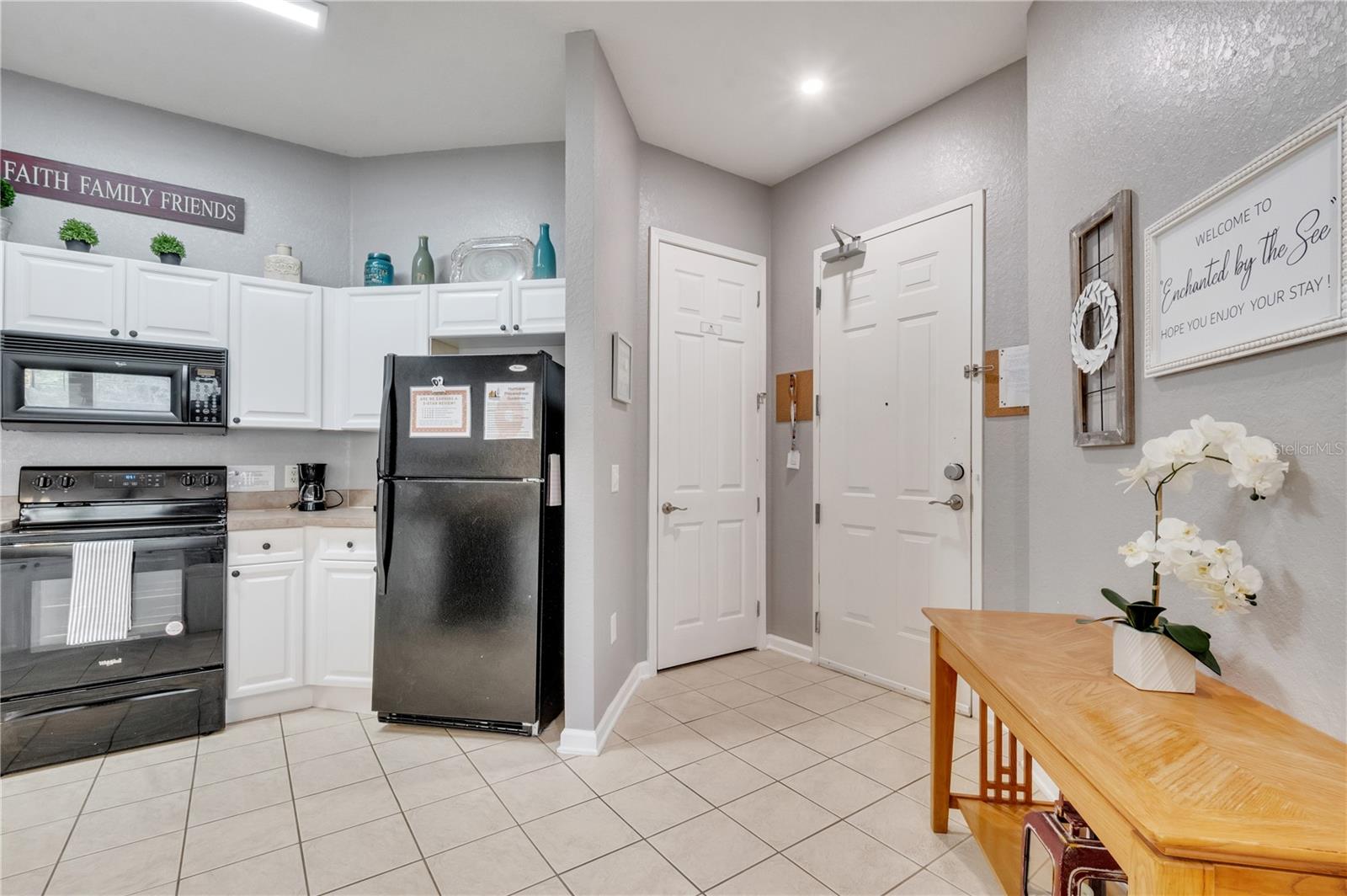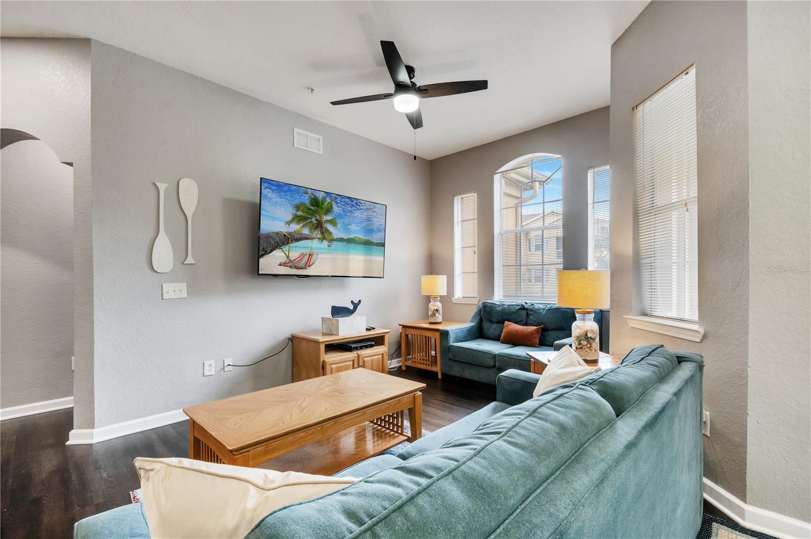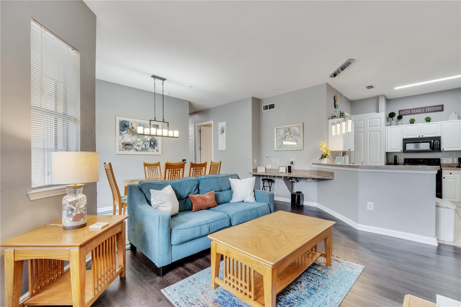 This UPGRADED AND FURNISH Condo at Terrace Ridge At Town Center, a GATED COMMUNITY. THE HOA FEE INCLUDED CABLE, INTERNET, VALET TRASH SEVICE, WATER, PEST CONTROL building insurance and grounds maintenance.NEW ROOF 2024 Close to shopping, Walt Disney World, Reunion, Champions Gate, and easy access to major freeways makes this a desired area to live and enjoy the Central Florida Lifestyle. This lovely 4 bedroom, 2 bath, CORNER UNIT, is on the TOP FLOOR, with access via stairs, lets in extra light and great views. The OPEN-CONCEPT Living area is inviting and bright with many windows,HIGH CEILINGS, built-in desk and beautiful LAMINATE FLOOR THROUGHOUT. The Kitchen has a Breakfast Bar, upgraded cabinets and CUSTON LIGHTING. Relax on your SCREAM BALCONY over looking the nature and mature trees. This SPLIT FLOOR PLAN unit has spacious bedrooms and dual sinks in the guest and master bathrooms to provide more than ample space for those extra guests. The GARDEN TUB in the Guest Bathroom will be a welcome place to soak after a long day at the theme parks! Relax at your community pool with close proximity to unit. Additional amenities include a clubhouse, fitness center and game room. THIS UNIT HAS A STORAGE ROOM.