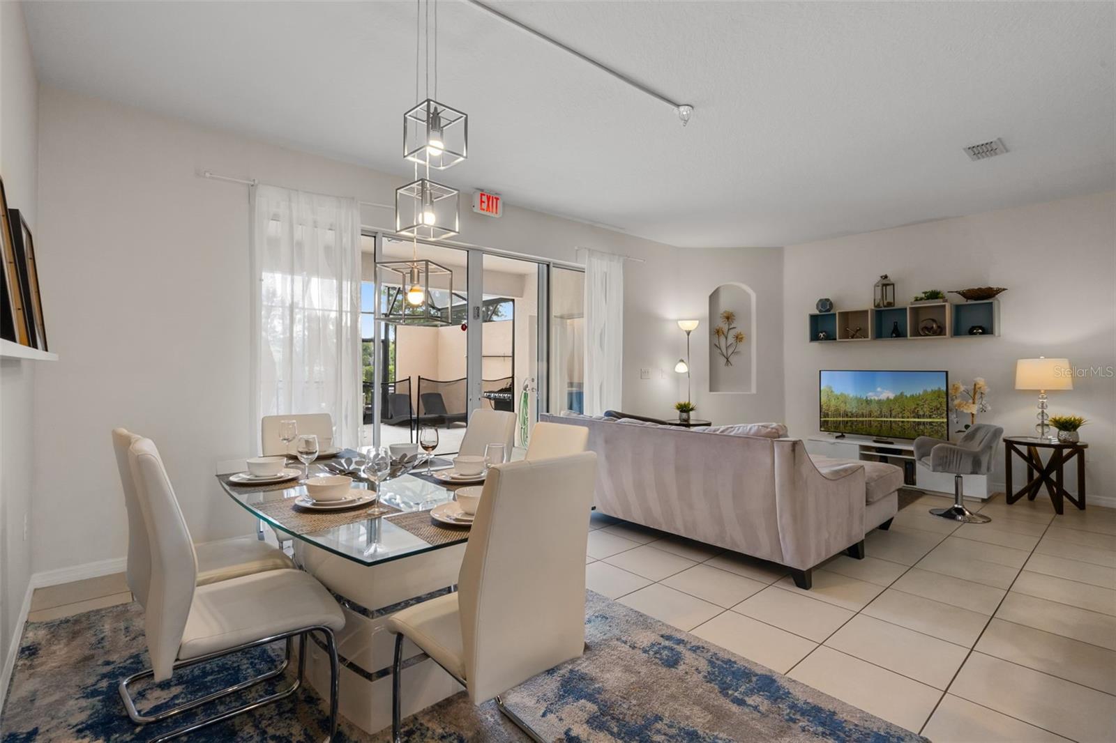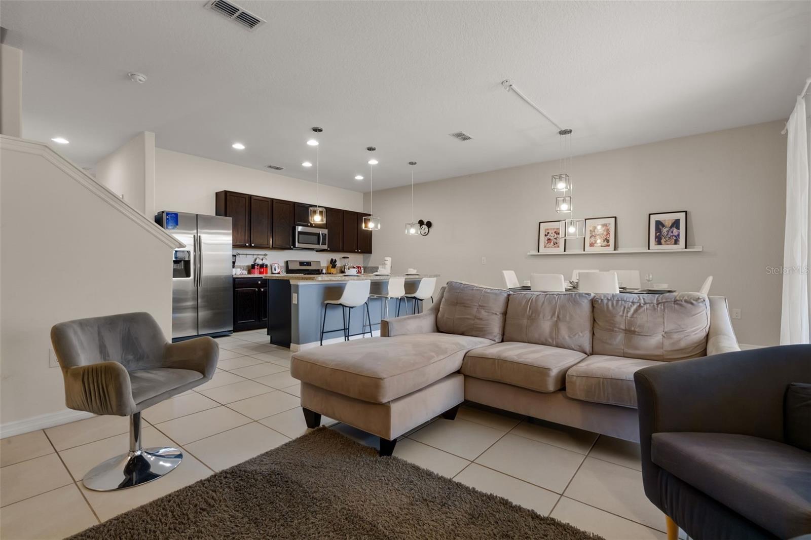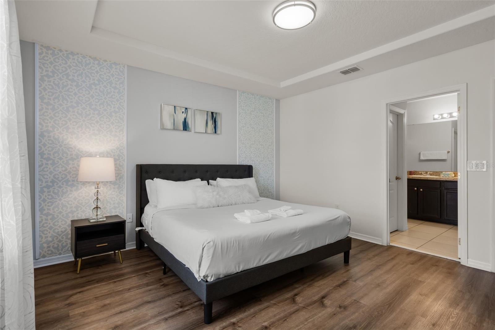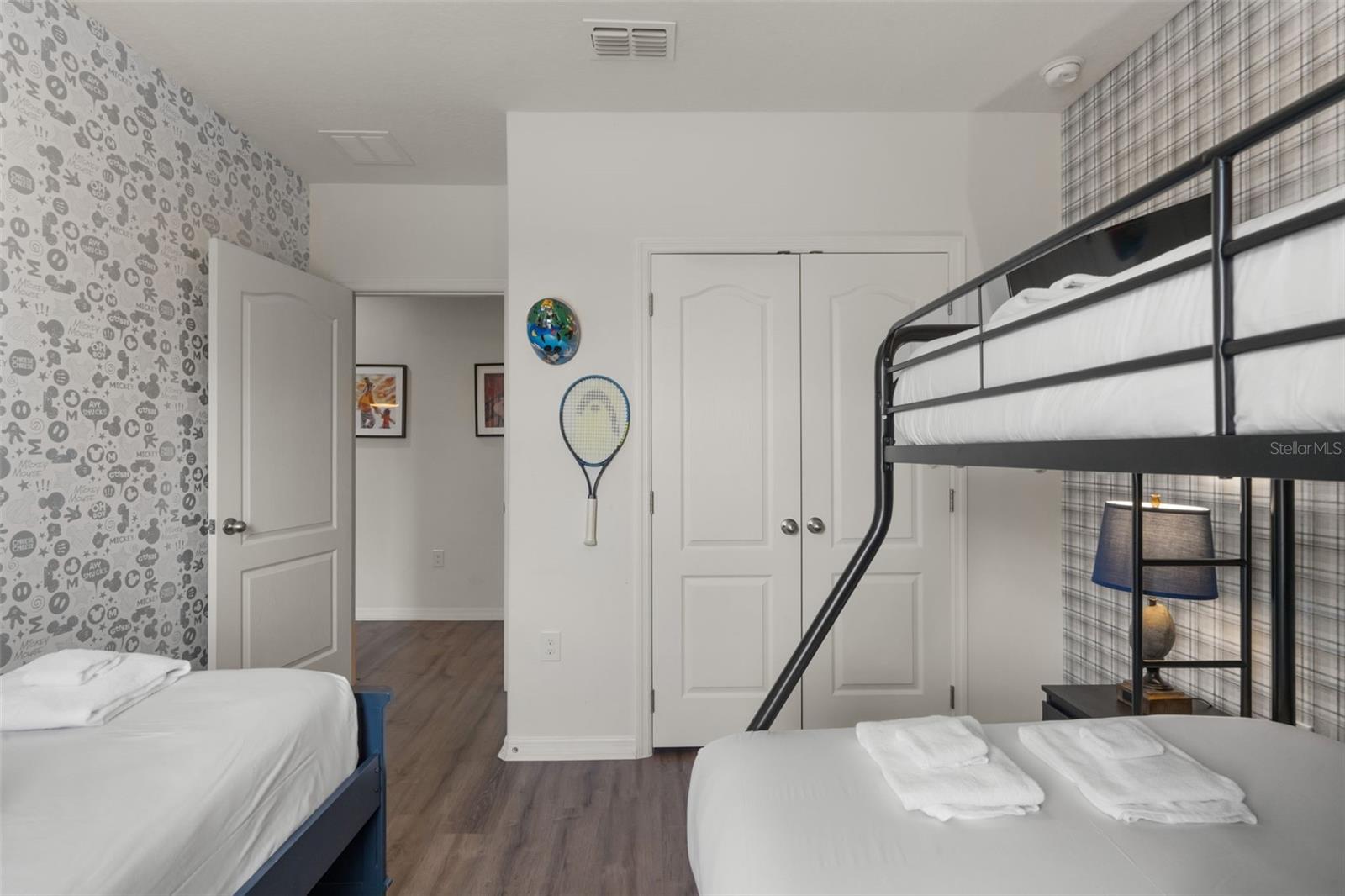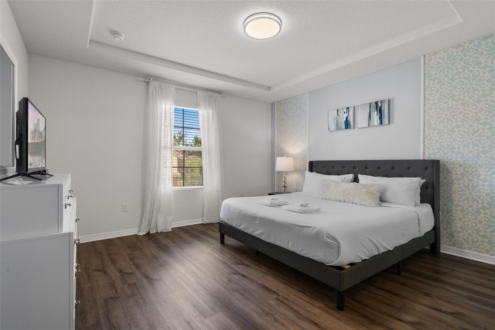 FULLY FURNISHED POOL HOME WITH CHARACTER! This Solterra Resort home provides the perfect escape as a vacation home, investment property, or personal residence, and is walking distance to the WORLD-CLASS AMENITY CENTER! Updated with LAMINATE FLOORING and HIGH-END DESIGN features that bring home the Disney magic. Stepping inside the open floorplan living space, you have a large kitchen equipped with stainless steel appliances, huge island with breakfast bar seating, and spacious formal dining space large enough for all guests. The living space also features a huge four-panel sliding glass door that seamlessly connects the outdoor living space, perfect for entertaining by the pool! Also downstairs is a convenient and private full bedroom and bathroom with walk-in tiled shower. Upstairs, you have three more bedrooms, including the primary bedroom featuring a large walk-in closet, double sink vanity, and walk-in shower. The guest bedrooms provide a touch of character with MICKEY MOUSE AND DISNEY SPORTS THEMING – sure to delight guests of all ages! They share an additional full bathroom with double sink vanity and tub. Stepping outside, you have your own SCREENED-IN, HEATED POOL along with tons of space to lounge and enjoy the beautiful Florida weather. There is a covered section when you need to beat the heat, an area to grill, and an outside half bathroom accessible from the patio – no more tracking water inside! Better yet, this townhome has NO REAR NEIGHBORS, providing a private and serene outdoor atmosphere. The gated Solterra Resort features a dazzling amenity center with resort pool, WATERSLIDE, LAZY RIVER, hot tub, cabana rentals, RESTAURANT & BAR, fitness center, playground, tennis court, pickleball, sand volleyball, and MORE! The HOA also includes exterior landscaping, daily trash pickup, and internet. Location is prime with easy access to Walt Disney World, Universal Orlando Resort (and the new UNIVERSAL'S EPIC UNIVERSE), SeaWorld Orlando, I-4, Orlando International Airport, and more local shopping, dining, and entertainment destinations. Don’t wait to invest, make this home your next Florida oasis!