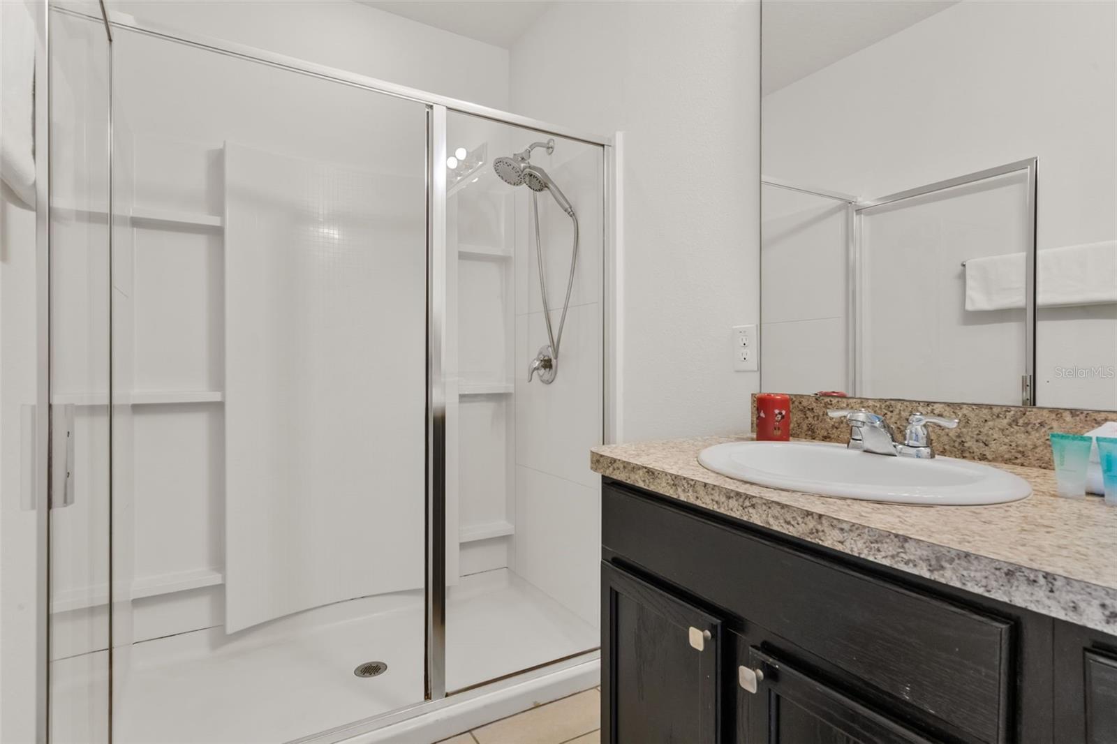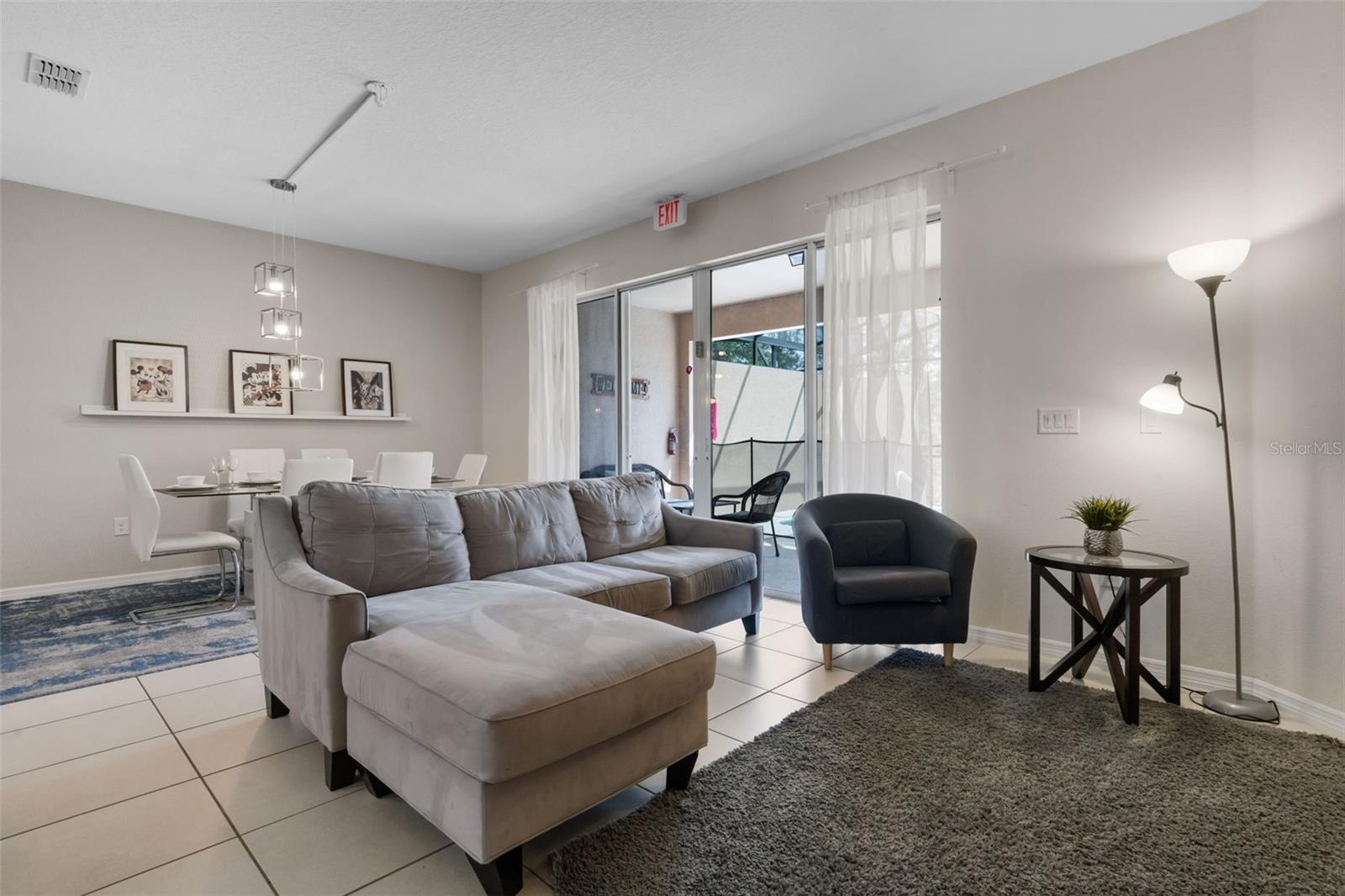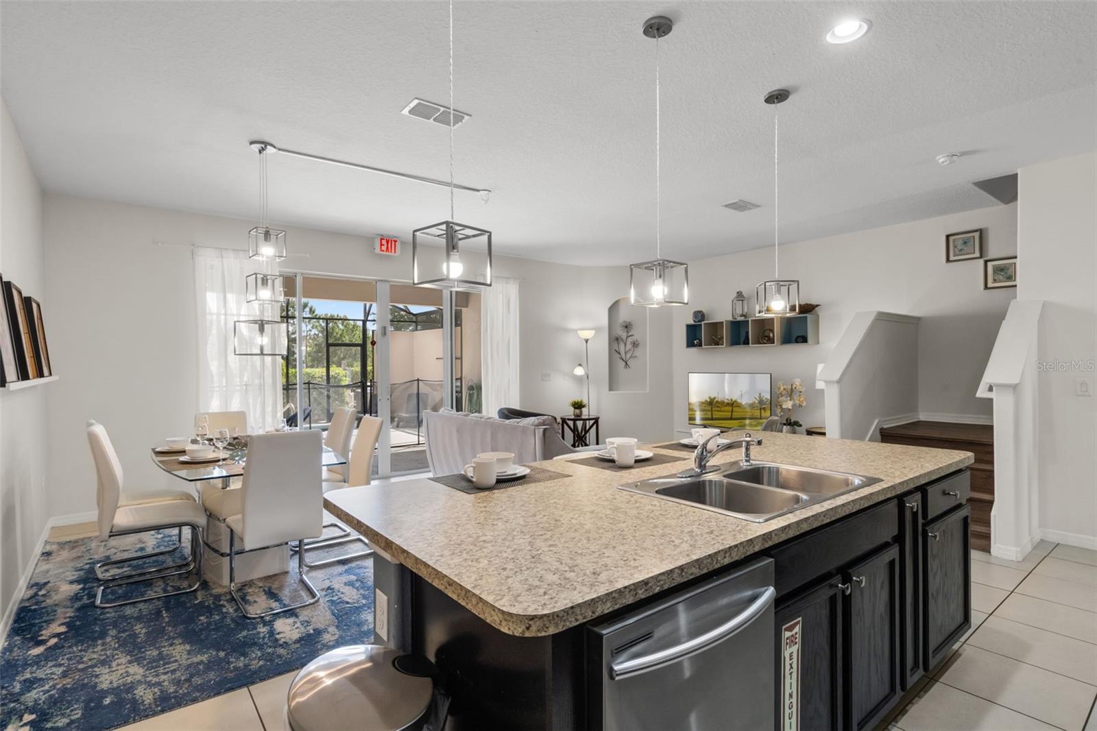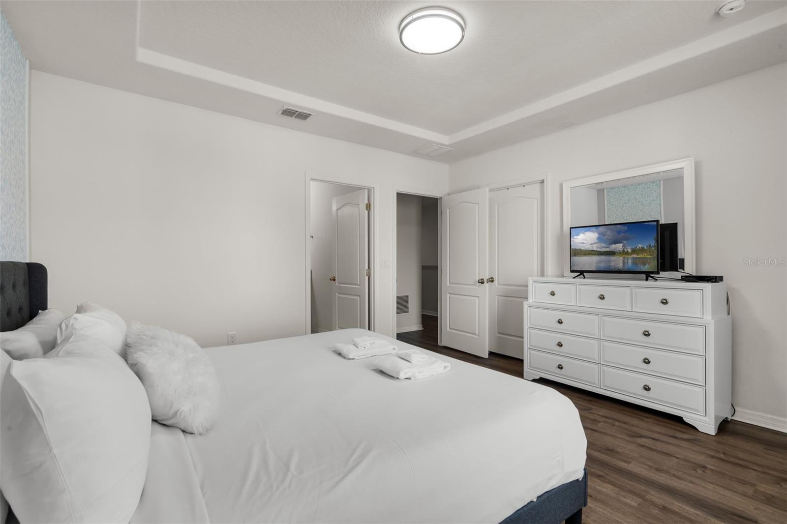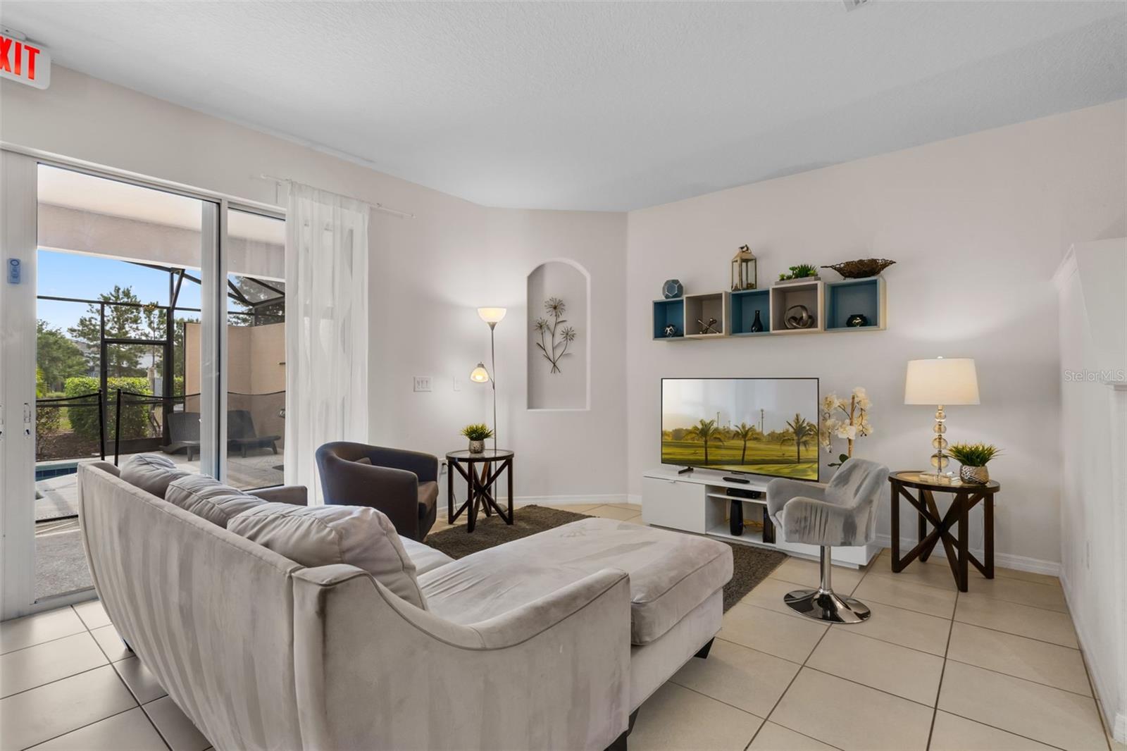 FULLY FURNISHED POOL HOME WITH CHARACTER! This Solterra Resort home provides the perfect escape as a vacation home, investment property, or personal residence, and is walking distance to the WORLD-CLASS AMENITY CENTER! Updated with LAMINATE FLOORING and HIGH-END DESIGN features that bring home the Disney magic. Stepping inside the open floorplan living space, you have a large kitchen equipped with stainless steel appliances, huge island with breakfast bar seating, and spacious formal dining space large enough for all guests. The living space also features a huge four-panel sliding glass door that seamlessly connects the outdoor living space, perfect for entertaining by the pool! Also downstairs is a convenient and private full bedroom and bathroom with walk-in tiled shower. Upstairs, you have three more bedrooms, including the primary bedroom featuring a large walk-in closet, double sink vanity, and walk-in shower. The guest bedrooms provide a touch of character with MICKEY MOUSE AND DISNEY SPORTS THEMING – sure to delight guests of all ages! They share an additional full bathroom with double sink vanity and tub. Stepping outside, you have your own SCREENED-IN, HEATED POOL along with tons of space to lounge and enjoy the beautiful Florida weather. There is a covered section when you need to beat the heat, an area to grill, and an outside half bathroom accessible from the patio – no more tracking water inside! Better yet, this townhome has NO REAR NEIGHBORS, providing a private and serene outdoor atmosphere. The gated Solterra Resort features a dazzling amenity center with resort pool, WATERSLIDE, LAZY RIVER, hot tub, cabana rentals, RESTAURANT & BAR, fitness center, playground, tennis court, pickleball, sand volleyball, and MORE! The HOA also includes exterior landscaping, daily trash pickup, and internet. Location is prime with easy access to Walt Disney World, Universal Orlando Resort (and the new UNIVERSAL'S EPIC UNIVERSE), SeaWorld Orlando, I-4, Orlando International Airport, and more local shopping, dining, and entertainment destinations. Don’t wait to invest, make this home your next Florida oasis!