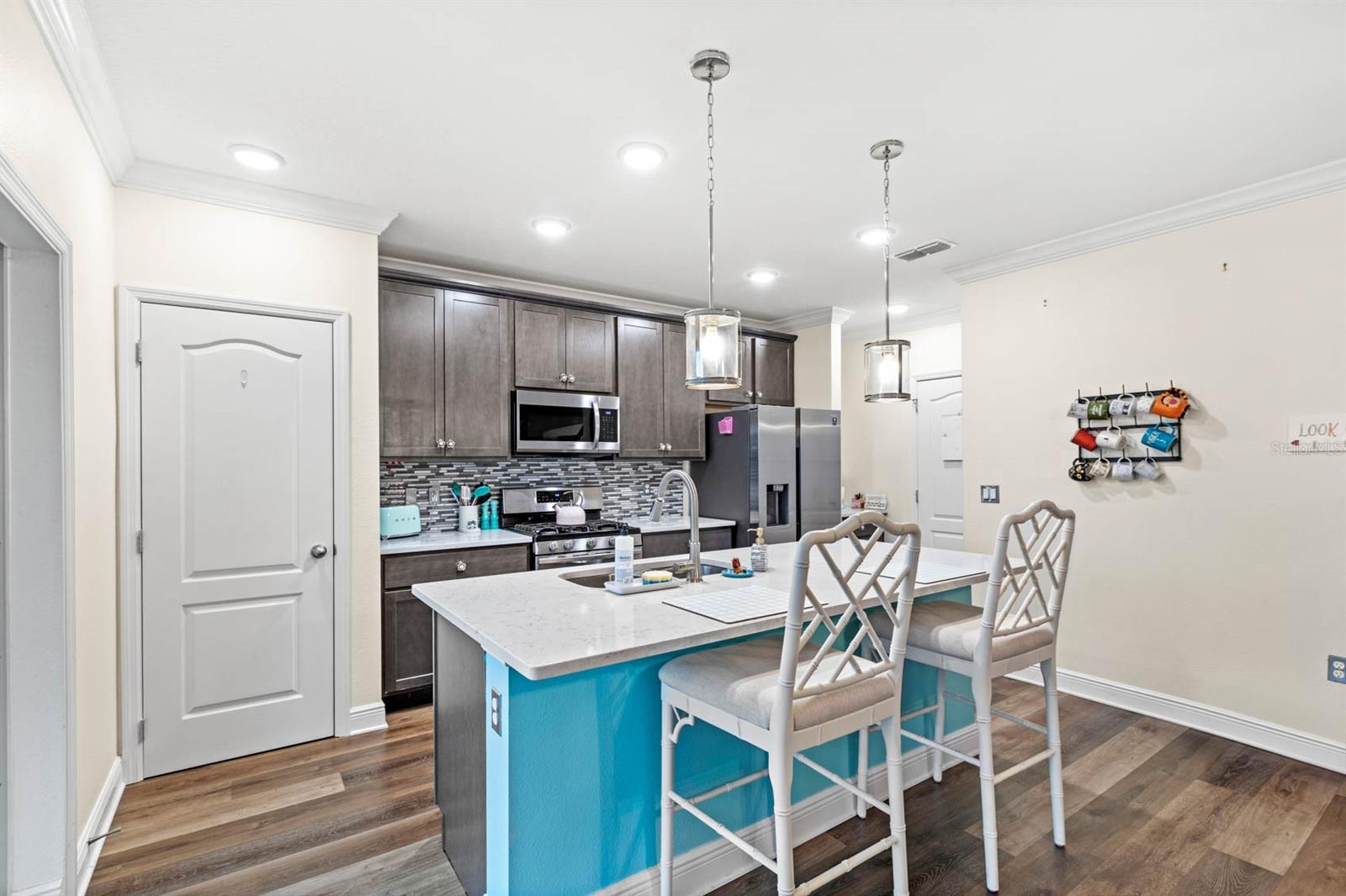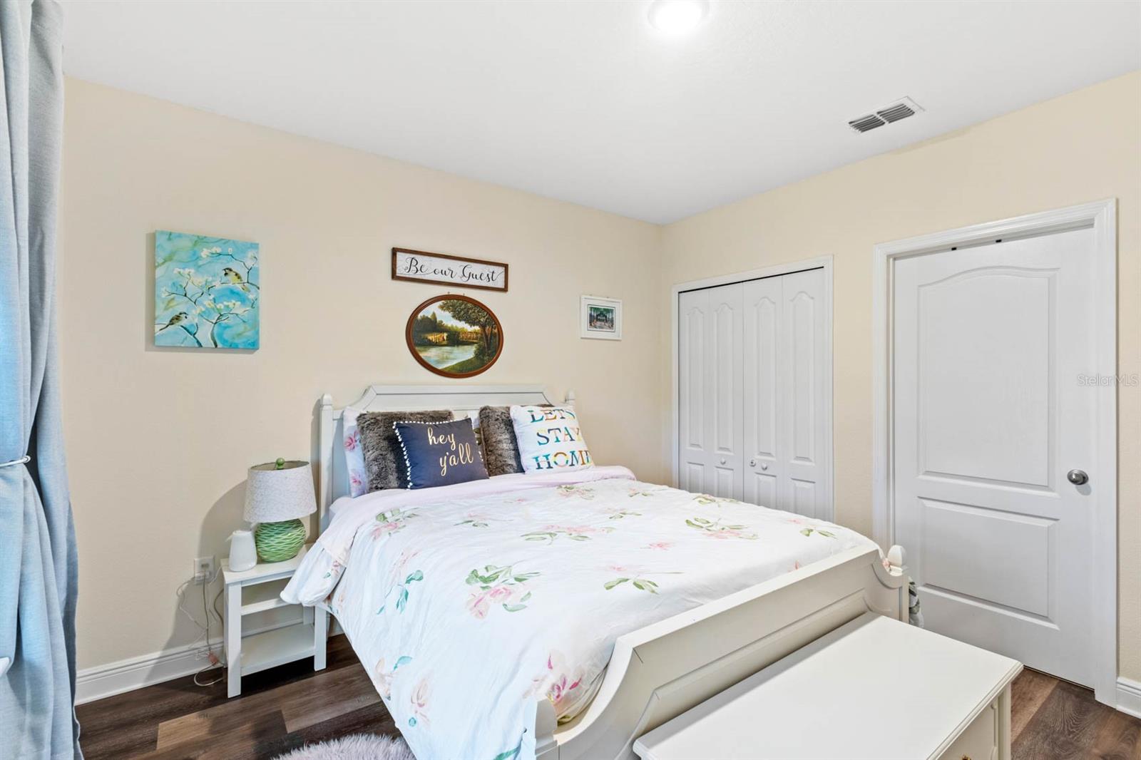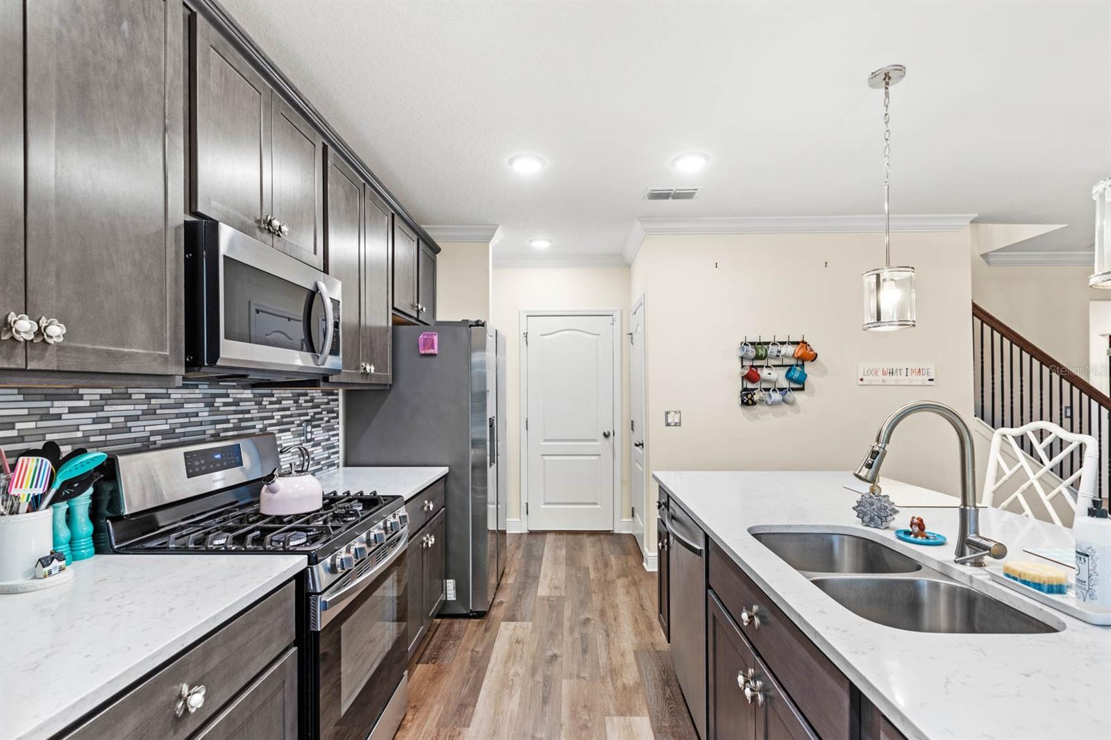Welcome to Your Dream Home in Solterra Springs! Discover resort-style living with residential peace of mind in the highly sought-after gated community of Solterra Springs. This stunning, newer 5-bedroom, 3-full-bath home offers an abundance of modern upgrades and luxurious features, making it the perfect haven for relaxation, entertainment and very Family friendly. Key Features Include: Luxury Vinyl Plank Flooring throughout for durability and style, Crown Molding that adds a touch of elegance, Stainless Steel Appliances and Quartz Countertops in the kitchen, Custom Primary Closet, Extended Screened-In Coastal Lanai for year-round outdoor enjoyment, Strada Home Security System for added peace of mind. The layout boasts large bedrooms, including a first-floor ensuite for convenience and a primary suite upstairs for ultimate privacy. The backyard is an oasis with water views, breathtaking sunsets, and a large fenced-in yard, perfect for relaxation or entertaining. Room for your DREAM POOL in this yard! Community Amenities You'll Love: Resort-style pool and lazy river, fully equipped gym, Sand volleyball court, Two playgrounds, a brand-new meeting center. This home truly has it all, blending luxurious living with the comforts of a welcoming community. Don’t miss your chance to make this exceptional property your own. Schedule your private showing today!
