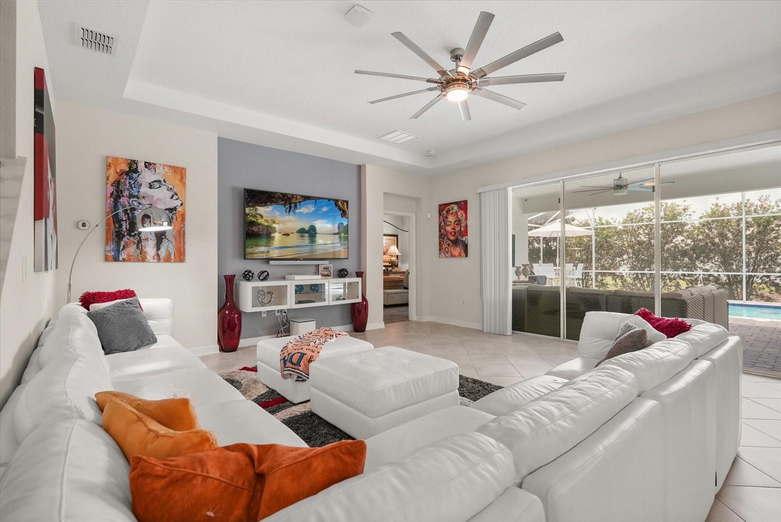 Lifestyle, location and luxury are waiting for you! This amazing grand 3,317 sq. ft two story pool home includes 4 bedrooms / 3.5 bathrooms and a coveted 3 car garage. The large, heated saltwater pool surrounded by a large enclosed lanai is your Florida living oasis, a big selling point for this house. The kitchen overlooks a combined cafe and family room leading to a covered patio. The master suite is conveniently located on the first floor. Enjoy extra space and privacy away from the other bedrooms located upstairs. The house sits on a quiet cul de sac with minimal traffic. The large, open kitchen feature 42” maple cabinetry, quartz countertops in both kitchen and bathrooms, stainless steel appliances, state of the art security system, faux-wood blinds and more. The amenities are fantastic! Enjoy the resort style pool, spa, tennis, basketball, pickle ball, golf, fitness center, on site concierge, and much more. CHAMPIONS GATE RESORT ORLANDO OASIS CLUB CLUBHOUSE AND WATER-PARK includes a refreshing Lazy River, Water-slides, Swim-Up Bar, Water Falls, Beach Entry, Spa, Splash Pad, Grill, Bar, Fitness Area, Theatre, Games Room, Tiki Bar and Cabanas. Monthly HOA includes cable TV & WIFI, your yard's landscaping, and a $75 monthly credit to use at the Plaza Restaurant! Luxury, lifestyle, and an amazing location close to stores, restaurants, the theme parks and a reasonable drive to Orlando International Airport make this a must see house. Schedule your private tour today!