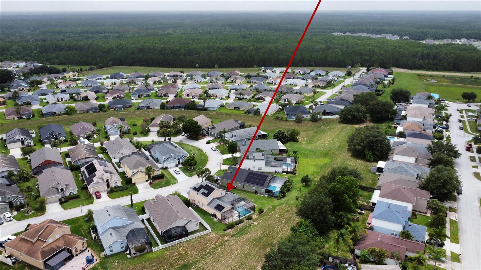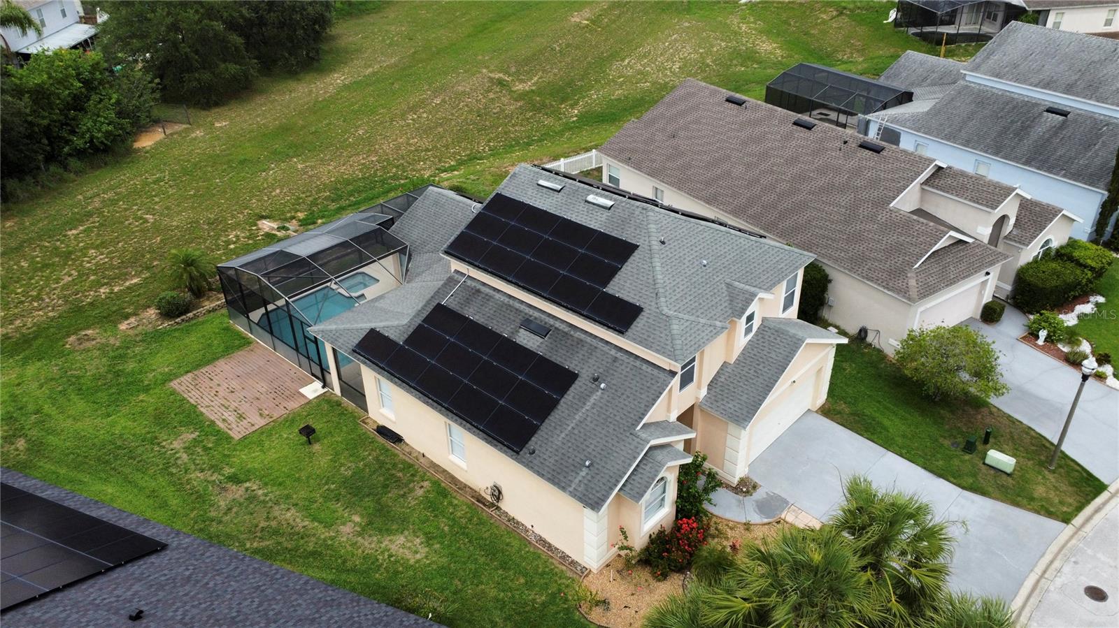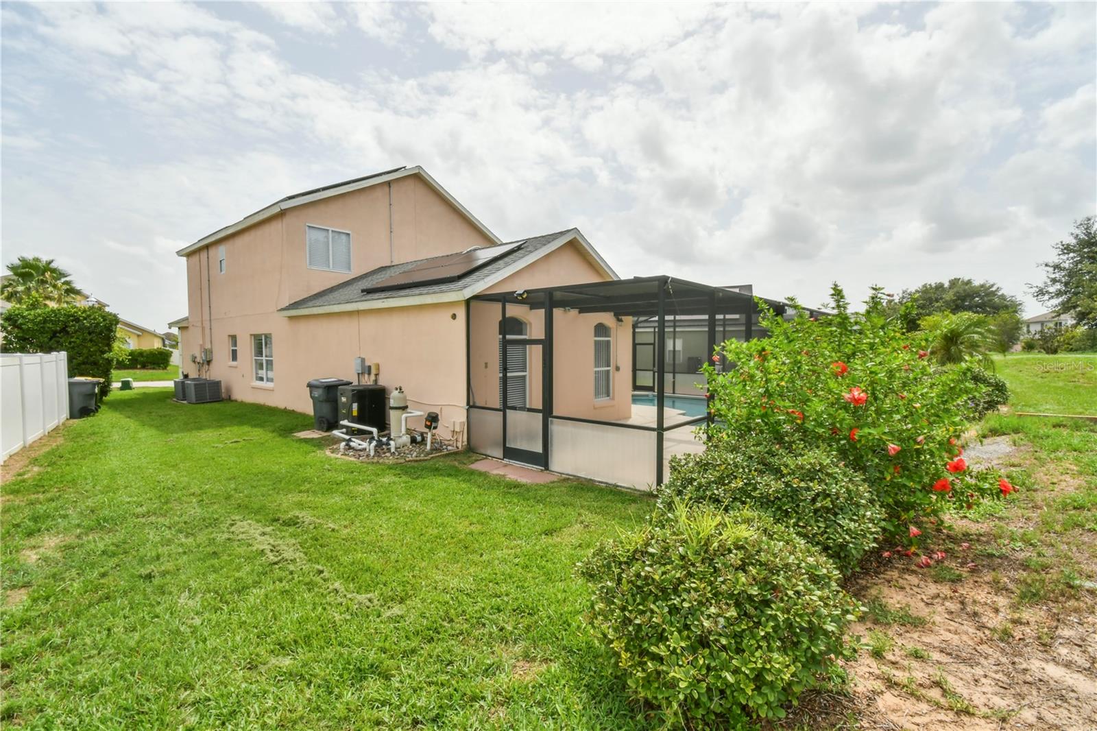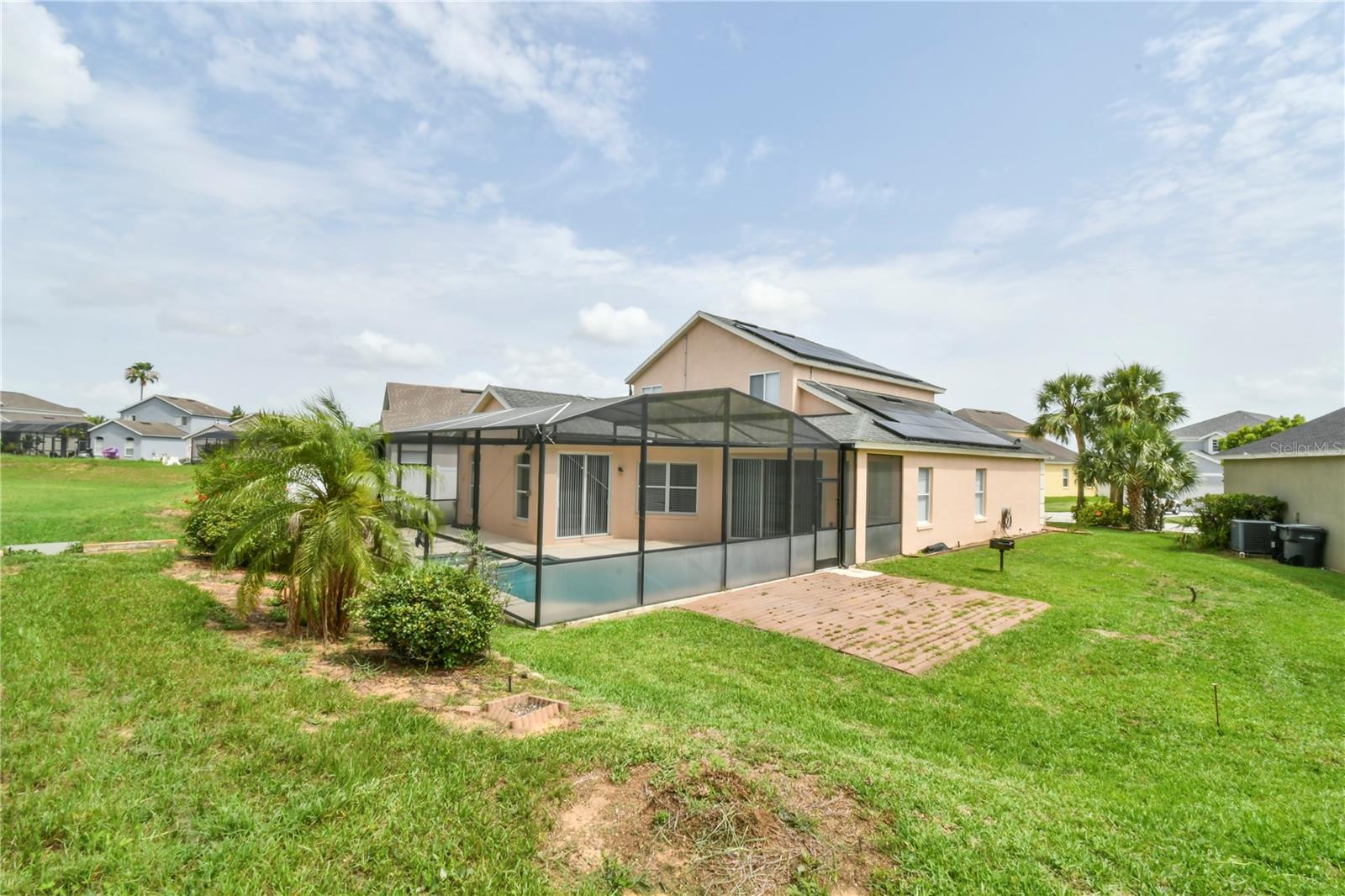 Welcome to this spacious 5 bedroom, 3.5 bathroom pool home located in the desirable Tuscan Ridge community in the Davenport area, just minutes from Disney and Championsgate. This beautifully maintained residence features an open floor plan with the master bedroom conveniently located on the first floor. All bedrooms boast brand new laminate flooring, while the updated kitchen and bathrooms are finished with elegant granite countertops and durable ceramic tile. The home is equipped with solar panels that will be fully paid off by the seller at closing, providing significant savings on electric bills. Step outside to enjoy the screened-in heated pool and spa, offering the perfect space for relaxation and entertaining year-round. Whether you're looking for a primary residence, vacation home, or investment property, this home checks all the boxes in both style and location.