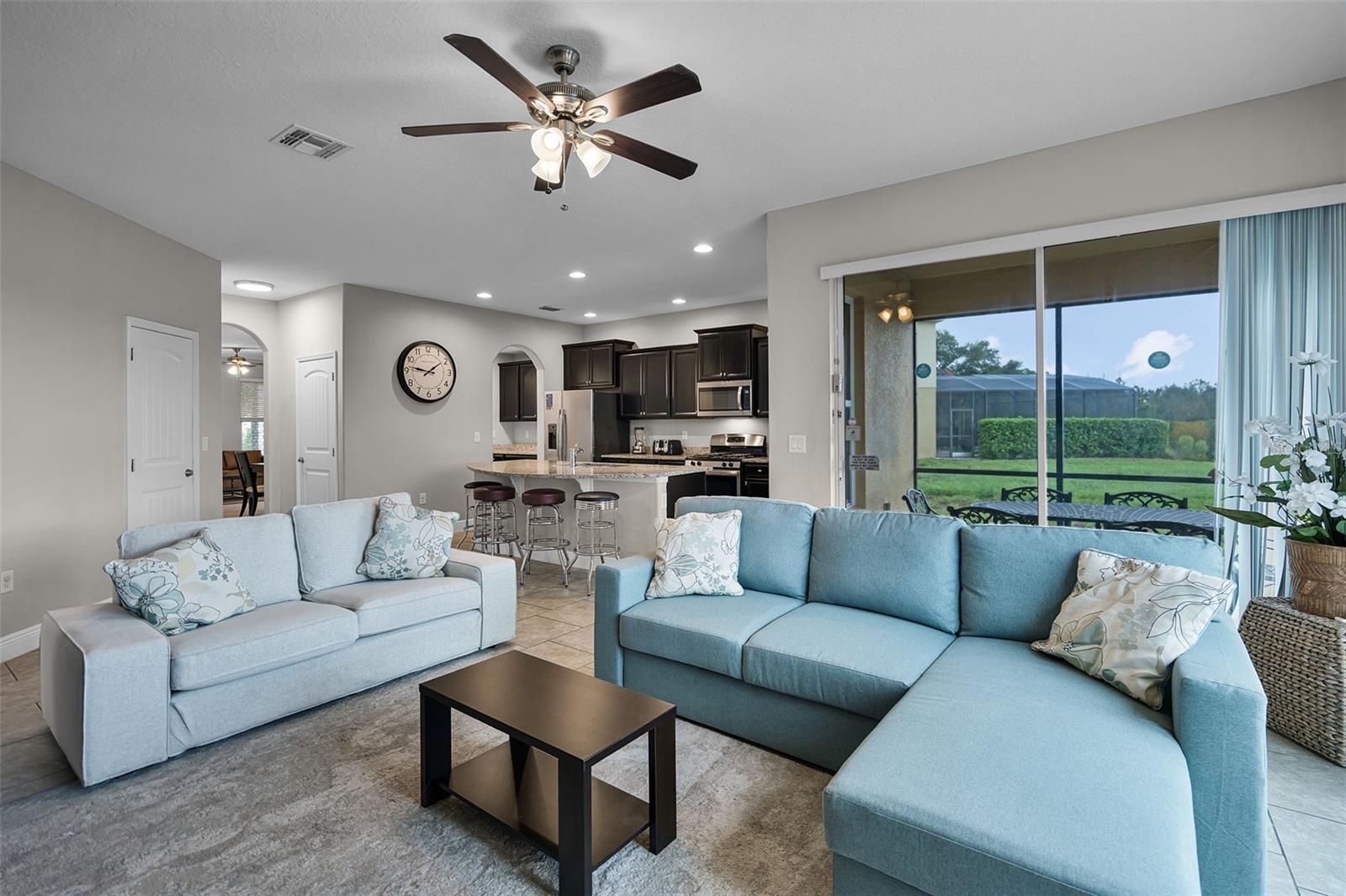 PREMIUM LOT, NO REAR NEIGHBORS, FULLY FURNISHED and Immaculate 7-bedroom, 5.5 bathroom home nestled in a lovely, sought-after neighborhood! This spacious residence offers the perfect blend of comfort and elegance, featuring a beautifully landscaped yard, a covered entry, and a screened patio ideal for relaxing or entertaining. Inside, you’ll find luxury vinyl tile flooring throughout, an open and inviting layout, and plenty of space for family and guests. The gourmet kitchen flows effortlessly into the living and dining areas, while the master suite is a true retreat with dual sinks, a separate soaking tub, and a walk-in shower. Step outside to your private backyard oasis complete with a sparkling pool and spa—perfect for enjoying sunny days and starry nights. Pool heater and pump has been updated. A 2-car garage completes this exceptional property. Don’t miss the opportunity to call this stunning home your own!