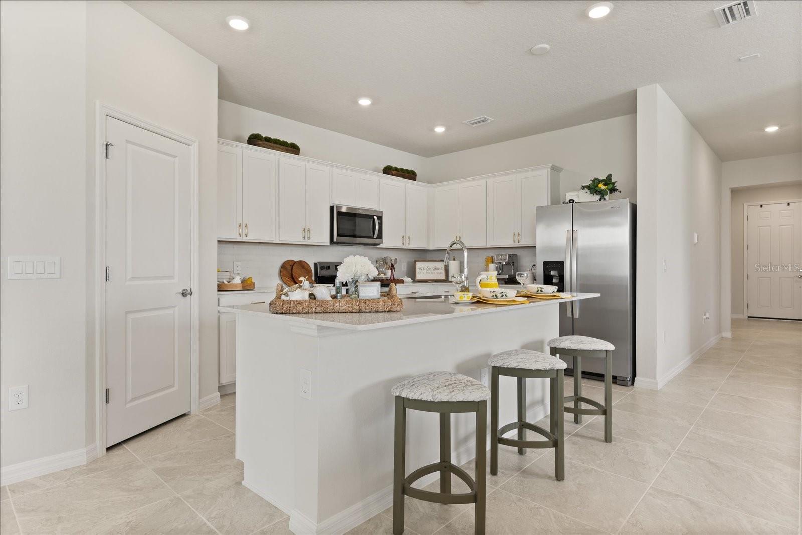 Motivated Seller, discover the best of Florida living in this stunning Medina home, showcasing a single-story Mediterranean design. With four bedrooms and three bathrooms (including in law suite), this home is perfect for modern lifestyles. Enter through a grand foyer into the heart of the home, where the open kitchen, café, and gathering room flow effortlessly into a covered lanai, ideal for seamless indoor/outdoor entertainment. The kitchen is equipped with top-of-the-line stainless steel Whirlpool appliances, a center island, and a walk-in corner pantry, all accentuated by bright white cabinets, an Eden Bianco ceramic tile backsplash, and stunning Lagoon quartz countertops. The Owner's Suite is a private retreat featuring an en suite bathroom with a large walk-in closet, dual quartz-topped vanity, private water closet, linen closet, and a walk-in shower with a frameless glass door. Located at the front of the home, three additional bedrooms, two bathrooms, and a laundry room offer ample privacy. Design highlights include a Smart Home package and decorative tray ceiling. The amazing community features resort style pool with cabana, sports field, dog stations, playground and walking trails, 1-Gig high speed internet and streaming TV included in the HOA. ***This come qualifies for a special rate with preferred lender***