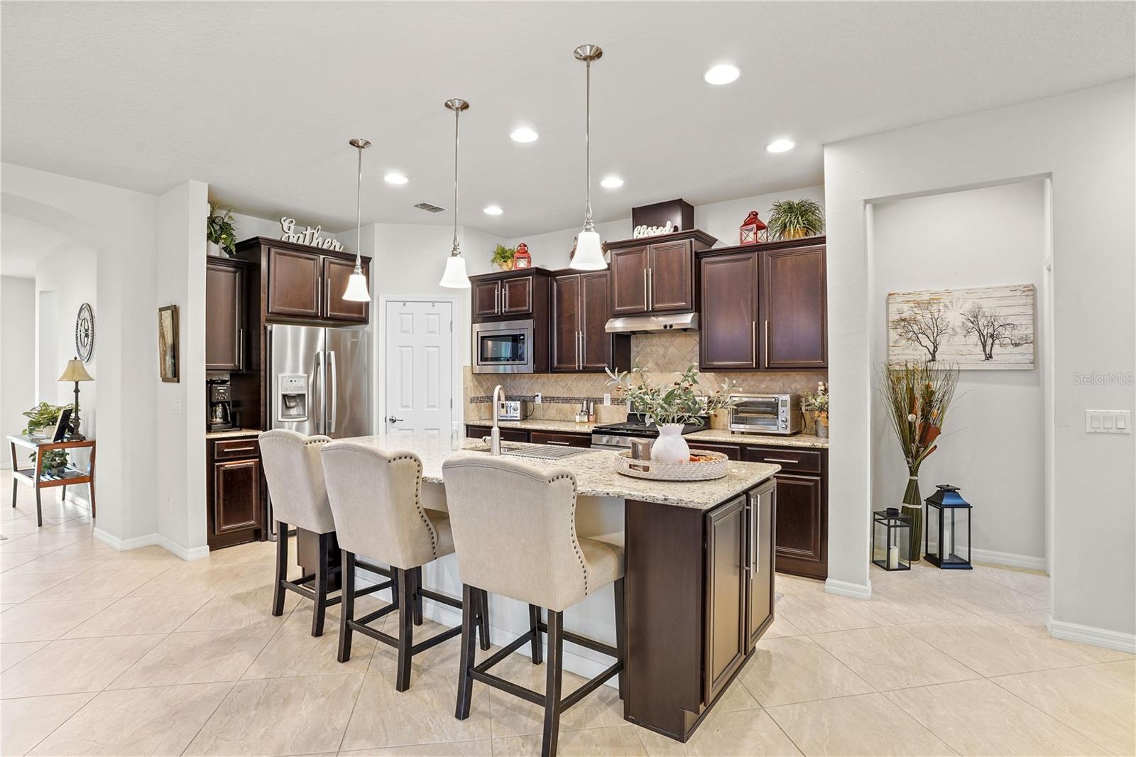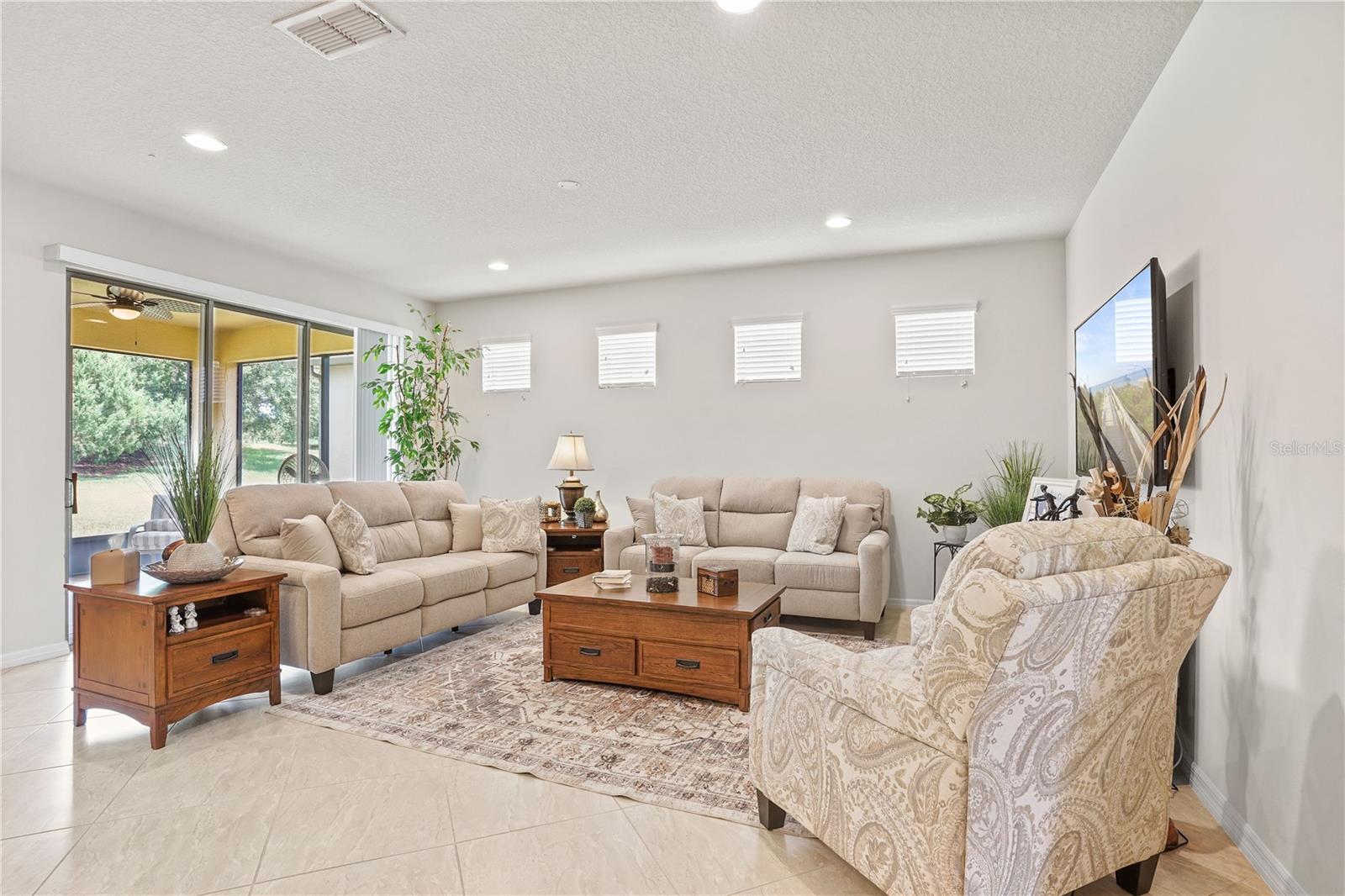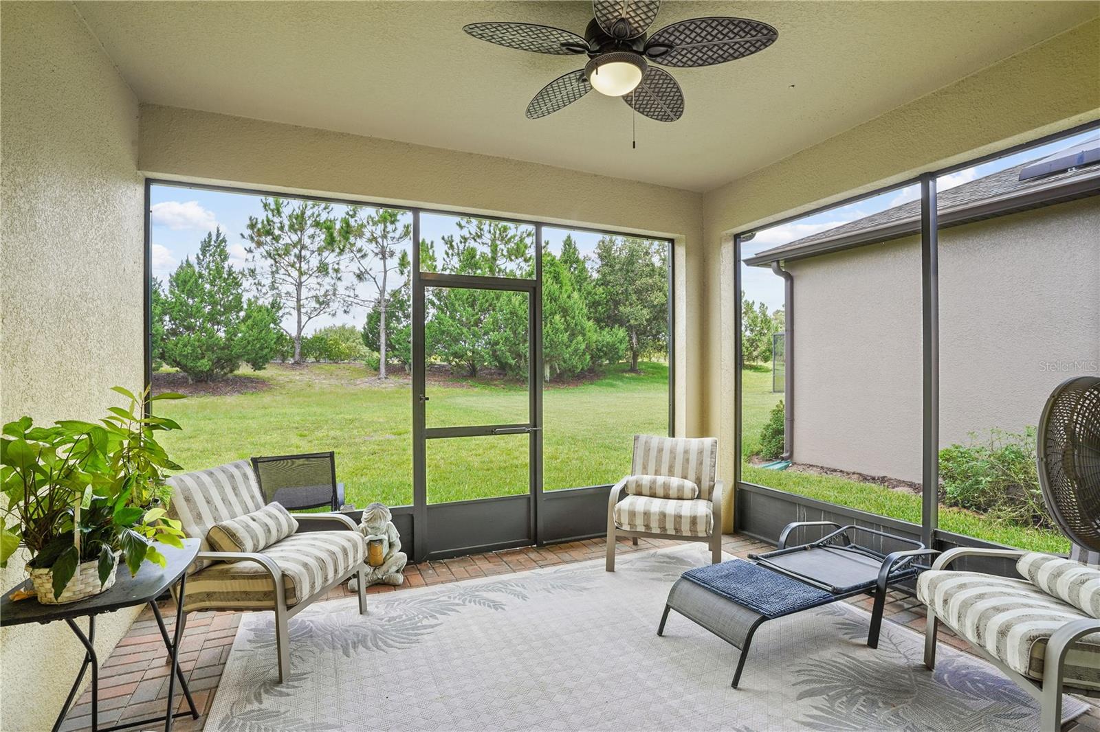 Come tour the 55+ community of Del Webb Orlando and explore this exceptional 3BR plus Den & 2 BA FULLY FURNISHED home w/ SCREENED LANAI! This traditional home features seamless TILE flooring on the diagonal with modern lighting throughout. Oversized family room opens to a spacious kitchen boasting rich WOOD cabinetry, stainless steel appliances, tiled backsplash, oversized island , granite countertops, and a spacious walk-in pantry! Large dining area offers views of a private wooded back yard. The PRIMARY bedroom includes a walk-in closet and an en suite bathroom that features a luxurious oversized walk-in shower, tiled flooring, dual sinks w/ granite countertops. This 3 way bedroom plan has 2 additional bedrooms off the front entryway with walk-in closets and tile floors. OFFICE/DEN w/french glass doors offers a cozy place to read a good book. The sizable laundry room is equipped with a washer and dryer and additional cabinets for added convenience. Home includes a two-car garage and a tropical lush landscape! Relax and ENJOY the paver screened lanai that overlooks your private wooded backyard. This home is in the perfect location and just a short walk or golf cart ride all amenities. The grounds and residences in the Del Webb Orlando area are meticulously maintained. Del Webb Orlando offers a wealth of exceptional amenities, including an outdoor pool with a jacuzzi, an indoor pool, a fitness center, an indoor track, a charming tavern, tennis courts, bocce ball, shuffleboard, and pickleball. The community is conveniently located near major highways, restaurants, hospitals, and popular theme parks, Del Webb/Orlando offers a desirable lifestyle. All you need is your toothbrush and suitcase to move into this BEAUTIFUL, fully equipped HOME!!